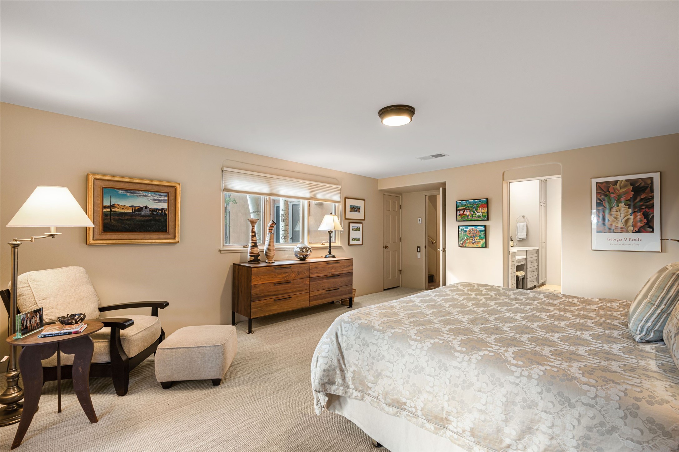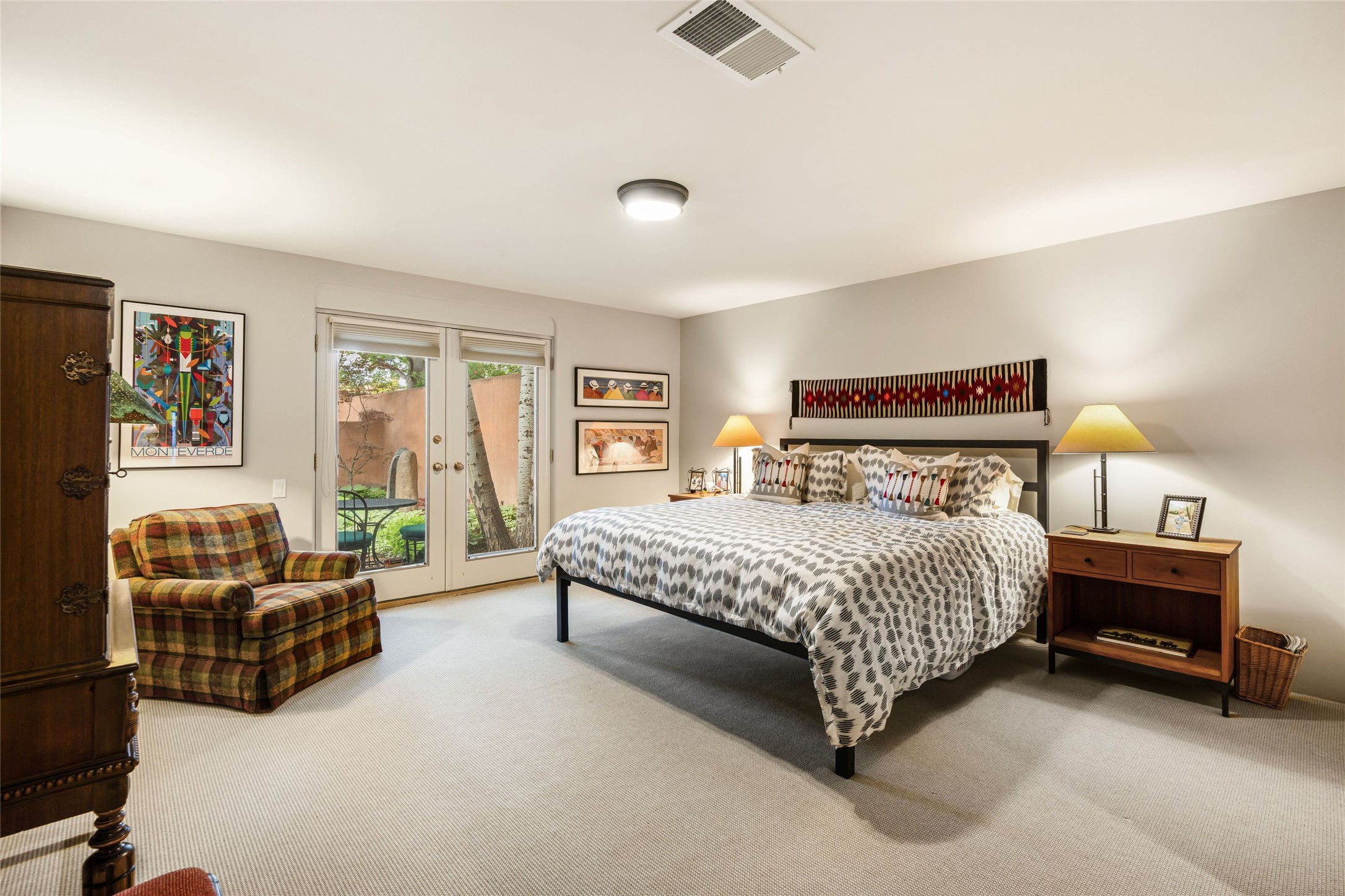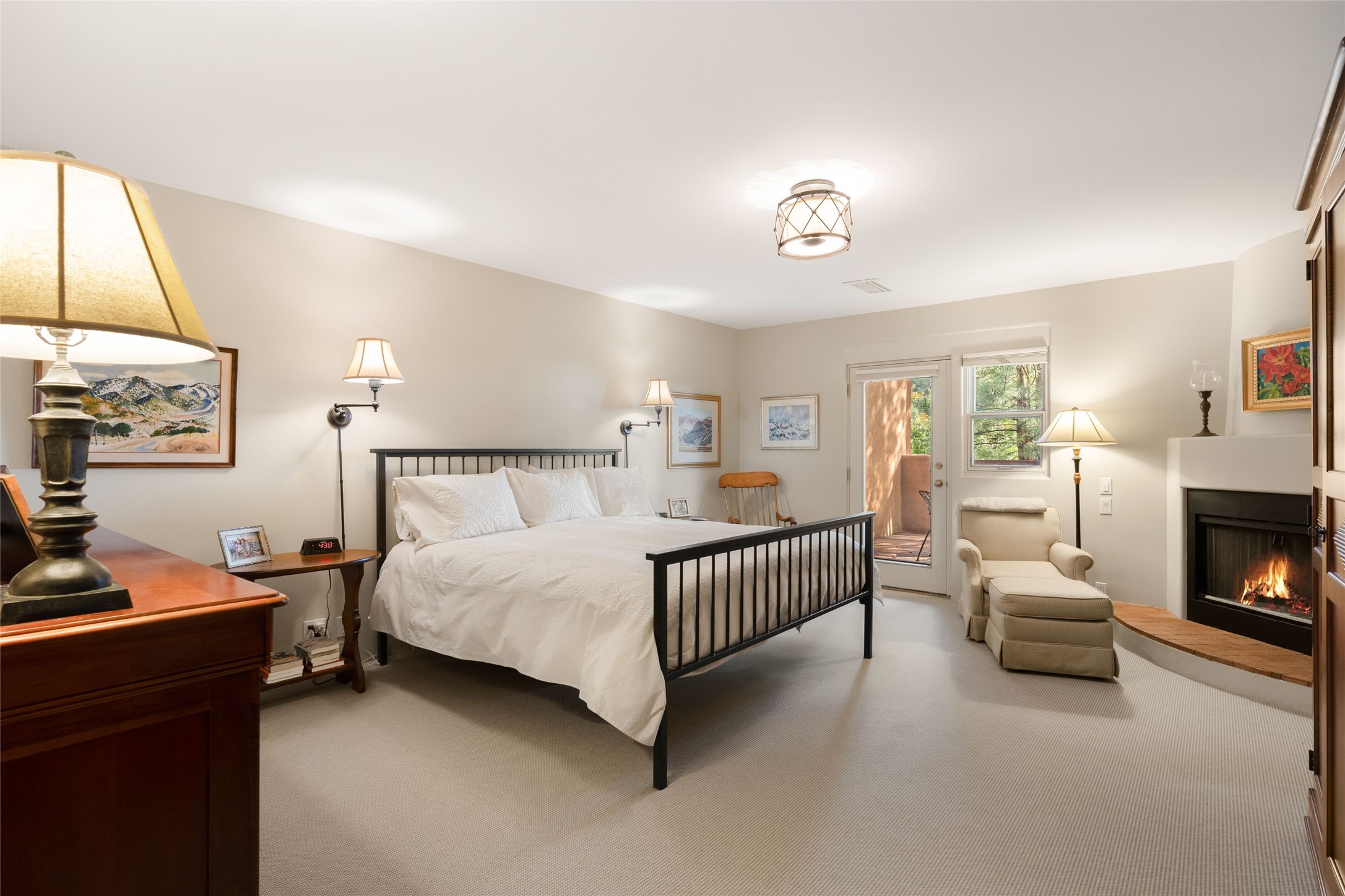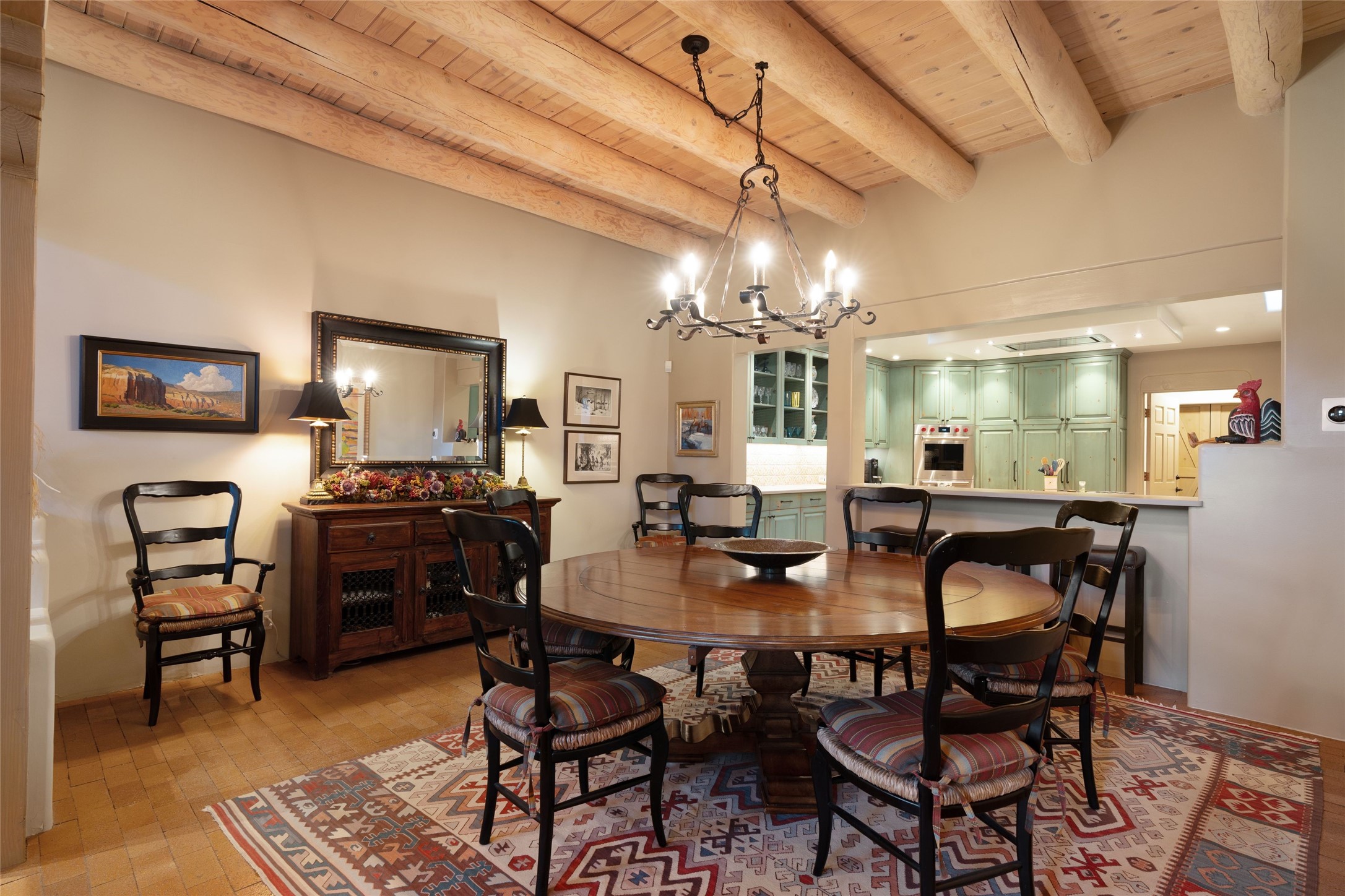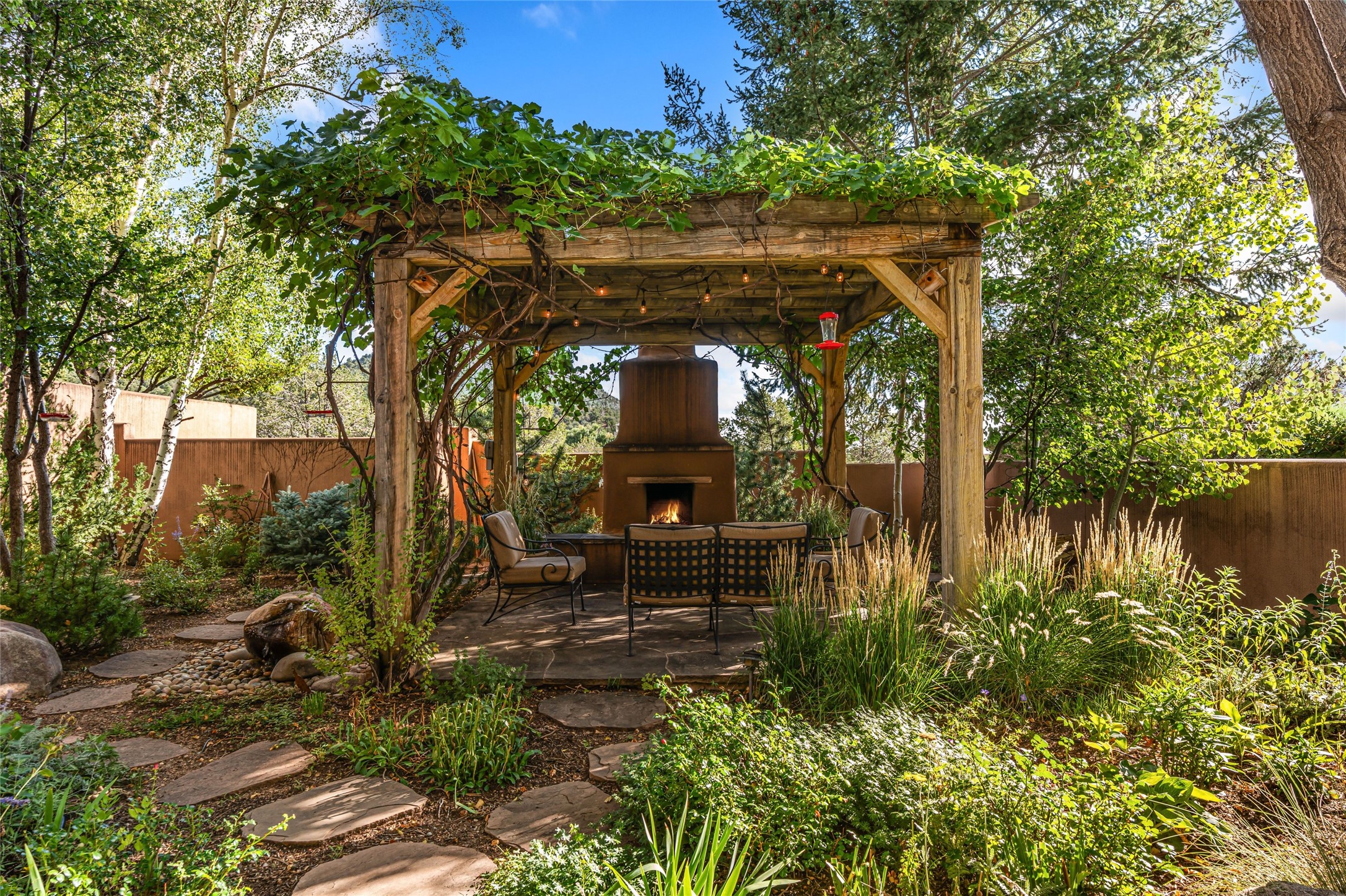 Desirable Los Miradores 3-bedroom, 3-bath residence close to Museum Hill and Canyon Road. Living room with soaring beamed ceilings and stately fireplace framed by high windows that highlight the towering trees outside. Updated kitchen, equipped with high-end appliances including a double oven, Sub-Zero refrigerator, wine fridge, and elegant quartz countertops, along with a center island perfect for casual dining and entertaining. This home features two spacious bedrooms and bathrooms on the first floor, providing convenience and comfort. Upstairs, you'll find a den/office area and a generous bedroom complete with a kiva fireplace and a large bath, both with access to outdoor decks that enhance the living space. All baths have been recently remodeled. The delightful, landscaped backyard combines a flagstone patio, outdoor fireplace, and serene nature paths bedecked with aspen trees and a tranquil fountain. 2-car attached garage. The gated community of Los Miradores offers many amenities, including a seasonal pool, workout facility and tennis court. Additionally, a 2-bedroom casita owned by Los Miradores offers rental opportunities for guests.