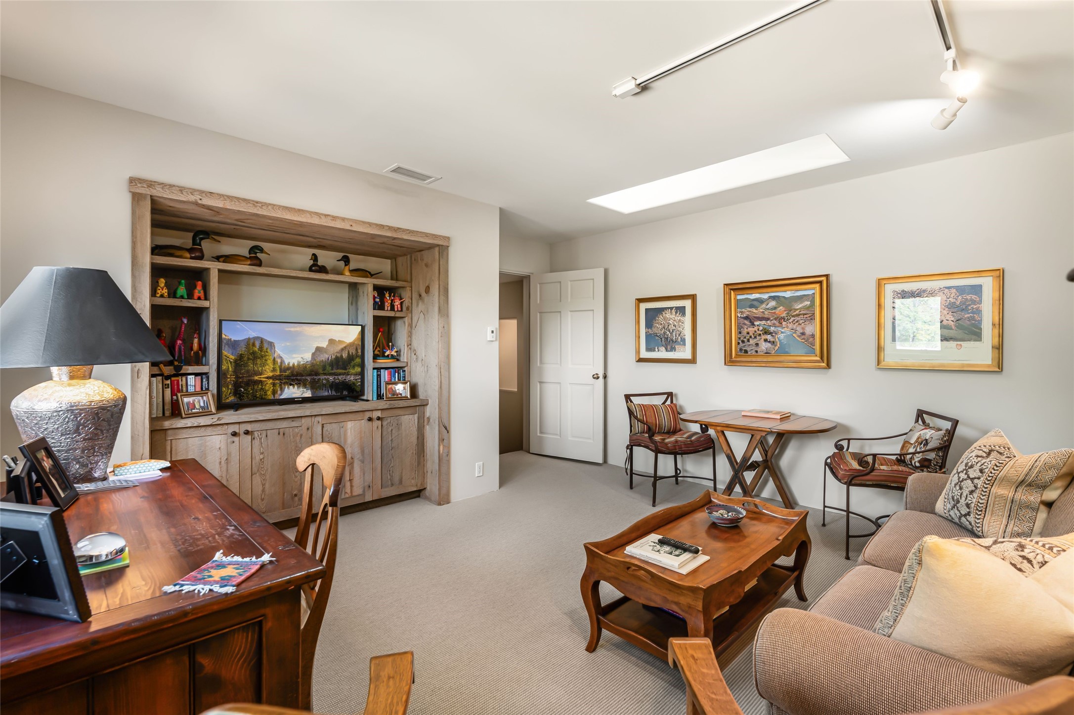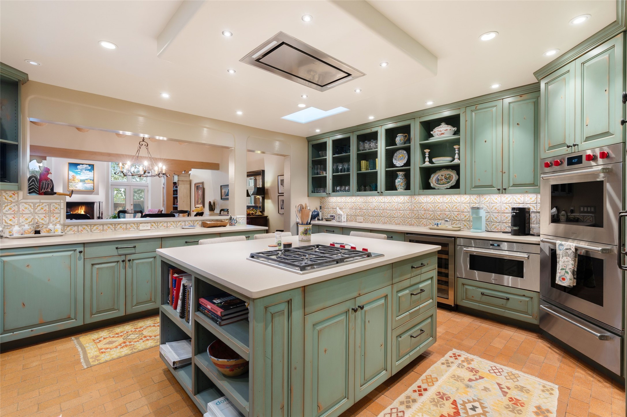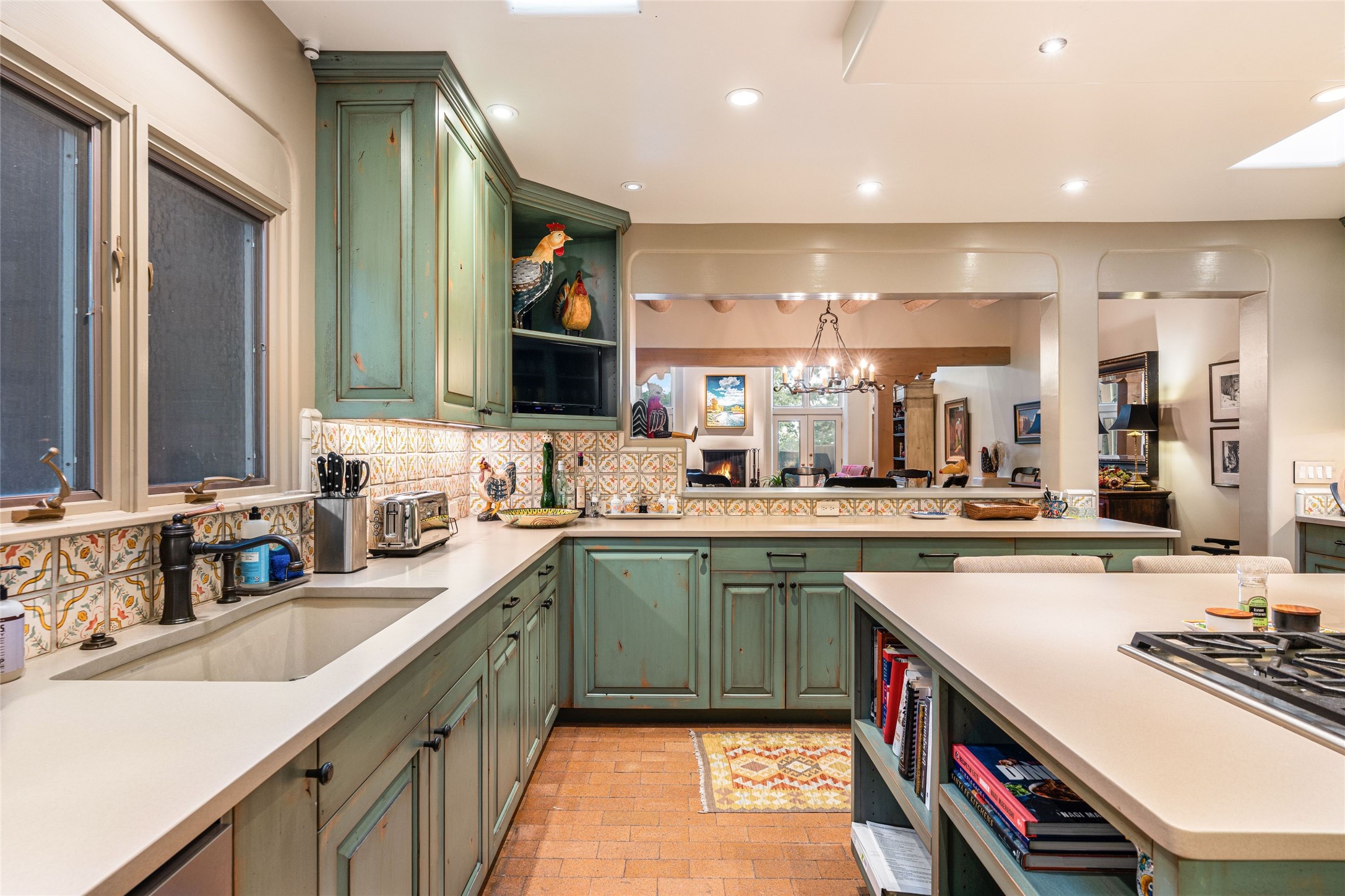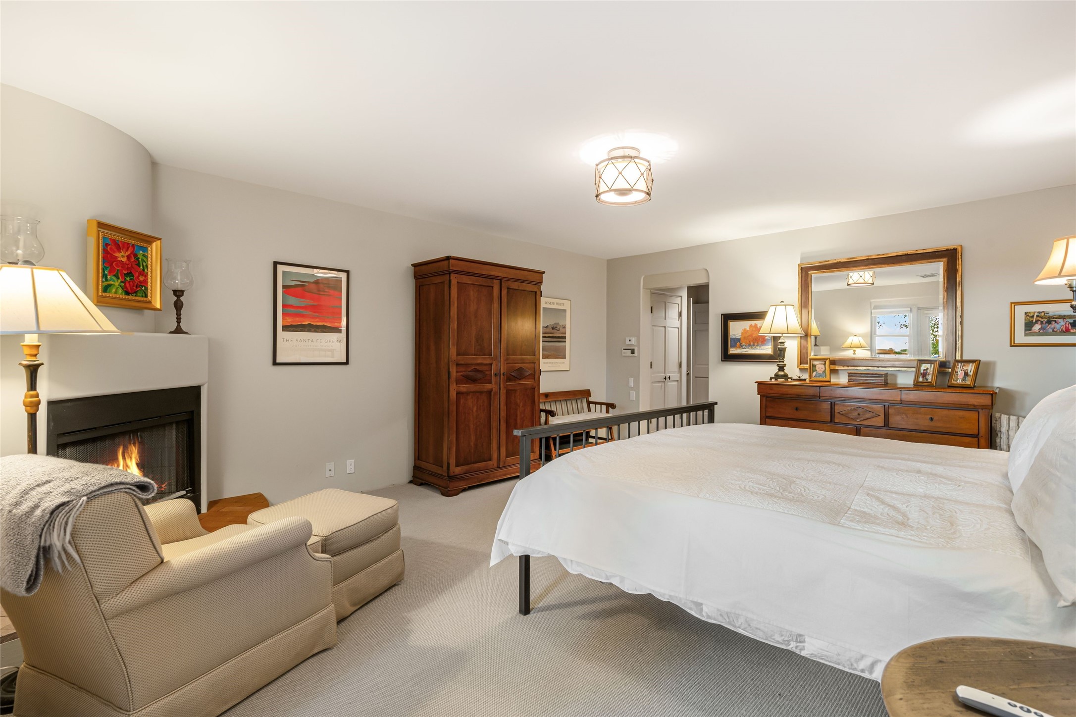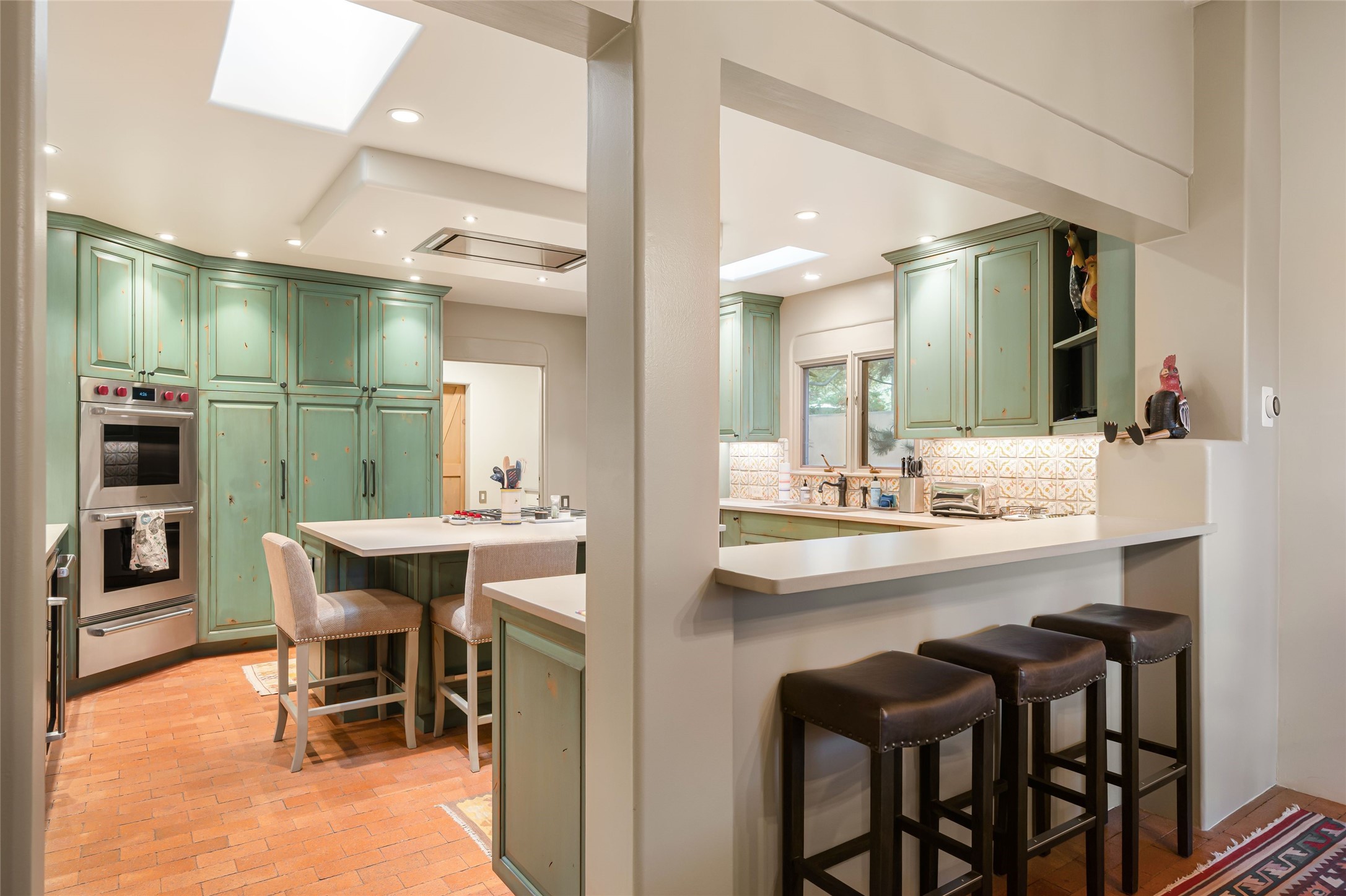 Desirable Los Miradores 3-bedroom, 3-bath residence close to Museum Hill and Canyon Road. Living room with soaring beamed ceilings and stately fireplace framed by high windows that highlight the towering trees outside. Updated kitchen, equipped with high-end appliances including a double oven, Sub-Zero refrigerator, wine fridge, and elegant quartz countertops, along with a center island perfect for casual dining and entertaining. This home features two spacious bedrooms and bathrooms on the first floor, providing convenience and comfort. Upstairs, you'll find a den/office area and a generous bedroom complete with a kiva fireplace and a large bath, both with access to outdoor decks that enhance the living space. All baths have been recently remodeled. The delightful, landscaped backyard combines a flagstone patio, outdoor fireplace, and serene nature paths bedecked with aspen trees and a tranquil fountain. 2-car attached garage. The gated community of Los Miradores offers many amenities, including a seasonal pool, workout facility and tennis court. Additionally, a 2-bedroom casita owned by Los Miradores offers rental opportunities for guests.