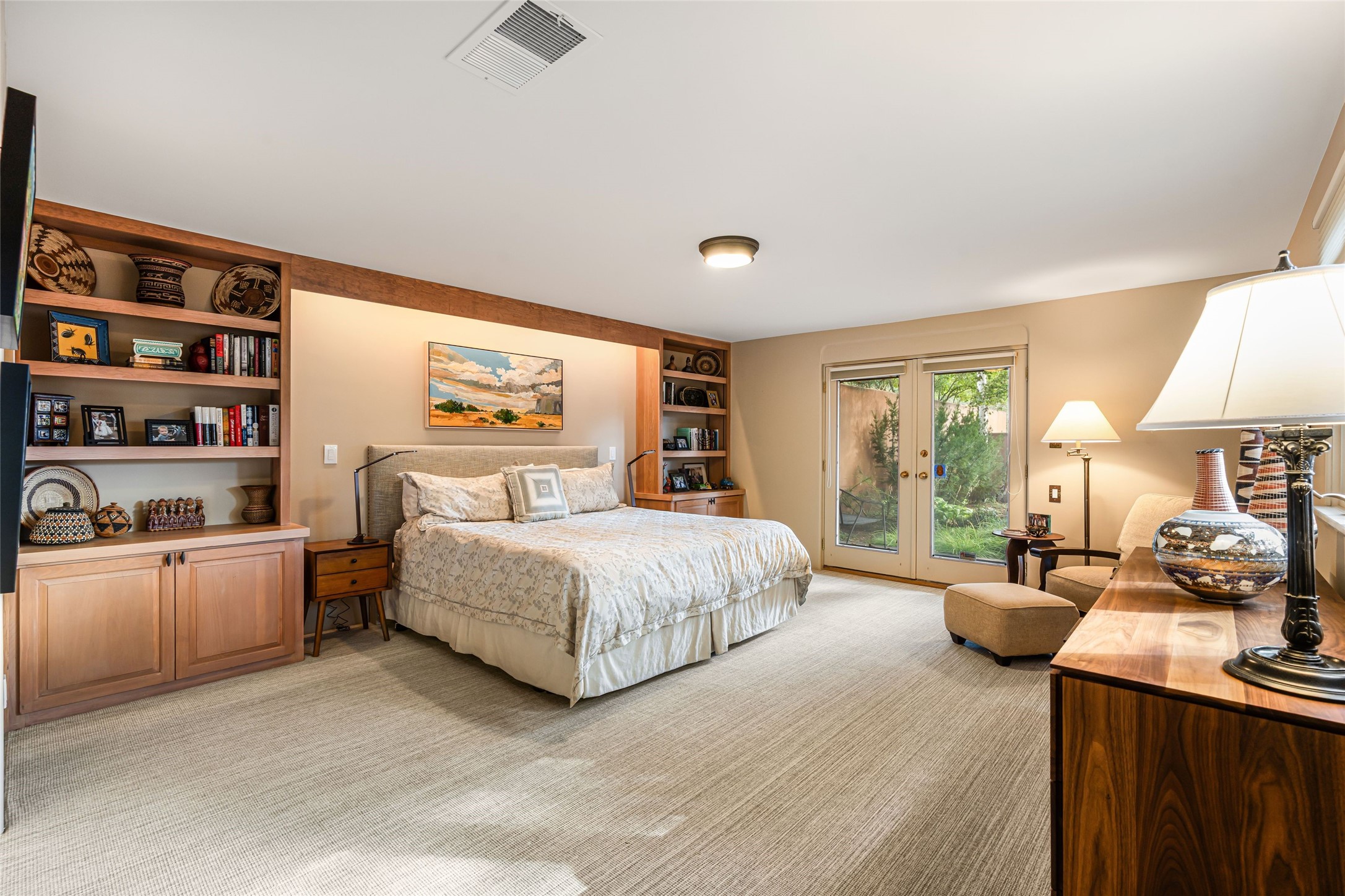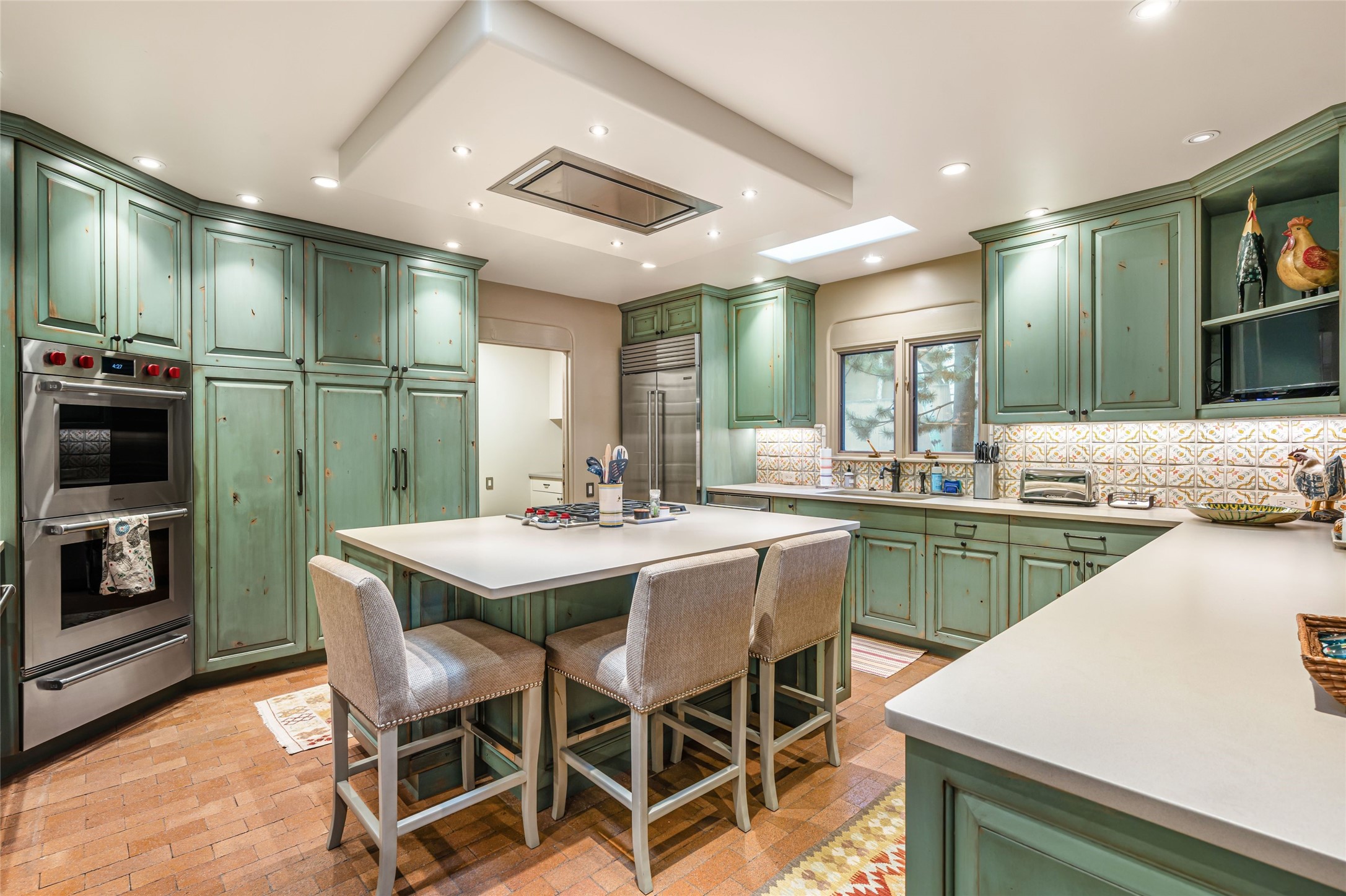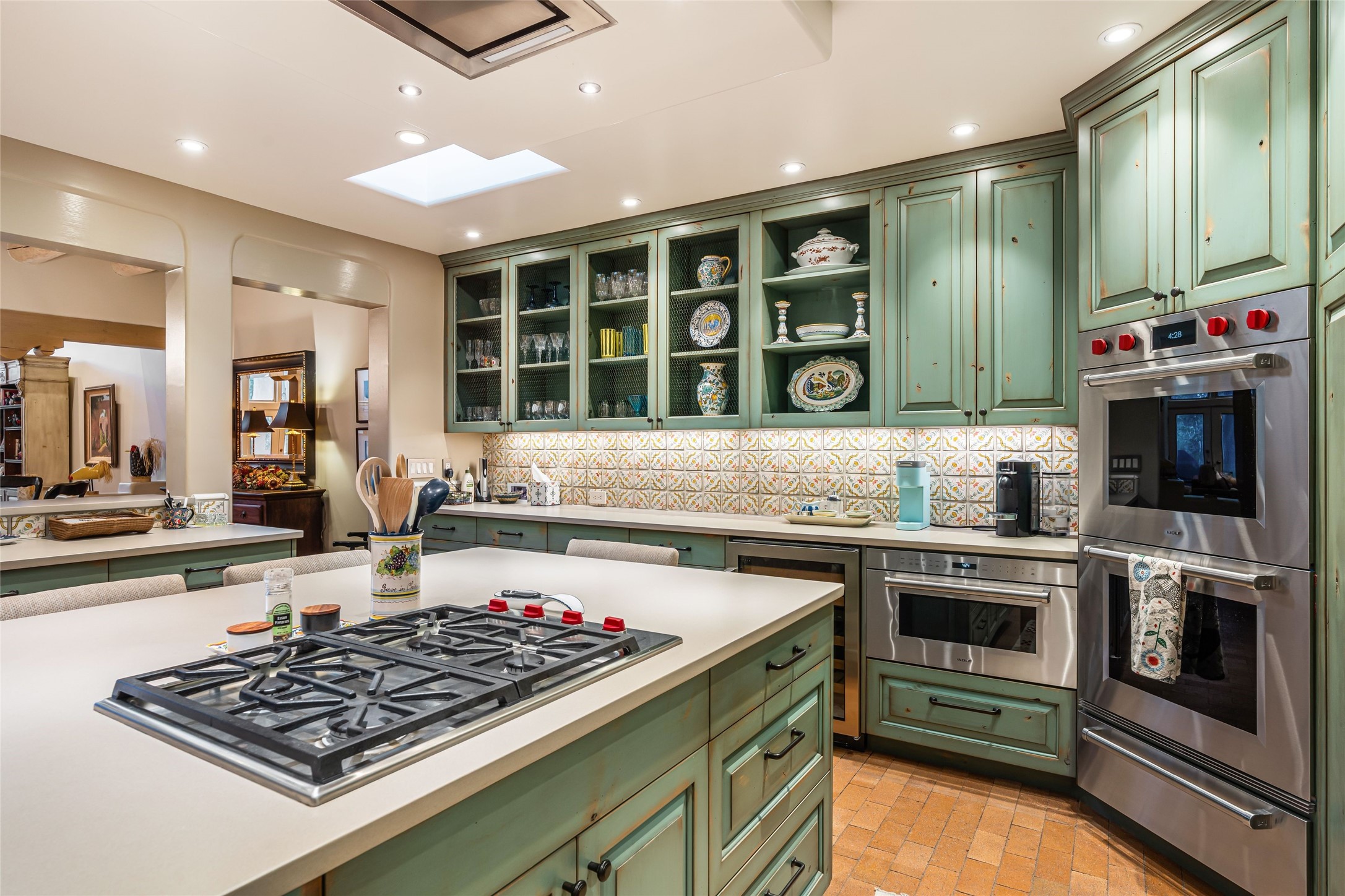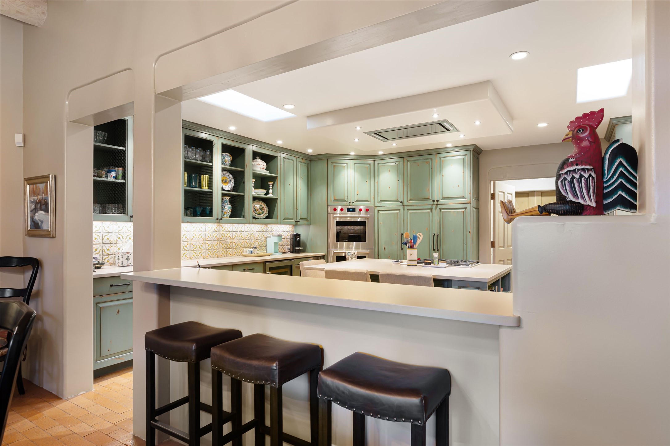 Desirable Los Miradores 3-bedroom, 3-bath residence close to Museum Hill and Canyon Road. Living room with soaring beamed ceilings and stately fireplace framed by high windows that highlight the towering trees outside. Updated kitchen, equipped with high-end appliances including a double oven, Sub-Zero refrigerator, wine fridge, and elegant quartz countertops, along with a center island perfect for casual dining and entertaining. This home features two spacious bedrooms and bathrooms on the first floor, providing convenience and comfort. Upstairs, you'll find a den/office area and a generous bedroom complete with a kiva fireplace and a large bath, both with access to outdoor decks that enhance the living space. All baths have been recently remodeled. The delightful, landscaped backyard combines a flagstone patio, outdoor fireplace, and serene nature paths bedecked with aspen trees and a tranquil fountain. 2-car attached garage. The gated community of Los Miradores offers many amenities, including a seasonal pool, workout facility and tennis court. Additionally, a 2-bedroom casita owned by Los Miradores offers rental opportunities for guests.
