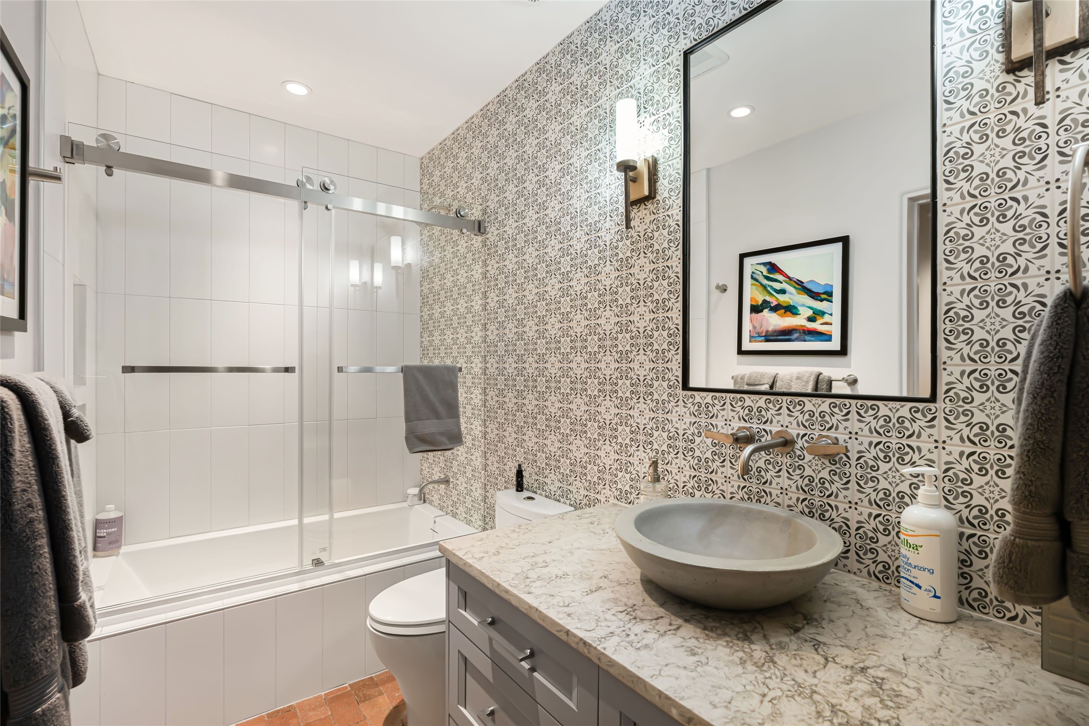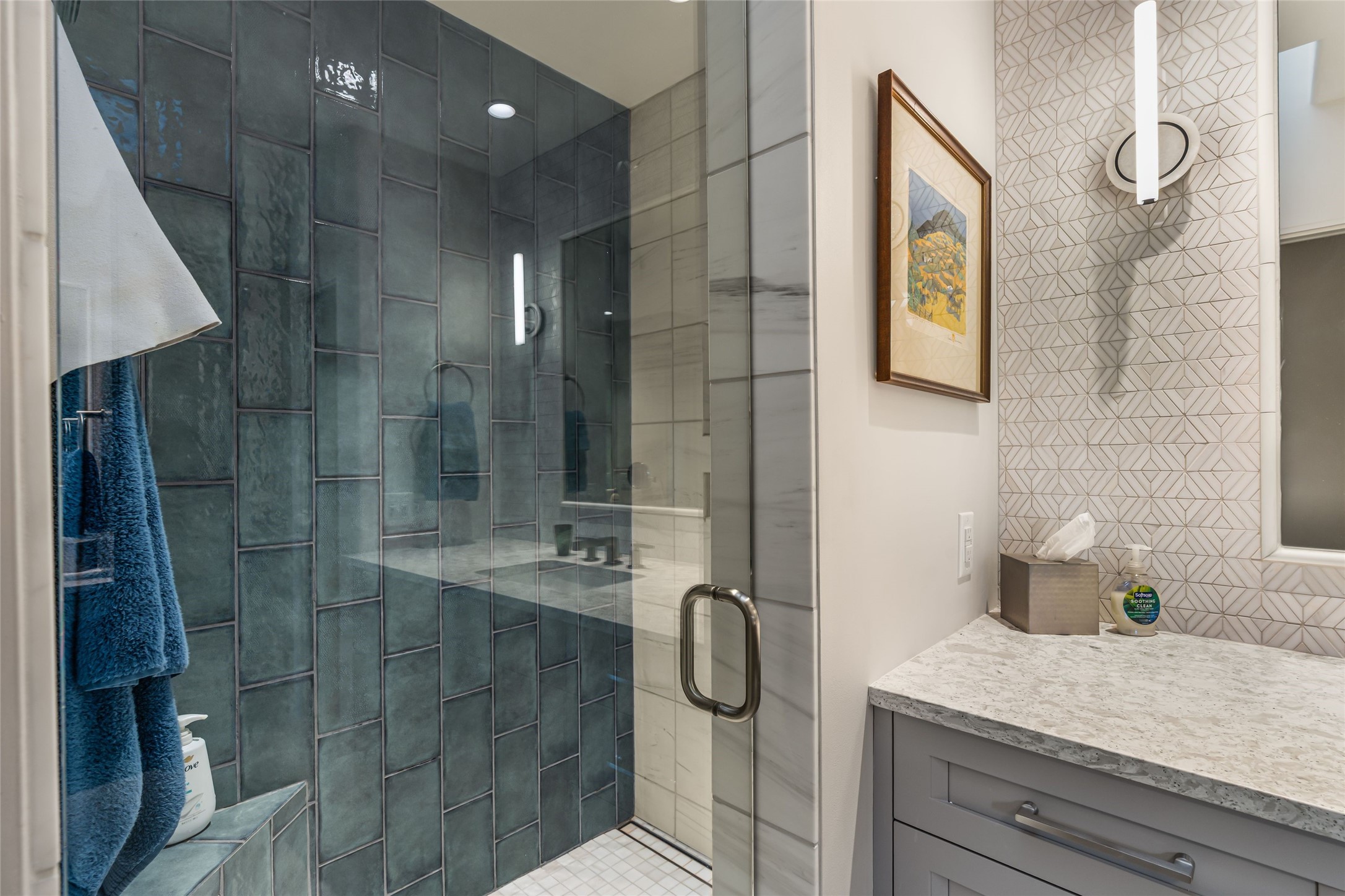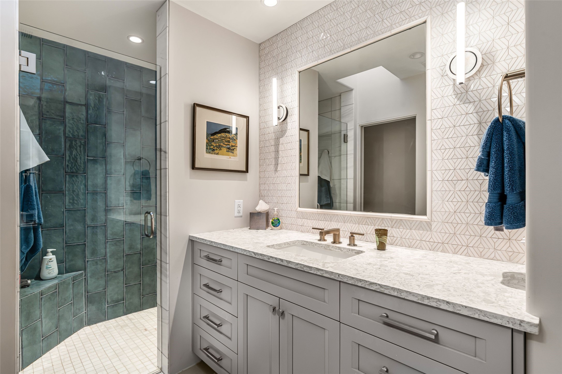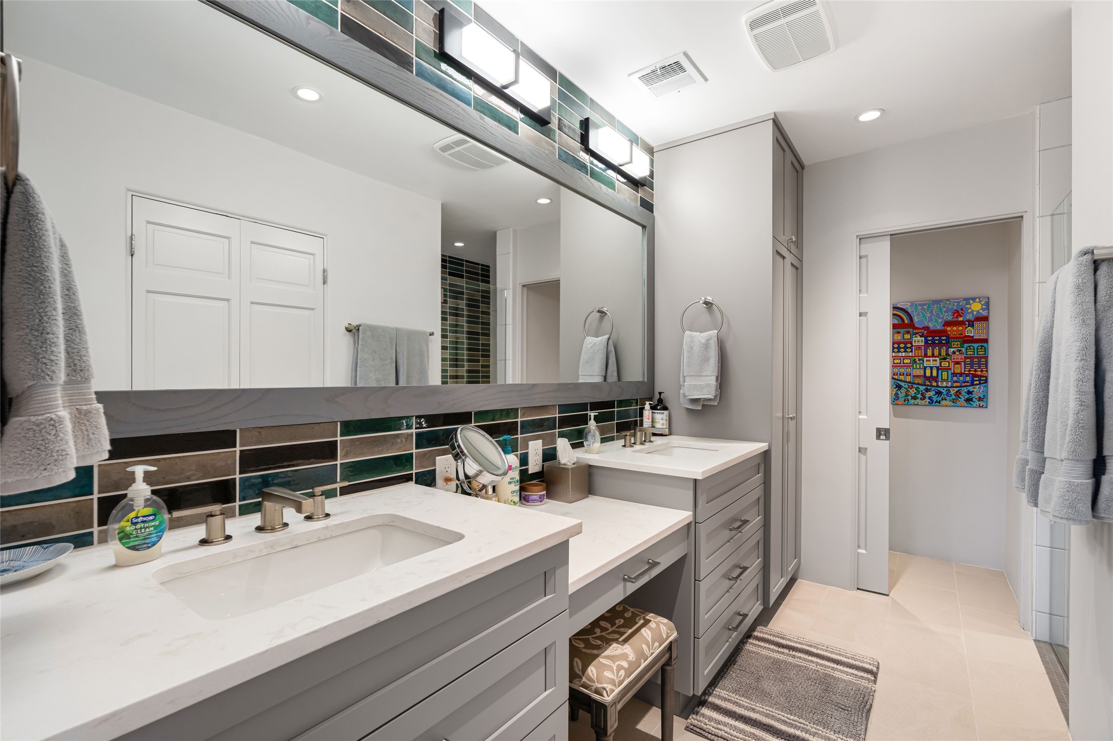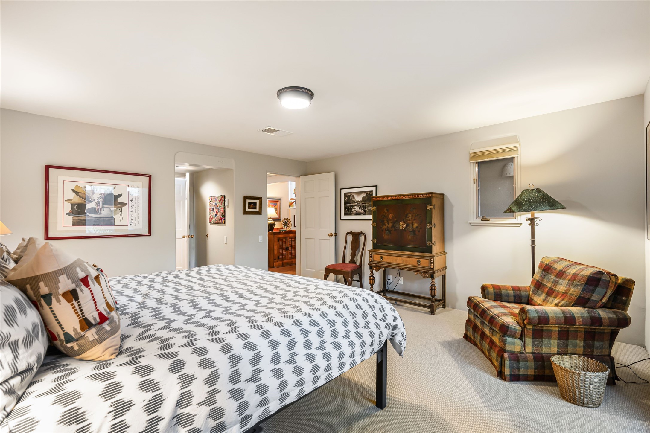 Desirable Los Miradores 3-bedroom, 3-bath residence close to Museum Hill and Canyon Road. Living room with soaring beamed ceilings and stately fireplace framed by high windows that highlight the towering trees outside. Updated kitchen, equipped with high-end appliances including a double oven, Sub-Zero refrigerator, wine fridge, and elegant quartz countertops, along with a center island perfect for casual dining and entertaining. This home features two spacious bedrooms and bathrooms on the first floor, providing convenience and comfort. Upstairs, you'll find a den/office area and a generous bedroom complete with a kiva fireplace and a large bath, both with access to outdoor decks that enhance the living space. All baths have been recently remodeled. The delightful, landscaped backyard combines a flagstone patio, outdoor fireplace, and serene nature paths bedecked with aspen trees and a tranquil fountain. 2-car attached garage. The gated community of Los Miradores offers many amenities, including a seasonal pool, workout facility and tennis court. Additionally, a 2-bedroom casita owned by Los Miradores offers rental opportunities for guests.