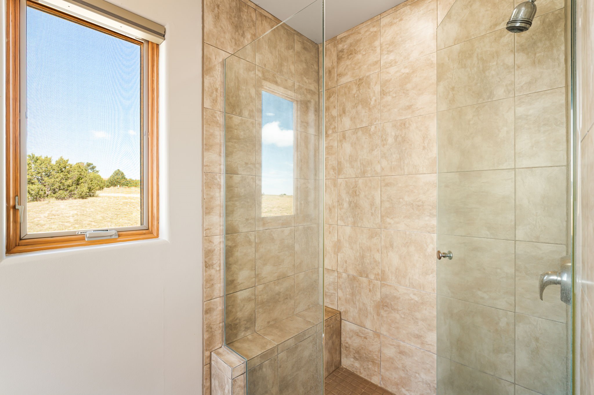 RARE OFFERING IN SPIRIT WIND RANCH! This single-level, passive-solar beauty offers long-range mountain views and privacy. Sited on 5 acres overlooking the Galisteo Basin, Sandia and Ortiz mountains. Radiant heat tubing is WIRSBO. Wonderful kitchen has Taj Mahal counters, bar with seating, two pantries, high-end stainless steel appliances and seating area. Living area has beautiful viga ceilings and wood-burning kiva fireplace. Primary bedroom has a gas fireplace and doors to rear portal. Bath has double sinks, jetted tub, separate shower and walk-in closet. Spacious office/studio space with en-suite 3/4 bath and separate entrance. Property has been pre-inspected and all repairs have been made. Inspection report available on request. Walled front courtyard is on drip with freshly painted gate. Proper laundry with sink and storage. Insulated blinds are all on a remote. Oversized and finished 2-car garage. NO KITEC. NO STEPS. Whole house water filtration - Aguasana. HOA has contract with Farrellgas for reduced rates. Septic has been inspected and lot corners are flagged.