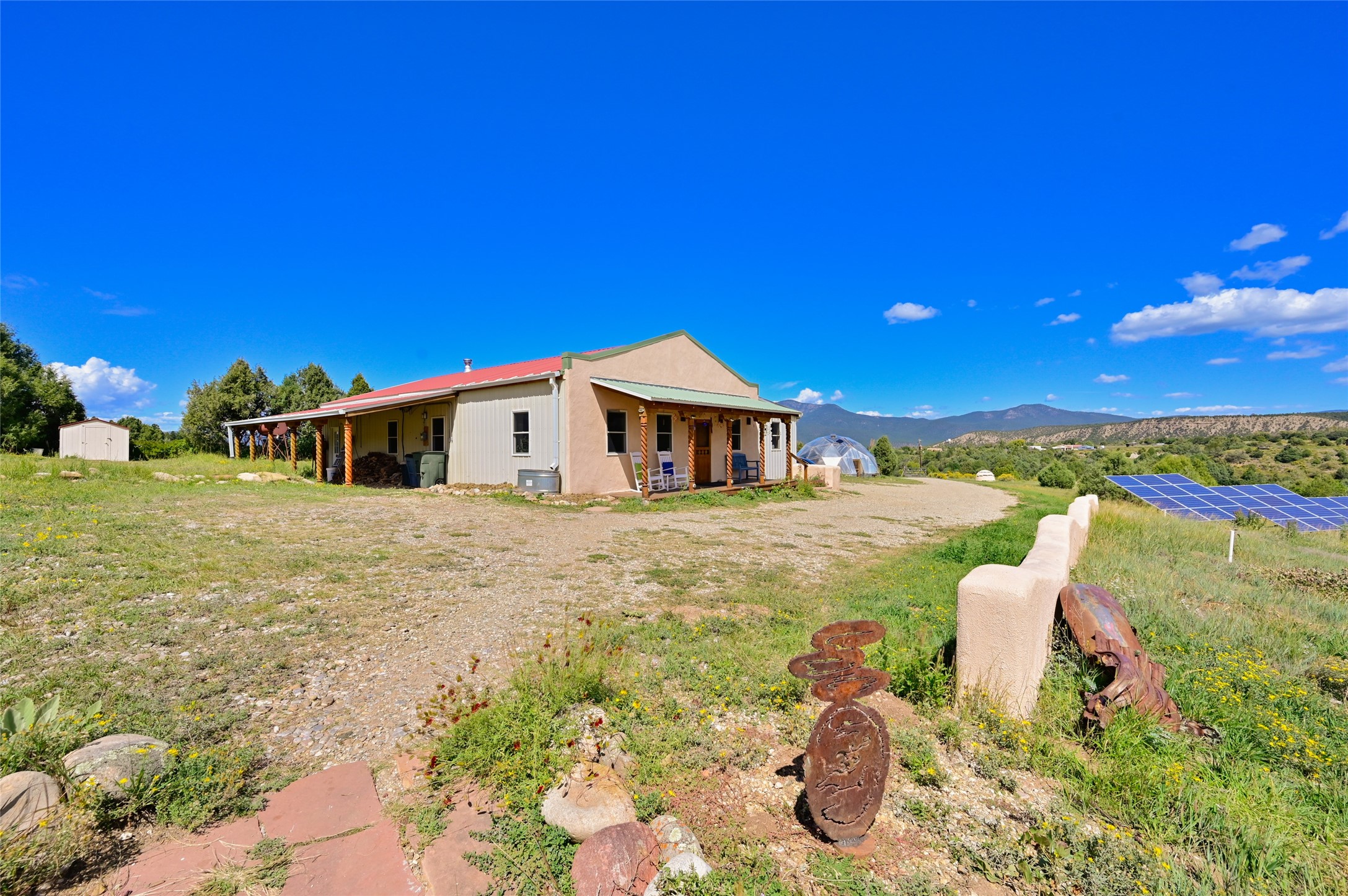 A truly rare 34-acre mountain retreat awaits, nestled in the Sangre de Cristo Mountains with stunning views of Jicarita Peak and Truchas Peaks. This exceptional, self-sufficient, and sustainably developed property is perfect for a small family business, equestrian estate, or serene retreat center.The total living space of 4,100 sq ft includes a charming 1,600 sq ft earth-bermed 2-bedroom home featuring custom stone floors, vigas, radiant in-floor heat in the kitchen and master suite, and an updated kitchen with a Wolf Stove and granite countertops. The home is designed for energy efficiency, maximizing solar gain, and has a wrap-around deck with captivating pond and mountain views.The property also boasts a 2,225 sq ft office/mixed-use building (zoned for cottage industry, previously a successful institute), a 275 sq ft studio/guest house with a half-bath, and a 30' insulated yurt with off-grid solar, ideal for meditation or a classroom--offering immense flexibility and separate spaces for living, working, and gathering.Outside, find unparalleled amenities dedicated to Earth Stewardship and conservation: 10 irrigated acres with water rights for farming or grazing. Rustic 3-stall horse barn and tack room, horse fencing throughout property. 33' geodesic Growing Dome for year-round production. A comprehensive water catchment system utilizing heavy-duty roof guttering on all buildings and multiple cisterns. A quarter-acre pond with a Trex deck, fed by wetlands and springs, and aerated by a windmill. A vast network of maintained trails on forested acres (thinned and managed), offering direct access to the Carson National Forest.Additional features include an owned grid-tied solar array, a root cellar, a 40' cargo container, and extensive landscaping with drip irrigation. This property is a rare gem, beautifully developed, and ready for its next steward.