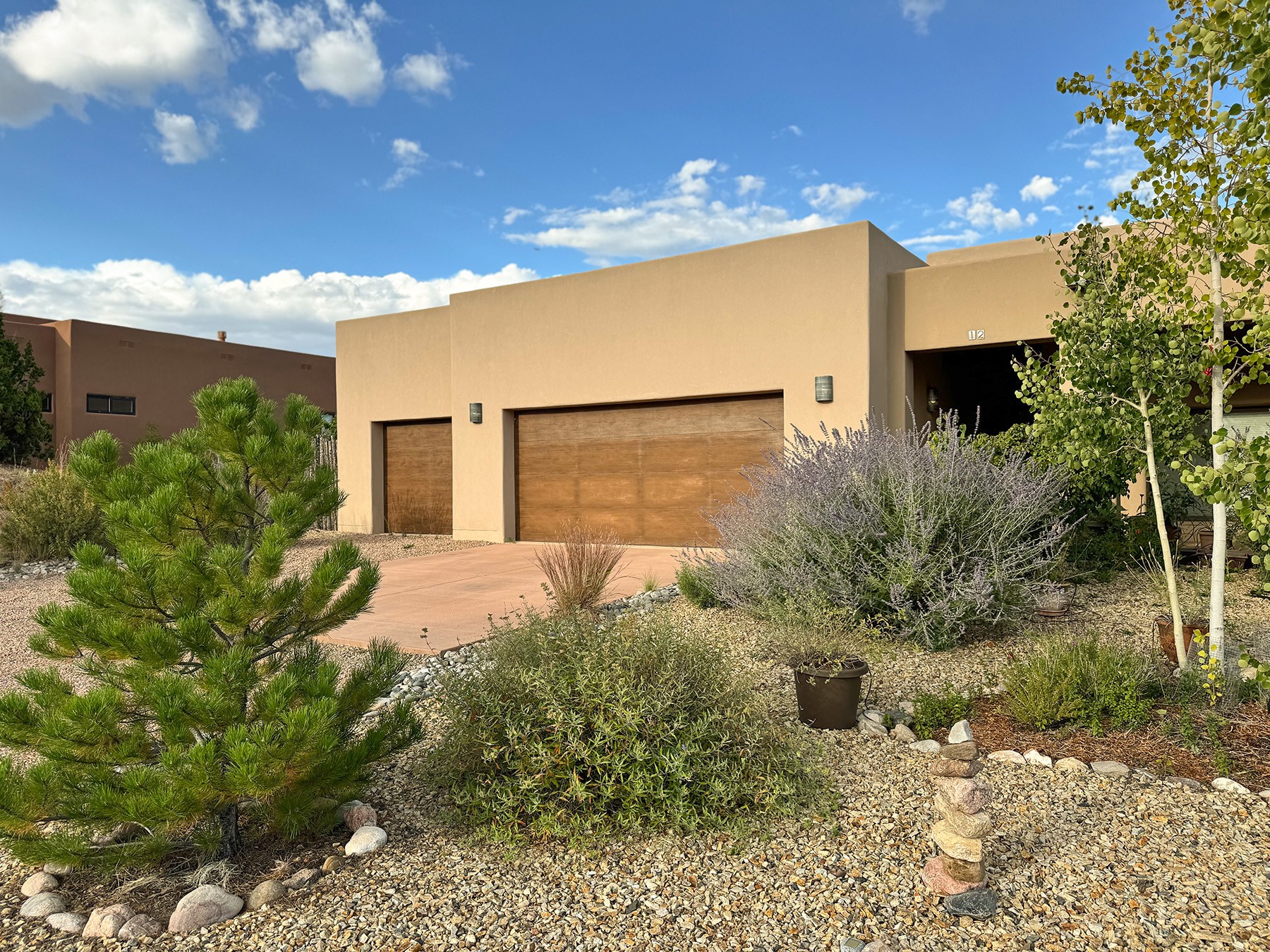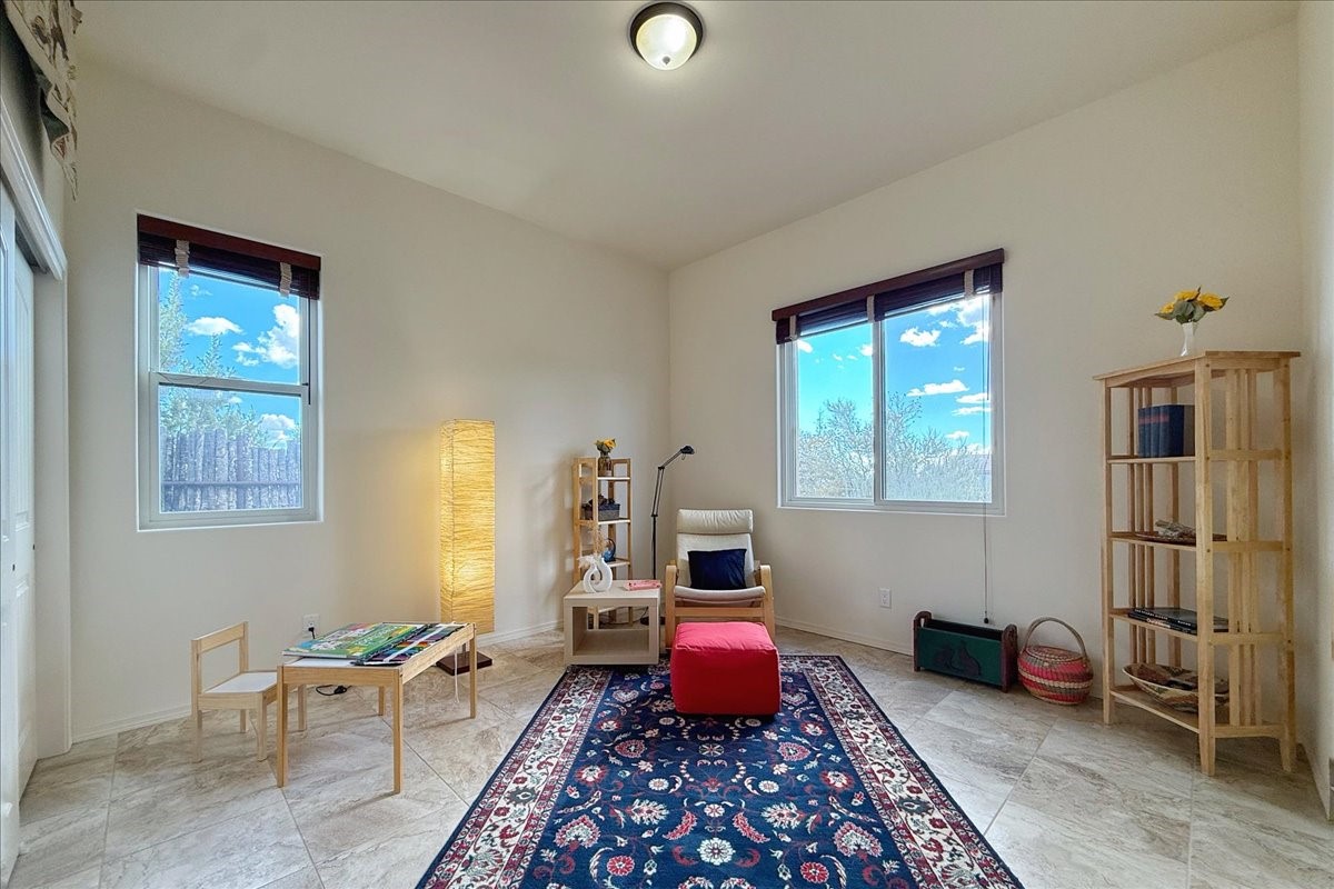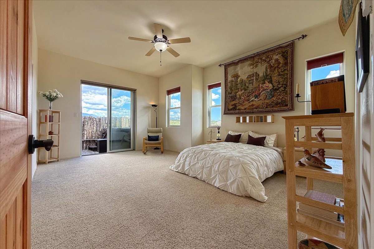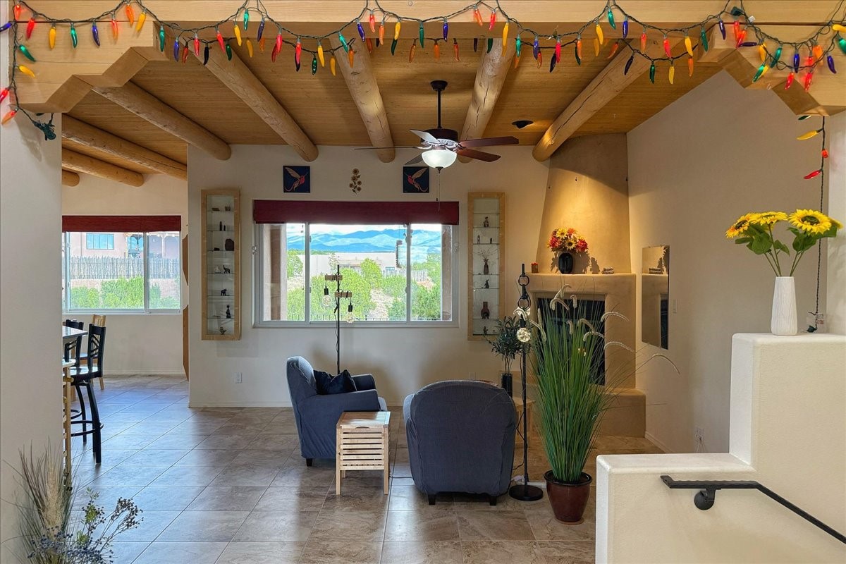 Beautiful 3-bedroom, 2.5-bath home built in 2015, perfectly situated on a 0.34-acre lot surrounded by natural pinon and juniper open space, just 8 minutes from downtown Santa Fe. Offering 1,850 sq ft of thoughtfully designed living space and a finished 3-car EV-ready garage with workbench area, shelves, and overhead storage, this single-owner home blends Santa Fe charm with modern efficiency. Tall ceilings and large-format tile floors enhance the open feel, while wood ceilings with vigas and latillas add warmth. The kitchen features granite countertops, under-cabinet lighting, gas range, ENERGY STAR® appliances, and hood-mounted microwave. Expansive picture windows frame Sangre de Cristo views, filling the home with natural light. Step from the dining area to a covered patio and a private screened spa retreat with multi-person 220V hot tub off the primary suite. The spacious primary suite offers room for a home office or yoga area, plus a walk-in closet with custom Modular Closets® and built-in staircase to high-bay storage. The primary bath boasts an oversized walk-in shower with no glass door and a private toilet area. Energy efficiency abounds with 31 owned solar panels to power spa, home and 300 miles daily for up to 3 EVs, foam-core insulation, radiant floor heat, solar tubes, recirculating hot water, whole-house fan, and motorized exterior sunshades. Additional features include a water softening and revese osmosis systems, radon mitigation, low-VOC finishes, and a partially concrete driveway for easy snow removal. The driveway can accommodate 5 cars in addition to garage. Outdoors, enjoy professional landscaping, drip irrigation, a secluded flagstone patio for dining or stargazing, a fully fenced garden area with shed, and rainwater barrels. Scenic walking trails with mountain views. Convenient access to Hwy 599 makes commuting to Los Alamos or the Santa Fe Airport a breeze--this home delivers mountain views, sustainability, and comfort in one perfect package.