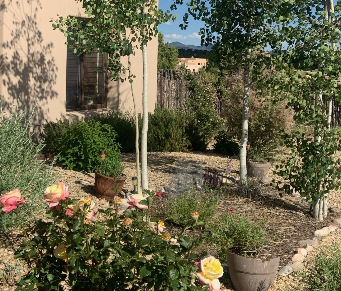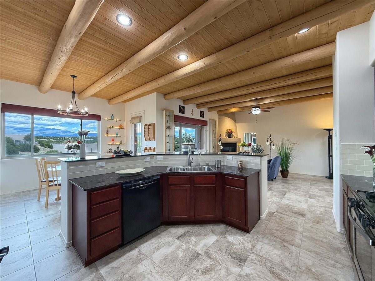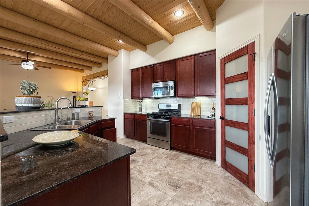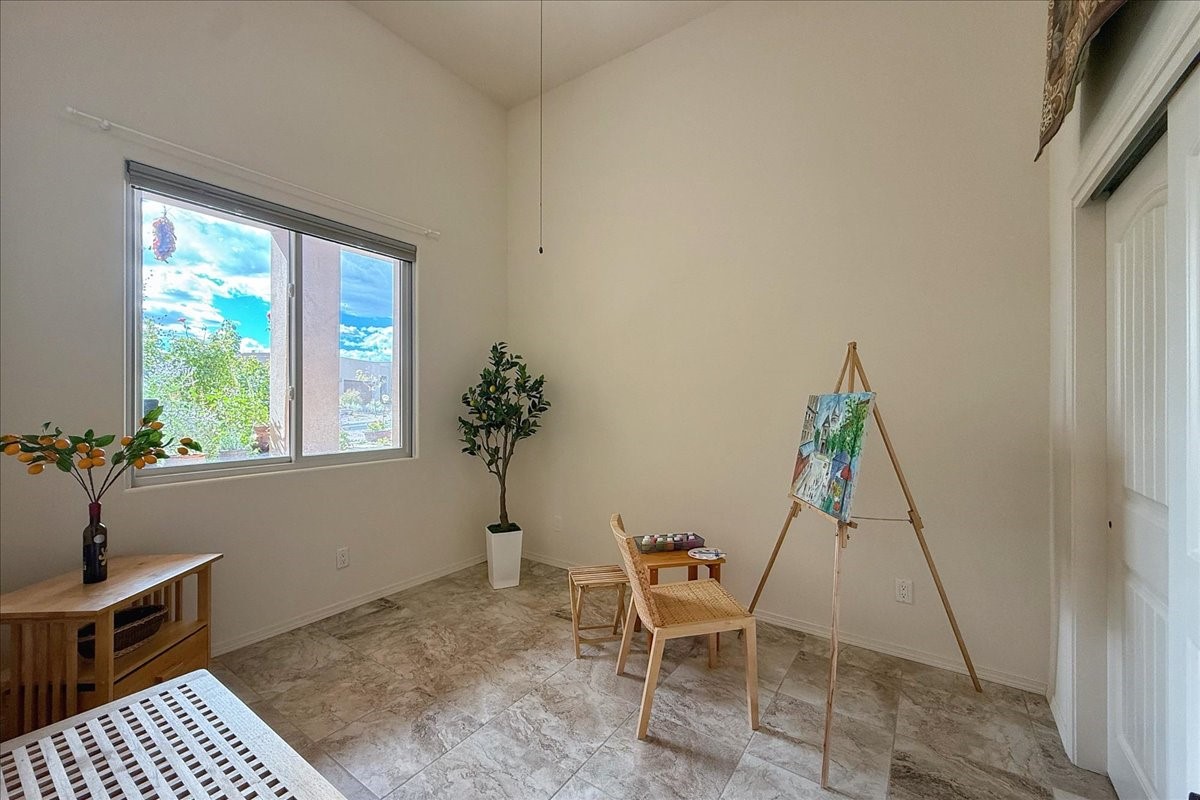 Beautiful 3-bedroom, 2.5-bath home built in 2015, perfectly situated on a 0.34-acre lot surrounded by natural pinon and juniper open space, just 8 minutes from downtown Santa Fe. Offering 1,850 sq ft of thoughtfully designed living space and a finished 3-car EV-ready garage with workbench area, shelves, and overhead storage, this single-owner home blends Santa Fe charm with modern efficiency. Tall ceilings and large-format tile floors enhance the open feel, while wood ceilings with vigas and latillas add warmth. The kitchen features granite countertops, under-cabinet lighting, gas range, ENERGY STAR® appliances, and hood-mounted microwave. Expansive picture windows frame Sangre de Cristo views, filling the home with natural light. Step from the dining area to a covered patio and a private screened spa retreat with multi-person 220V hot tub off the primary suite. The spacious primary suite offers room for a home office or yoga area, plus a walk-in closet with custom Modular Closets® and built-in staircase to high-bay storage. The primary bath boasts an oversized walk-in shower with no glass door and a private toilet area. Energy efficiency abounds with 31 owned solar panels to power spa, home and 300 miles daily for up to 3 EVs, foam-core insulation, radiant floor heat, solar tubes, recirculating hot water, whole-house fan, and motorized exterior sunshades. Additional features include a water softening and revese osmosis systems, radon mitigation, low-VOC finishes, and a partially concrete driveway for easy snow removal. The driveway can accommodate 5 cars in addition to garage. Outdoors, enjoy professional landscaping, drip irrigation, a secluded flagstone patio for dining or stargazing, a fully fenced garden area with shed, and rainwater barrels. Scenic walking trails with mountain views. Convenient access to Hwy 599 makes commuting to Los Alamos or the Santa Fe Airport a breeze--this home delivers mountain views, sustainability, and comfort in one perfect package.