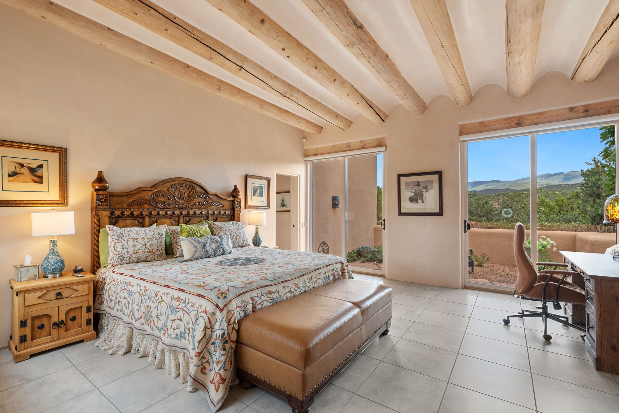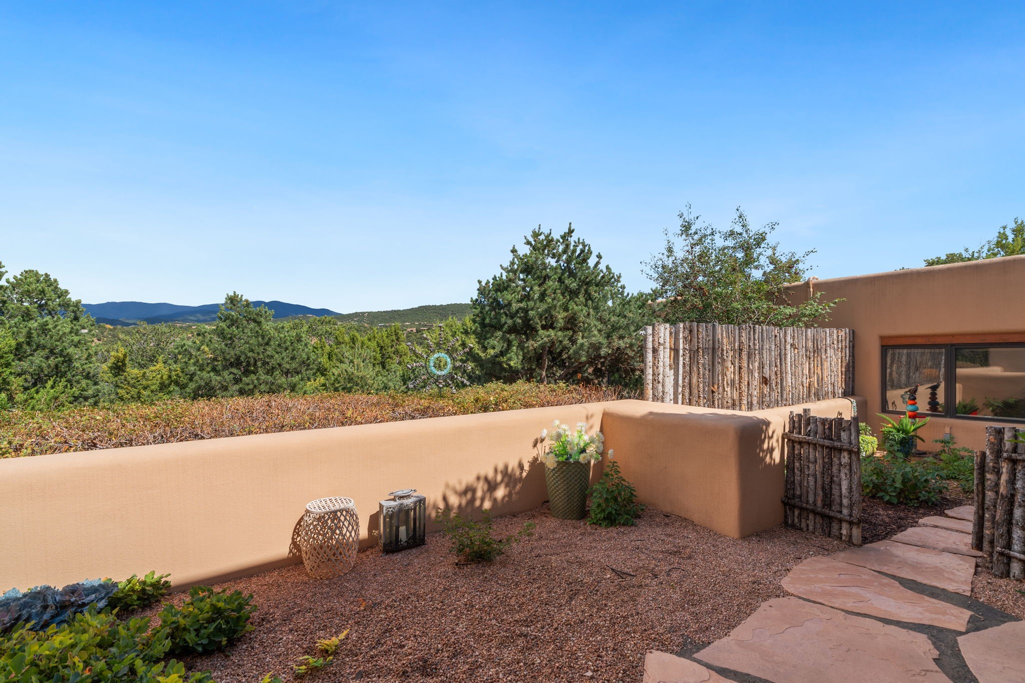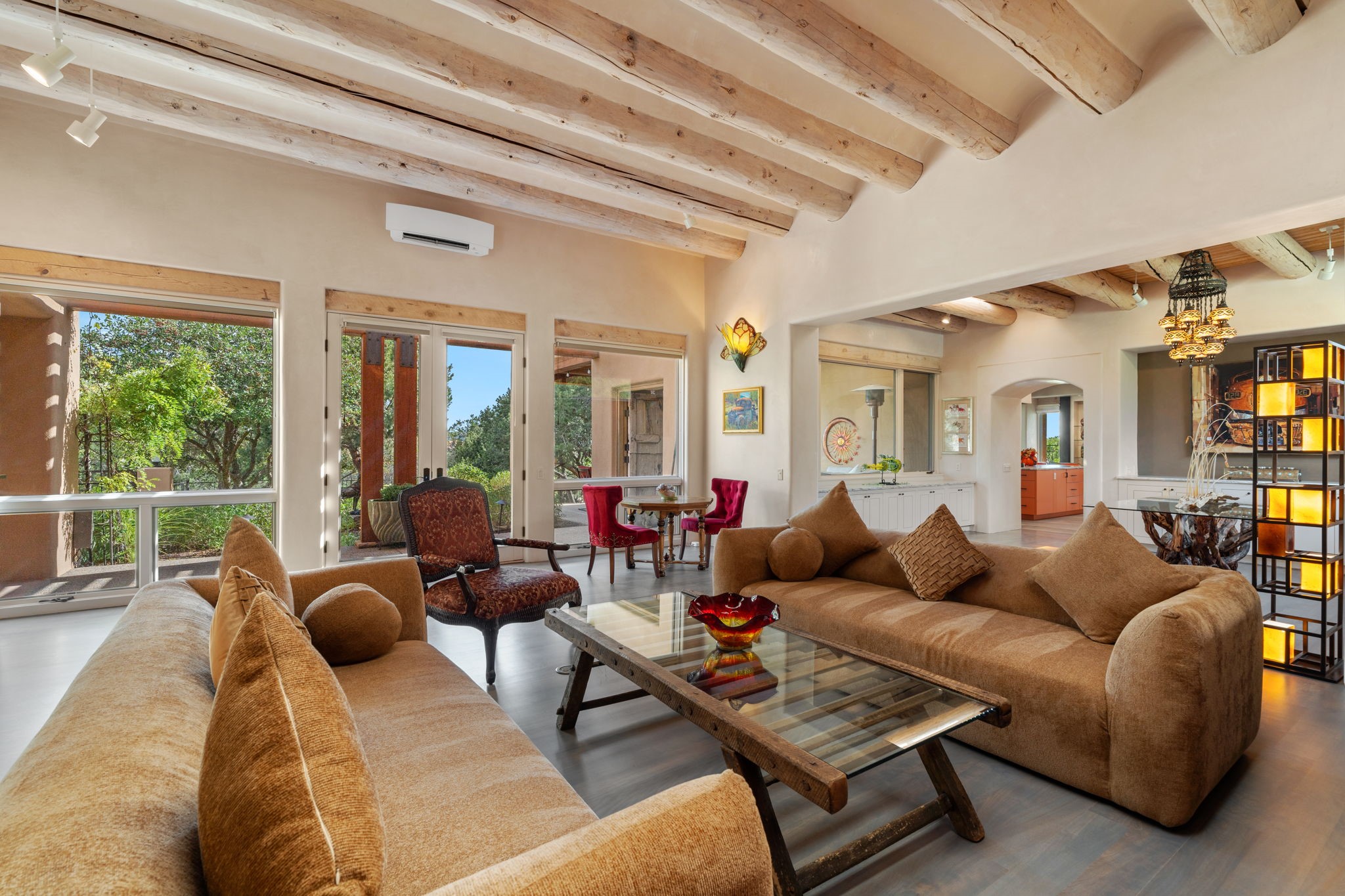 Tucked just a mile from the historic Santa Fe Plaza, this exceptional adobe estate blends classic Northern New Mexico architecture with modern sophistication. Set on a wooded, private property, it features a 3,263 sq. ft. main house and a 1,340 sq. ft. detached casita--ideal for guests or extended family.Handcrafted details abound: viga beams, tile and hardwood floors, and softly curved adobe walls that invite natural light. The great room offers tall ceilings, a grand fireplace, and picture windows framing mountain views. Double doors open to a covered portal with outdoor fireplace and seating for year-round entertaining.Remodeled in 2024, the chef's kitchen includes a six-burner range, convection oven, oversized island, premium appliances, built-in bar, and coffee station--perfect for gatherings large or small.The primary suite is a serene retreat with fireplace, private portal, and spa-style bath with dual closets, double vanities, soaking tub, and glass-enclosed shower. A guest suite, radiant heating, skylights, and seven mini-splits enhance comfort throughout.The detached casita echoes the main home's charm, offering two bedrooms, two baths, a kiva fireplace, wet bar, breakfast nook, and office area--an ideal guest or studio space.Outdoors, multiple patios and sitting areas blend seamlessly with the landscape. A 3,000-gallon cistern supports irrigation, and an EV-ready outlet adds modern convenience.With timeless adobe design, curated upgrades, and proximity to downtown Santa Fe, 1085 Camino Maana captures the essence of refined Southwestern living.