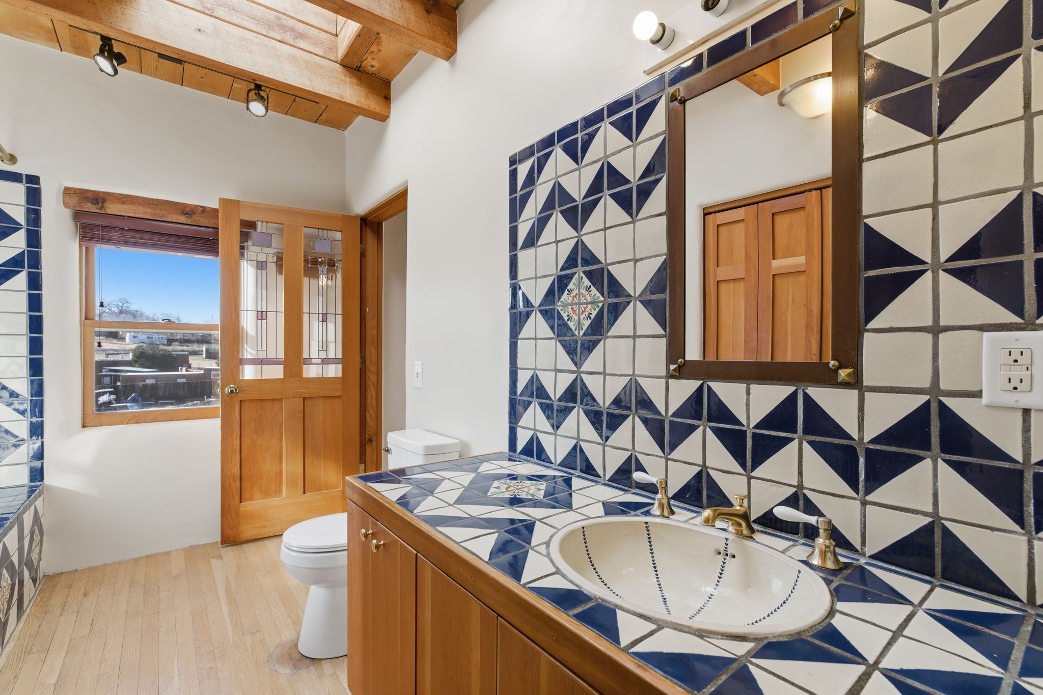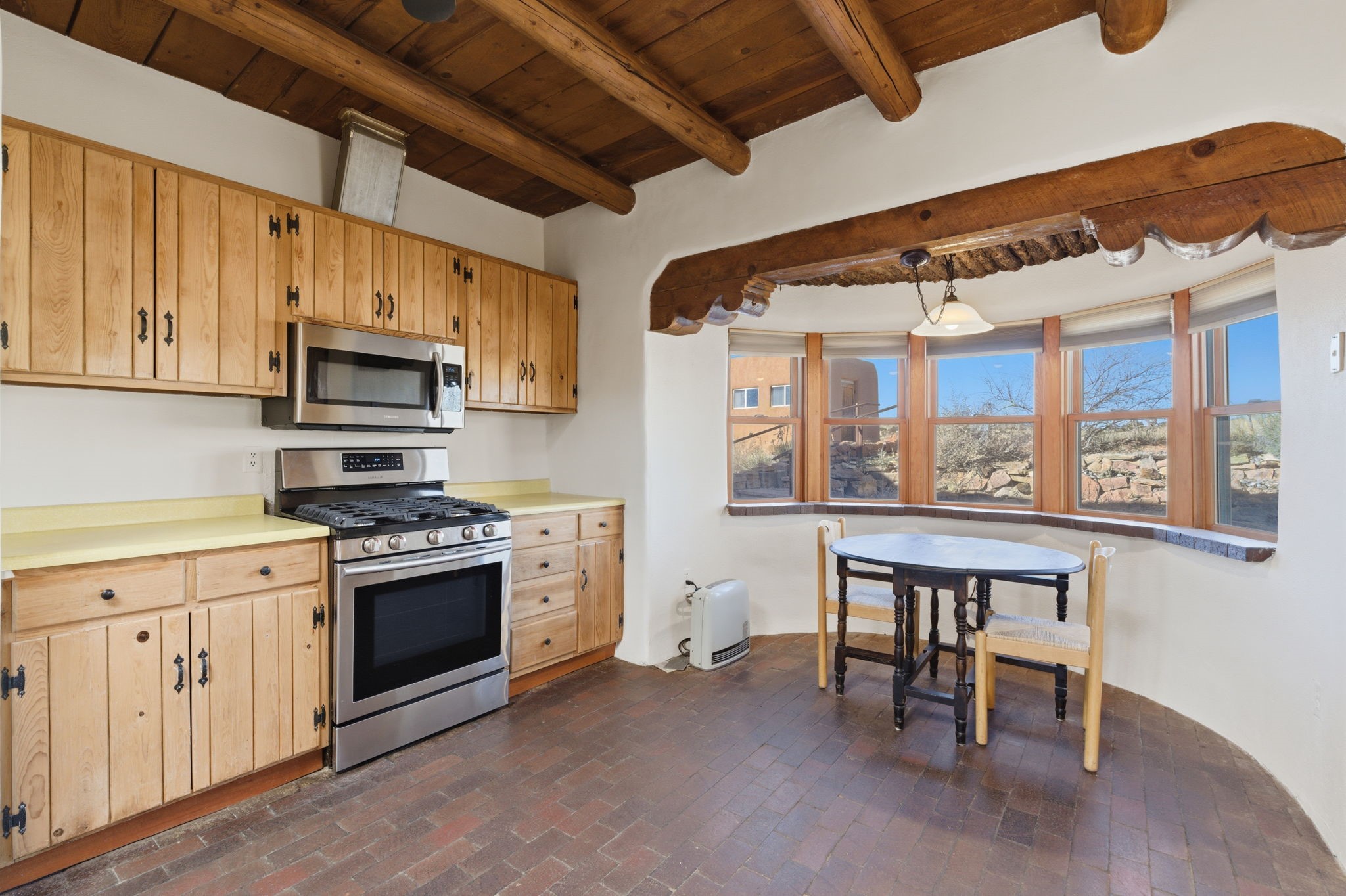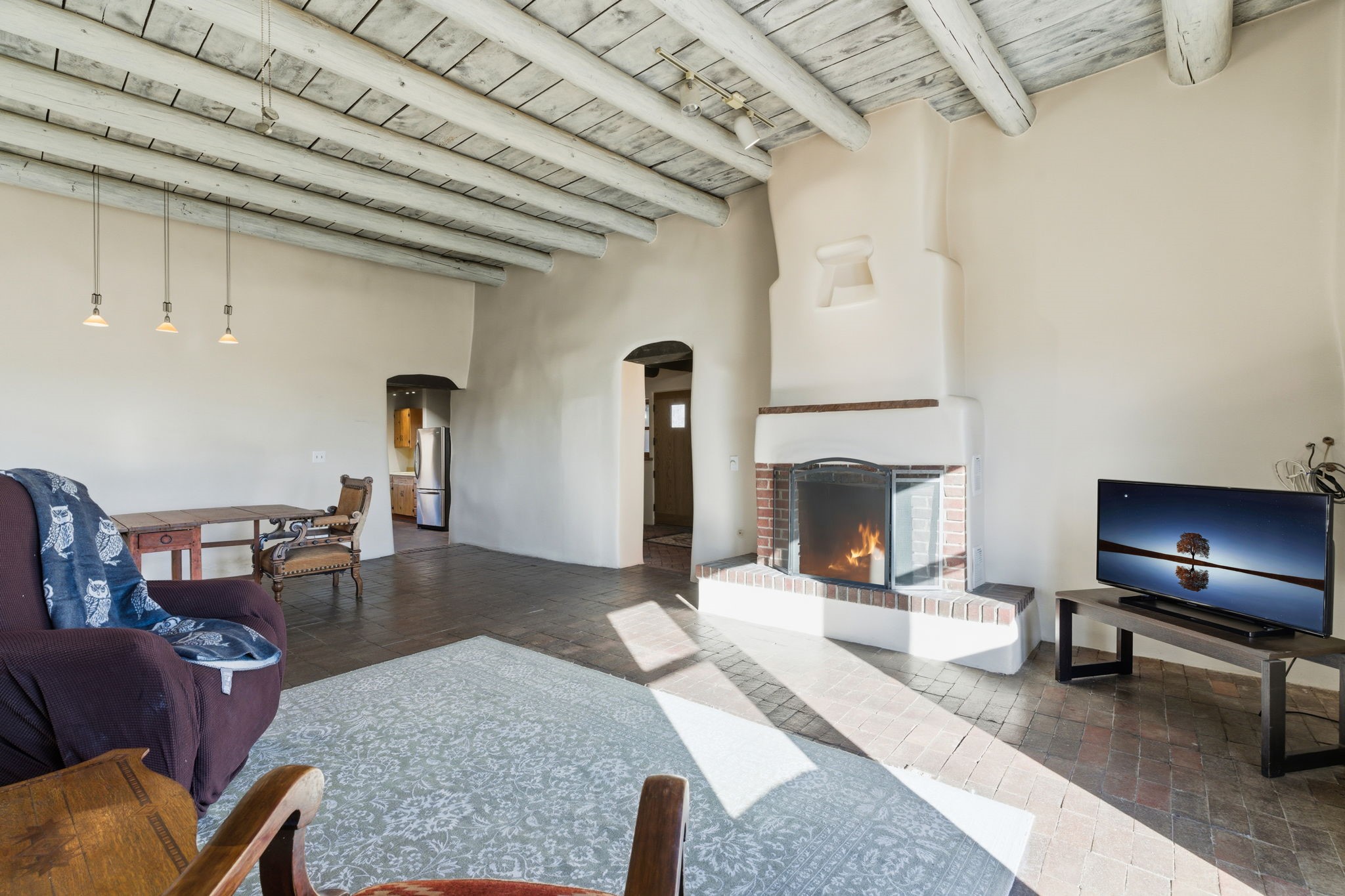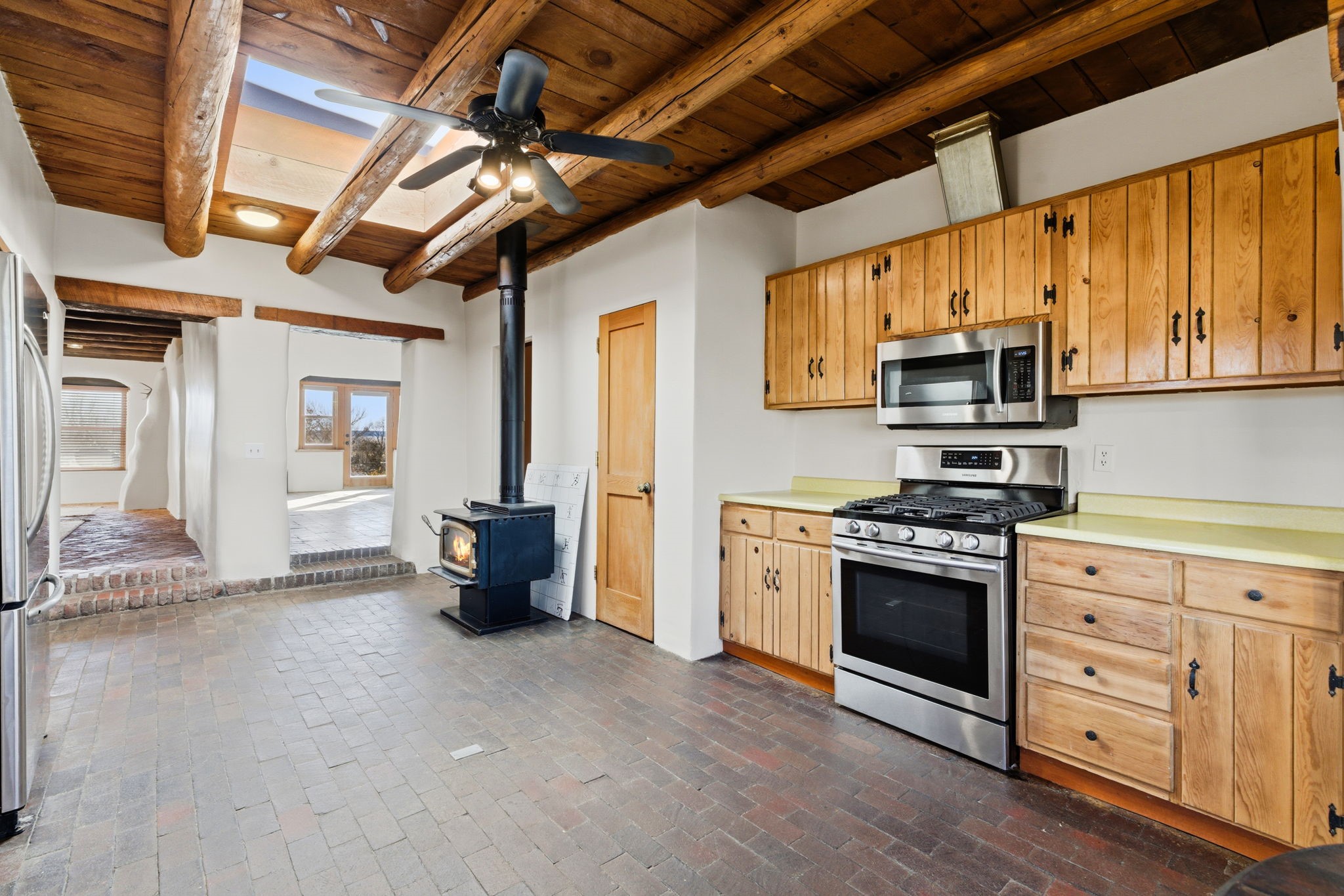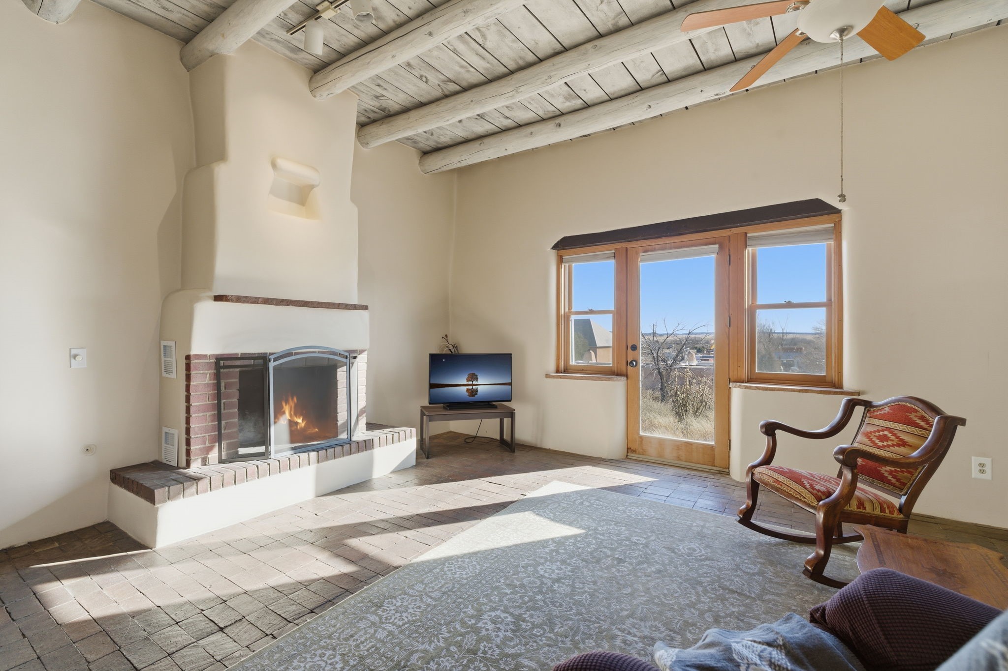 Experience life in the historic village of Galisteo! This authentic adobe construction 2-bedroom, 2-bathroom home has a classic Santa Fe feel, with kiva fireplaces, vigas, and all of the "old school" charm. This property also offers a 448 sq. ft, detached studio with electricity - perfect for artists or hobbyists. Overlooking the village church originally built in 1884, this home is perched just above the town of Galisteo, perfectly situated to take advantage of proximity to the village, but also beautiful pastoral views. As soon as you step into the front door, you are greeted by brick floors, thick vigas, and beautiful organic curves. The living room and dining room have high ceilings and views that look out onto the village. The eat-in kitchen will have you relaxing in soft morning light with a wood stove and a cozy nook. A sensible split floorplan showcases two bedrooms on opposite sides of the home. Each bedroom has its own bathroom. The second bedroom even has its own exterior entrance, ideal for guests or family members that might come to visit. Recent upgrades include a new bathroom vanity and toilet, a roof maintenance, and stucco and canale maintenance. Santa Fe is less than 30 minutes away, and shopping and dining are 15 minutes away in Eldorado. Enjoy studio tours and concerts in the creative hub of Galisteo, and hike, bike or ride your horse on over 48 miles of trails in the nearby Galisteo Basin Preserve. This home offers a tranquil lifestyle with lots of character and southwestern charm. Don't miss out on this charmer! Schedule a showing today!