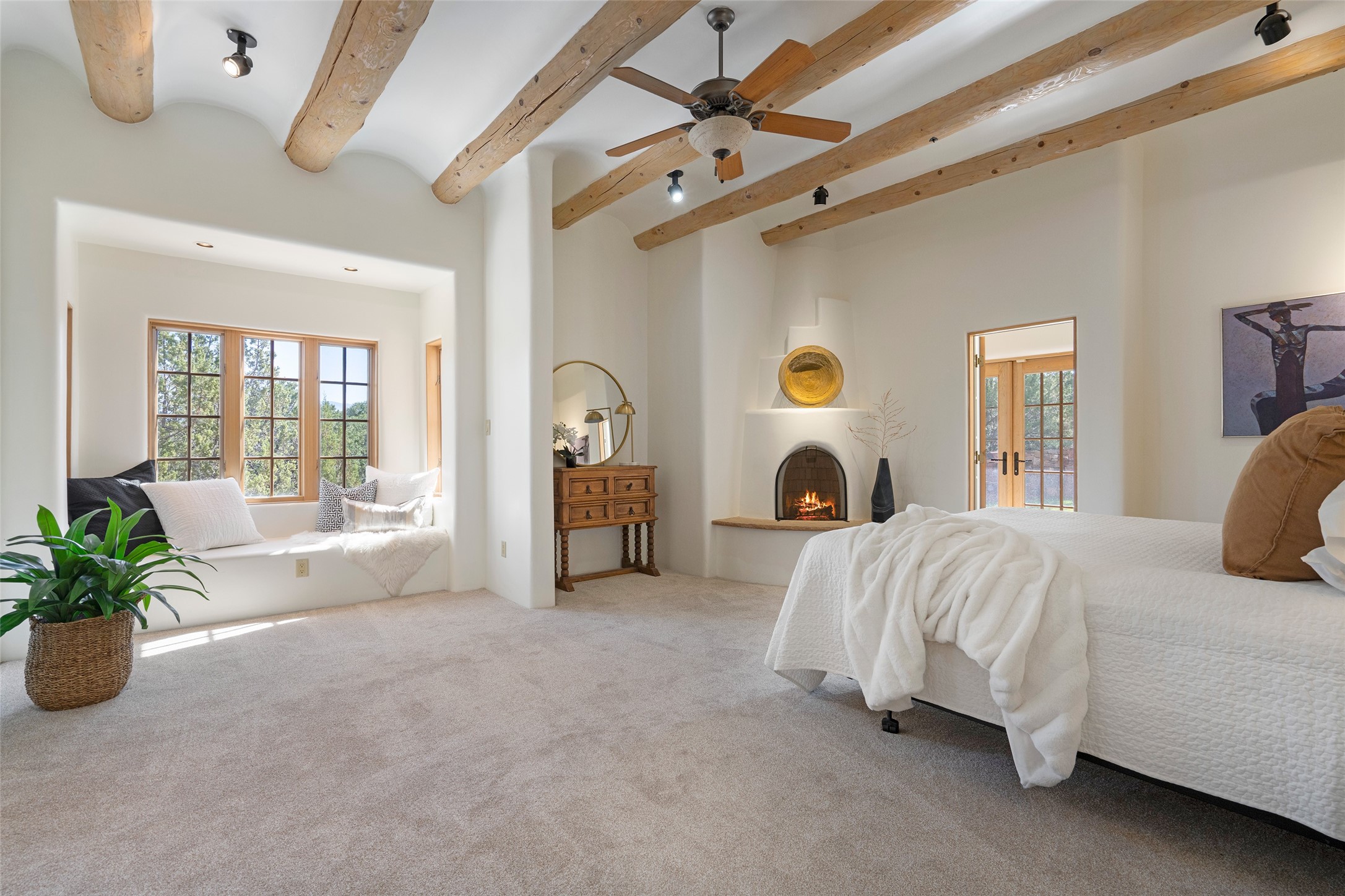 SERENE & PRIVATE SANTA FE ESTATE. Nestled on over 2 acres in one of Santa Fe's premier communities, this 4 bedroom, 4.5 bath home offers an elegant blend of scale and comfort. Thoughtfully designed for both grand entertaining and easy day-to-day living. A light filled great room with a fireplace anchors the home, while patios off nearly every room invite seamless indoor/outdoor living. The recently remodeled kitchen will delight culinary enthusiasts, and a finished office space - converted from one of the 3 garage bays - adds flexibility for today's lifestyle. The private guest addition features its own living room and en-suite, complemented by two additional guest suites each with private baths. Outdoors, a long driveway leads to two lush courtyards filled with grass flowers, trees, and shrubs, Multiple apple trees and two tranquil water features enhance the serene setting. Despite its generous footprint, the home maintains a warm, welcoming feel, filled with natural light and surrounded by native landscaping for privacy. Just minutes from downtown Santa Fe and with easy highway access, this property offers the best of Southwestern living - spacious, secluded, and perfectly situated. *This home is being sold as-is, where is*