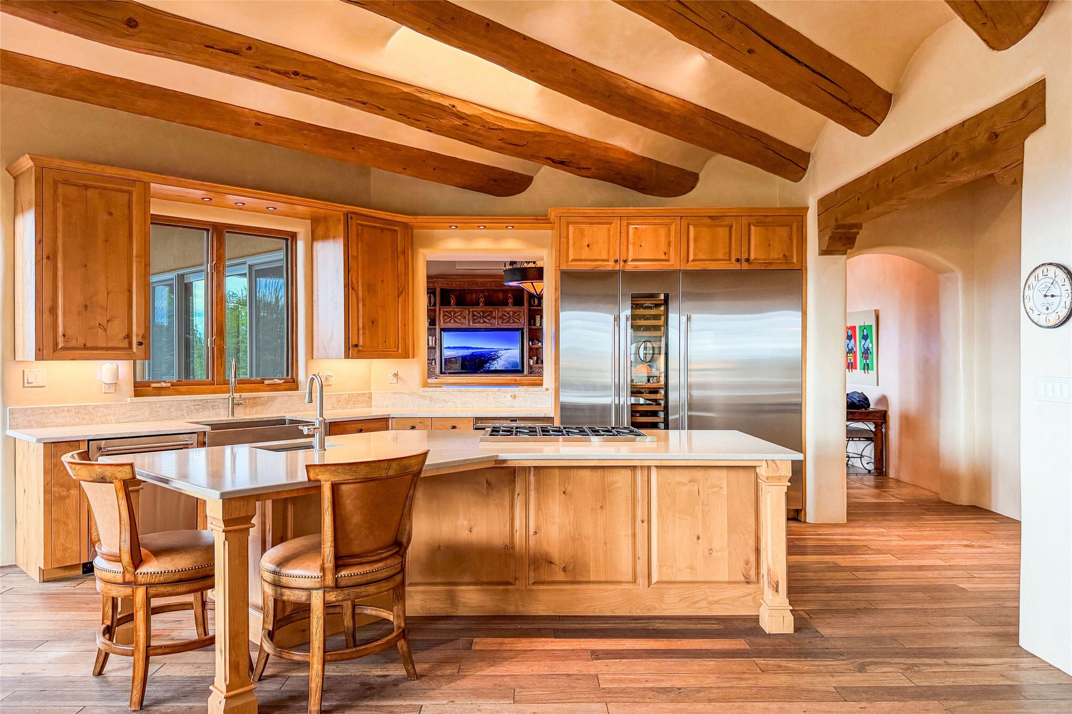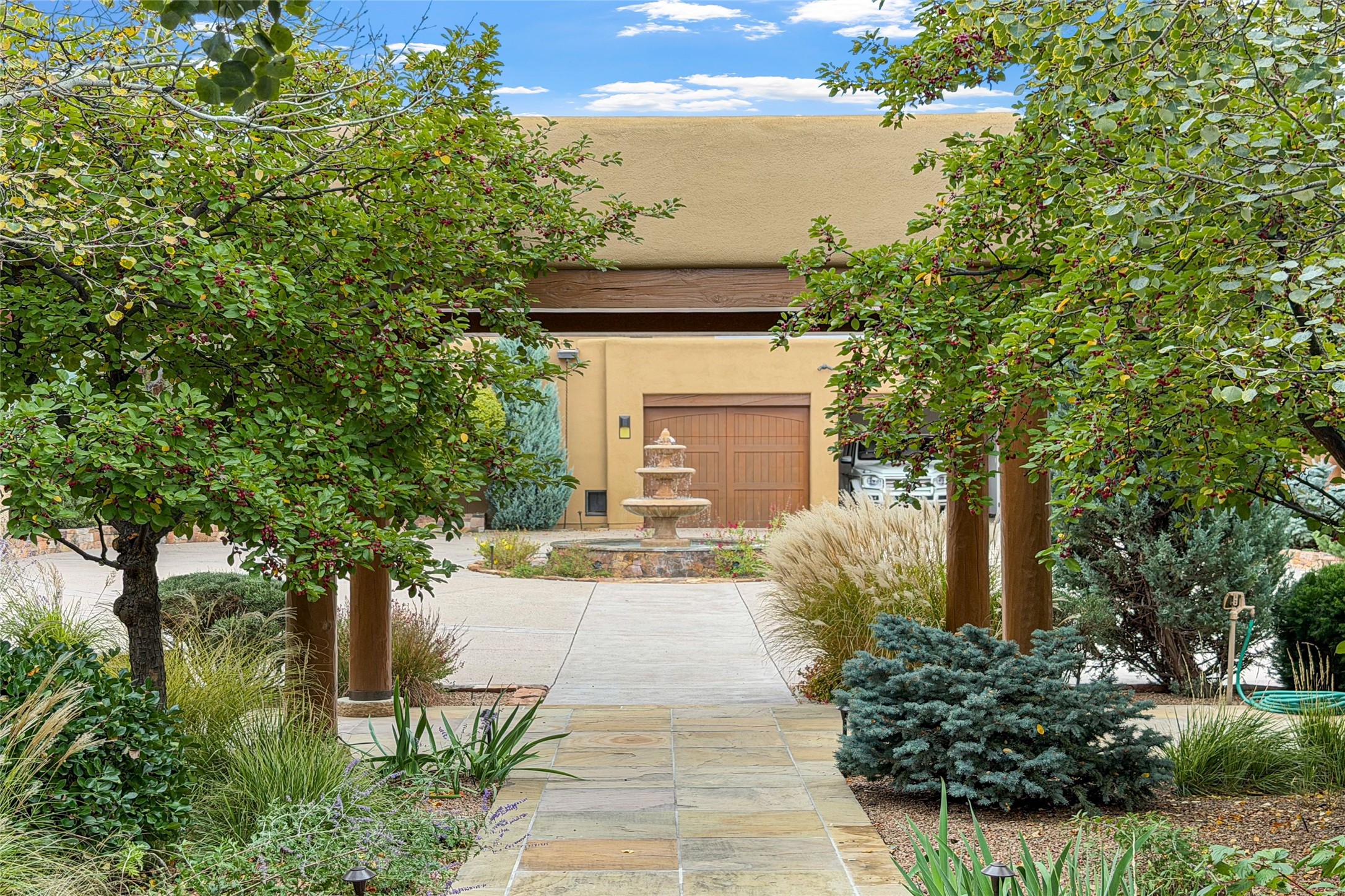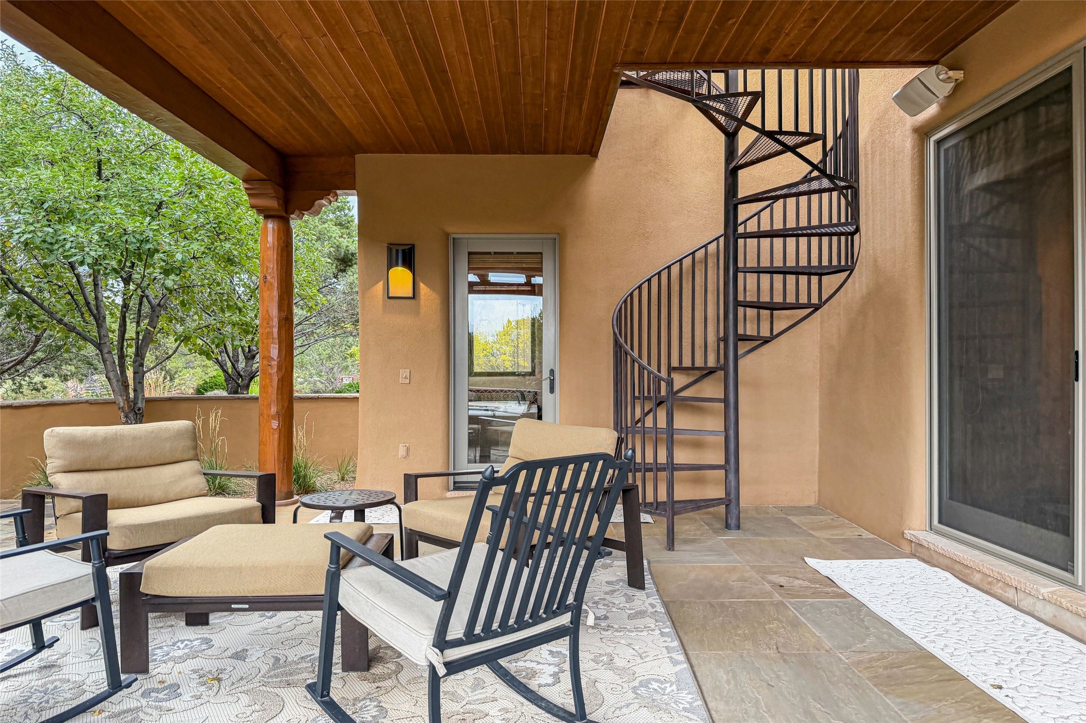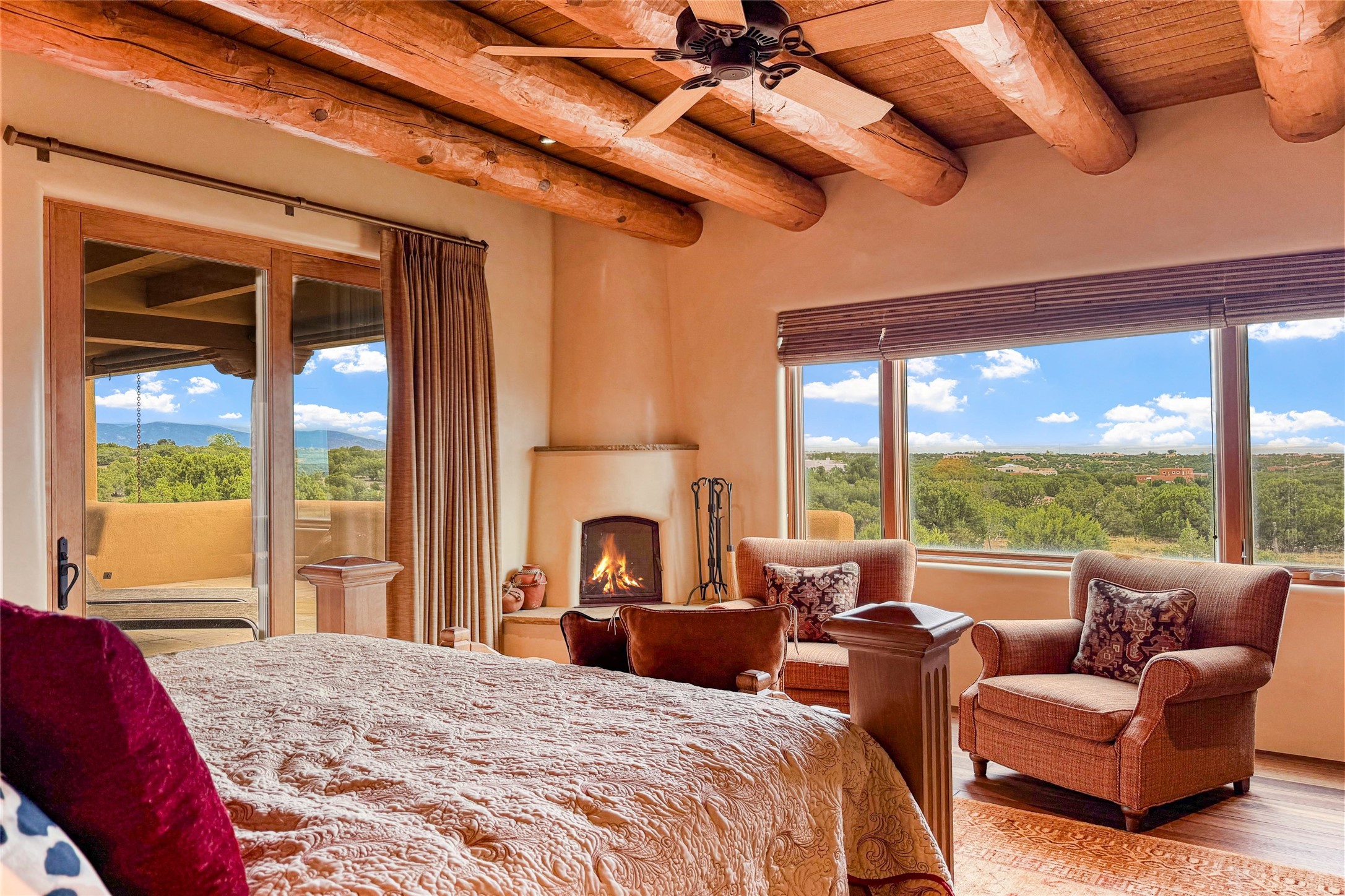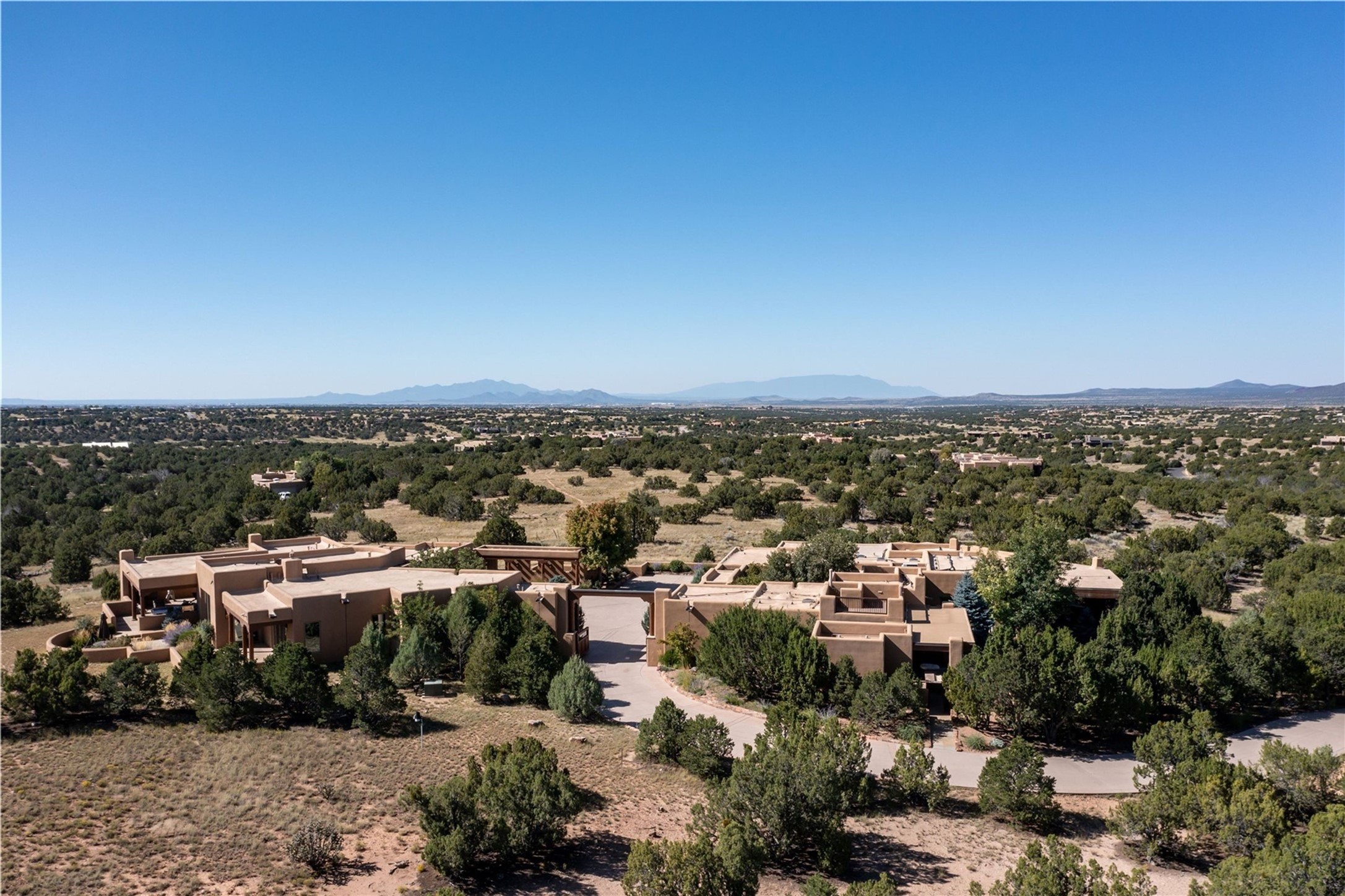 Set high on a private hilltop, and enjoying sunset mountain views, this custom Pueblo Revival compound embodies craftsmanship, substance, and timeless Santa Fe style. Built with quality at every turn and refreshed with a new roof and stucco, the property is introduced by a grand, gated courtyard with center fountain, full poured concrete drive, and a spacious garage for 4 cars. The 3-bedroom main residence, remodeled by Kim Dressel in 2012, reveals artisan details from the moment you step into the dramatic Zaguan entry. Finishes include slate floors, carved woodwork by master craftsman David Naylor, thick plaster walls, and a freestanding bar that anchors the open living and dining spaces. The chef's island kitchen features Wolf, Sub-Zero, and wine refrigeration, ideal for both daily living and entertaining. The split-bedroom layout offers privacy, while the primary suite is a sanctuary with dual closets, built-ins with fridge, kiva fireplace, and a dedicated exercise room. Outdoor living extends to multiple portals, a rooftop deck with 360 mountain views, a full kitchen, fireplace, and an elegant in-ground cocktail pool. The 3,050 sq. ft. second residence, newly built by Kim Dressel in 2013, echoes the same solid construction and fine finishes. With 2 bedrooms, 2 living rooms, a full kitchen and dining space, carved details by David Naylor, and far-reaching Sangre de Cristo and Jemez views, it offers luxurious comfort. Special features include a built-in bar, 90-inch screen with 9-speaker theater, and an expansive portal with pizza oven, grill, and fireplace. Additional amenities--a workshop, generator, and 15,000 gallon irrigation cistern--enhance function and reliability. Only 15 minutes from The Plaza and Santa Fe Airport, this compound is ideal for multi-generational living or hosting guests in a one-of-a-kind setting where custom design, quality finishes, and Pueblo Revival authenticity define the experience. A contiguous 1.7-acre lot on Black Mesa may be available separately. Membership to the Club at Las Campanas is available for purchase and upon approval.
