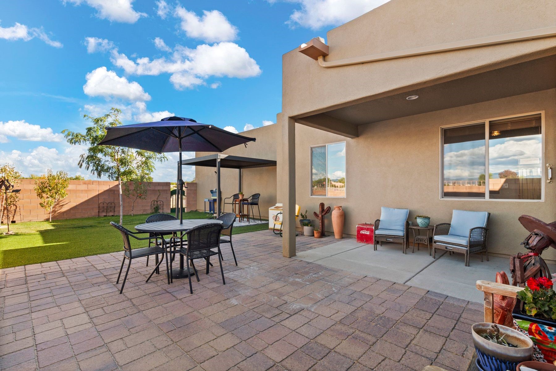 This Rancho Viejo home combines soft contemporary style with functional design. The open concept floor plan supports easy living, and the primary suite is privately located away from the guest bedrooms. Refined touches add a timeless character, and the property enjoys striking views of the Sangre de Cristo Mountains. A community park with picnic tables, benches, and playground equipment sits just a block away, adding to the appeal. Stretching across 11,000 rolling acres, Rancho Viejo is thoughtfully planned to provide a sense of community, while maintaining the wide open spaces with 50 percent of the land preserved as natural open space, parks and winding trails. The combination of comfort, style, and setting makes this a truly inviting residence.
