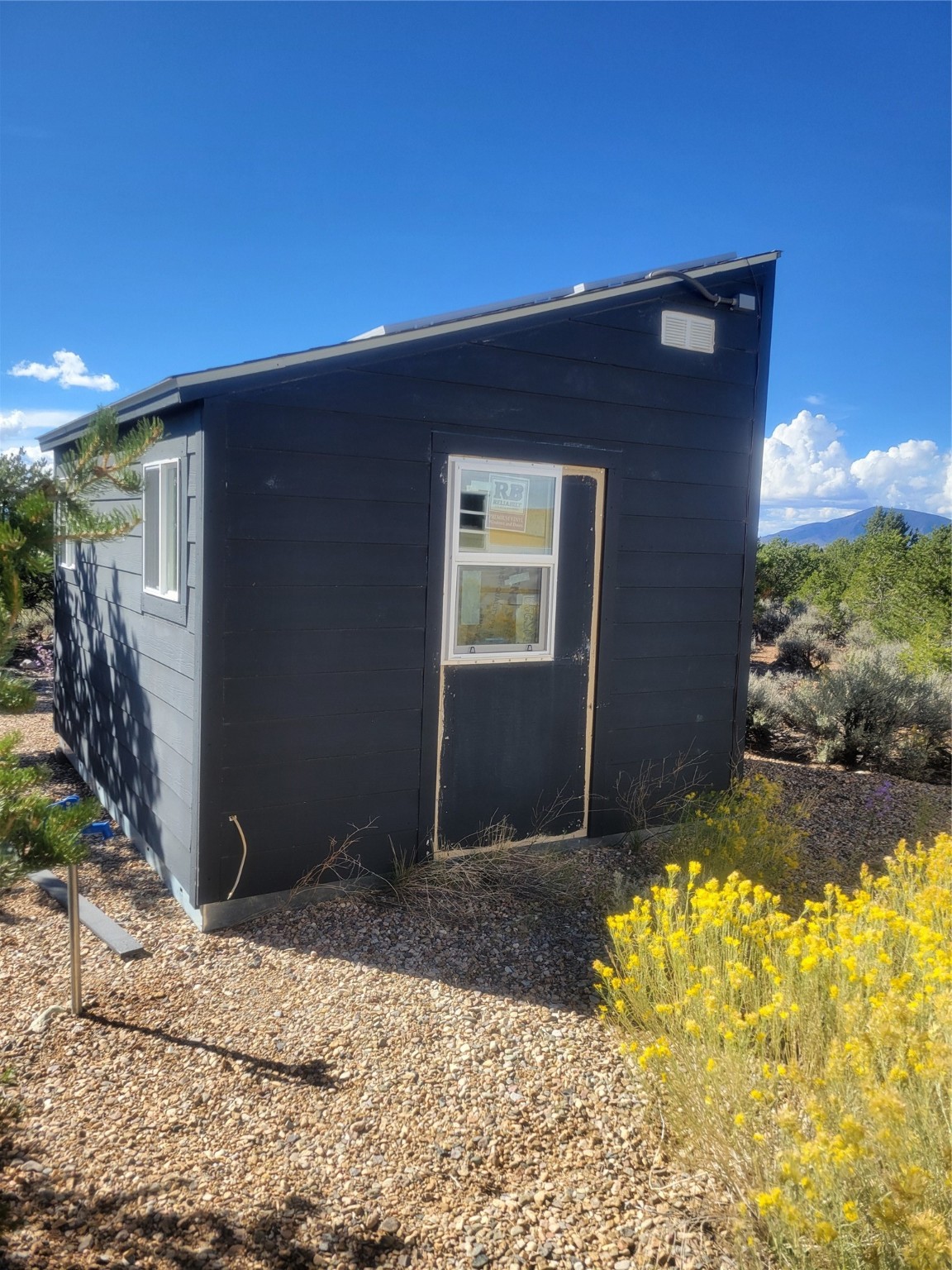 This is a place which needs to be seen in person as pictures won't do it justice. Nestled in between the pinon and juniper trees at the base of the Latirs, this peaceful and serene 5-acre improved lot has so much to offer. Three separate structures are already present. Each one is plumbed. Two of them can be turned into whatever your imagination brings. The current owner was going to house artists. The third structure houses the well, which is powered by solar cells. Electric is right by the lot however, should you want to tap into the grid. The lot has been cleared, and gravel driveways are already there. This is a must see for anyone looking for a special place.