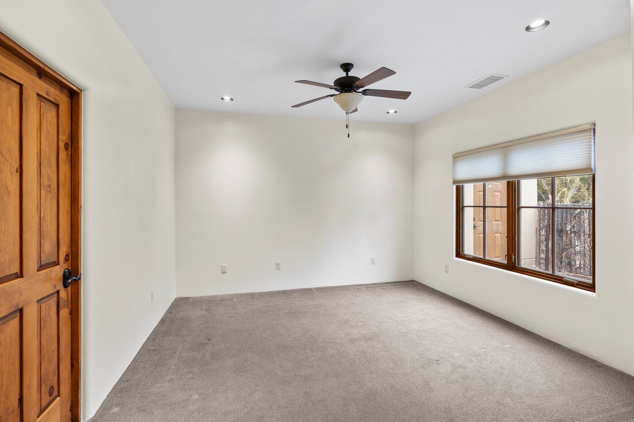 You will fall in love with this stunning Santa Fe-style home, perfectly positioned in the highly sought-after Aldea de Santa Fe community. Set on a quiet cul-de-sac and backing to open space, this property offers exceptional peace, privacy, and breathtaking views in every direction.The 2,635-square-foot residence features 4 bedrooms and 3.5 bathrooms, with three bedrooms located in the main house and a beautifully appointed detached guest casita. Ideal for visitors or extended stays, the casita includes an en-suite bathroom and a convenient coffee bar, and is comfortably heated and cooled by a mini-split system.Enjoy unforgettable sunsets over the Jemez Mountains from the welcoming front portals, while the backyard captures sweeping views of the Sandia Mountains. Indoor and outdoor living blend seamlessly, creating the perfect setting for both quiet mornings and evening gatherings.Inside, the home showcases gorgeous Santa Fe finishes throughout, including hand-troweled plaster walls, wood beam ceilings, and a combination of wood and travertine flooring. The spacious cook's kitchen is designed to impress, featuring rich alder cabinetry, granite countertops, stainless steel appliances, and an Italian gas range. A large walk-in pantry provides ample storage for all your culinary needs.Comfort and warmth are found throughout the home with radiant in-floor heating and air conditioning in the main house. Two gas-burning fireplaces--one in the living room and one in the primary bedroom--add ambiance and coziness on cool winter nights.The oversized garage offers exceptional flexibility, with a tandem garage on one side and a single-car garage on the other--perfect for vehicles, storage, or hobbies.This exceptional home combines timeless Santa Fe style, modern comfort, and unparalleled views, all in one of Santa Fe's most desirable neighborhoods. Community center, pickle ball, tennis and basket ball courts, 13 miles of walking trails, community events.