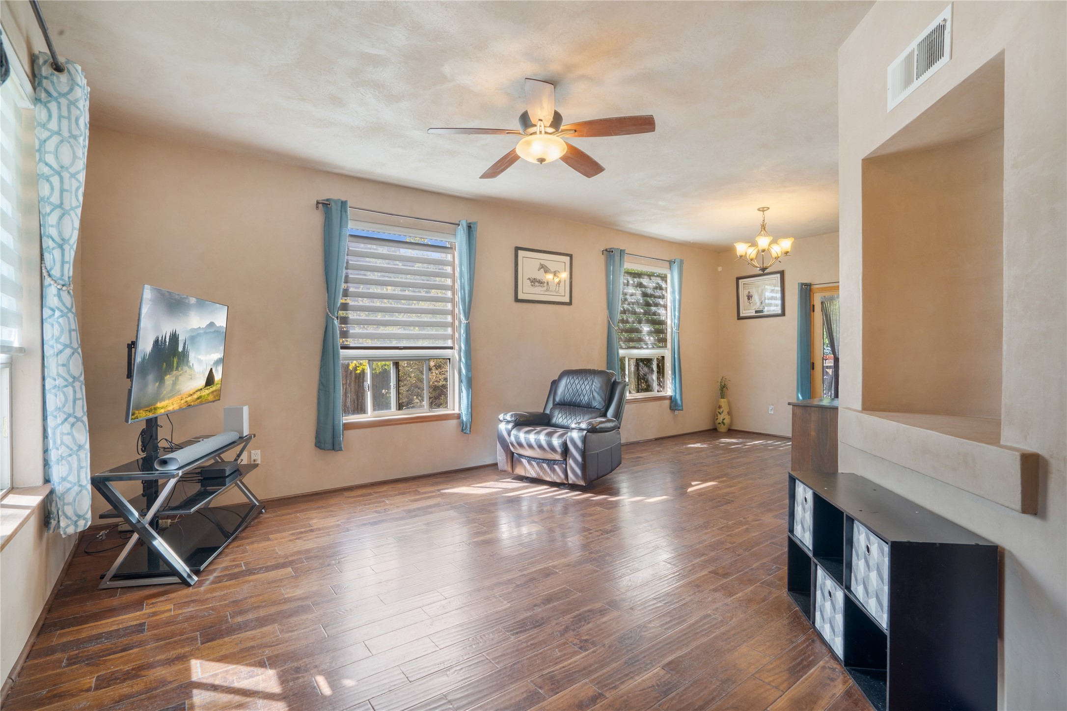 Charming 2-bedroom, 1-bath home with a 1-car garage and off-street parking. Comfortable, move-in ready living with tranquil outdoor spaces. A gated, fenced front yard with established, drip-irrigated plantings provides curb appeal and privacy. Inside, the living and dining areas flow into the kitchen, and an updated bathroom showcases clean, modern finishes. The fully enclosed backyard is a gardener's delight with bountiful apple trees and lush landscaping, plus a detached garage that could also serve as a gym or workshop. Ideally located with easy access to I-25 and NM-599 and near shopping, schools, popular restaurants, and Presbyterian Hospital. Schedule your showing today!
