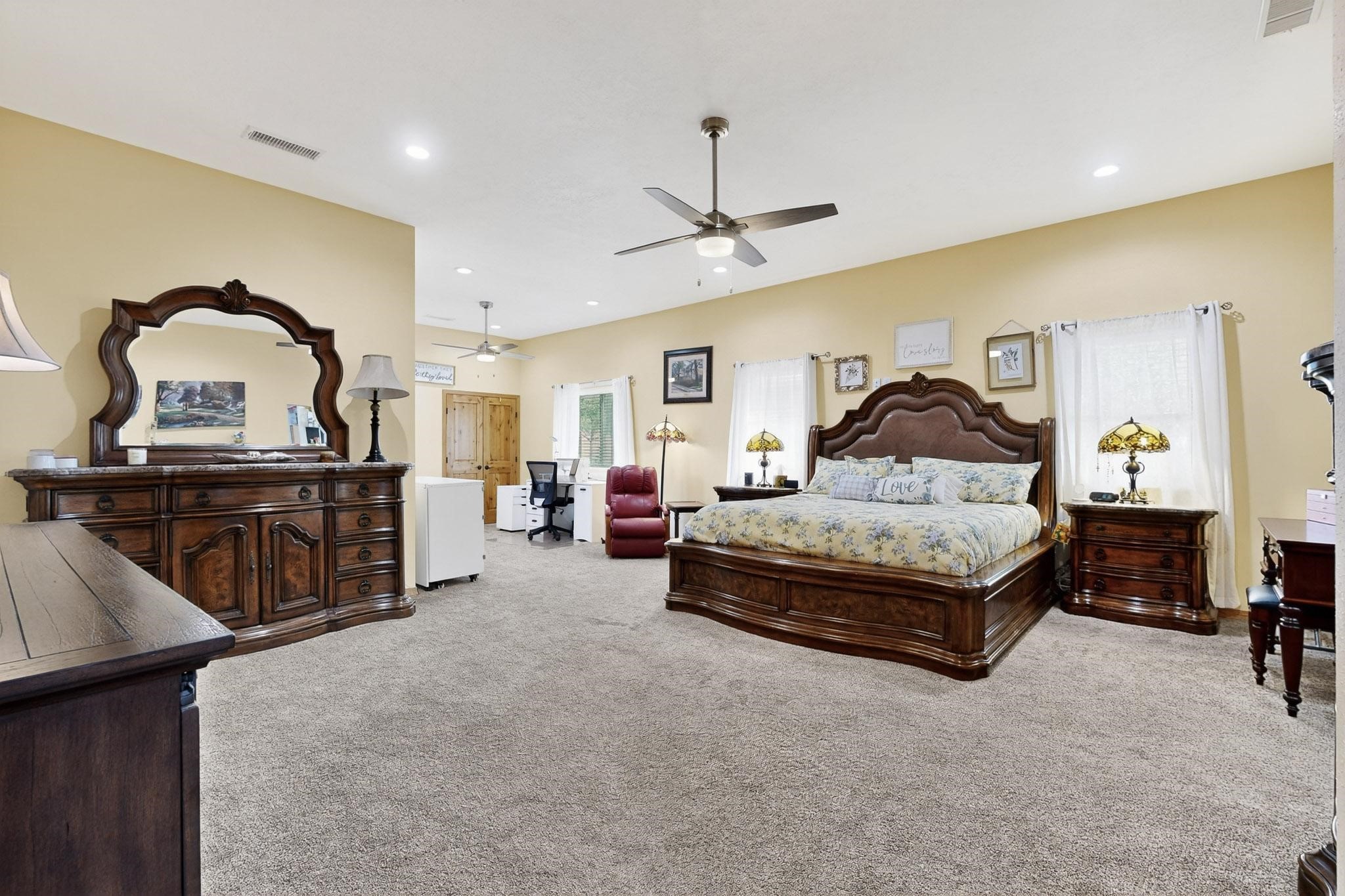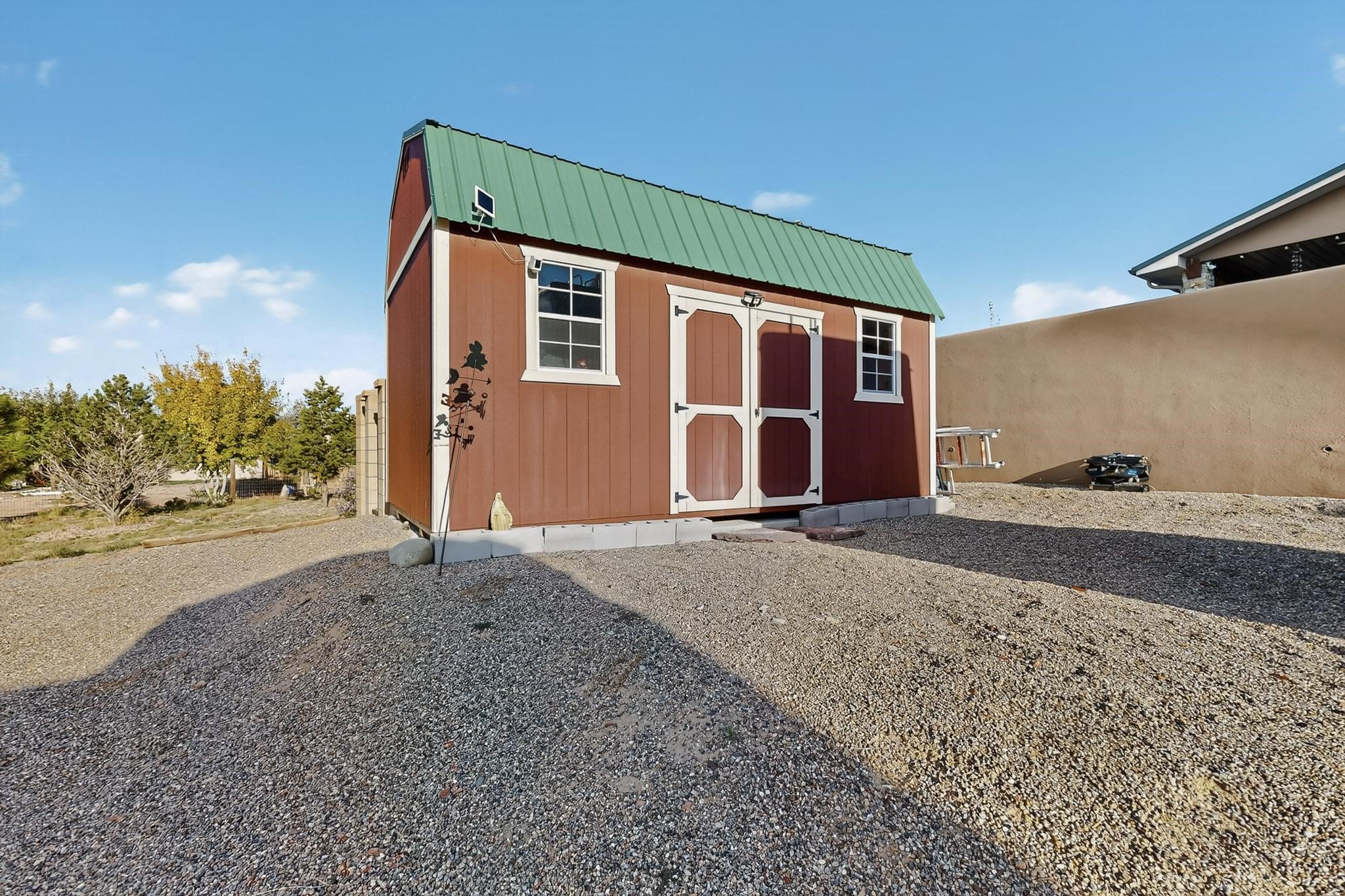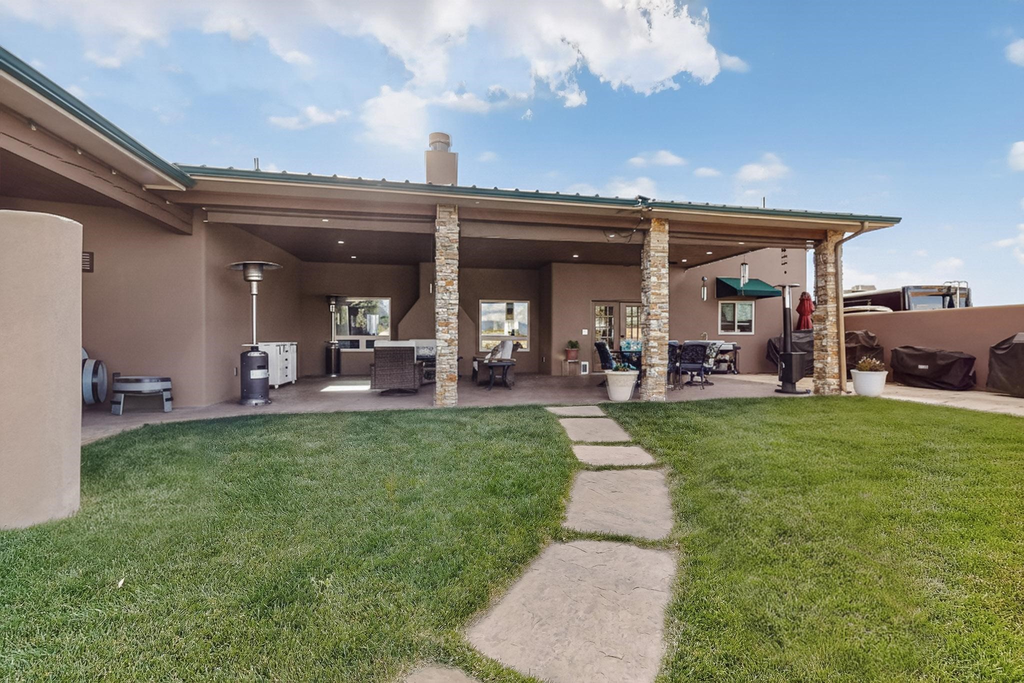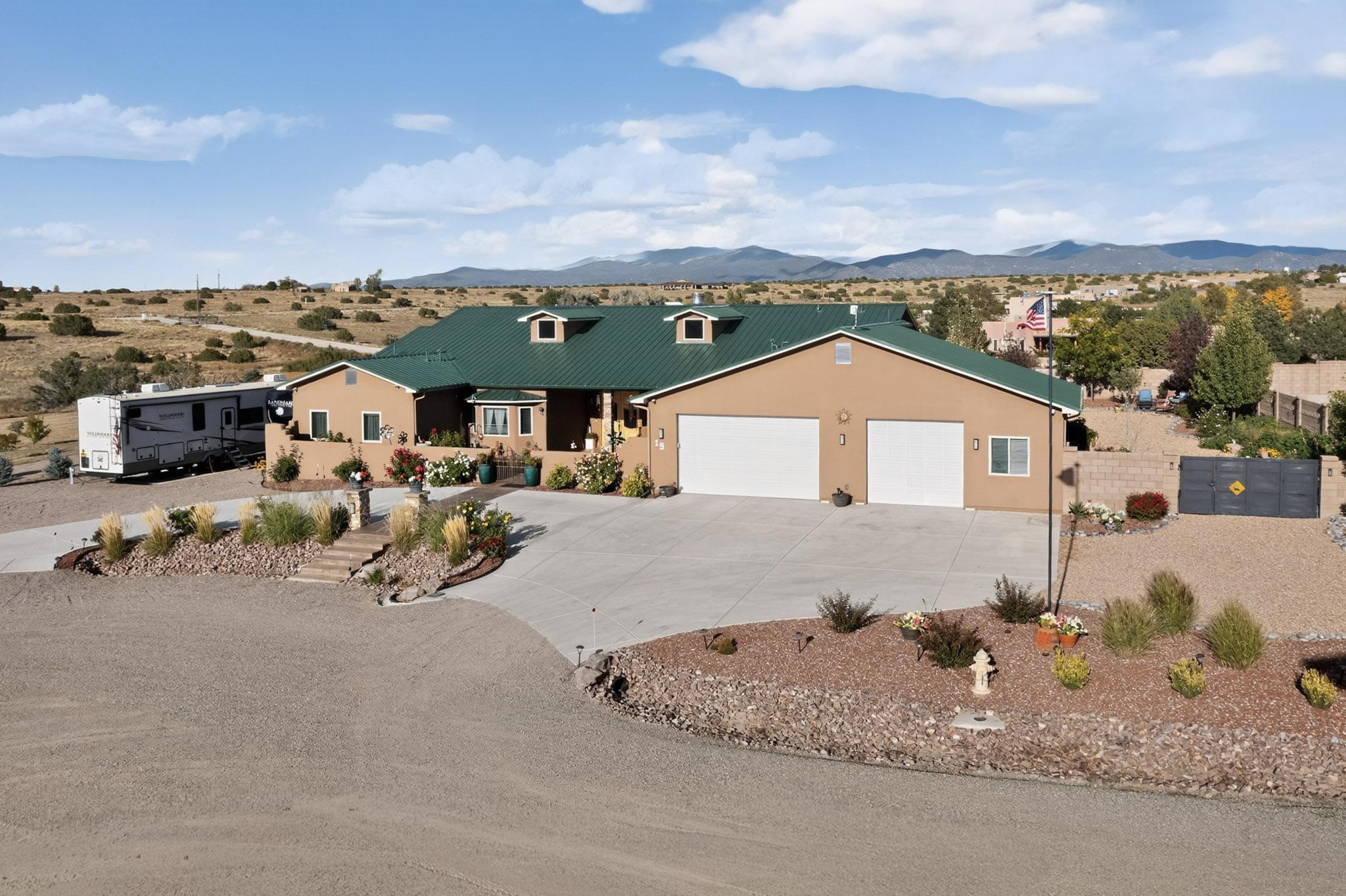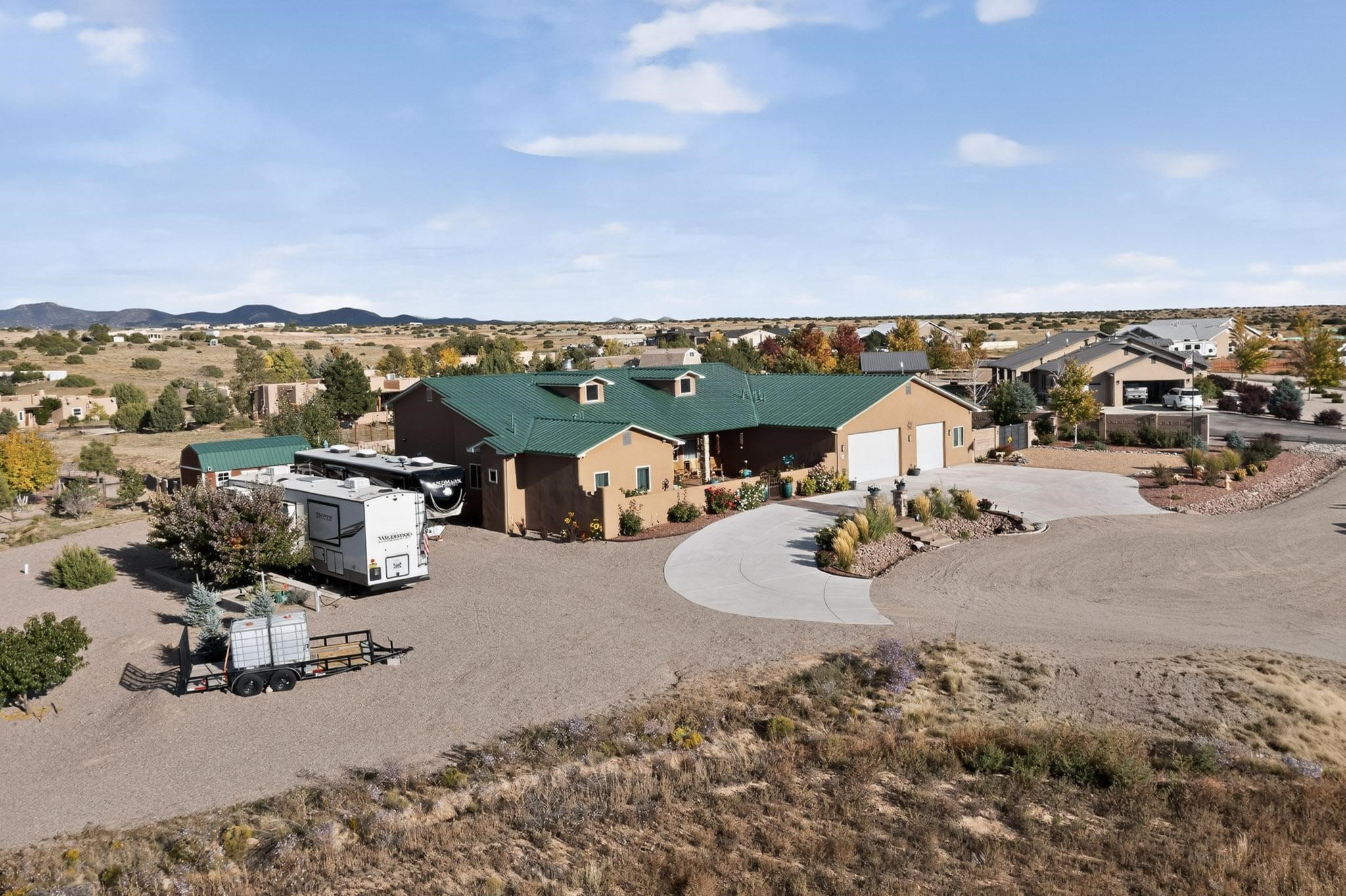 PRICE REDUCED! Nestled in the private, gated community of Valle Serena, this meticulously designed single-level home offers the perfect balance of comfort, luxury, and practicality. Built in 2022, the residence spans 3 bedrooms (two with ensuite baths) and includes an additional full bath and half bath for your guests' convenience. The bright, open-concept interior is both inviting and functional. The living area features soaring ceilings and a cozy wood-burning fireplace, ideal for enjoying Santa Fe's crisp fall evenings and snowy winter nights. Transition effortlessly into the chef's kitchen, a culinary haven outfitted with premium appliances, custom cabinetry, a large island, and a generous butler's pantry for all your storage needs.Step outside to experience your own private oasis -- the fully fenced backyard is beautifully landscaped with fruit trees, a vibrant rose garden, and delicate aspen trees, creating a serene setting to relax or entertain. Whether soaking in the luxurious hot tub or enjoying alfresco dining on the extended patio, you'll be treated to breathtaking views of the enchanting Sangre de Cristo Mountains. This home is not only aesthetically stunning but is also rich with thoughtful amenities, including a pitched pro-panel roof (with a transferable warranty), security system (audio/visual), central refrigerated air conditioning, two storage sheds, and RV parking with hook-ups for added convenience. A spacious 3-car garage, complete with extra storage and workspace, rounds out this home's exceptional offerings. Located just minutes from Santa Fe's world-renowned art galleries, fine dining, and unparalleled outdoor recreation, this residence offers a unique opportunity to embrace privacy, modern luxury, and unbeatable convenience. Don't miss the chance to make this exquisite Southwest retreat your own--schedule your showing today!