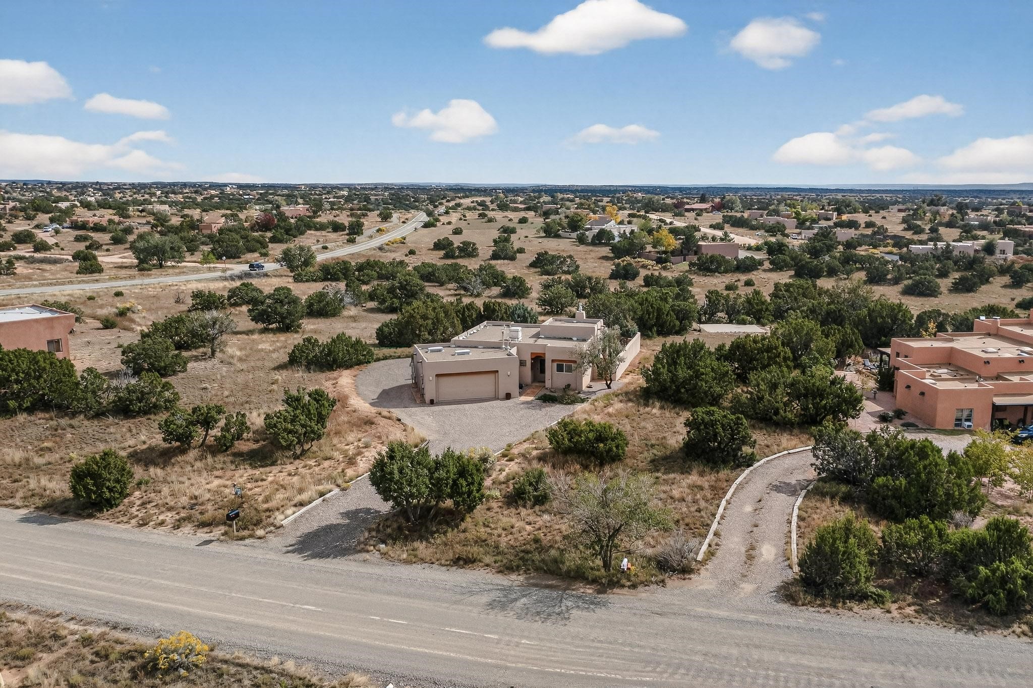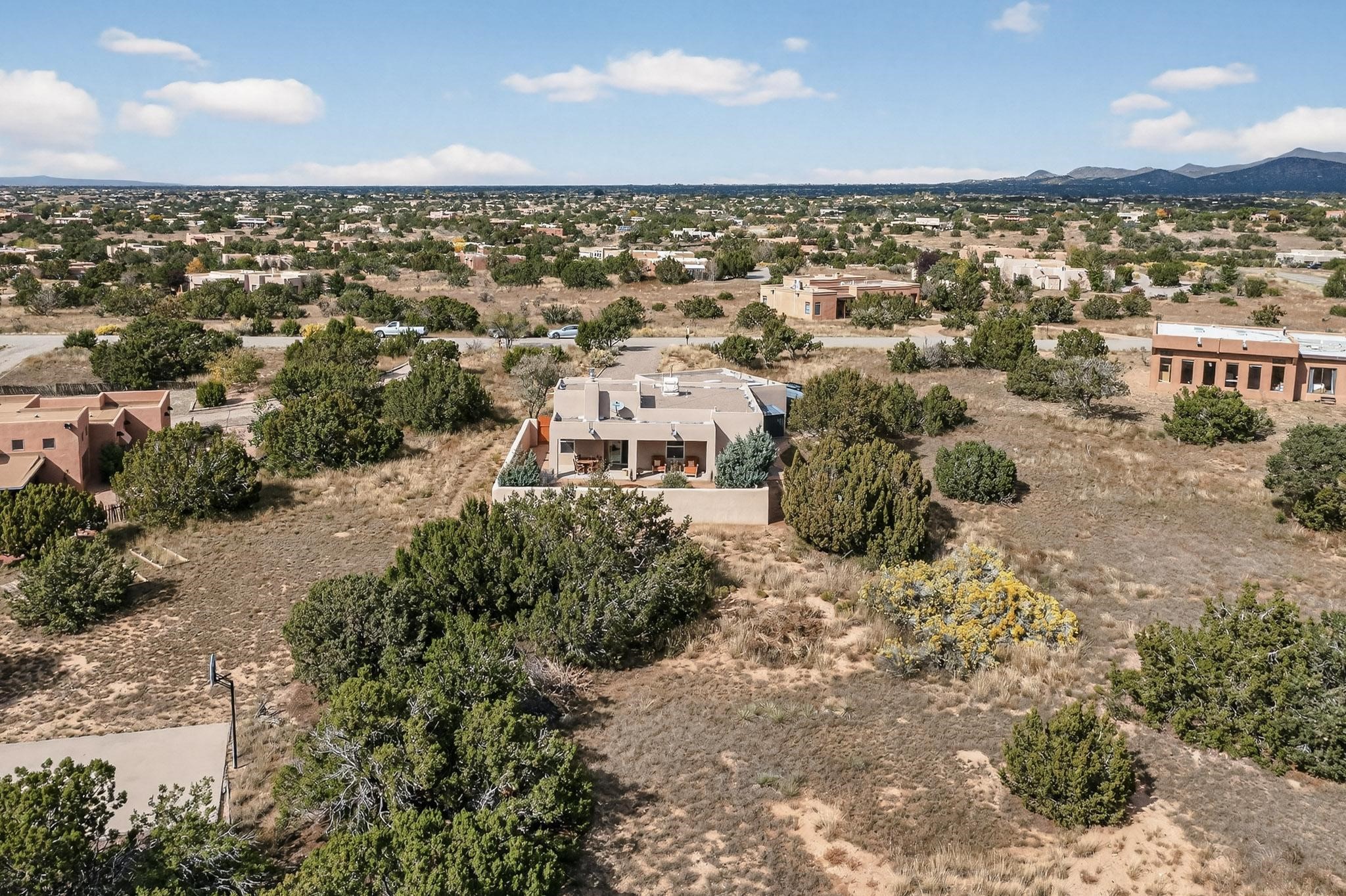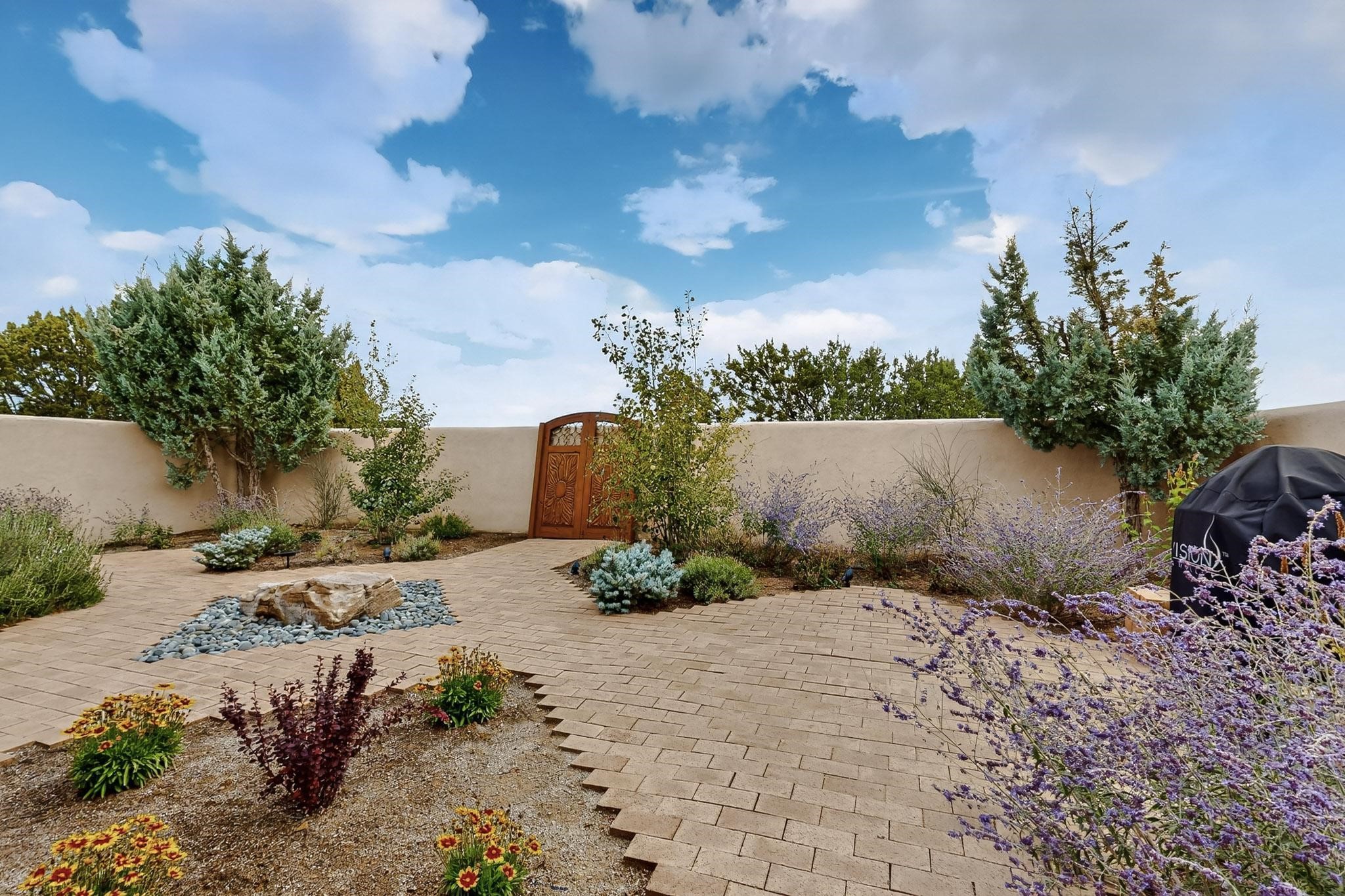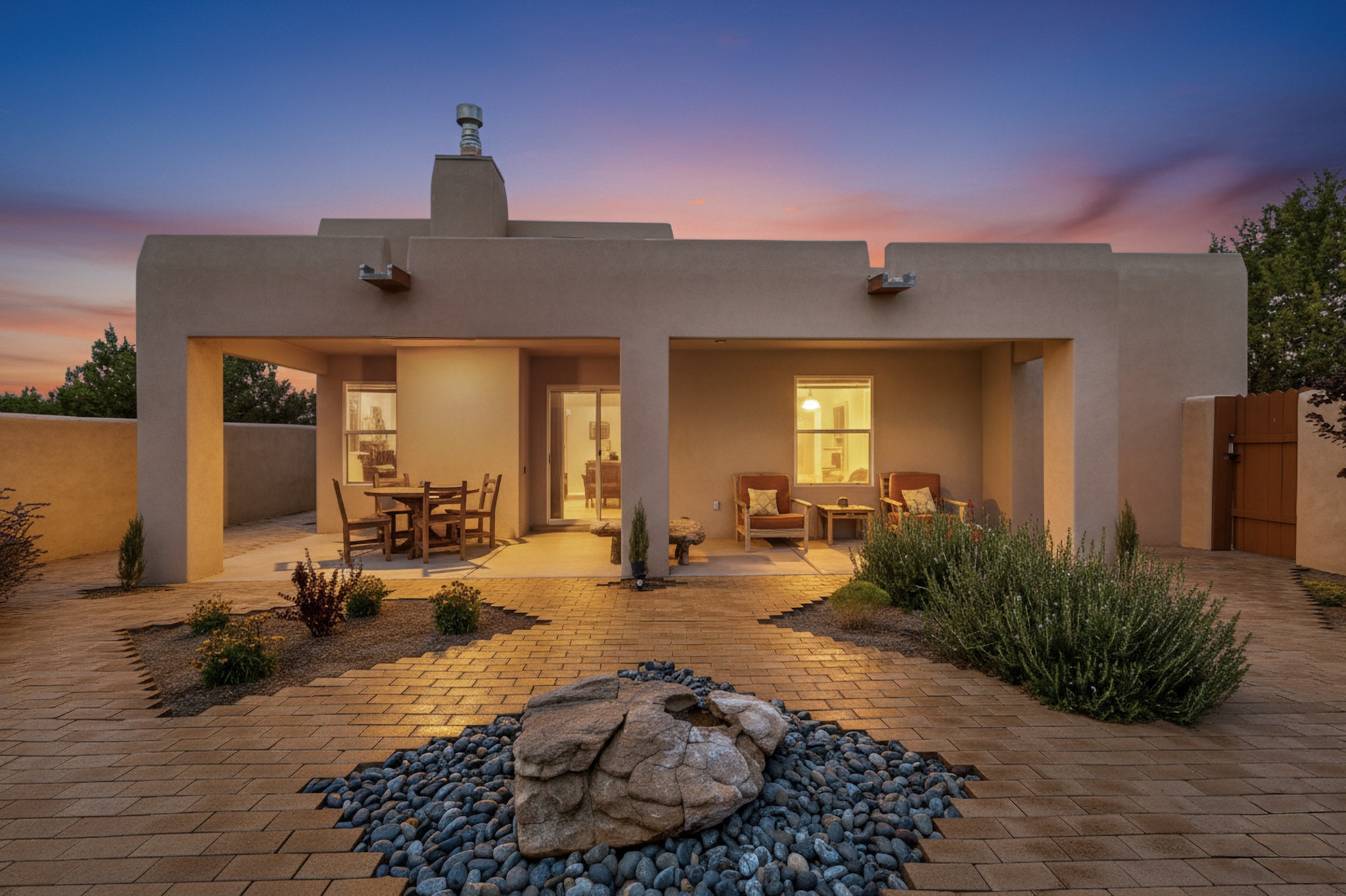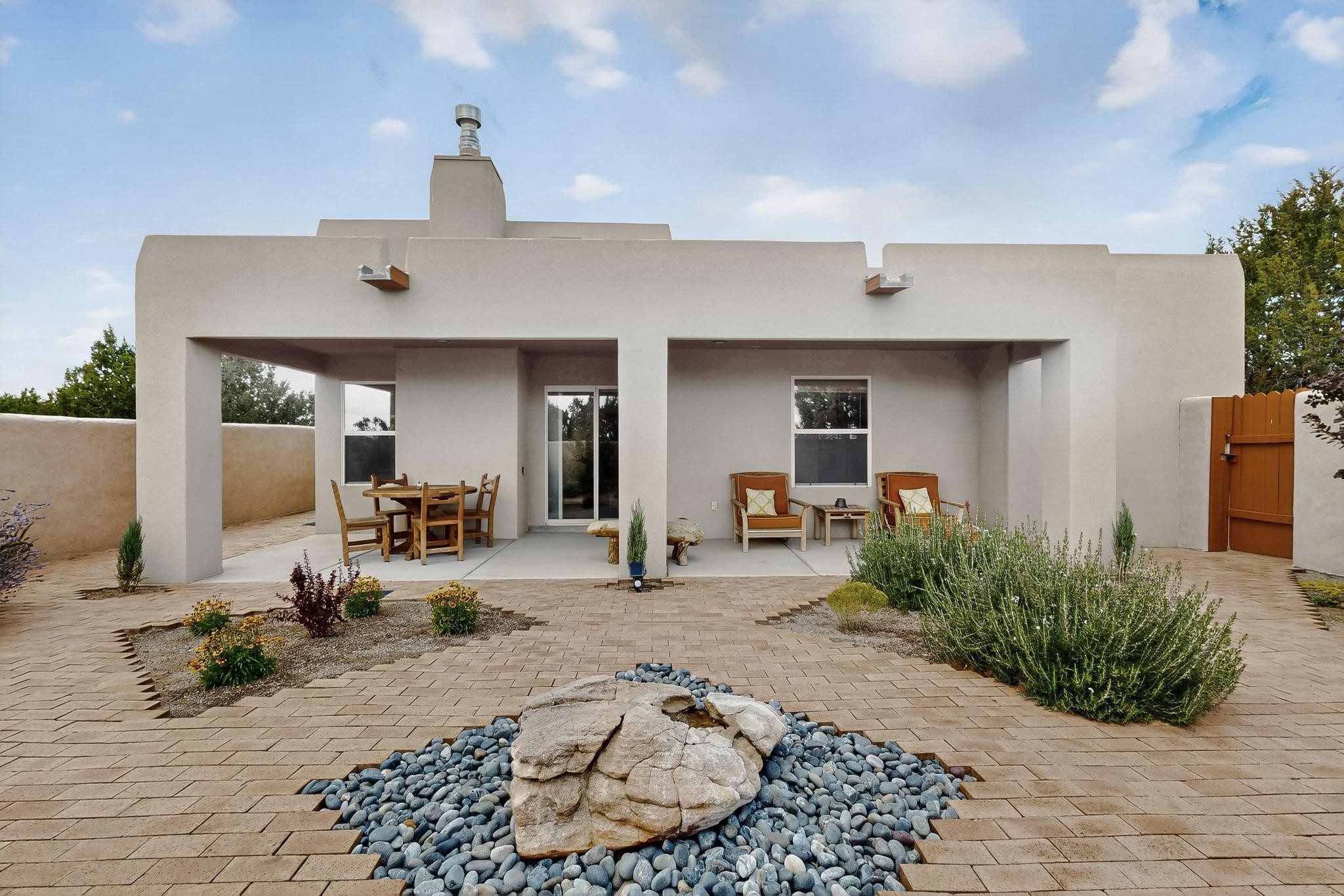 Immaculate and move-in ready, this Eldorado home combines timeless Santa Fe style with modern comfort. Featuring 3 bedrooms and 2 full baths, the home boasts travertine floors throughout, granite countertops, and stainless steel appliances. Classic details include vigas and a gas kiva gas fireplace with blower creating warmth and character. The spacious living areas open to a beautifully landscaped, fully enclosed courtyard with water feature perfect for entertaining or quiet relaxation. Enjoy year-round outdoor living under the large covered portal and take in the peace, privacy, and expansive views of open green space that borders the property. Additional highlights include a 2-car garage, energy-efficient features, and meticulous attention to detail. Ideally located near Eldorado amenities, trails, and the community center, this home offers effortless elegance in one of Eldorado's most desirable settings.