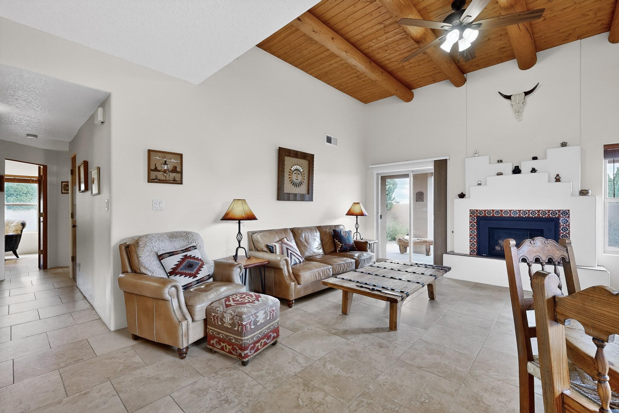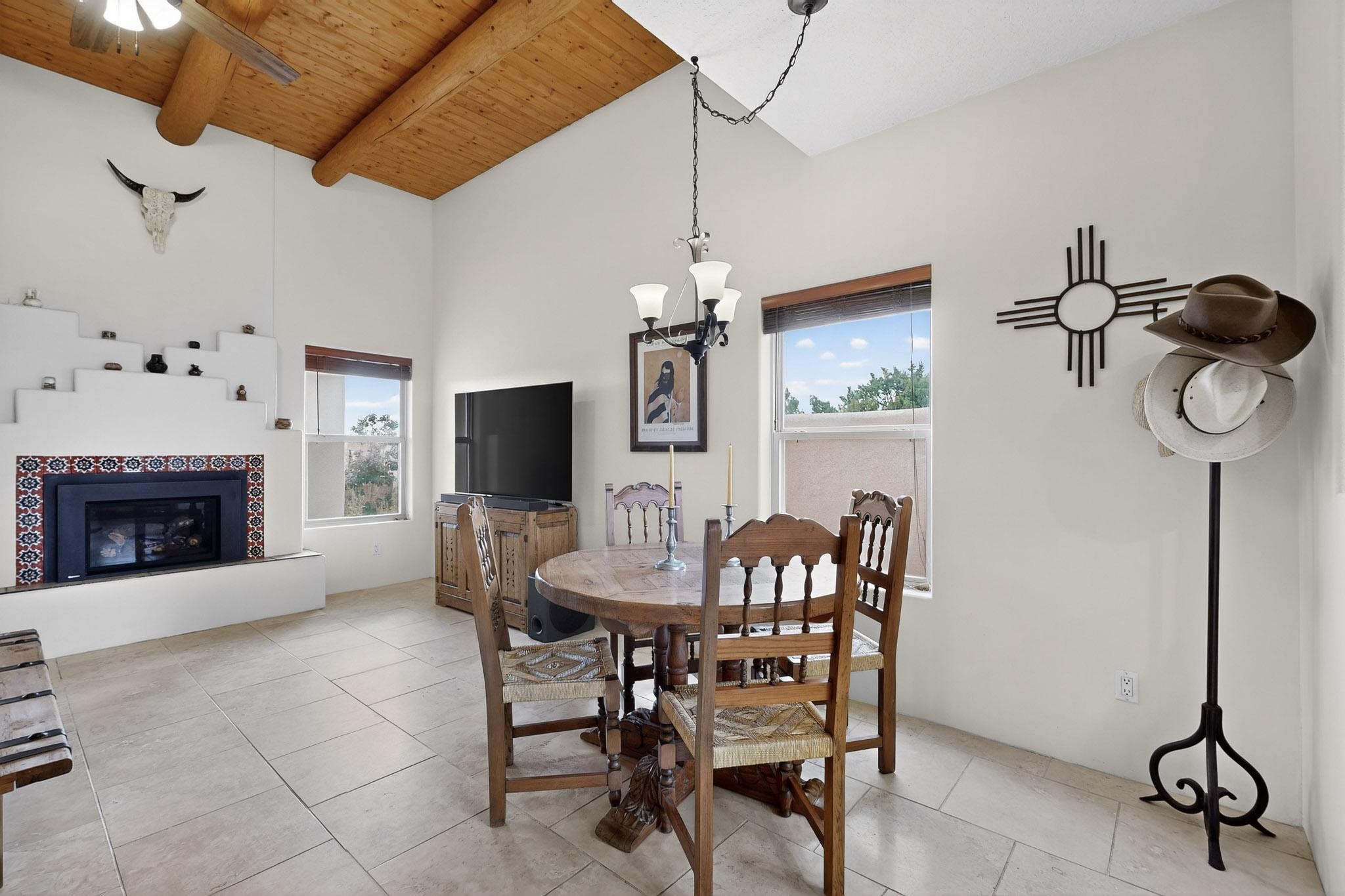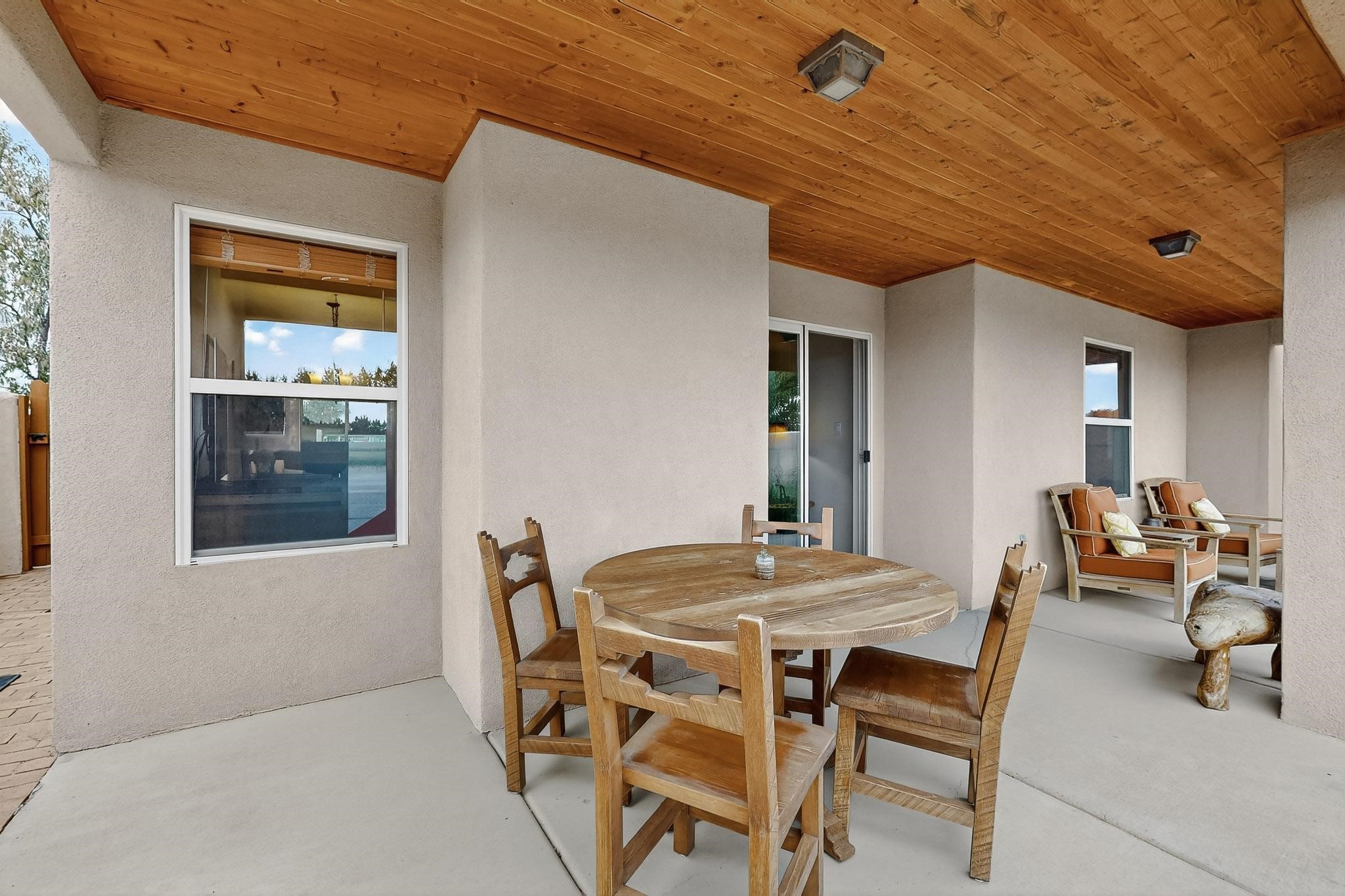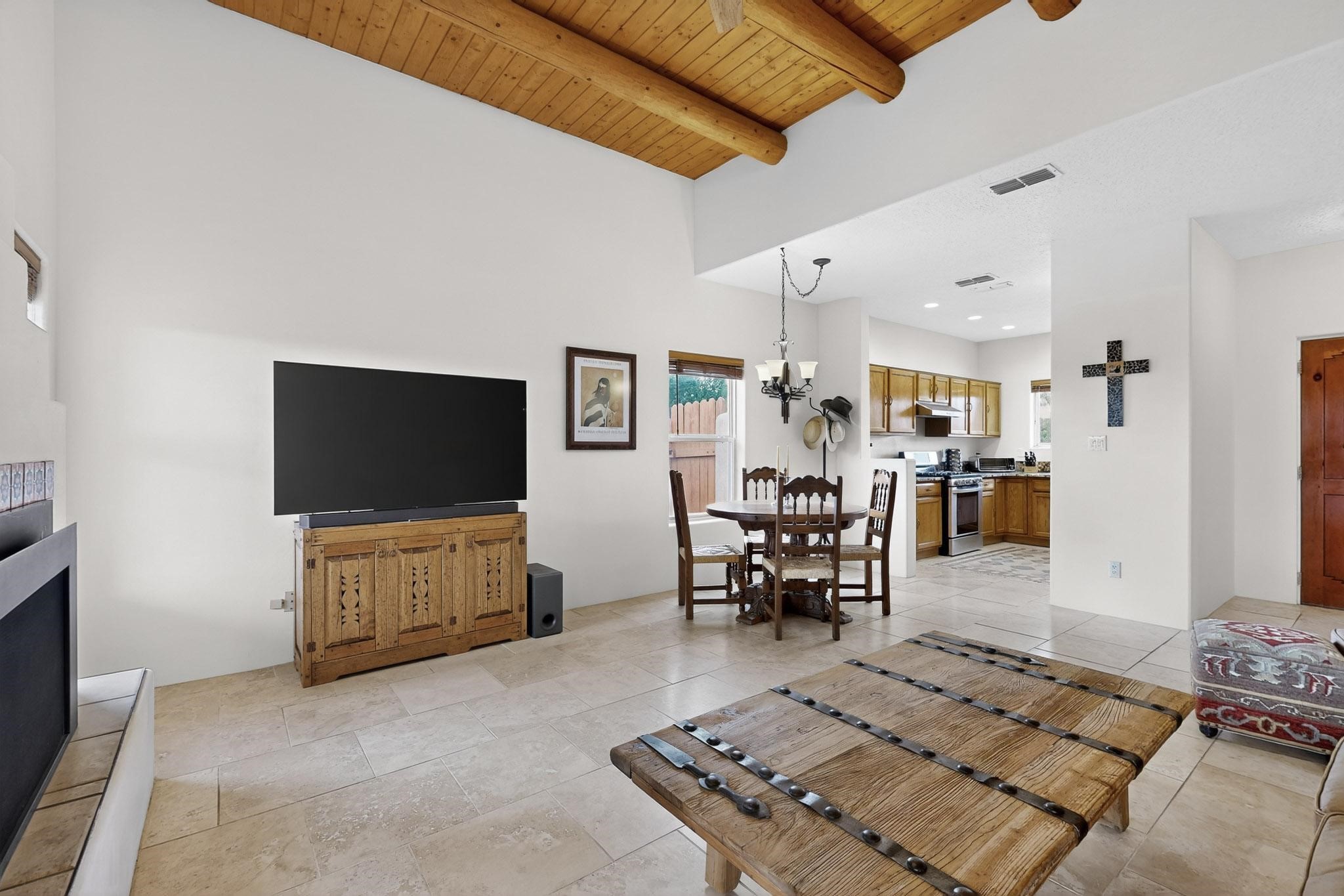 Immaculate and move-in ready, this Eldorado home combines timeless Santa Fe style with modern comfort. Featuring 3 bedrooms and 2 full baths, the home boasts travertine floors throughout, granite countertops, and stainless steel appliances. Classic details include vigas and a gas kiva gas fireplace with blower creating warmth and character. The spacious living areas open to a beautifully landscaped, fully enclosed courtyard with water feature perfect for entertaining or quiet relaxation. Enjoy year-round outdoor living under the large covered portal and take in the peace, privacy, and expansive views of open green space that borders the property. Additional highlights include a 2-car garage, energy-efficient features, and meticulous attention to detail. Ideally located near Eldorado amenities, trails, and the community center, this home offers effortless elegance in one of Eldorado's most desirable settings.