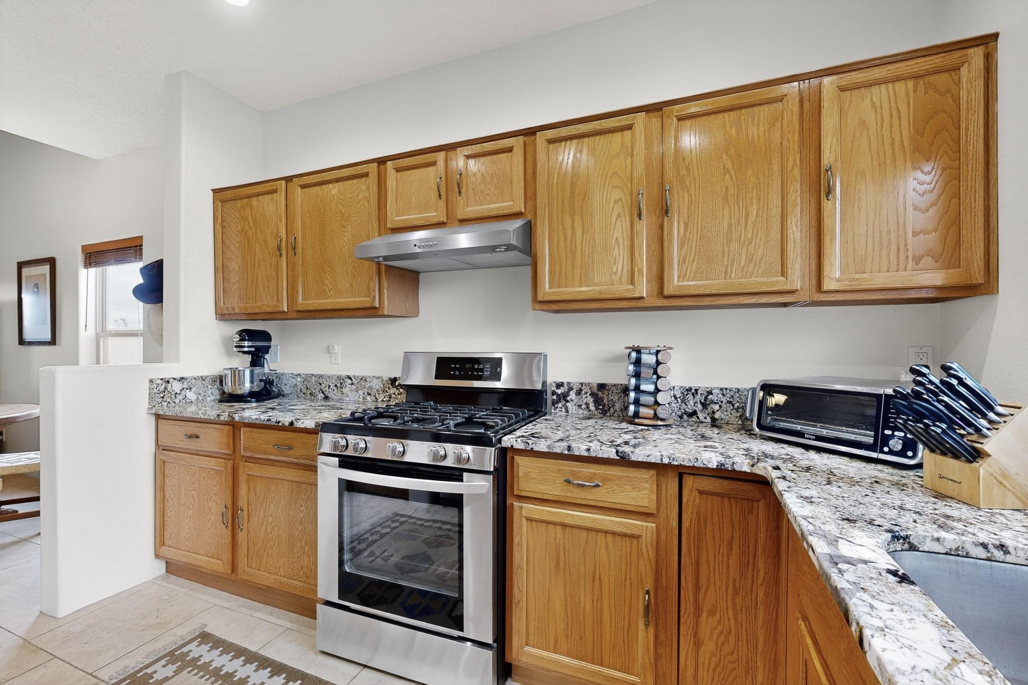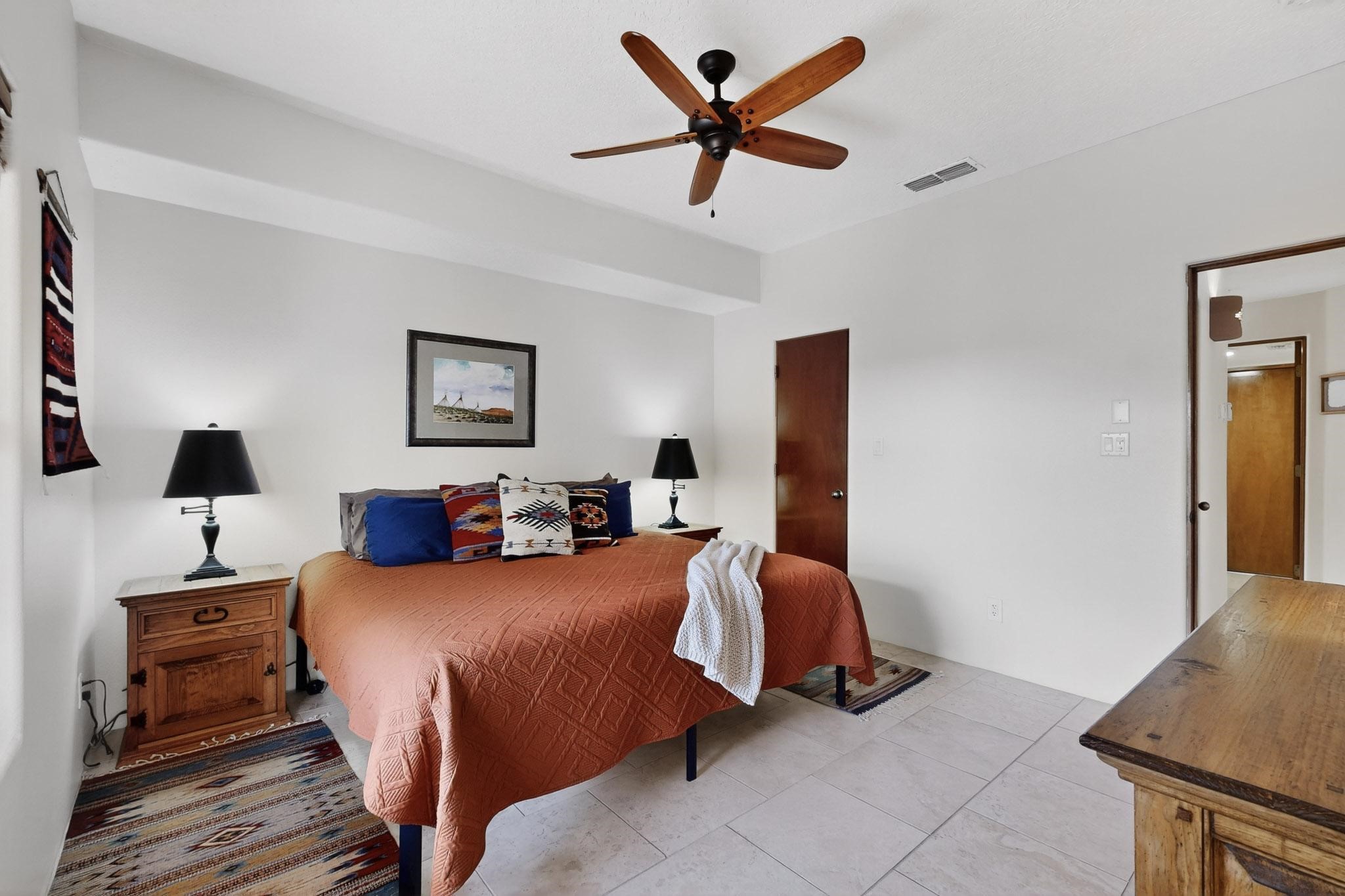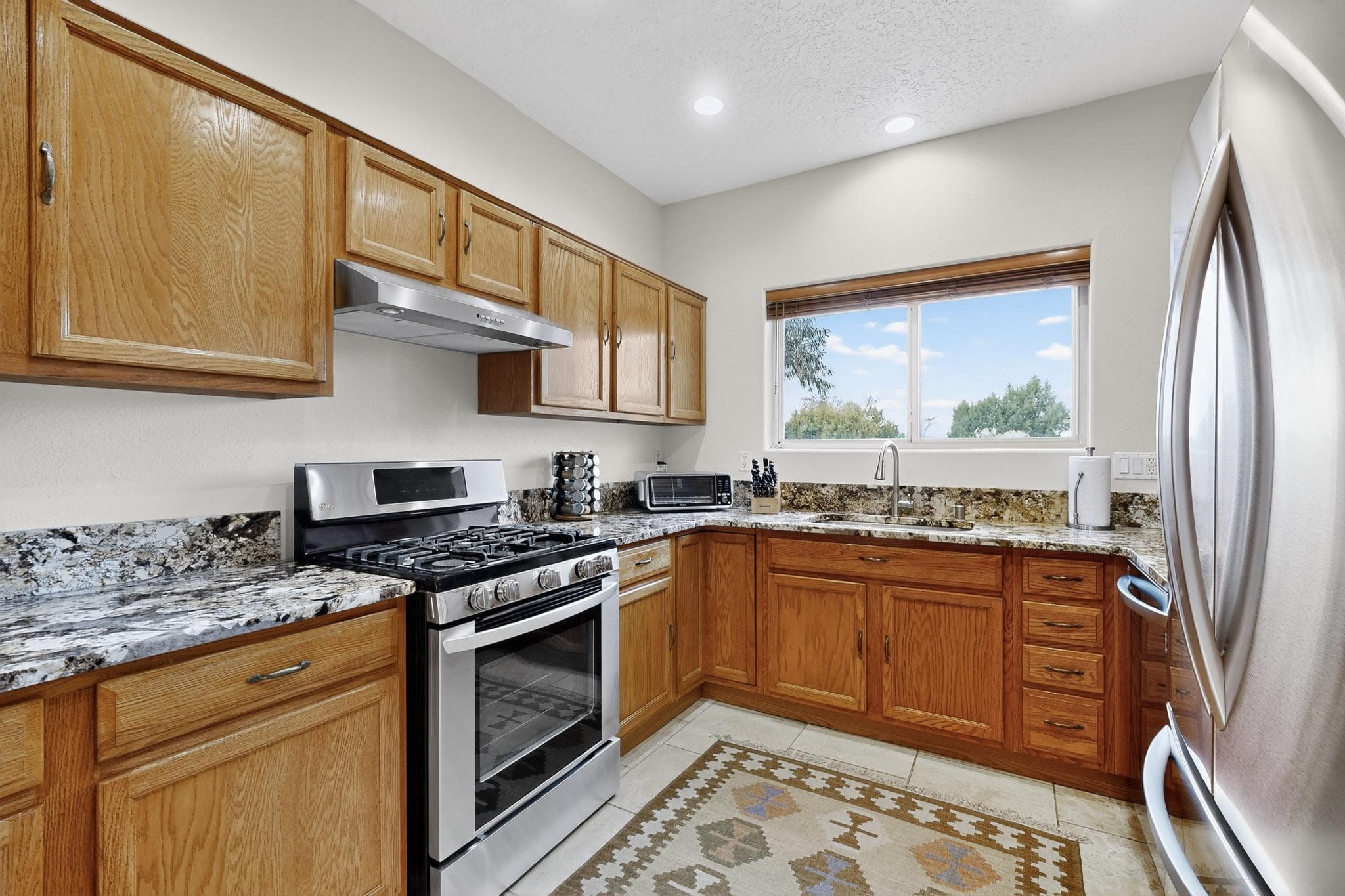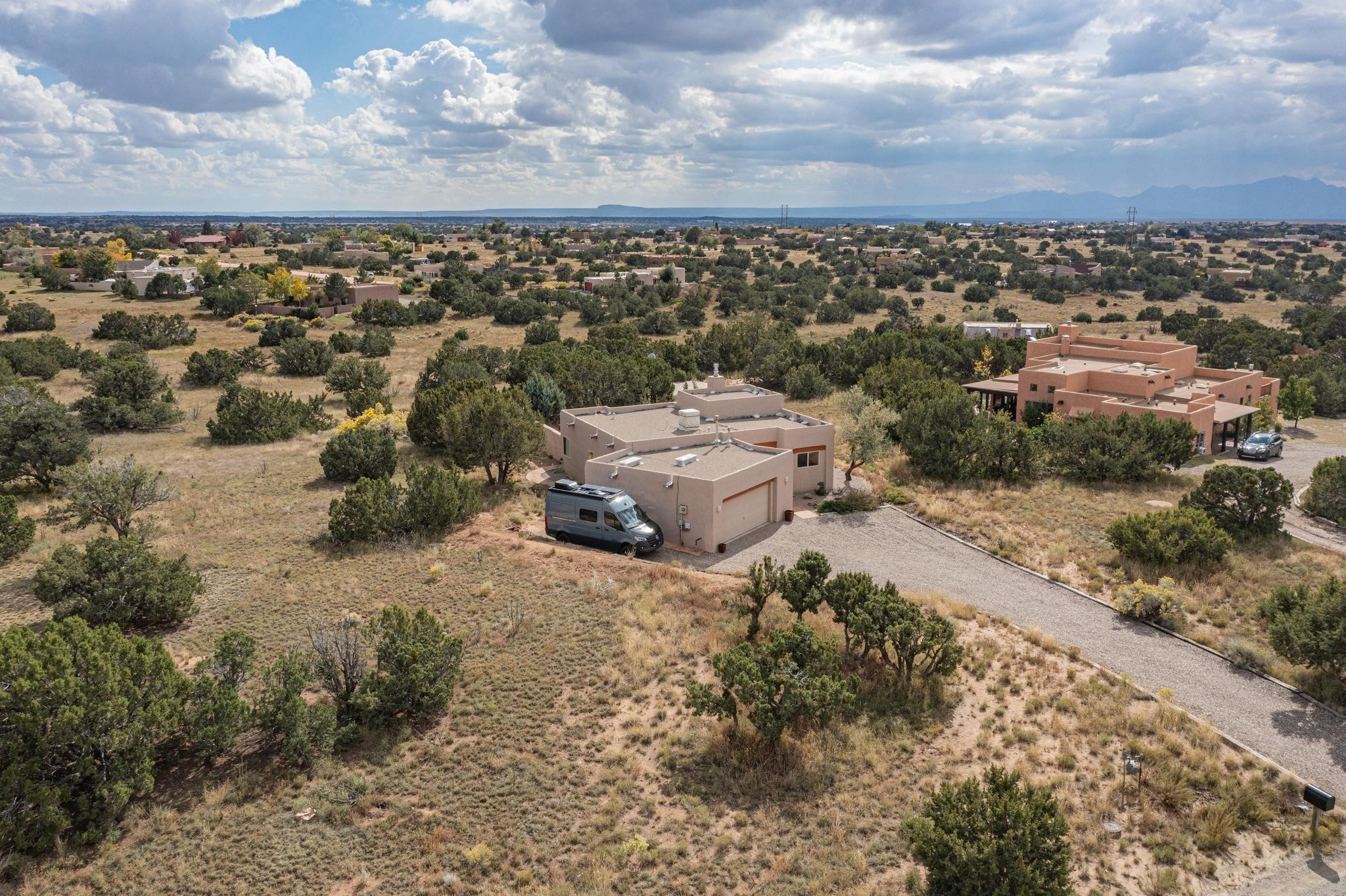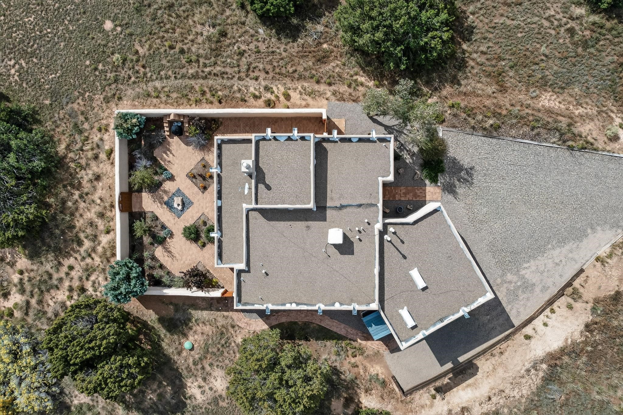 Immaculate and move-in ready, this Eldorado home combines timeless Santa Fe style with modern comfort. Featuring 3 bedrooms and 2 full baths, the home boasts travertine floors throughout, granite countertops, and stainless steel appliances. Classic details include vigas and a gas kiva gas fireplace with blower creating warmth and character. The spacious living areas open to a beautifully landscaped, fully enclosed courtyard with water feature perfect for entertaining or quiet relaxation. Enjoy year-round outdoor living under the large covered portal and take in the peace, privacy, and expansive views of open green space that borders the property. Additional highlights include a 2-car garage, energy-efficient features, and meticulous attention to detail. Ideally located near Eldorado amenities, trails, and the community center, this home offers effortless elegance in one of Eldorado's most desirable settings.