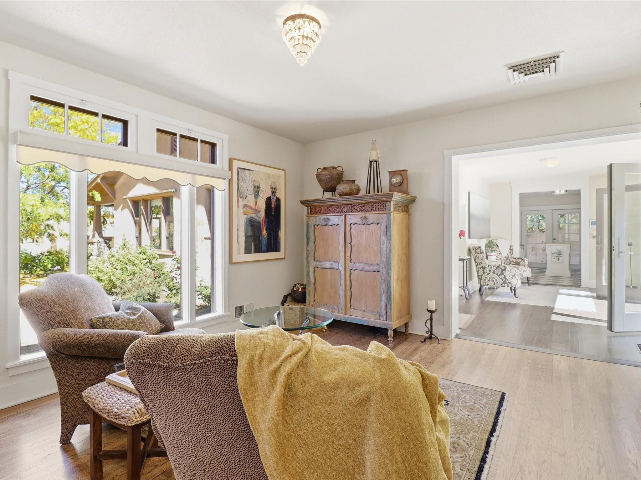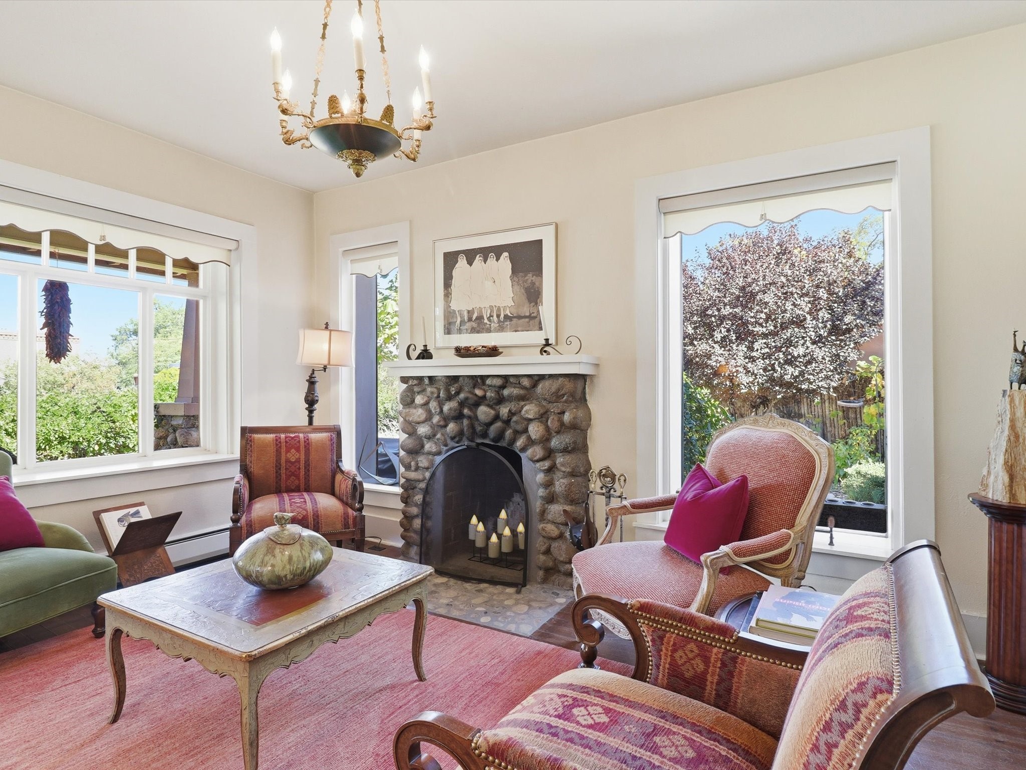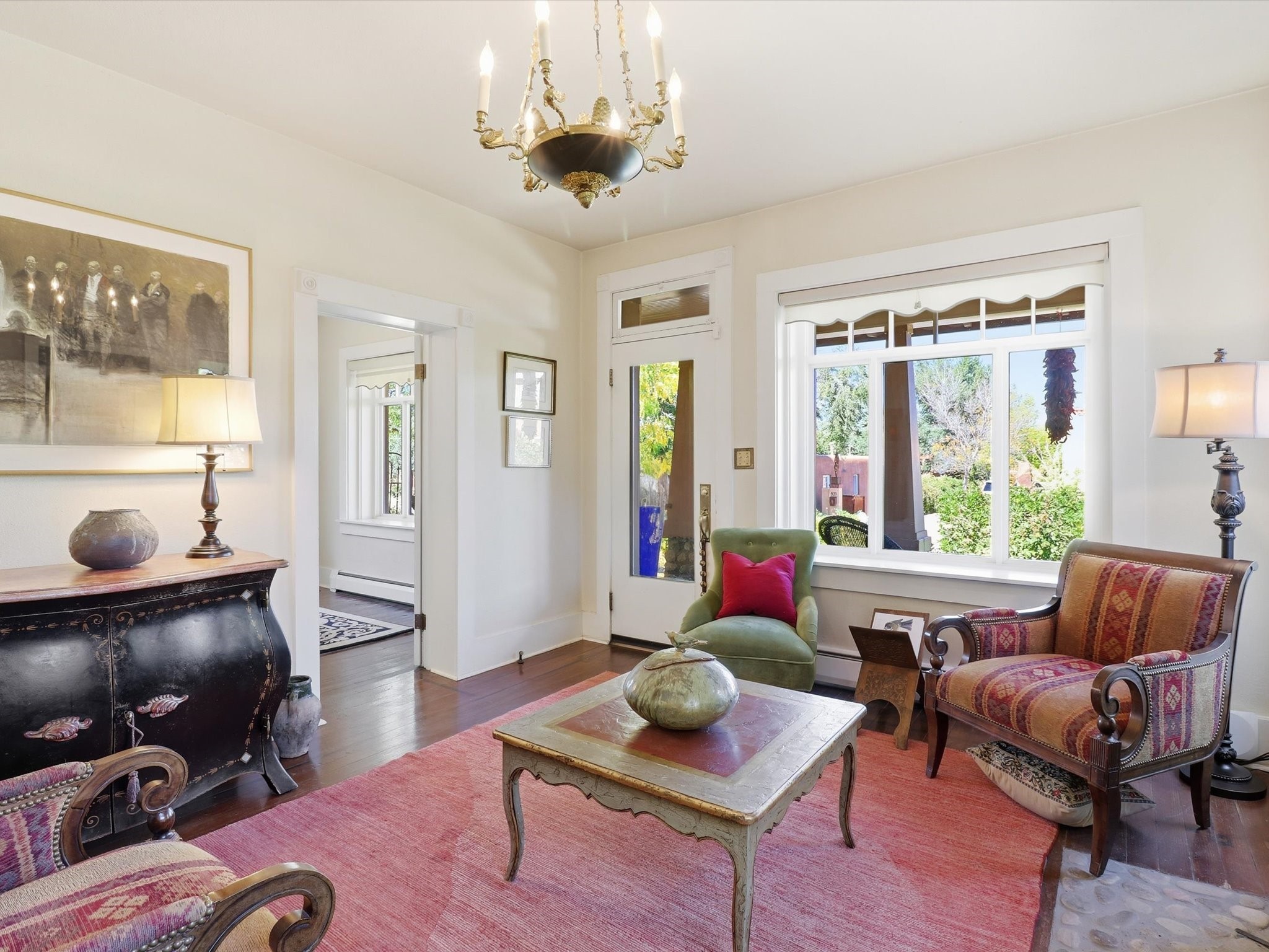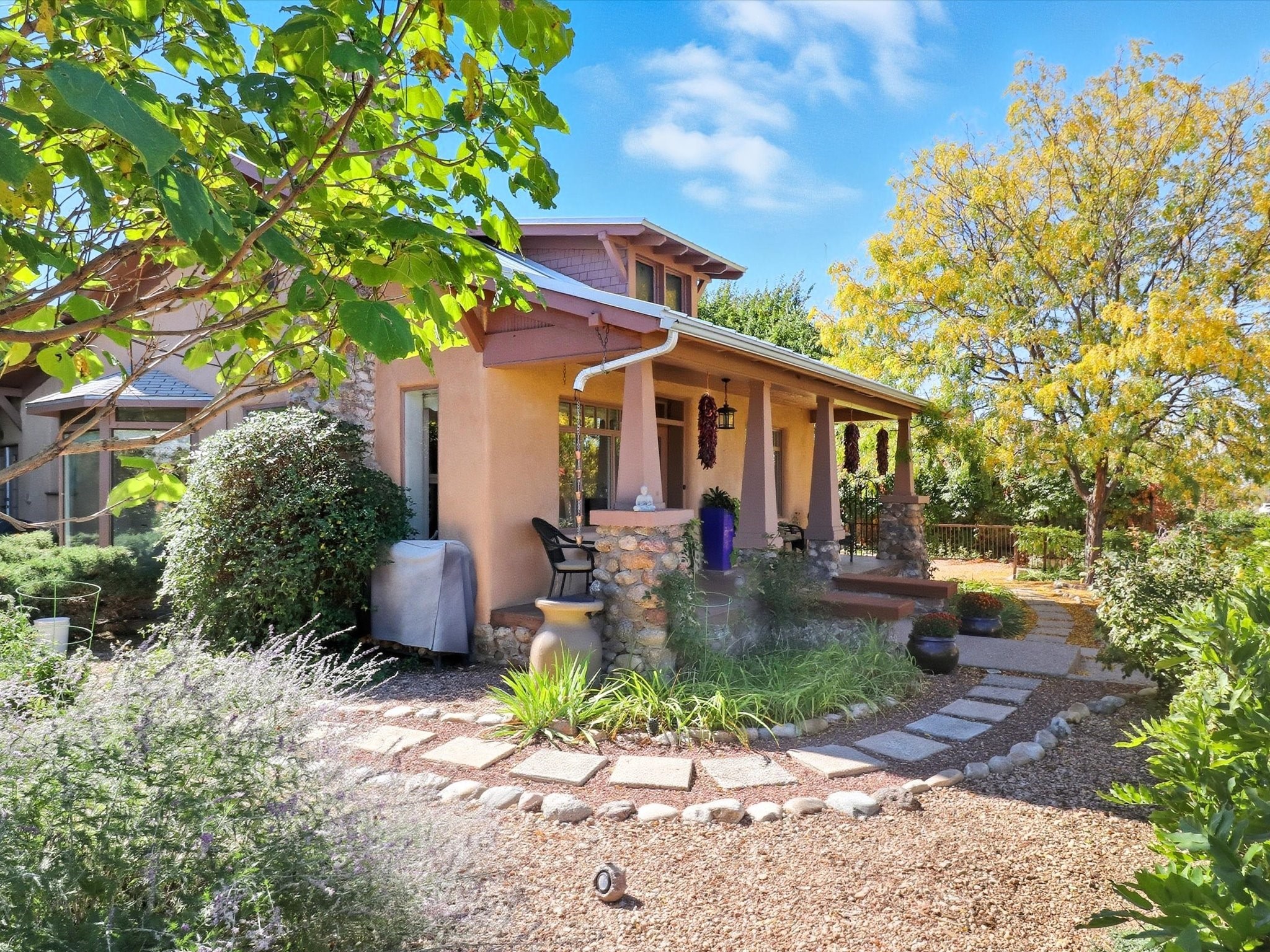 One of Santa Fe's most desirable locations. This historically 'contributing' home on East Agua Fria is a light-filled jewel, perfectly situated to enjoy all the vibrancy of Santa Fe's Railyard District and Santa Fe's Downtown. Imagine being just blocks away from world-class art galleries, dining, shopping, movie theaters, and music. The Santa Fe Farmers Market, a beloved community hub, is just a few blocks to the south. This charming 1900 Craftsman Bungalow home offers four bedrooms, 2 baths, many thoughtful upgrades, double adobe construction with exterior stone base pillars, creating a timeless, inviting and quiet home. A gracious interior - original stenciled fir floors, bay windows, gorgeous antique lighting fixtures, a crisp black and white kitchen. Additionally, this property offers an attractive flexibility with two distinct areas, each featuring separate entrances and sitting areas providing excellent options for guests or potential rental income. The home boasts a charming, deep Craftsman-style porch, perfect for relaxing and enjoying the neighborhood. The current owners have meticulously cultivated romantic garden areas over many years, showcasing roses, wisteria, daylilies, and climbing vines, maintained by an automatic drip system. The large rear patio serves as an urban sanctuary, ideal for entertaining or simply unwinding. Further enhancing convenience and livability are the unusually generous gated off-street parking in the front, a single-story design and a 200-square-foot storage area in the rear. Come see and be captivated! Neither Listing Brokers nor Seller warrants the square footage of the home or lot. If the size of the home or lot is of material consideration to the Buyer, then the Buyer should have them measured. Tax Levy is from the Assessor website. All fires depicted are photo-shopped. Buyer to verify the functionality of the fireplace.