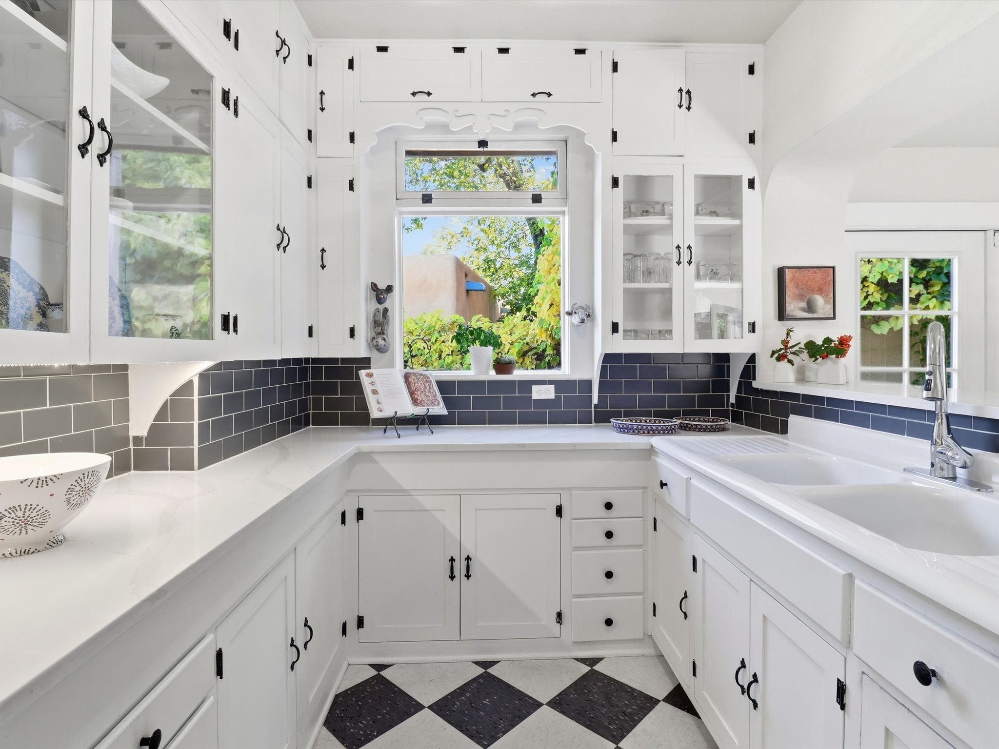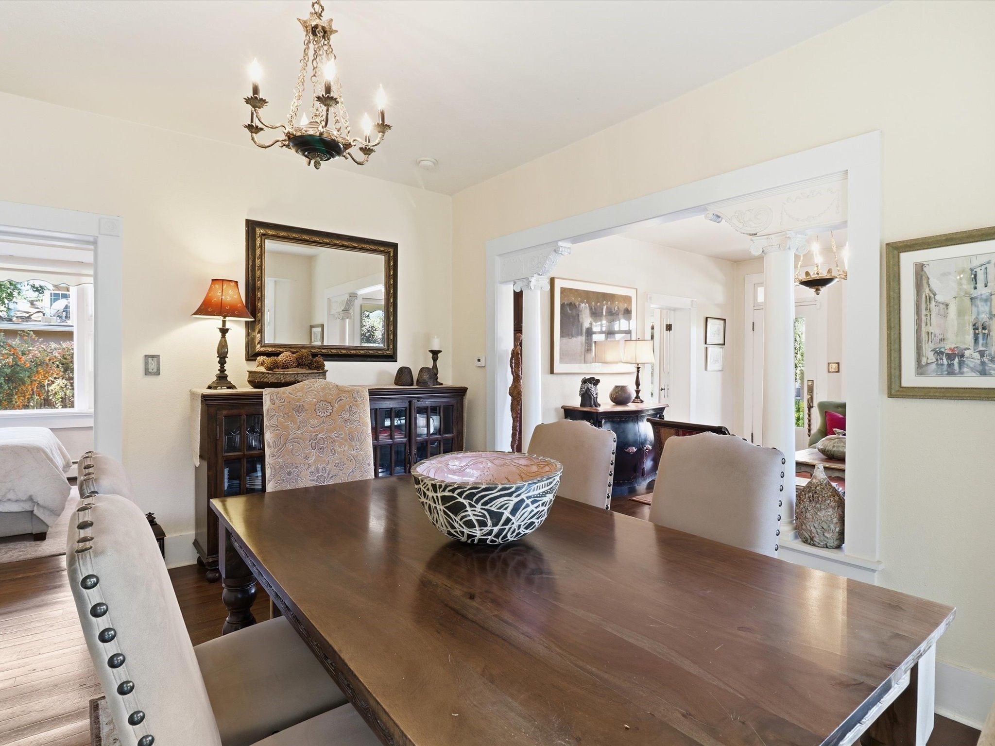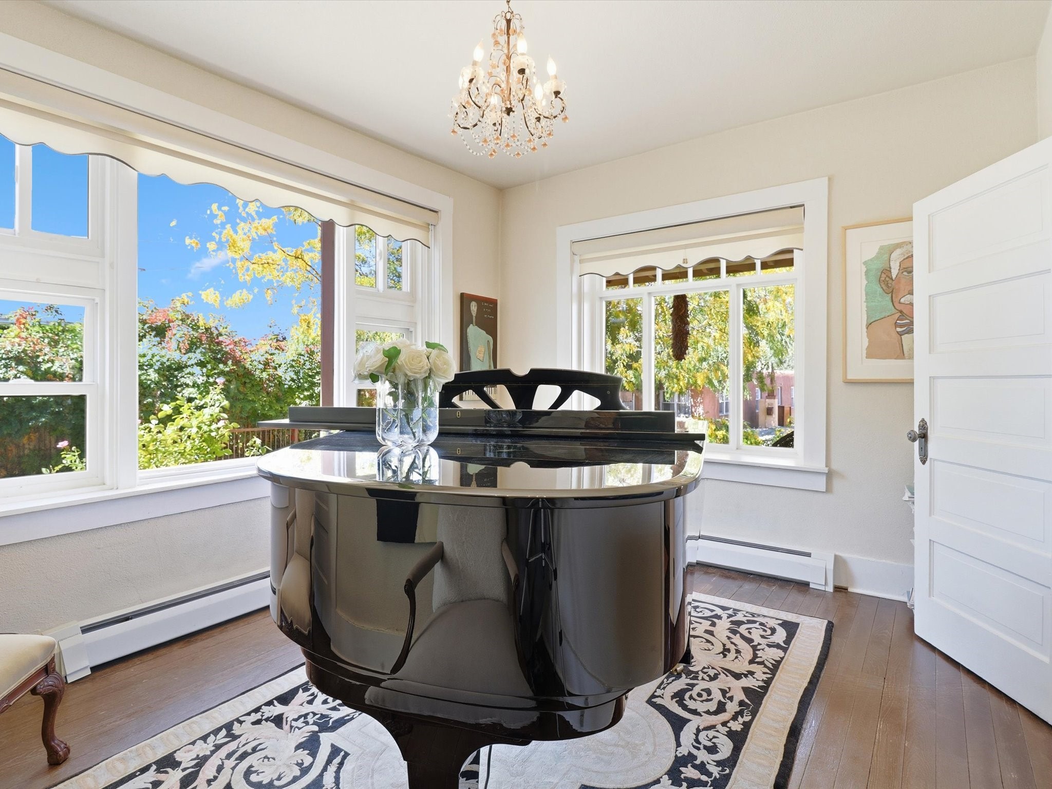 One of Santa Fe's most desirable locations. This historically 'contributing' home on East Agua Fria is a light-filled jewel, perfectly situated to enjoy all the vibrancy of Santa Fe's Railyard District and Santa Fe's Downtown. Imagine being just blocks away from world-class art galleries, dining, shopping, movie theaters, and music. The Santa Fe Farmers Market, a beloved community hub, is just a few blocks to the south. This charming 1900 Craftsman Bungalow home offers four bedrooms, 2 baths, many thoughtful upgrades, double adobe construction with exterior stone base pillars, creating a timeless, inviting and quiet home. A gracious interior - original stenciled fir floors, bay windows, gorgeous antique lighting fixtures, a crisp black and white kitchen. Additionally, this property offers an attractive flexibility with two distinct areas, each featuring separate entrances and sitting areas providing excellent options for guests or potential rental income. The home boasts a charming, deep Craftsman-style porch, perfect for relaxing and enjoying the neighborhood. The current owners have meticulously cultivated romantic garden areas over many years, showcasing roses, wisteria, daylilies, and climbing vines, maintained by an automatic drip system. The large rear patio serves as an urban sanctuary, ideal for entertaining or simply unwinding. Further enhancing convenience and livability are the unusually generous gated off-street parking in the front, a single-story design and a 200-square-foot storage area in the rear. Come see and be captivated! Neither Listing Brokers nor Seller warrants the square footage of the home or lot. If the size of the home or lot is of material consideration to the Buyer, then the Buyer should have them measured. Tax Levy is from the Assessor website. All fires depicted are photo-shopped. Buyer to verify the functionality of the fireplace.