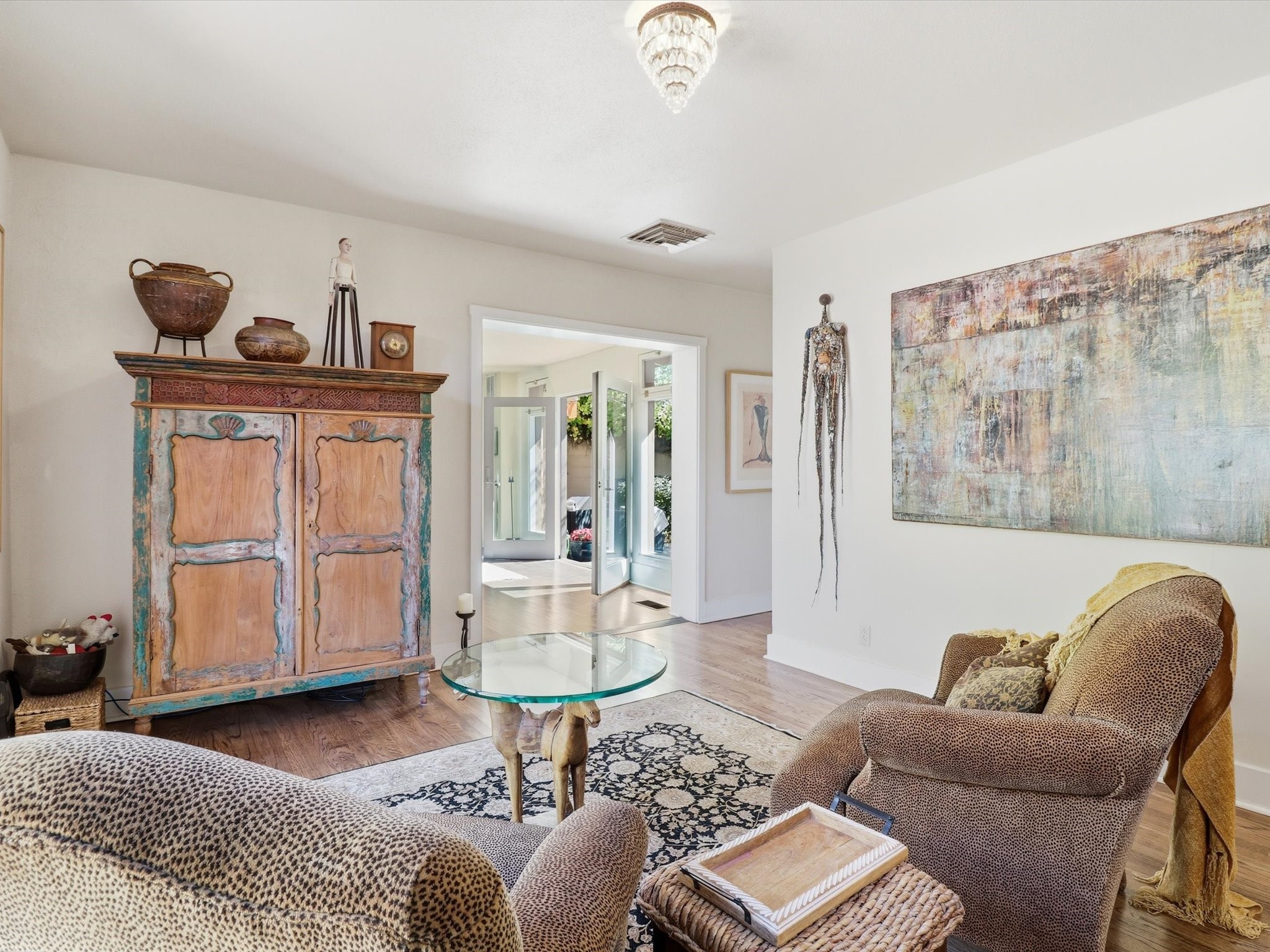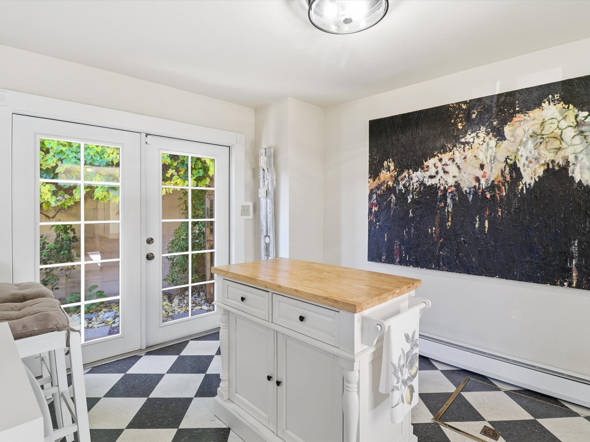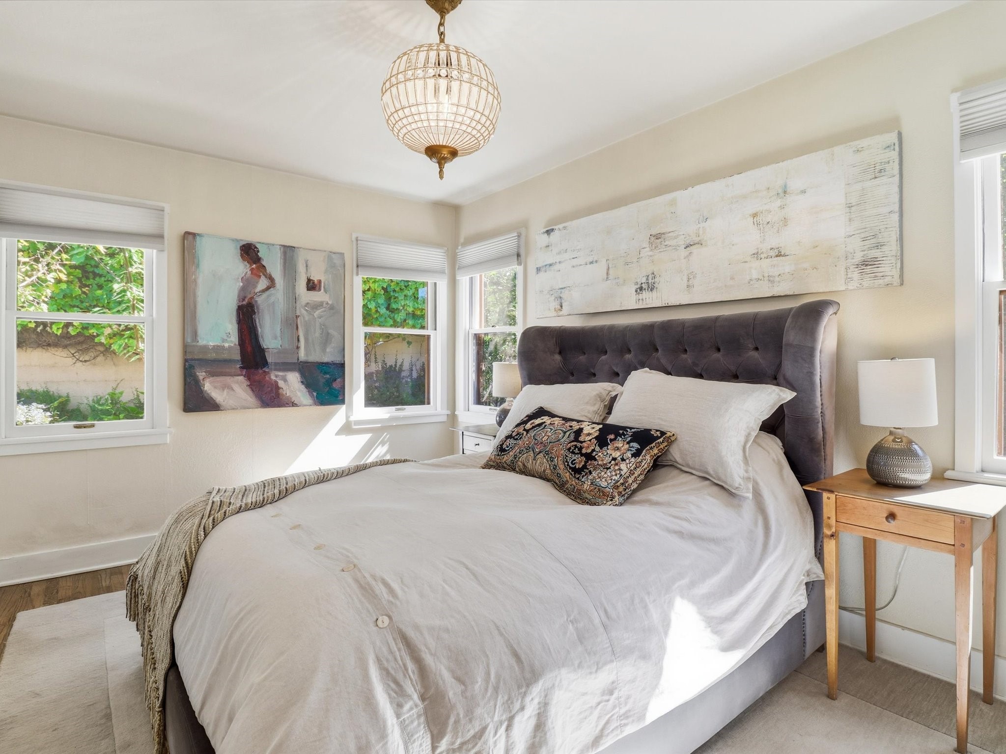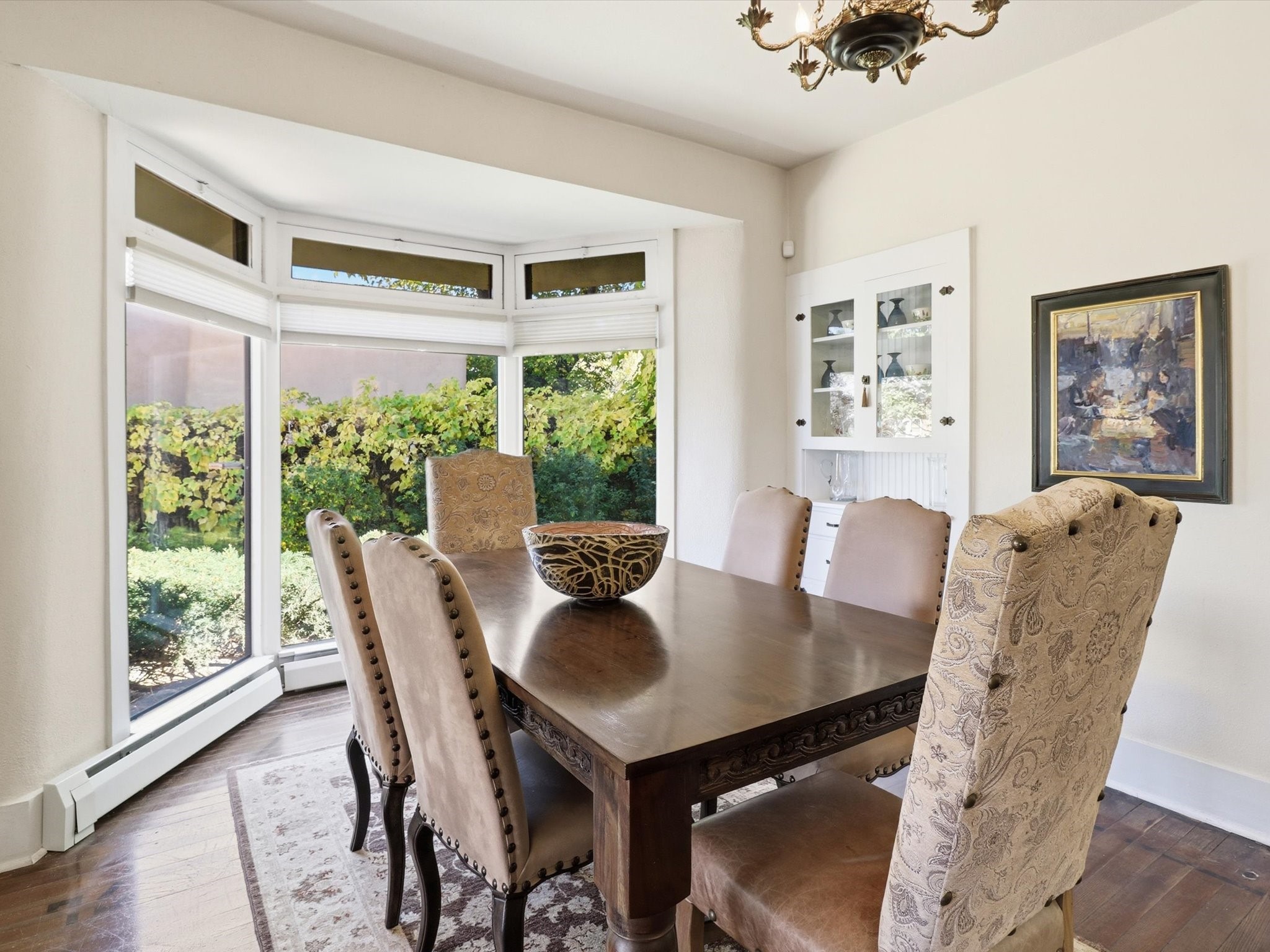 One of Santa Fe's most desirable locations. This historically 'contributing' home on East Agua Fria is a light-filled jewel, perfectly situated to enjoy all the vibrancy of Santa Fe's Railyard District and Santa Fe's Downtown. Imagine being just blocks away from world-class art galleries, dining, shopping, movie theaters, and music. The Santa Fe Farmers Market, a beloved community hub, is just a few blocks to the south. This charming 1900 Craftsman Bungalow home offers four bedrooms, 2 baths, many thoughtful upgrades, double adobe construction with exterior stone base pillars, creating a timeless, inviting and quiet home. A gracious interior - original stenciled fir floors, bay windows, gorgeous antique lighting fixtures, a crisp black and white kitchen. Additionally, this property offers an attractive flexibility with two distinct areas, each featuring separate entrances and sitting areas providing excellent options for guests or potential rental income. The home boasts a charming, deep Craftsman-style porch, perfect for relaxing and enjoying the neighborhood. The current owners have meticulously cultivated romantic garden areas over many years, showcasing roses, wisteria, daylilies, and climbing vines, maintained by an automatic drip system. The large rear patio serves as an urban sanctuary, ideal for entertaining or simply unwinding. Further enhancing convenience and livability are the unusually generous gated off-street parking in the front, a single-story design and a 200-square-foot storage area in the rear. Come see and be captivated! Neither Listing Brokers nor Seller warrants the square footage of the home or lot. If the size of the home or lot is of material consideration to the Buyer, then the Buyer should have them measured. Tax Levy is from the Assessor website. All fires depicted are photo-shopped. Buyer to verify the functionality of the fireplace.