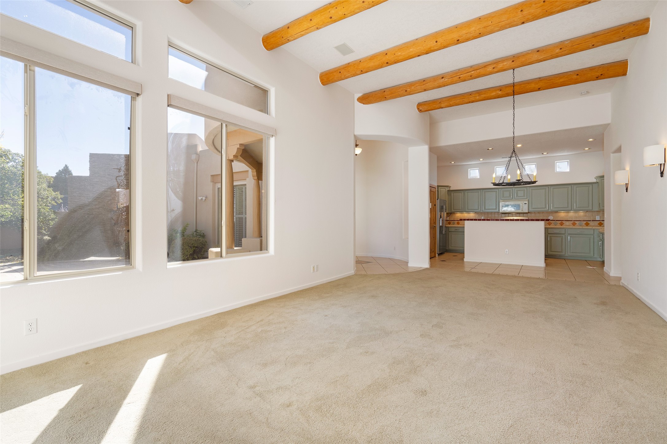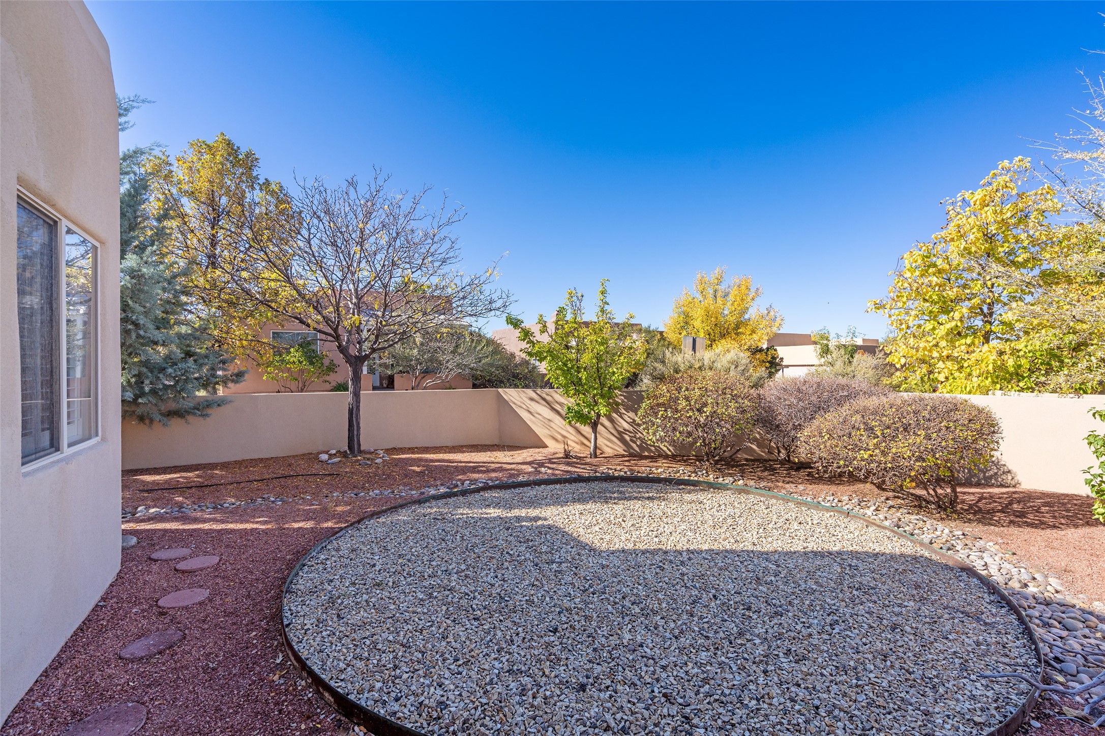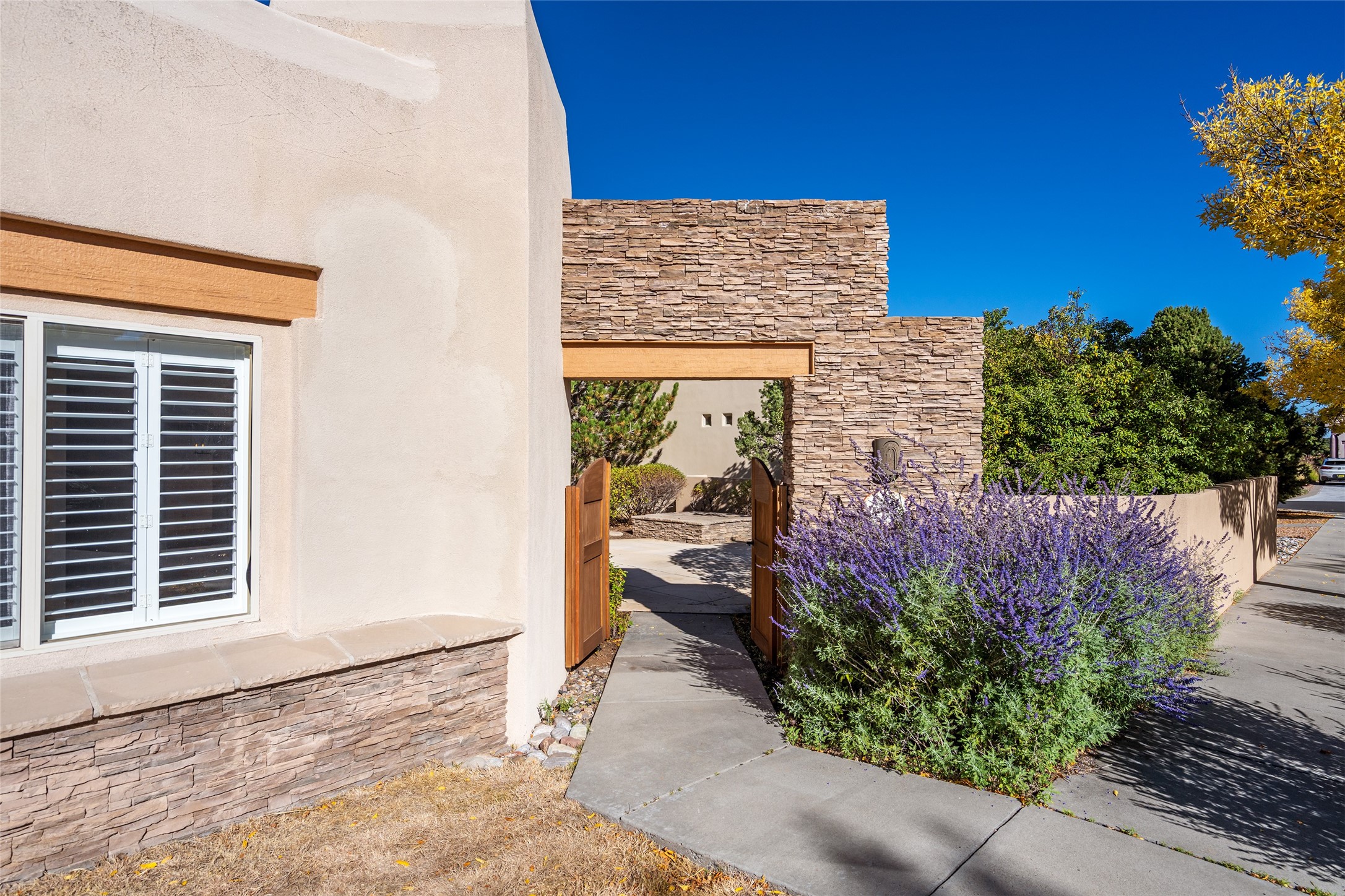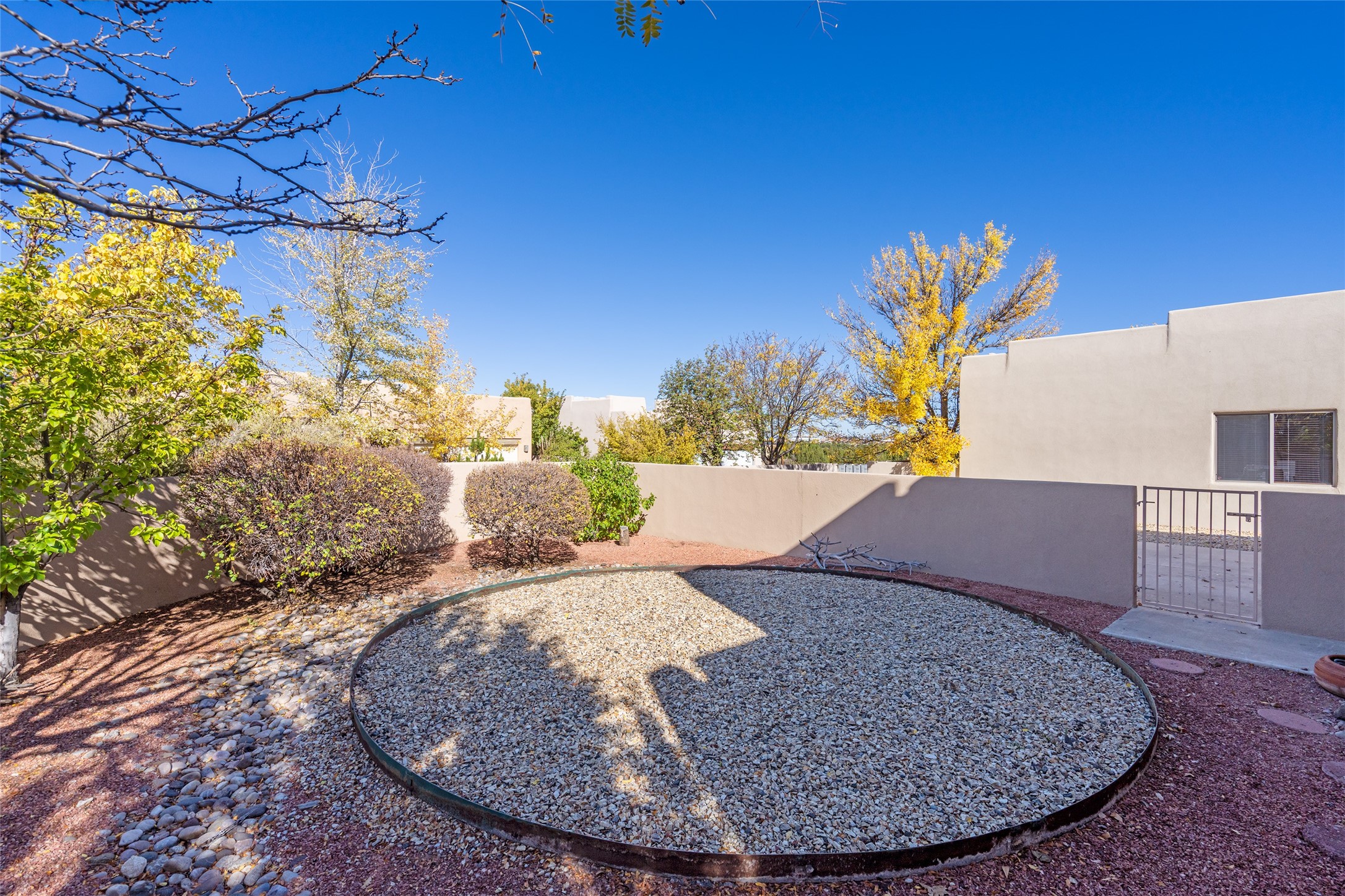 Delightful Rancho Viejo, former "Portal" model home. Beautiful courtyard entrance with mature landscaping. The entire interior has recently been professionally re-painted. Spacious living area with high ceilings and vigas and a gas fired kiva fireplace. Sensible split floorplan featuring 2 bedrooms plus an office with built-in shelving and a built-in desk area. Custom wood doors throughout. Primary bedroom and second bedroom have shutter blinds. Two car garage is finished and has plenty of storage cabinets. Stainless refrigerator and dishwasher replaced in the last 5 years. Roof redone in the last 5 years. Water heater and tankless replaced in 2019. Walled in back area too with nice trees! Rancho Viejo is a master planned community with 11,000 acres; 50% featuring natural open spaces. This home is close to walking trails, parks, the SF Community College, Target, Santa Fe Place Mall, many restaurants and grocery stores. This home is move-in ready!