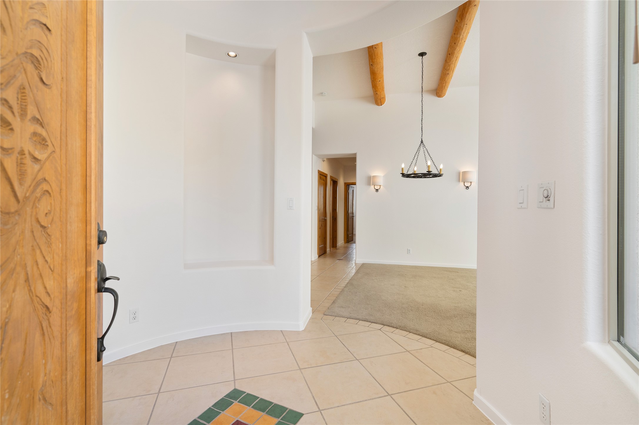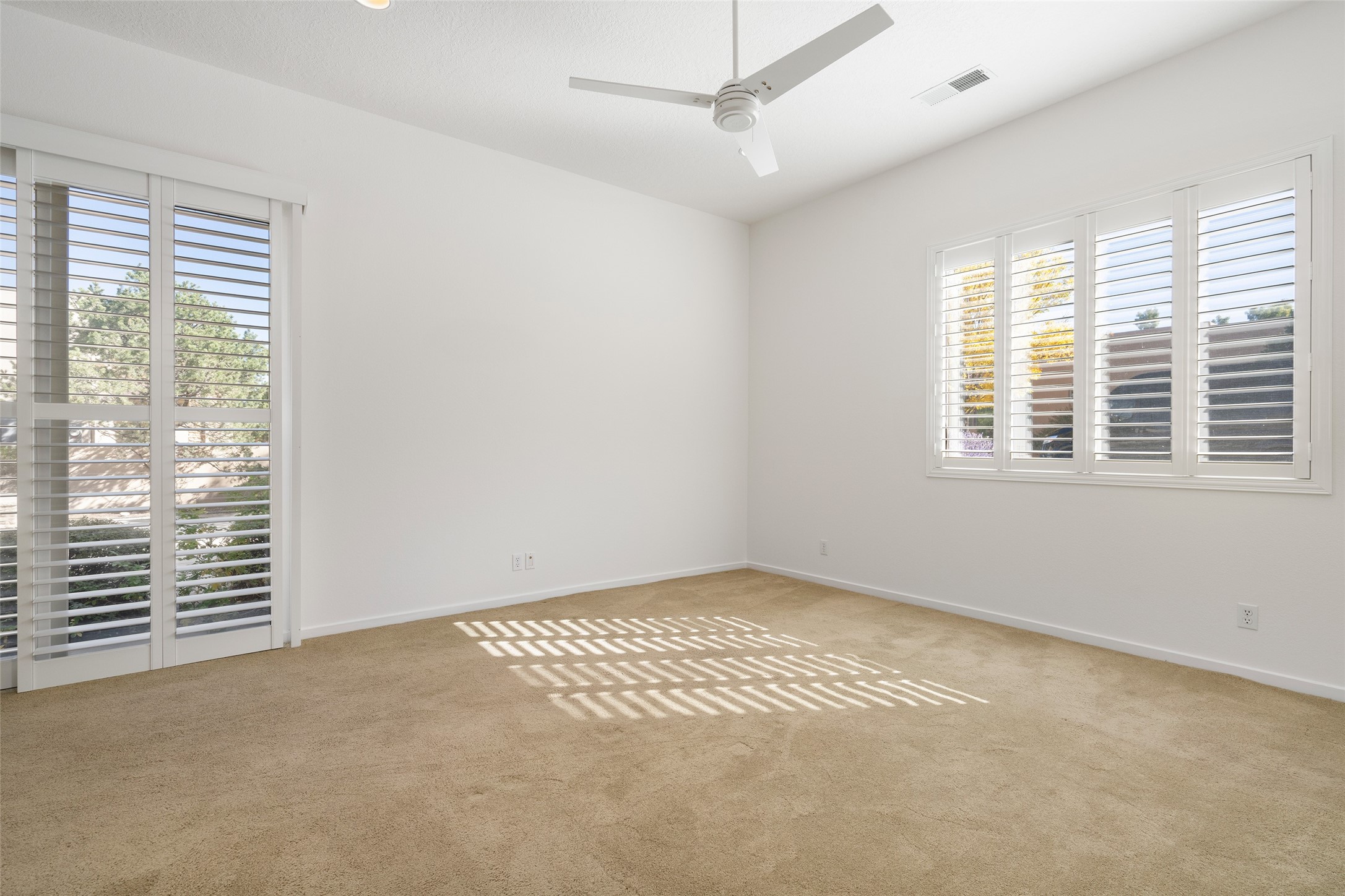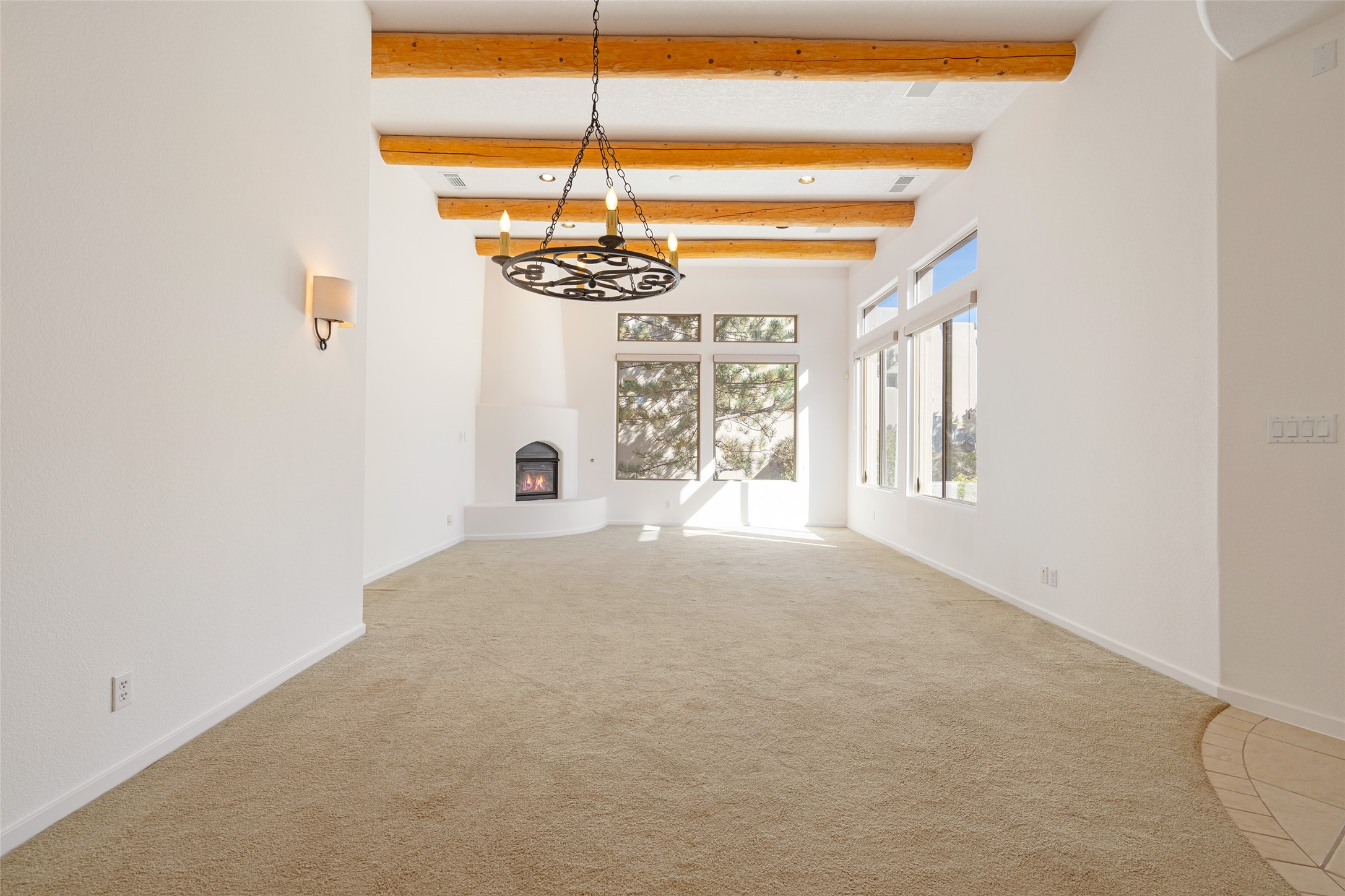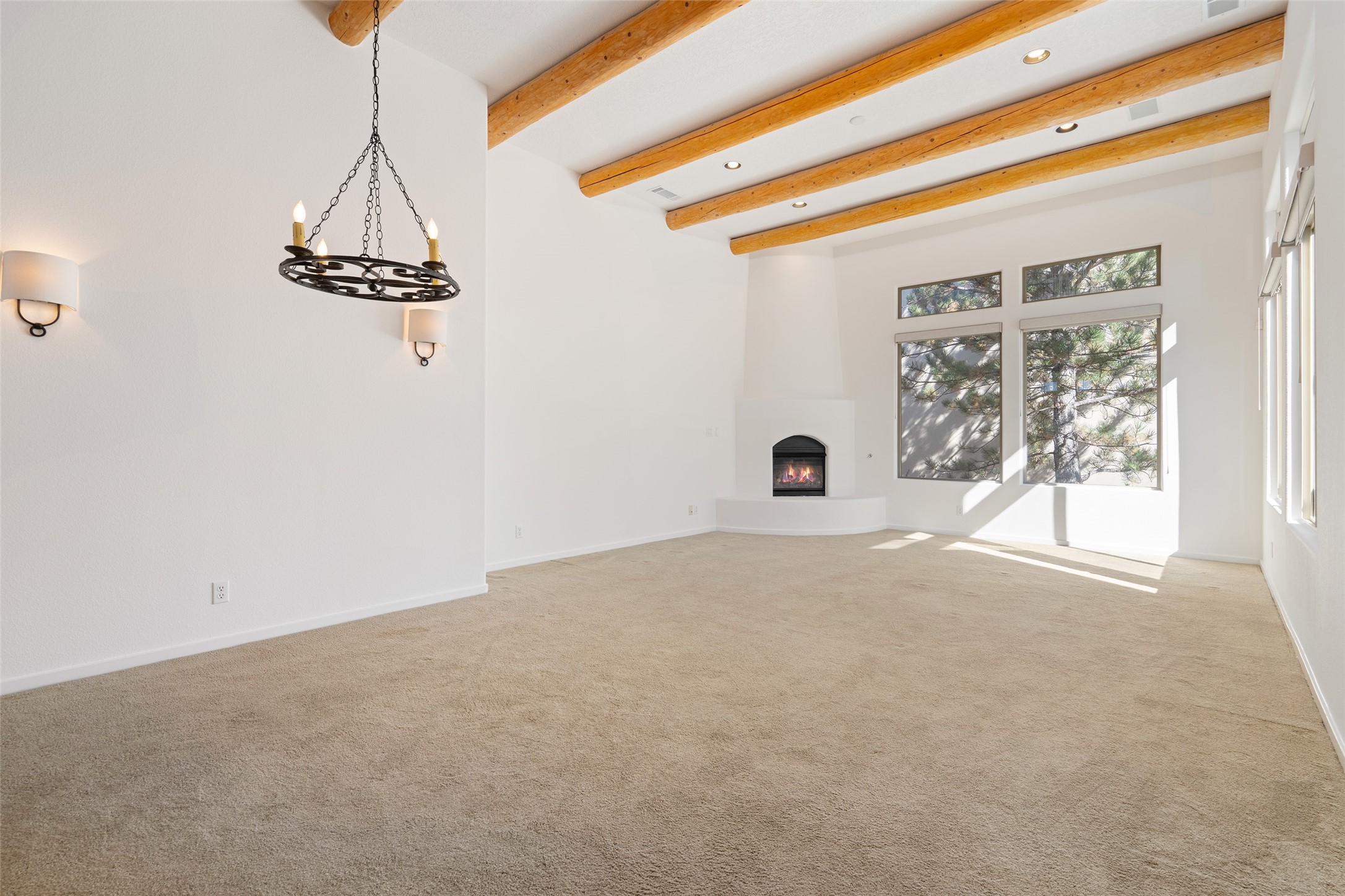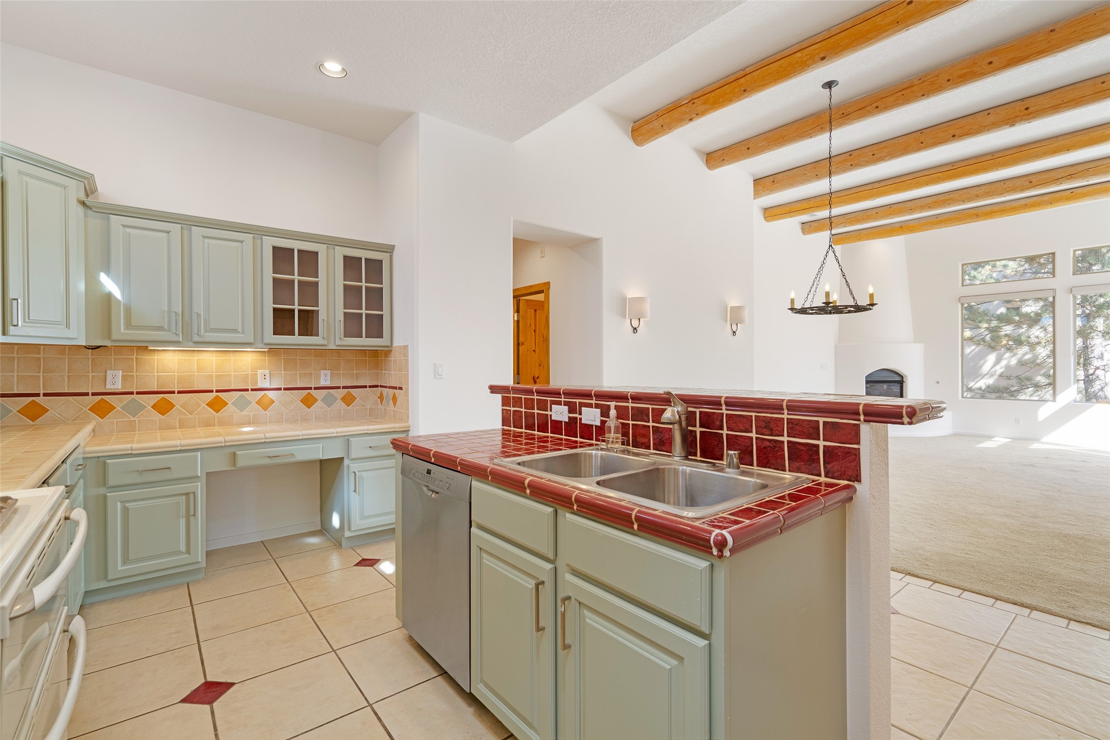 Delightful Rancho Viejo, former "Portal" model home. Beautiful courtyard entrance with mature landscaping. The entire interior has recently been professionally re-painted. Spacious living area with high ceilings and vigas and a gas fired kiva fireplace. Sensible split floorplan featuring 2 bedrooms plus an office with built-in shelving and a built-in desk area. Custom wood doors throughout. Primary bedroom and second bedroom have shutter blinds. Two car garage is finished and has plenty of storage cabinets. Stainless refrigerator and dishwasher replaced in the last 5 years. Roof redone in the last 5 years. Water heater and tankless replaced in 2019. Walled in back area too with nice trees! Rancho Viejo is a master planned community with 11,000 acres; 50% featuring natural open spaces. This home is close to walking trails, parks, the SF Community College, Target, Santa Fe Place Mall, many restaurants and grocery stores. This home is move-in ready!