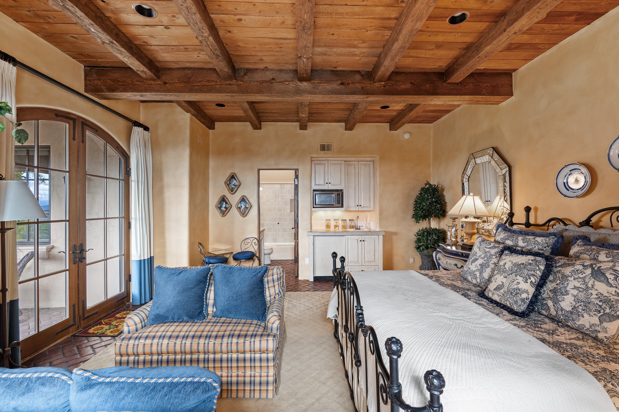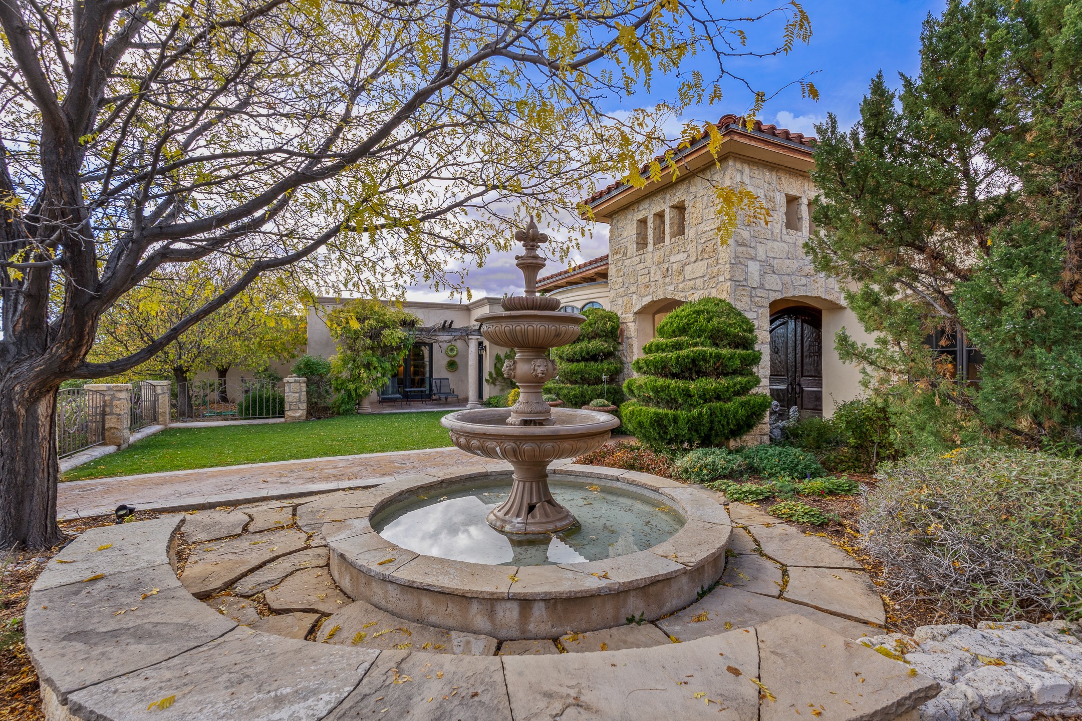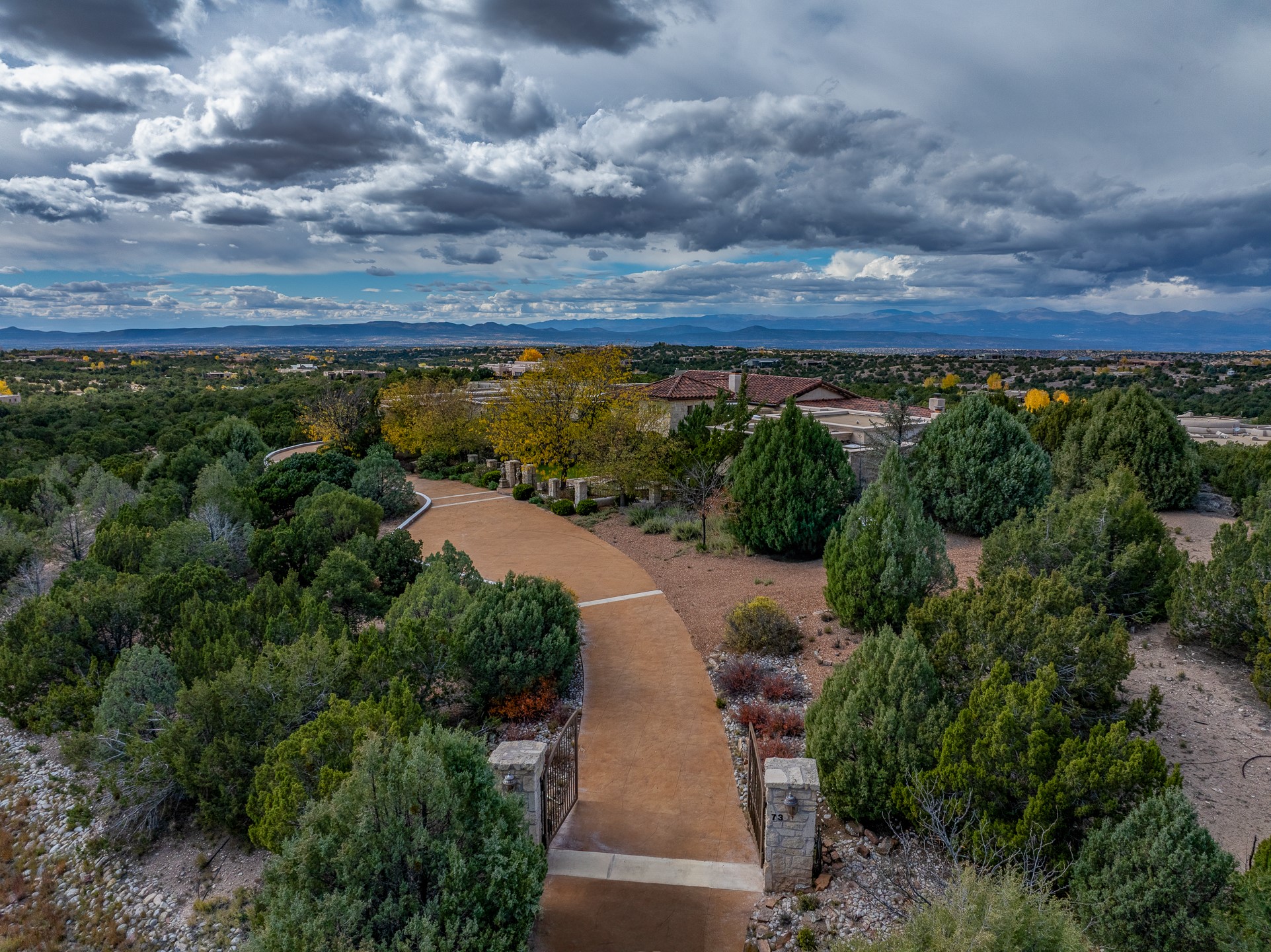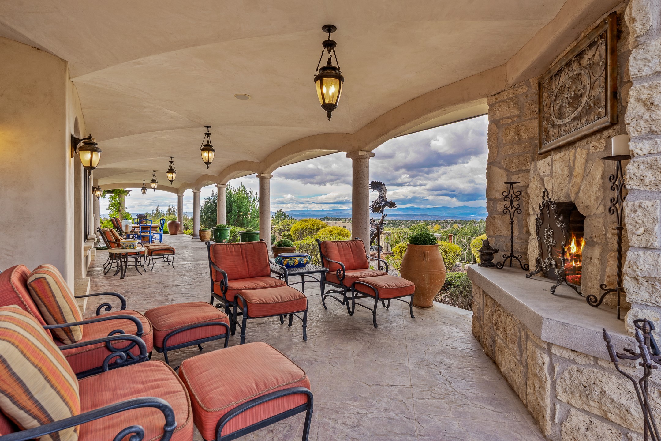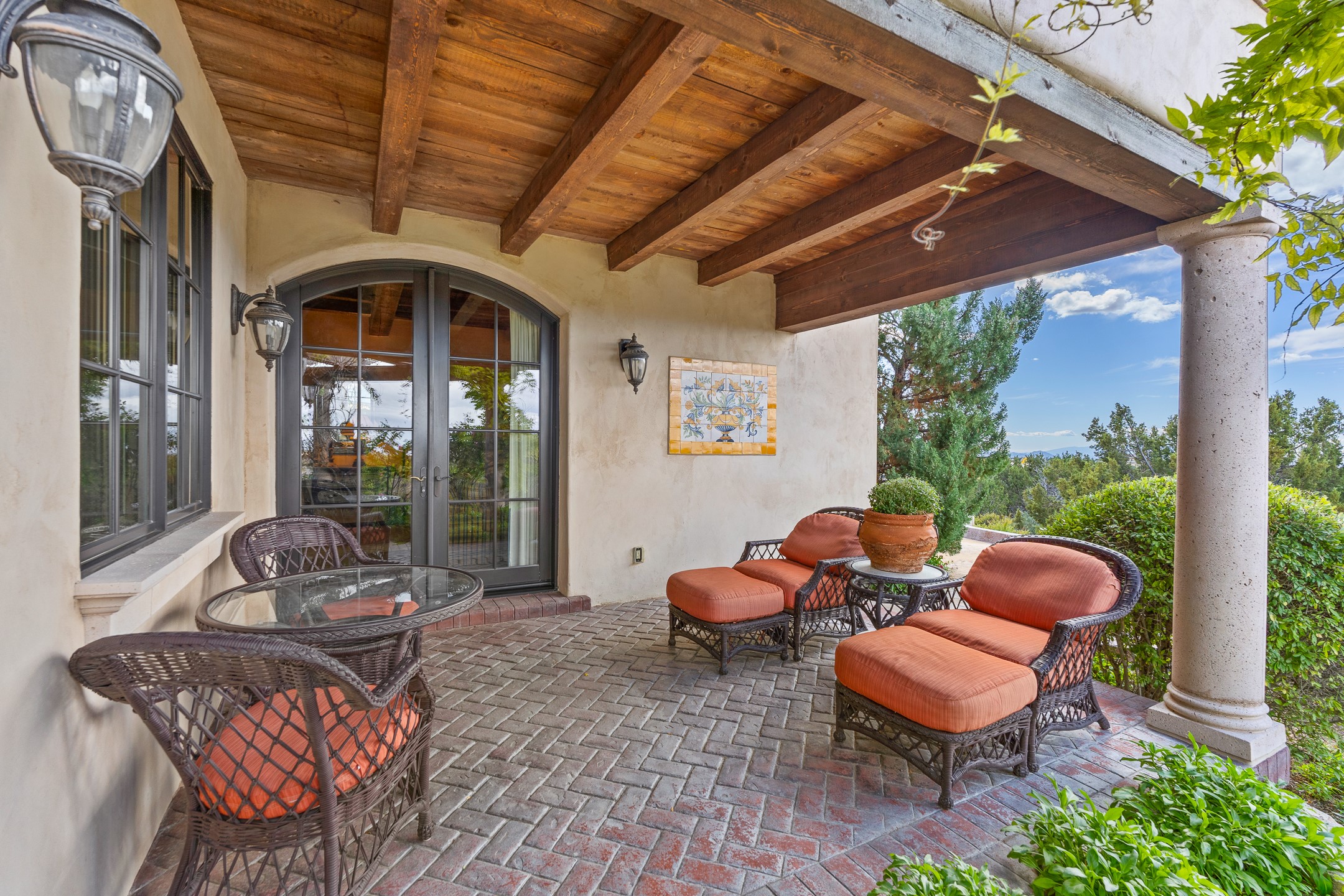 For those drawn to the romance of Italy, this extraordinary residence captures the essence of a Tuscan villa translated beautifully into the high desert landscape of Santa Fe. Nestled on 2.5 acres in the coveted Sundance Estates, this home with 4 bedrooms plus an office, 4.5 baths, and a 3-car garage offers 5,013 square feet of refined living, crafted with exquisite detail and timeless materials. Beyond stately wrought-iron gates, cupid sculptures and a stamped and colored concrete drive lead to a grand arrival with limestone walls, a graceful fountain, and hand-hewn double doors. Inside, rich walnut and travertine floors create a harmonious blend of warmth and sophistication. Diamond plaster walls, coved plaster ceilings, and rustic wood trestle beams evoke the artistry of old-world Europe, while expansive windows and French doors frame breathtaking mountain and sunset vistas. The chef's kitchen is a showpiece--adorned with alder cabinetry, granite countertops, a Wolf range, a Subzero refrigerator, a built-in Miele coffee center, and a wine cooler. Here you'll be romanced by a generous island, casual dining area, and adjoining family room with a fireplace, creating an inviting central gathering space. The kitchen and living room open to a deep covered portal designed for alfresco entertaining, featuring an outdoor kitchen, limestone fireplace, and rose garden.The east wing hosts the elegant primary suite with its own fireplace, private portal, and in-ground spa with a waterfall. The spa-like bath offers dual vanities, a soaking tub, and a large walk-in shower, while the custom closet provides both beauty and functionality. On the west side of the home, you will find 2 guest suites providing separation and privacy. There is also a handsome study with a built-in desk and shelves, and a view to the front garden and fountain. Additionally, there is a private casita with its own entrance, kitchenette, and ensuite bath offers comfort and independence for guests.