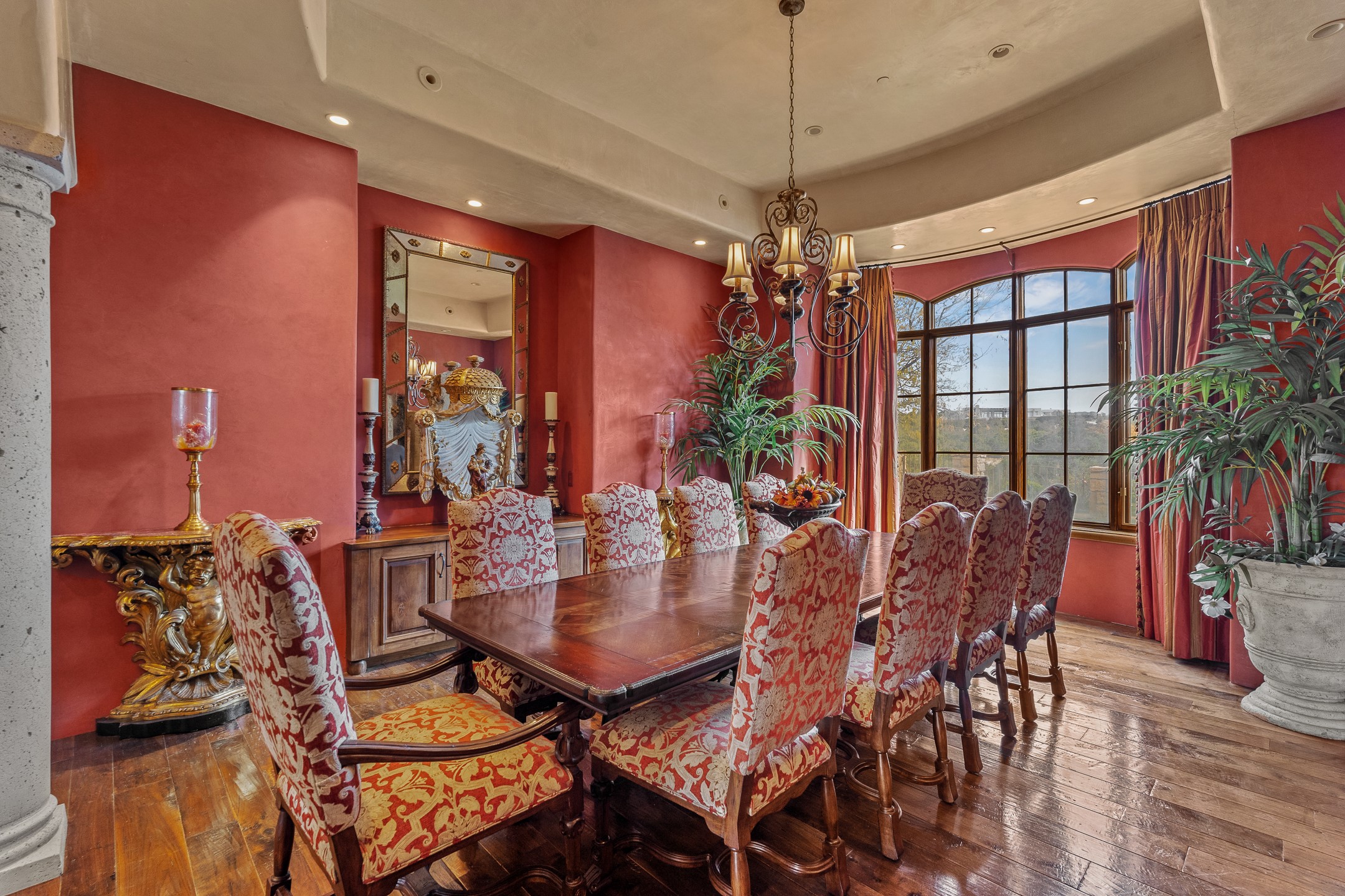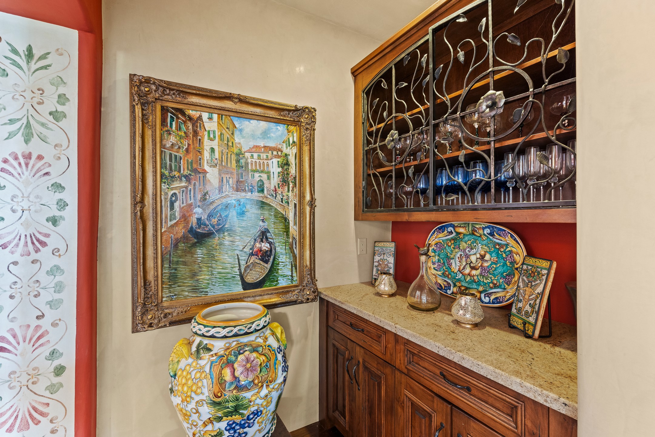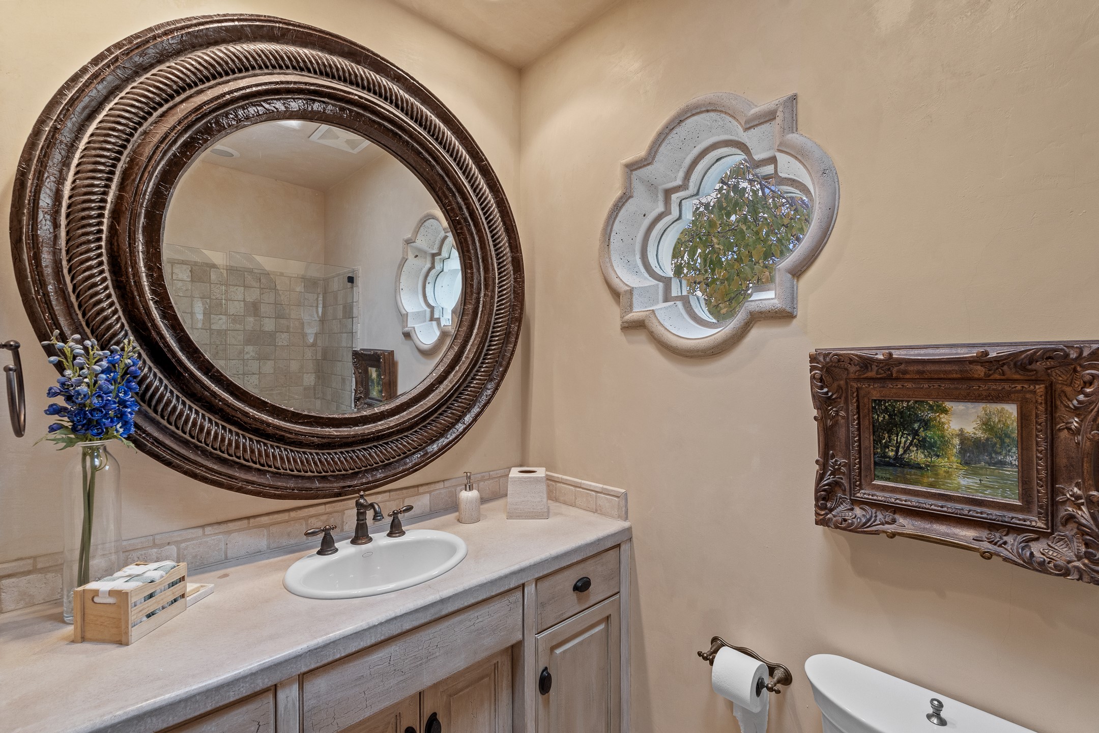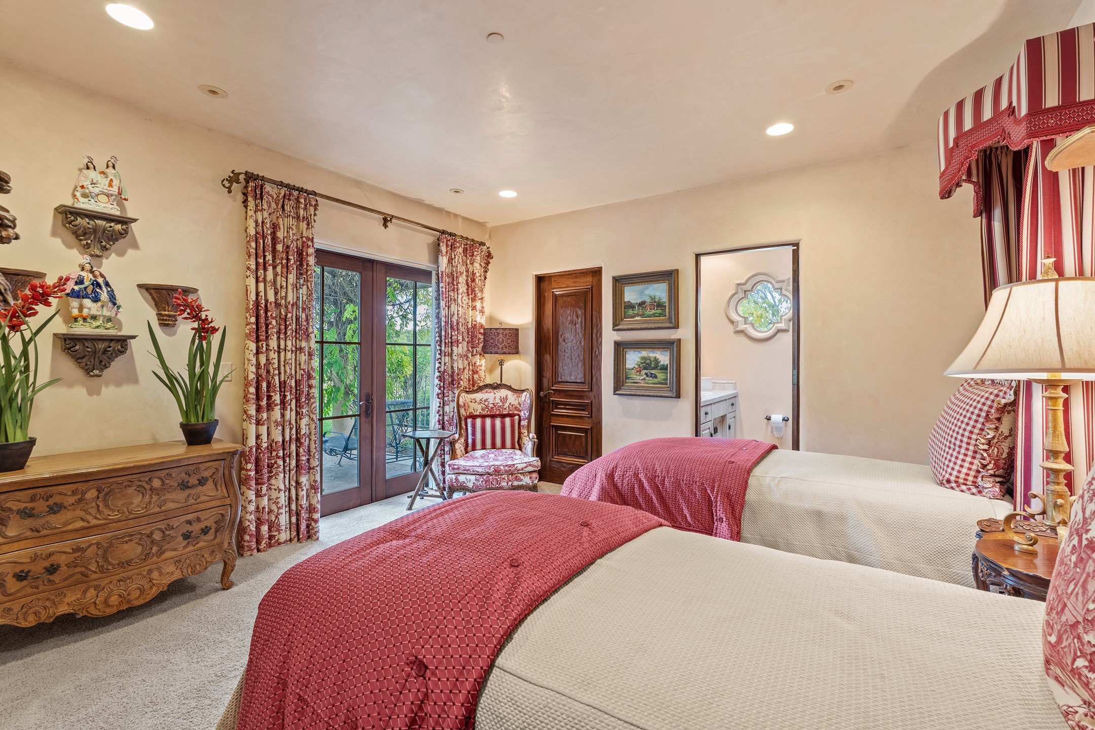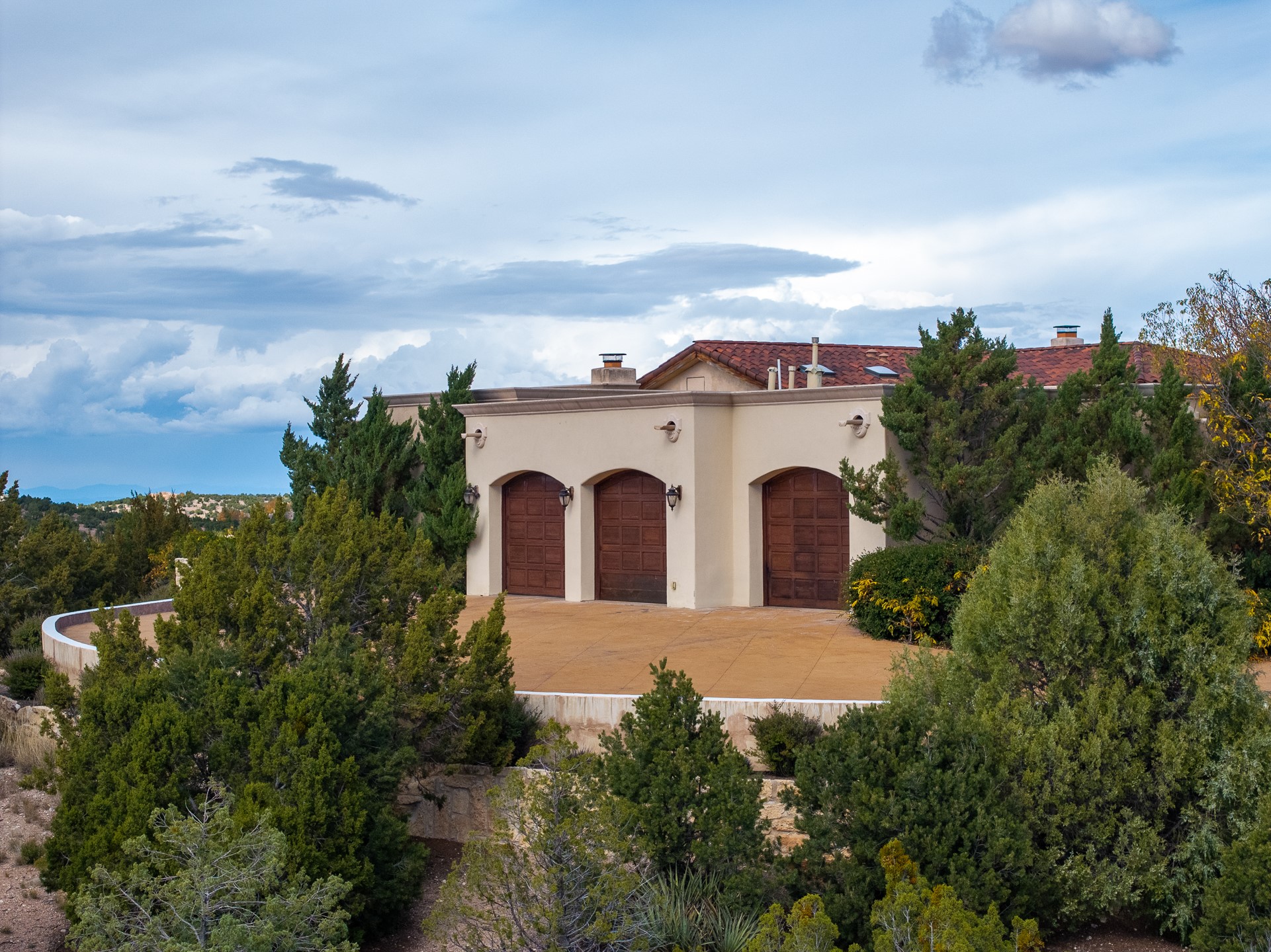 For those drawn to the romance of Italy, this extraordinary residence captures the essence of a Tuscan villa translated beautifully into the high desert landscape of Santa Fe. Nestled on 2.5 acres in the coveted Sundance Estates, this home with 4 bedrooms plus an office, 4.5 baths, and a 3-car garage offers 5,013 square feet of refined living, crafted with exquisite detail and timeless materials. Beyond stately wrought-iron gates, cupid sculptures and a stamped and colored concrete drive lead to a grand arrival with limestone walls, a graceful fountain, and hand-hewn double doors. Inside, rich walnut and travertine floors create a harmonious blend of warmth and sophistication. Diamond plaster walls, coved plaster ceilings, and rustic wood trestle beams evoke the artistry of old-world Europe, while expansive windows and French doors frame breathtaking mountain and sunset vistas. The chef's kitchen is a showpiece--adorned with alder cabinetry, granite countertops, a Wolf range, a Subzero refrigerator, a built-in Miele coffee center, and a wine cooler. Here you'll be romanced by a generous island, casual dining area, and adjoining family room with a fireplace, creating an inviting central gathering space. The kitchen and living room open to a deep covered portal designed for alfresco entertaining, featuring an outdoor kitchen, limestone fireplace, and rose garden.The east wing hosts the elegant primary suite with its own fireplace, private portal, and in-ground spa with a waterfall. The spa-like bath offers dual vanities, a soaking tub, and a large walk-in shower, while the custom closet provides both beauty and functionality. On the west side of the home, you will find 2 guest suites providing separation and privacy. There is also a handsome study with a built-in desk and shelves, and a view to the front garden and fountain. Additionally, there is a private casita with its own entrance, kitchenette, and ensuite bath offers comfort and independence for guests.