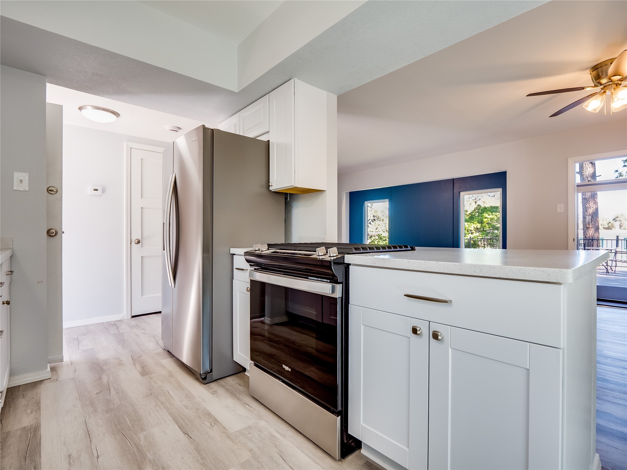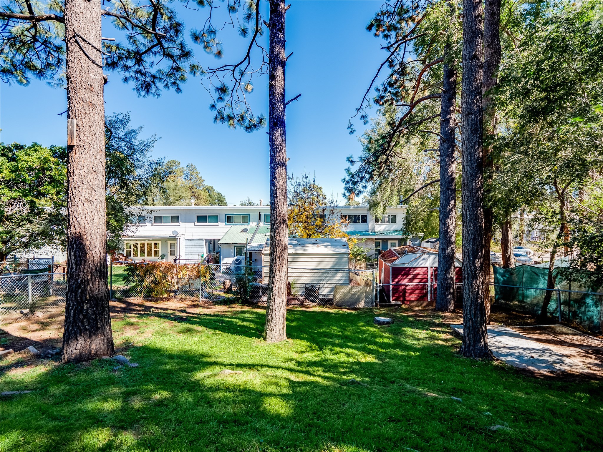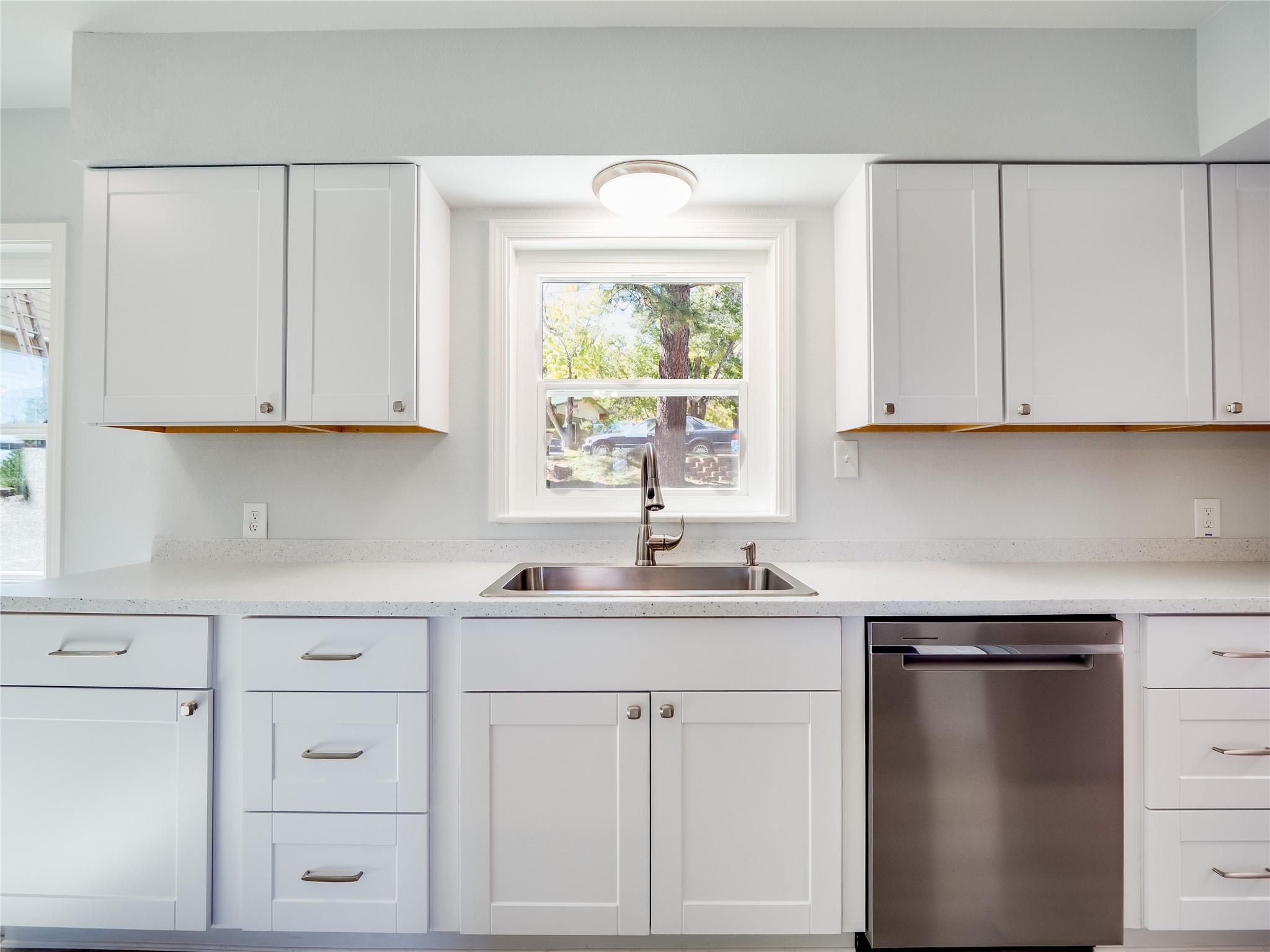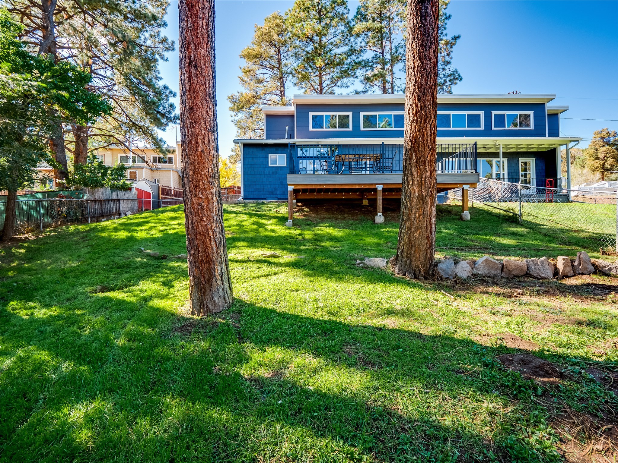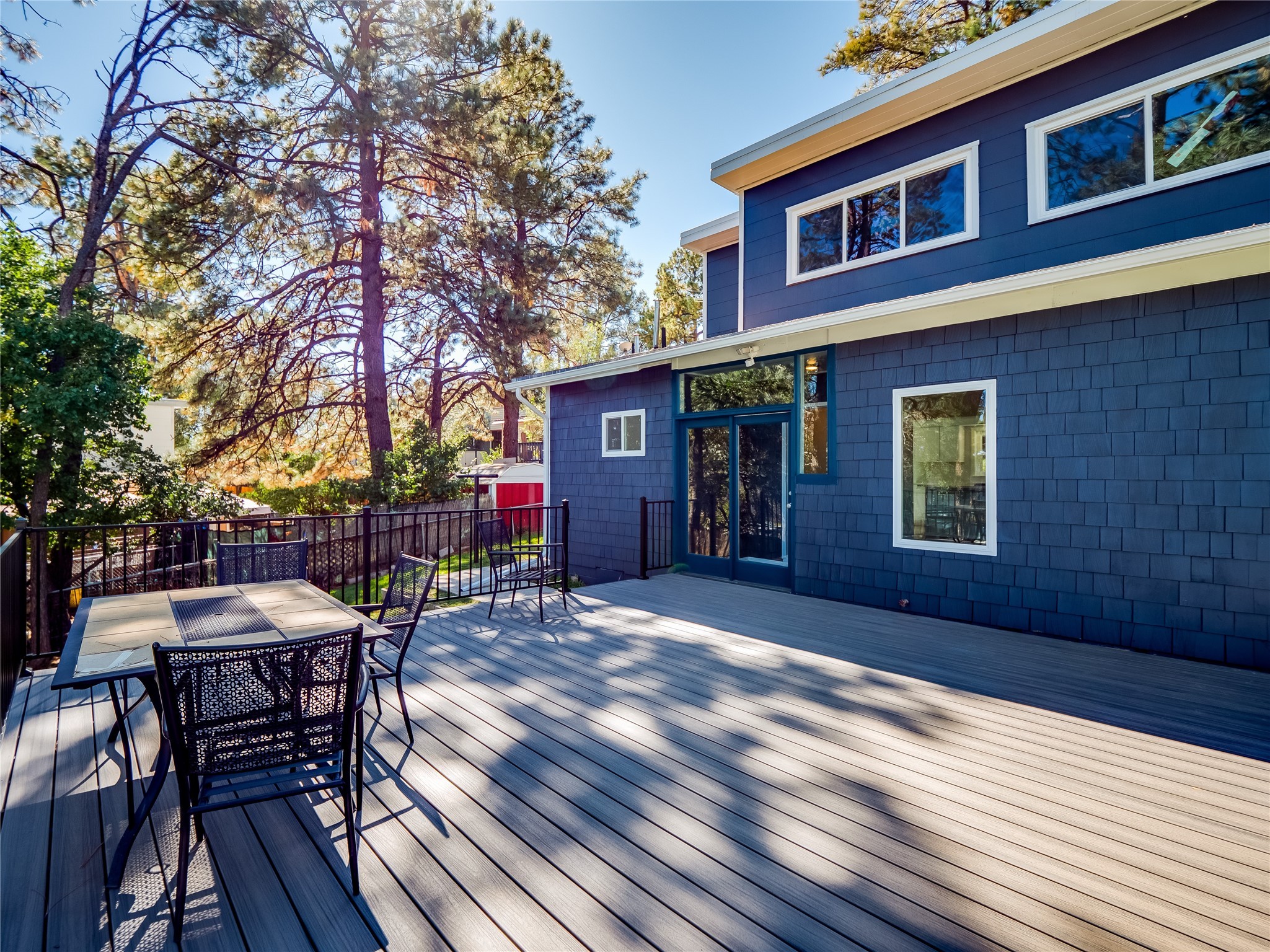 This beautifully renovated modern two-story home is located in the desirable N Community neighborhood, just seconds from Urban Park, schools, and scenic trails. Dedicated parking spots at street level provide convenient access before you head down the stairs into the inviting front yard surrounded by mature trees and lush green grass. The freshly painted blue exterior gives this home a cheerful curb appeal that welcomes you in. Step inside to find brand-new flooring flowing throughout the home and a bright, open concept living and dining space designed for both comfort and entertaining. The spacious living room features an added bonus area perfect as a sunroom, reading nook, or creative workspace. French doors open to a large composite deck ideal for BBQs, outdoor dining, or relaxing under the stars, all encased by a grass lawn and mature trees that create a sense of privacy and tranquility. The completely renovated kitchen is a showstopper, featuring crisp white shaker cabinets with chrome hardware, quartz countertops, and stainless steel appliances. A peninsula with a built-in stove/oven doubles as bar seating, while an adjacent breakfast nook provides the perfect spot to enjoy your morning coffee. Nearby, you'll find convenient exterior storage closets and off the living room there's a stylish guest bathroom with a walk-in shower with glass enclosure, a modern single-sink vanity, and laundry hookups. Upstairs, the home offers three comfortable bedrooms, including two guest rooms, one with double closets and a spacious primary bedroom with a walk-in closet. The shared full bathroom has been tastefully updated with a single-sink vanity, sleek fixtures, and a tiled shower/tub combo. Move-in ready and thoughtfully upgraded throughout, this home blends modern finishes with a warm, inviting atmosphere. Come see this beautiful home today!