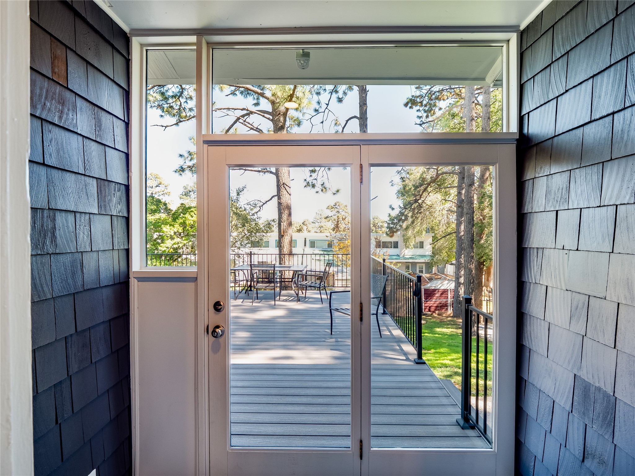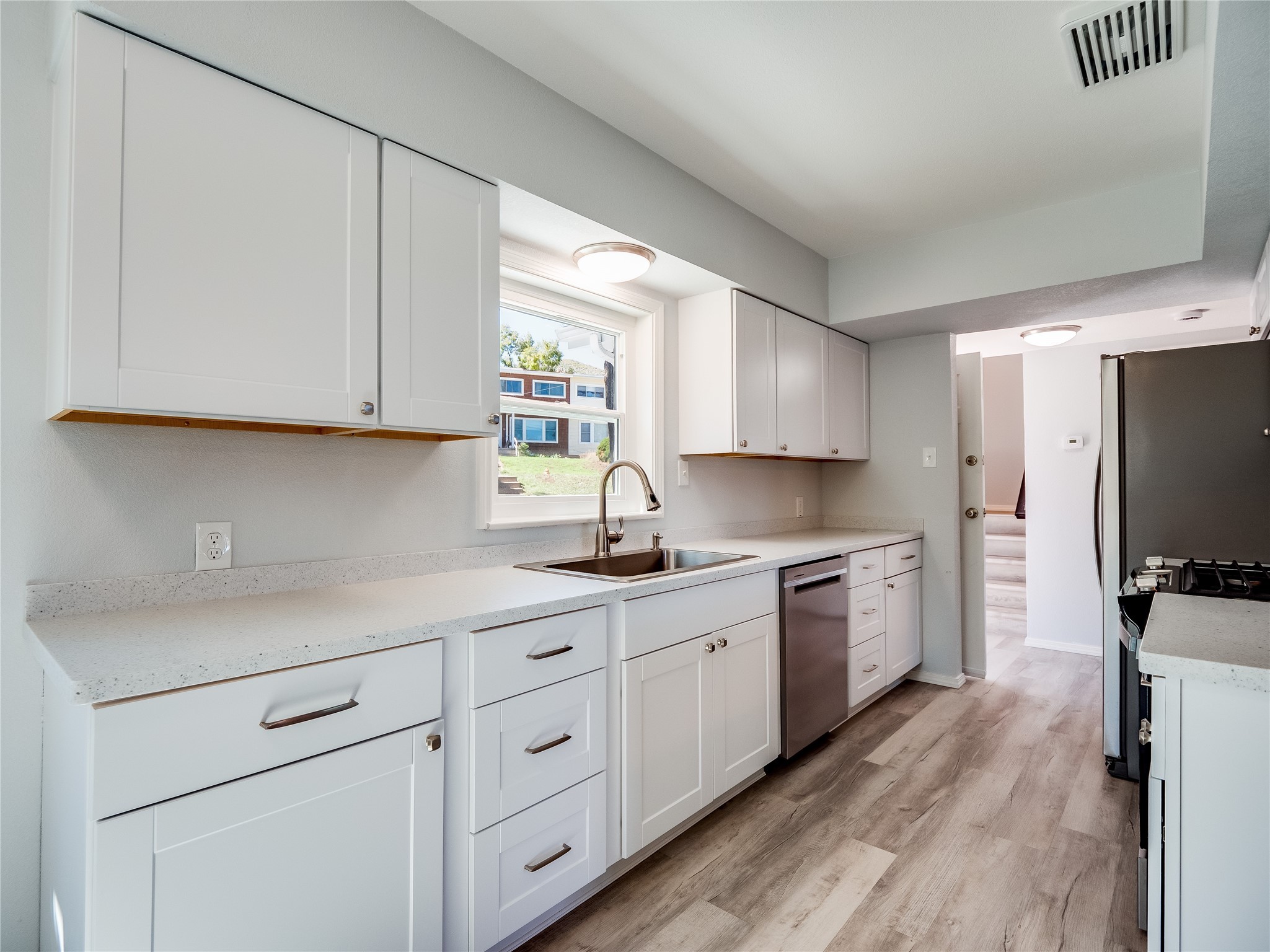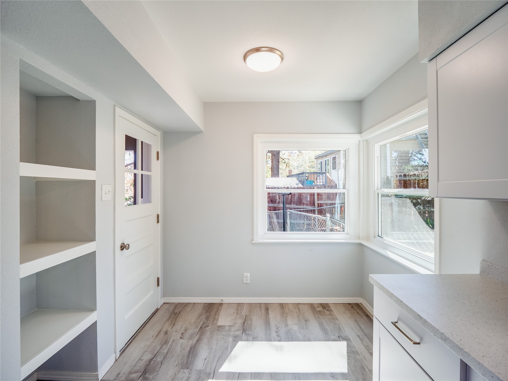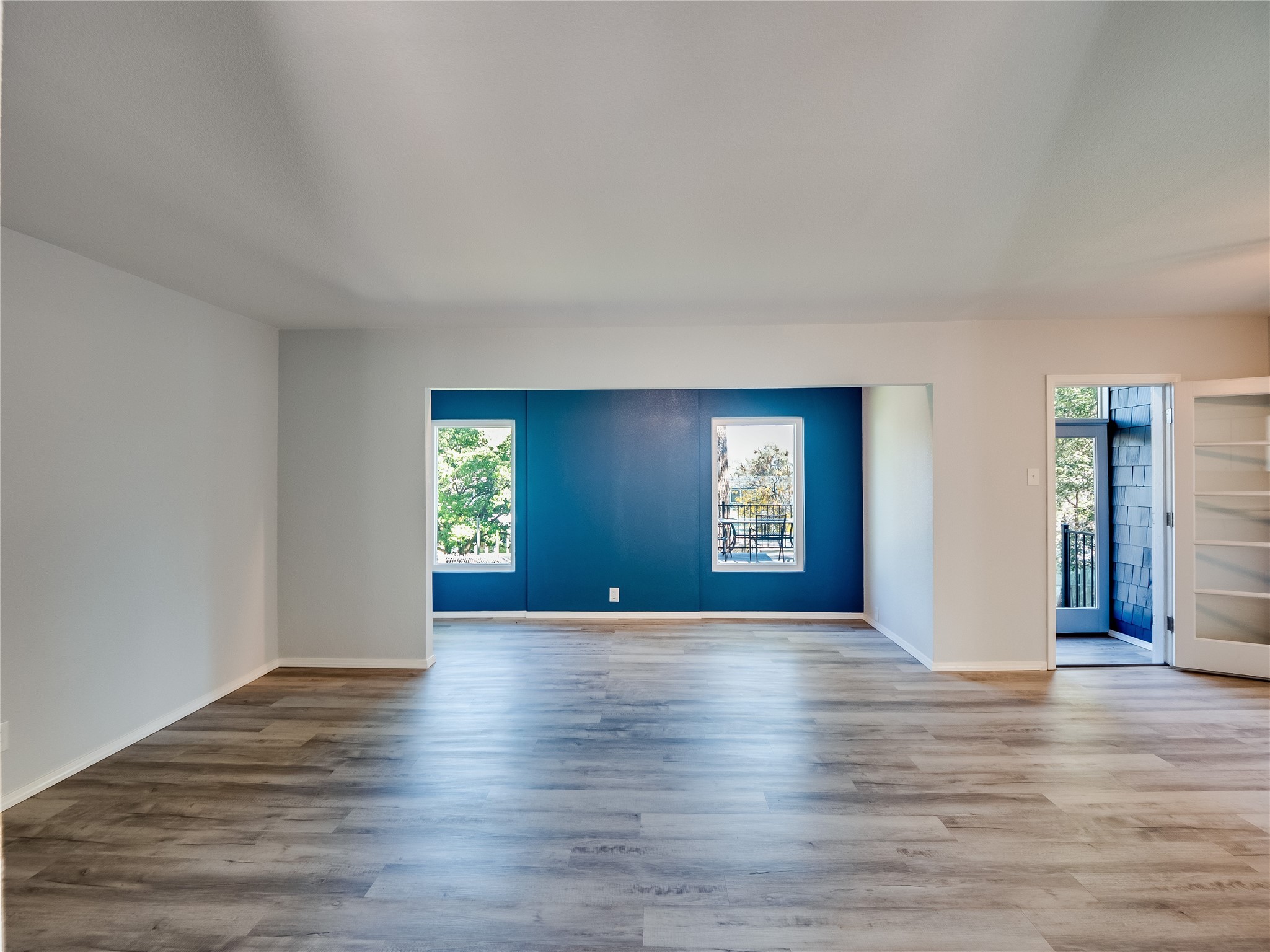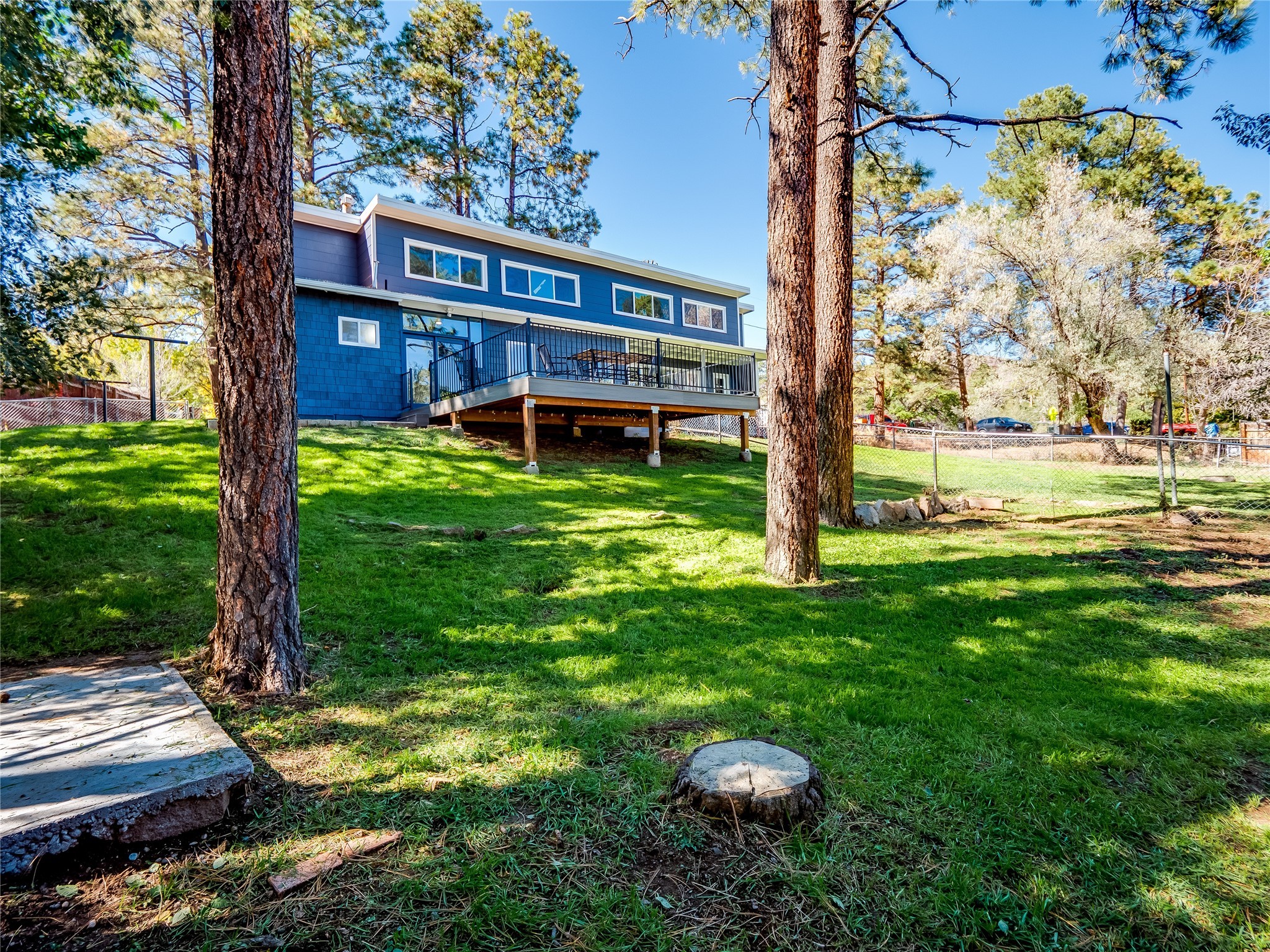 This beautifully renovated modern two-story home is located in the desirable N Community neighborhood, just seconds from Urban Park, schools, and scenic trails. Dedicated parking spots at street level provide convenient access before you head down the stairs into the inviting front yard surrounded by mature trees and lush green grass. The freshly painted blue exterior gives this home a cheerful curb appeal that welcomes you in. Step inside to find brand-new flooring flowing throughout the home and a bright, open concept living and dining space designed for both comfort and entertaining. The spacious living room features an added bonus area perfect as a sunroom, reading nook, or creative workspace. French doors open to a large composite deck ideal for BBQs, outdoor dining, or relaxing under the stars, all encased by a grass lawn and mature trees that create a sense of privacy and tranquility. The completely renovated kitchen is a showstopper, featuring crisp white shaker cabinets with chrome hardware, quartz countertops, and stainless steel appliances. A peninsula with a built-in stove/oven doubles as bar seating, while an adjacent breakfast nook provides the perfect spot to enjoy your morning coffee. Nearby, you'll find convenient exterior storage closets and off the living room there's a stylish guest bathroom with a walk-in shower with glass enclosure, a modern single-sink vanity, and laundry hookups. Upstairs, the home offers three comfortable bedrooms, including two guest rooms, one with double closets and a spacious primary bedroom with a walk-in closet. The shared full bathroom has been tastefully updated with a single-sink vanity, sleek fixtures, and a tiled shower/tub combo. Move-in ready and thoughtfully upgraded throughout, this home blends modern finishes with a warm, inviting atmosphere. Come see this beautiful home today!