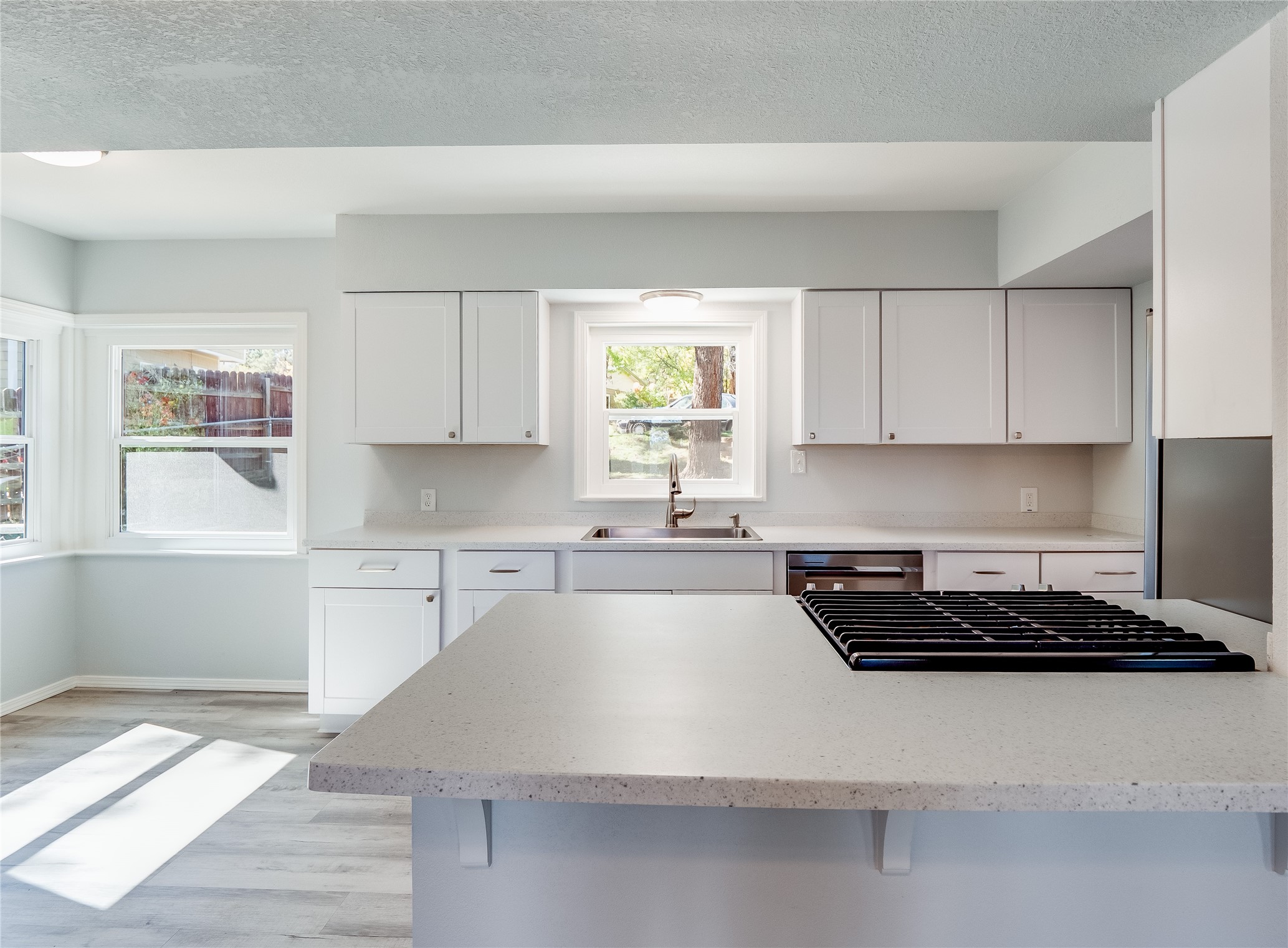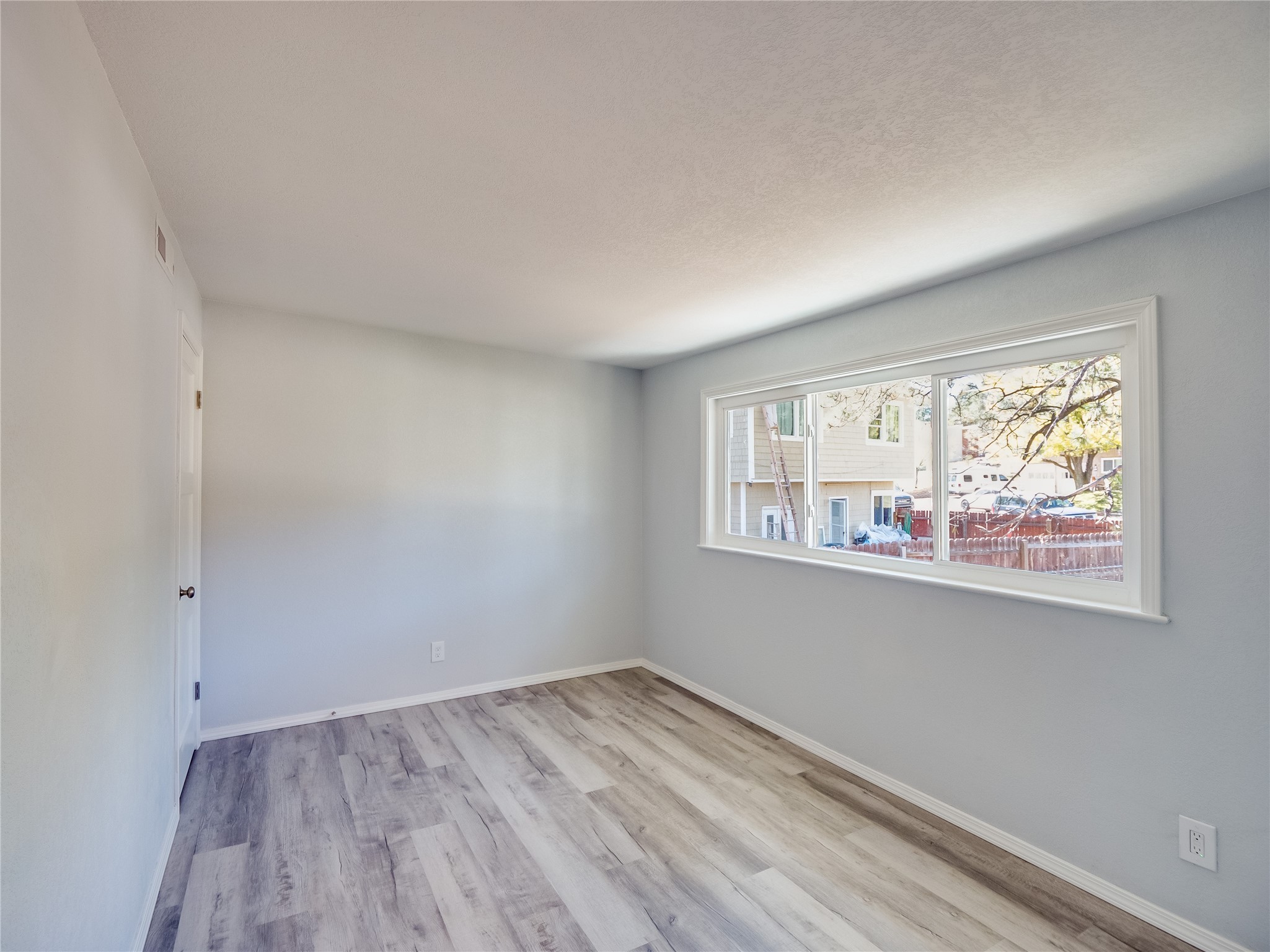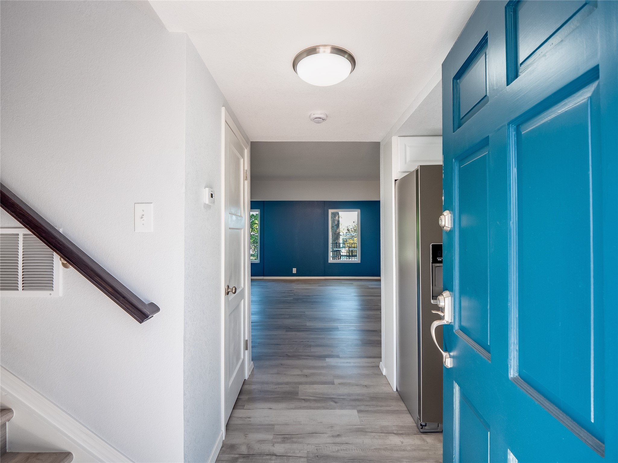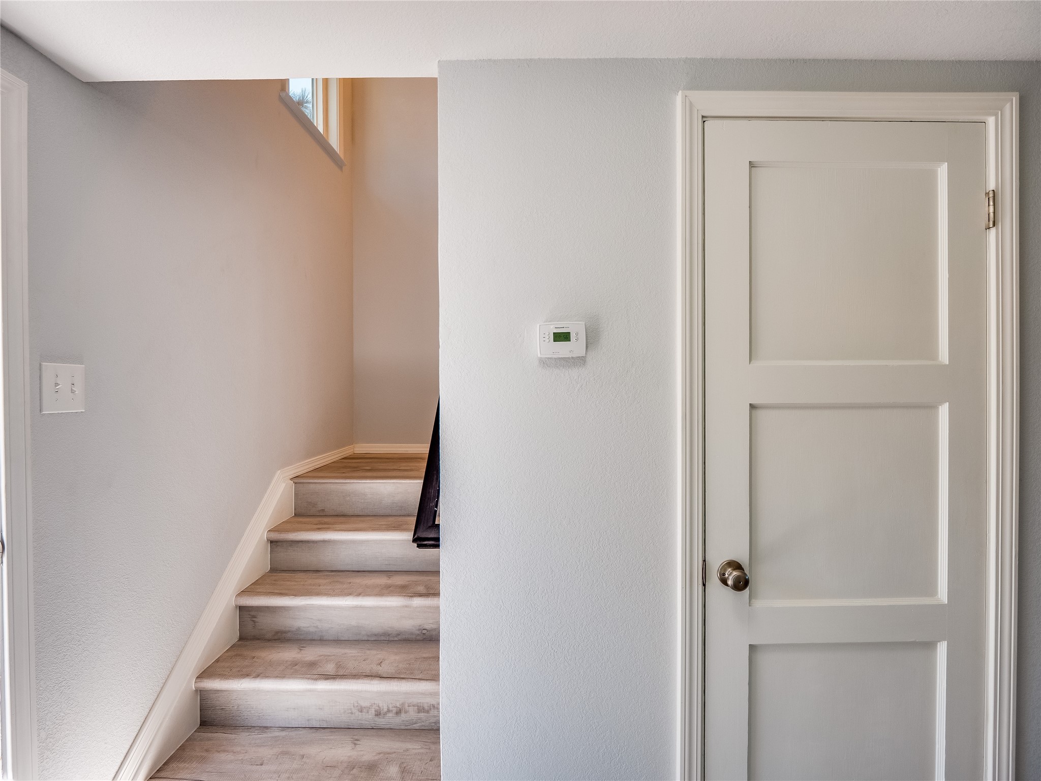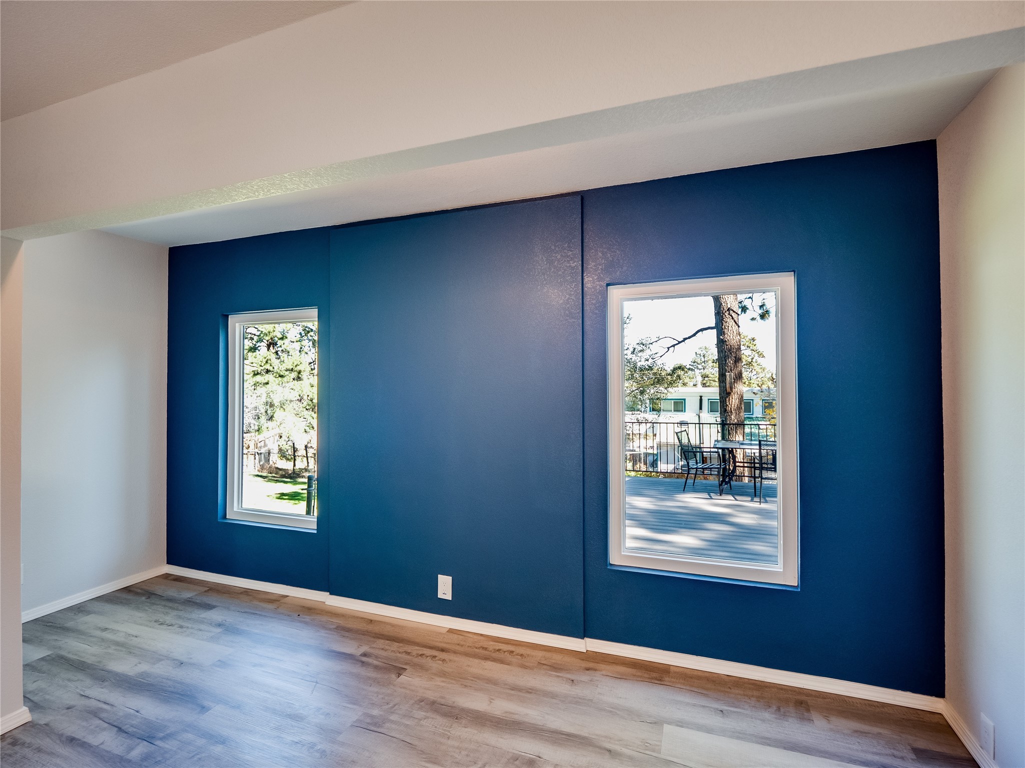 This beautifully renovated modern two-story home is located in the desirable N Community neighborhood, just seconds from Urban Park, schools, and scenic trails. Dedicated parking spots at street level provide convenient access before you head down the stairs into the inviting front yard surrounded by mature trees and lush green grass. The freshly painted blue exterior gives this home a cheerful curb appeal that welcomes you in. Step inside to find brand-new flooring flowing throughout the home and a bright, open concept living and dining space designed for both comfort and entertaining. The spacious living room features an added bonus area perfect as a sunroom, reading nook, or creative workspace. French doors open to a large composite deck ideal for BBQs, outdoor dining, or relaxing under the stars, all encased by a grass lawn and mature trees that create a sense of privacy and tranquility. The completely renovated kitchen is a showstopper, featuring crisp white shaker cabinets with chrome hardware, quartz countertops, and stainless steel appliances. A peninsula with a built-in stove/oven doubles as bar seating, while an adjacent breakfast nook provides the perfect spot to enjoy your morning coffee. Nearby, you'll find convenient exterior storage closets and off the living room there's a stylish guest bathroom with a walk-in shower with glass enclosure, a modern single-sink vanity, and laundry hookups. Upstairs, the home offers three comfortable bedrooms, including two guest rooms, one with double closets and a spacious primary bedroom with a walk-in closet. The shared full bathroom has been tastefully updated with a single-sink vanity, sleek fixtures, and a tiled shower/tub combo. Move-in ready and thoughtfully upgraded throughout, this home blends modern finishes with a warm, inviting atmosphere. Come see this beautiful home today!