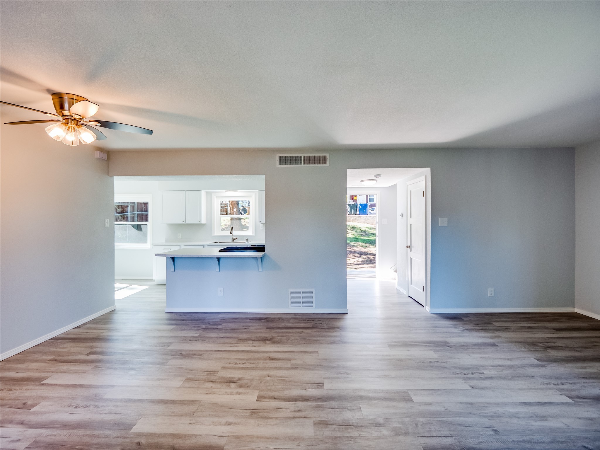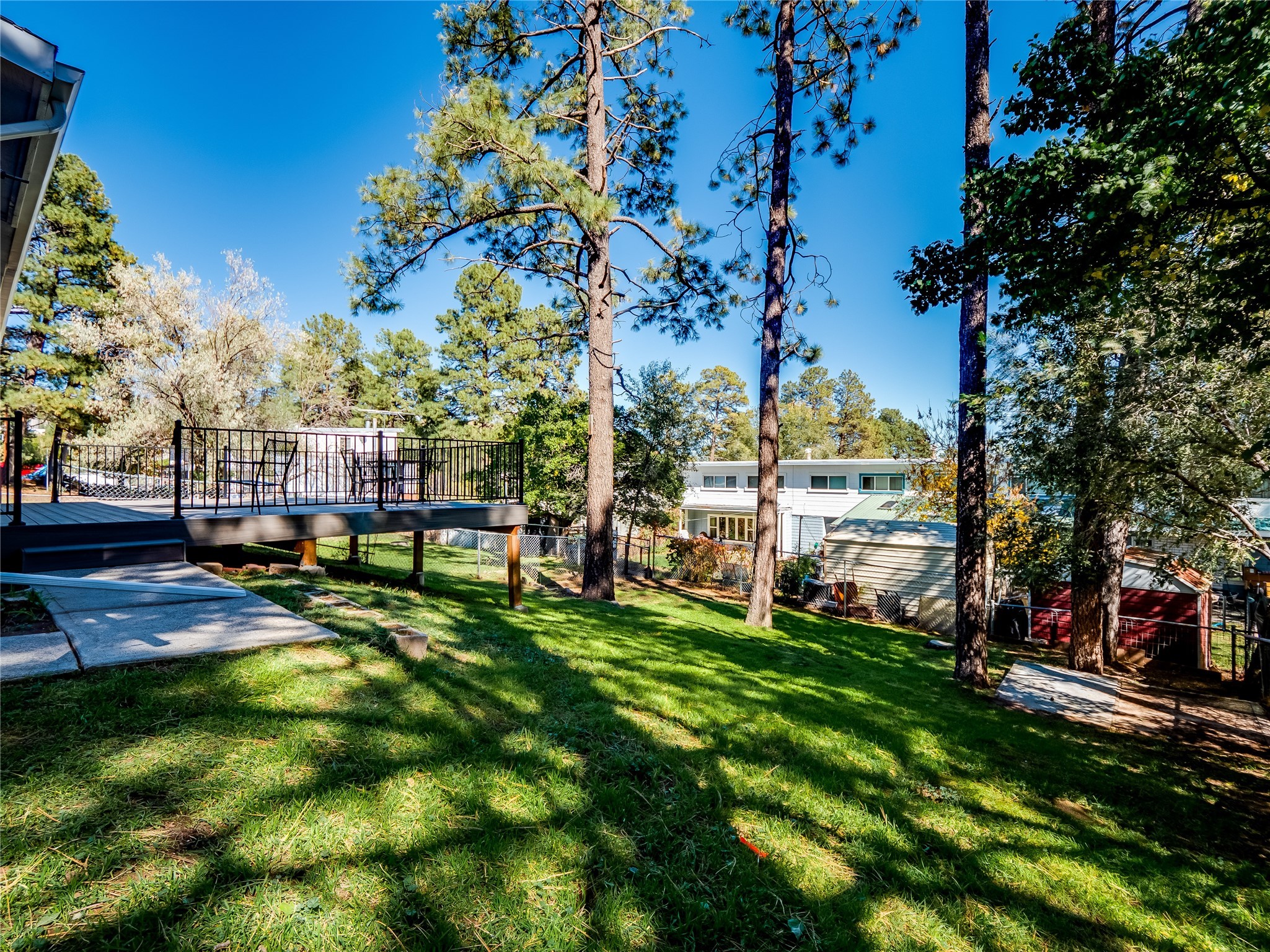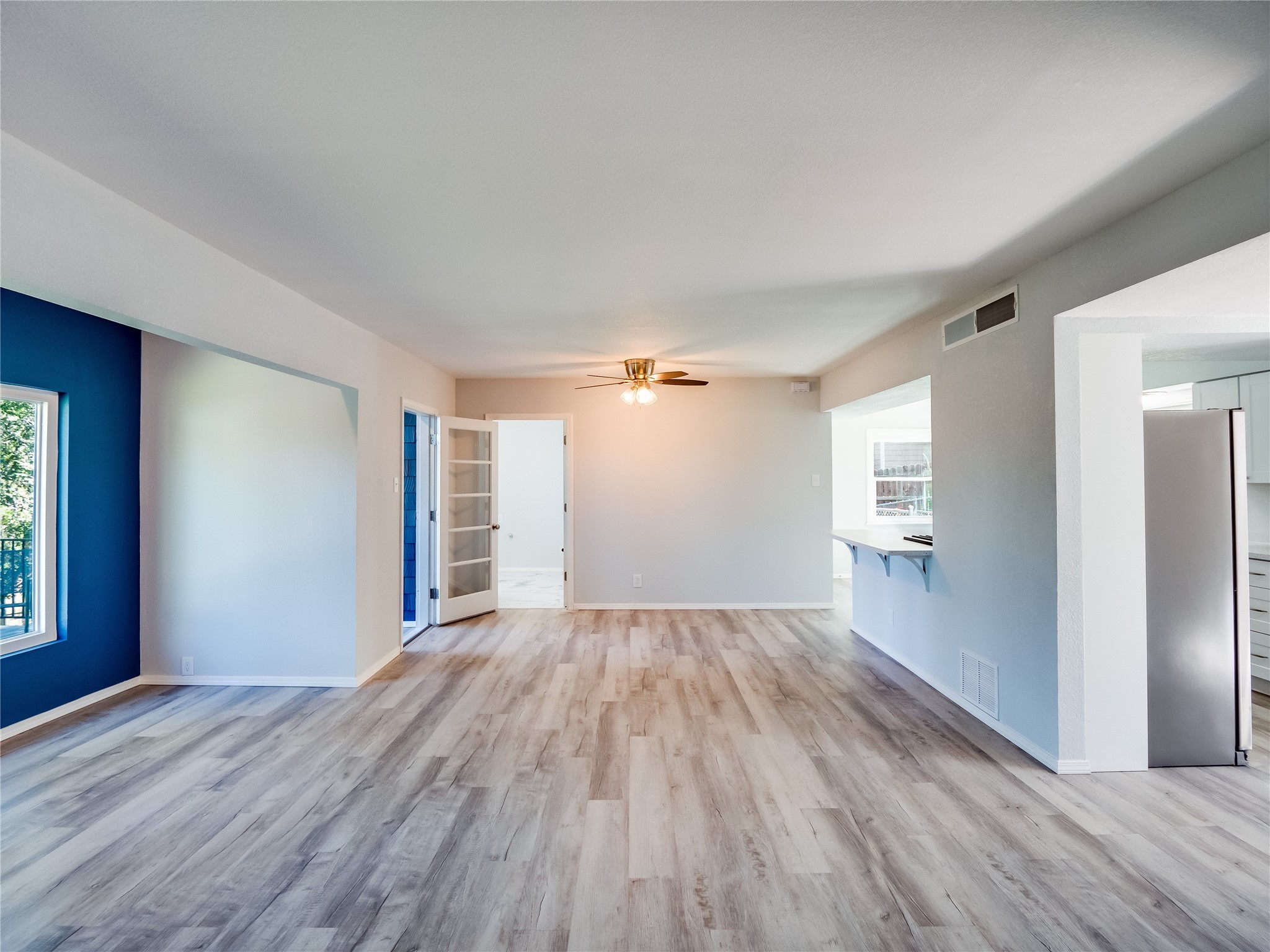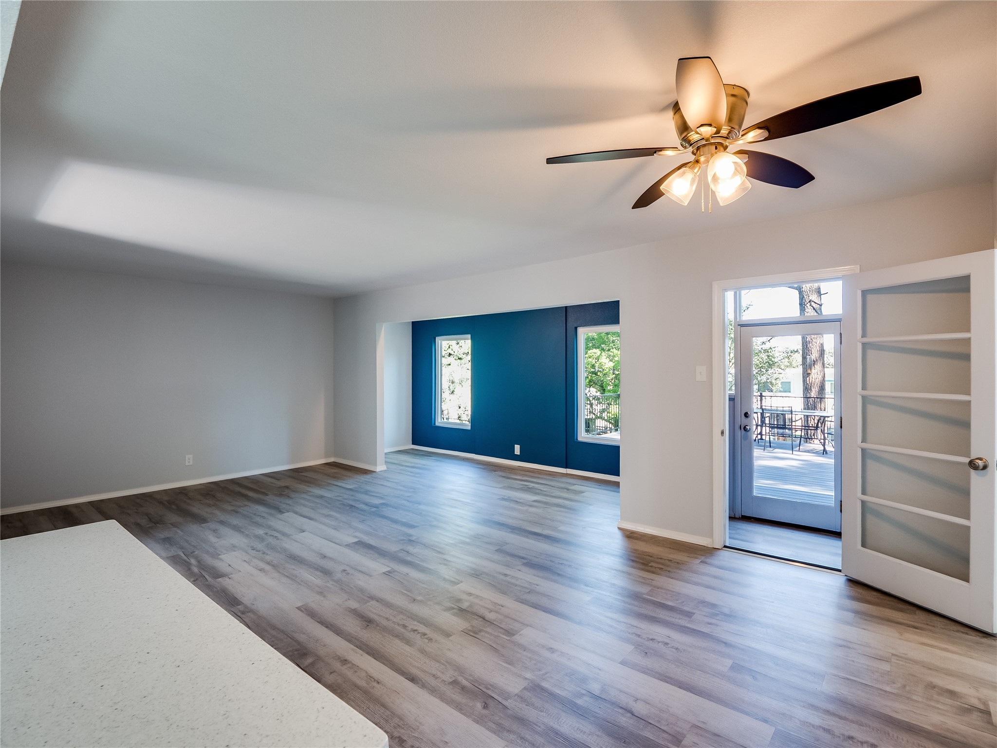 This beautifully renovated modern two-story home is located in the desirable N Community neighborhood, just seconds from Urban Park, schools, and scenic trails. Dedicated parking spots at street level provide convenient access before you head down the stairs into the inviting front yard surrounded by mature trees and lush green grass. The freshly painted blue exterior gives this home a cheerful curb appeal that welcomes you in. Step inside to find brand-new flooring flowing throughout the home and a bright, open concept living and dining space designed for both comfort and entertaining. The spacious living room features an added bonus area perfect as a sunroom, reading nook, or creative workspace. French doors open to a large composite deck ideal for BBQs, outdoor dining, or relaxing under the stars, all encased by a grass lawn and mature trees that create a sense of privacy and tranquility. The completely renovated kitchen is a showstopper, featuring crisp white shaker cabinets with chrome hardware, quartz countertops, and stainless steel appliances. A peninsula with a built-in stove/oven doubles as bar seating, while an adjacent breakfast nook provides the perfect spot to enjoy your morning coffee. Nearby, you'll find convenient exterior storage closets and off the living room there's a stylish guest bathroom with a walk-in shower with glass enclosure, a modern single-sink vanity, and laundry hookups. Upstairs, the home offers three comfortable bedrooms, including two guest rooms, one with double closets and a spacious primary bedroom with a walk-in closet. The shared full bathroom has been tastefully updated with a single-sink vanity, sleek fixtures, and a tiled shower/tub combo. Move-in ready and thoughtfully upgraded throughout, this home blends modern finishes with a warm, inviting atmosphere. Come see this beautiful home today!
