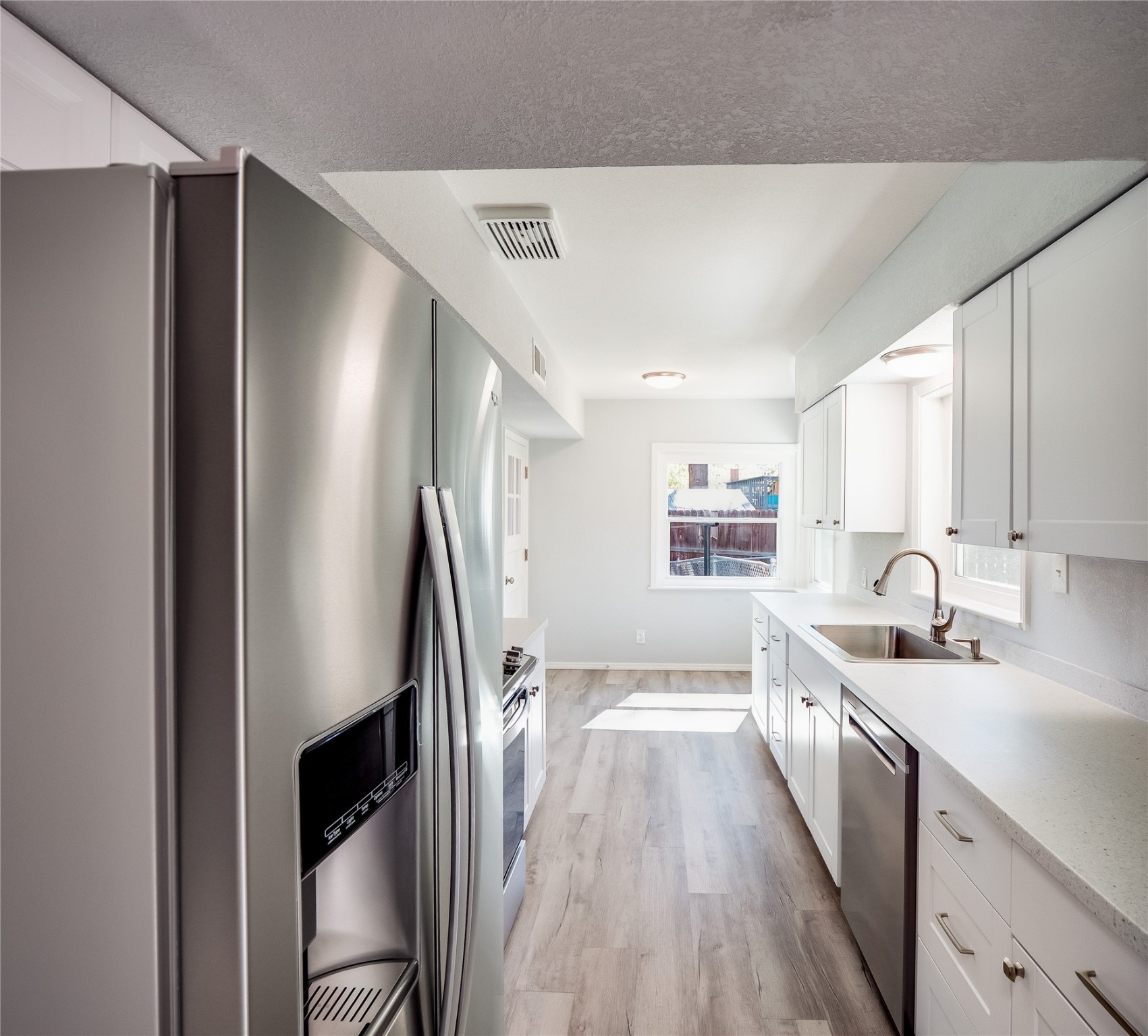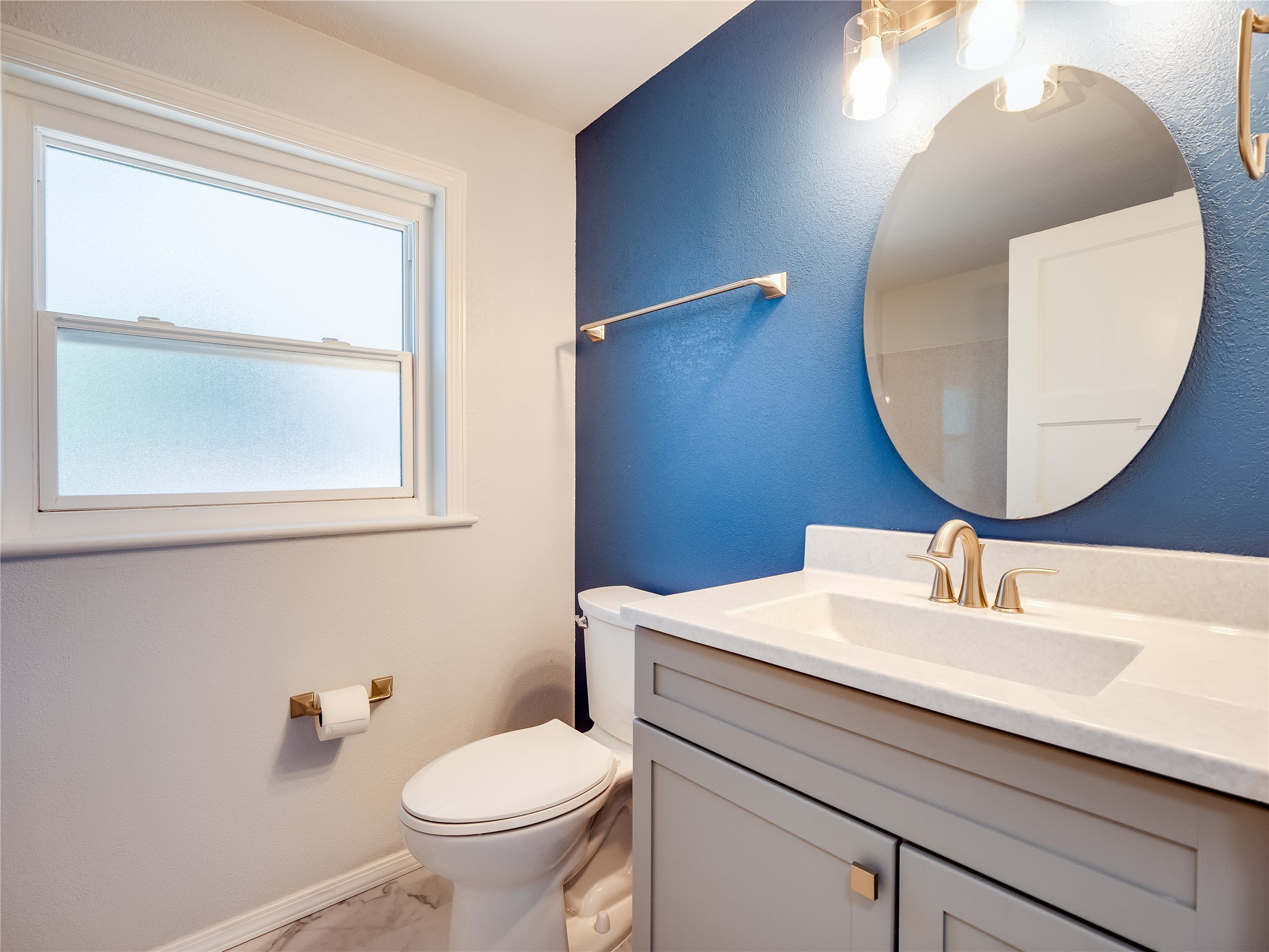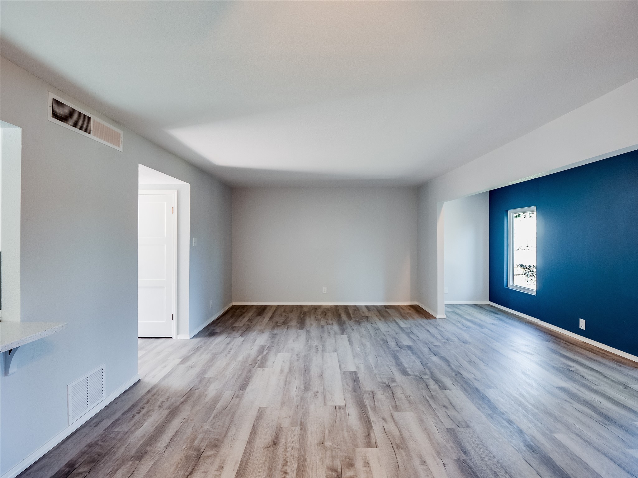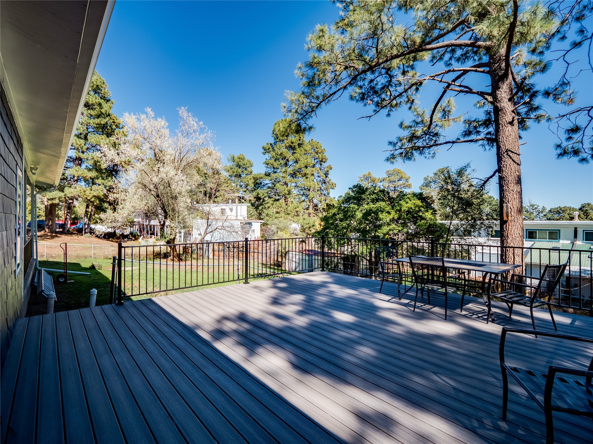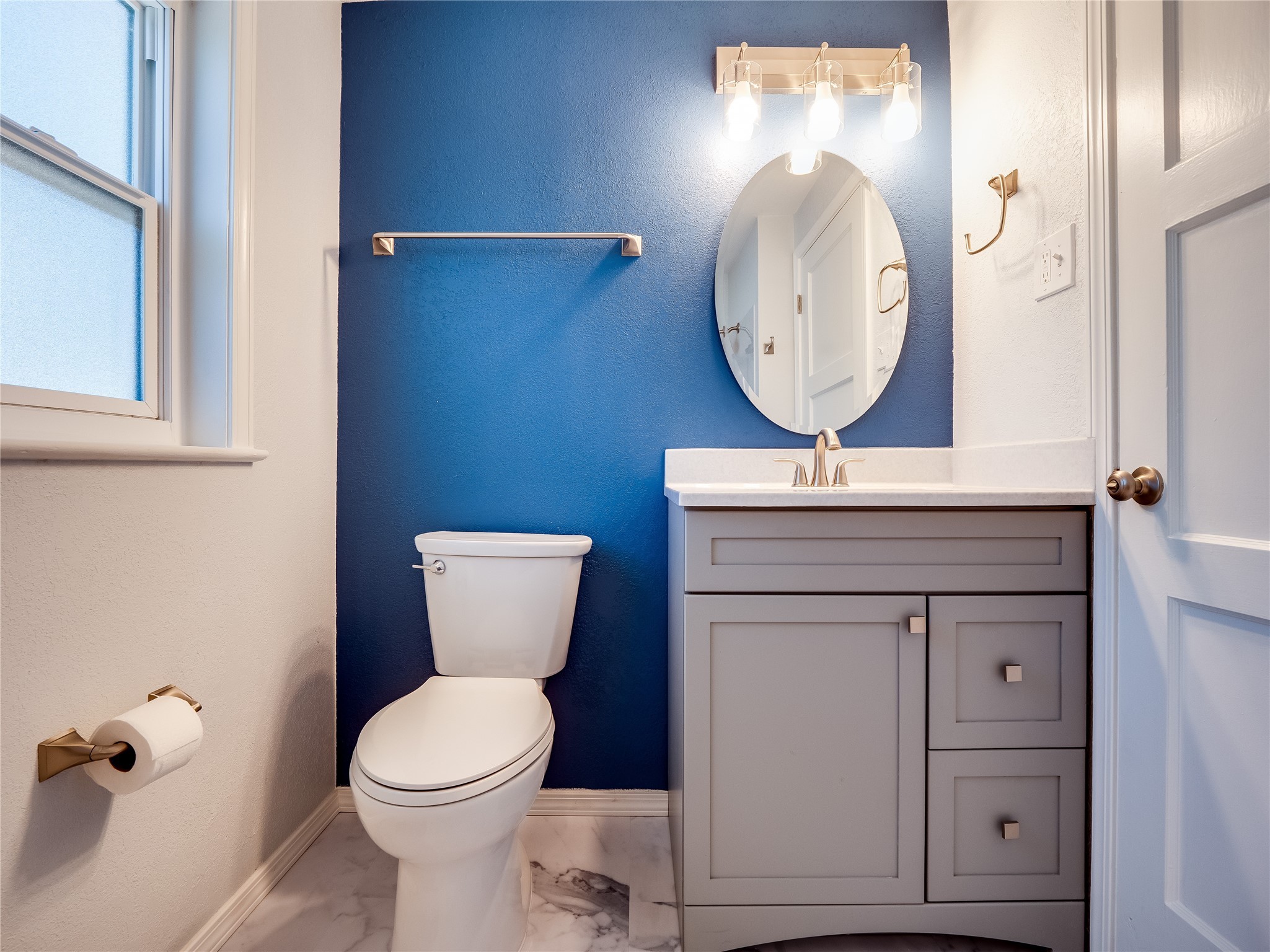 This beautifully renovated modern two-story home is located in the desirable N Community neighborhood, just seconds from Urban Park, schools, and scenic trails. Dedicated parking spots at street level provide convenient access before you head down the stairs into the inviting front yard surrounded by mature trees and lush green grass. The freshly painted blue exterior gives this home a cheerful curb appeal that welcomes you in. Step inside to find brand-new flooring flowing throughout the home and a bright, open concept living and dining space designed for both comfort and entertaining. The spacious living room features an added bonus area perfect as a sunroom, reading nook, or creative workspace. French doors open to a large composite deck ideal for BBQs, outdoor dining, or relaxing under the stars, all encased by a grass lawn and mature trees that create a sense of privacy and tranquility. The completely renovated kitchen is a showstopper, featuring crisp white shaker cabinets with chrome hardware, quartz countertops, and stainless steel appliances. A peninsula with a built-in stove/oven doubles as bar seating, while an adjacent breakfast nook provides the perfect spot to enjoy your morning coffee. Nearby, you'll find convenient exterior storage closets and off the living room there's a stylish guest bathroom with a walk-in shower with glass enclosure, a modern single-sink vanity, and laundry hookups. Upstairs, the home offers three comfortable bedrooms, including two guest rooms, one with double closets and a spacious primary bedroom with a walk-in closet. The shared full bathroom has been tastefully updated with a single-sink vanity, sleek fixtures, and a tiled shower/tub combo. Move-in ready and thoughtfully upgraded throughout, this home blends modern finishes with a warm, inviting atmosphere. Come see this beautiful home today!