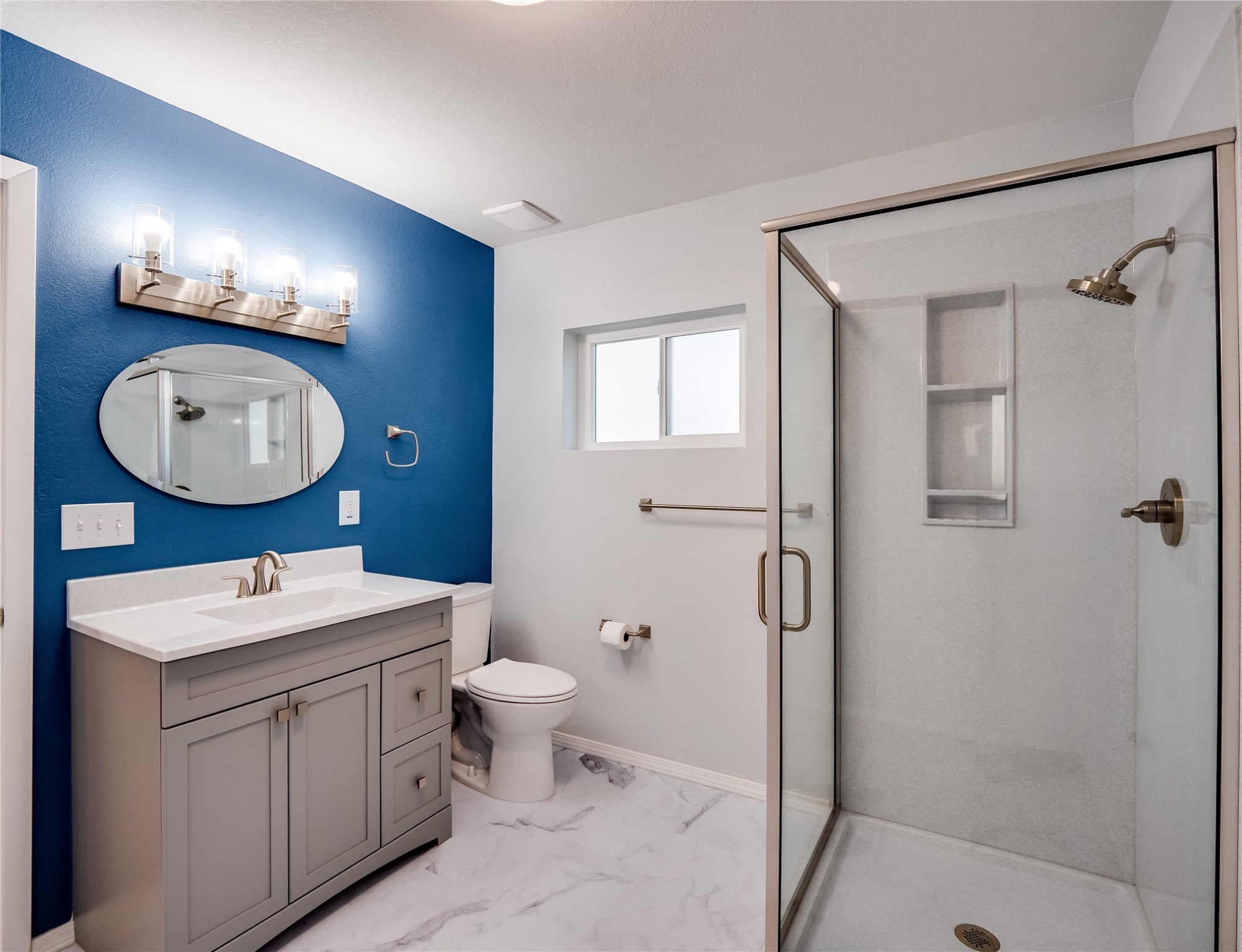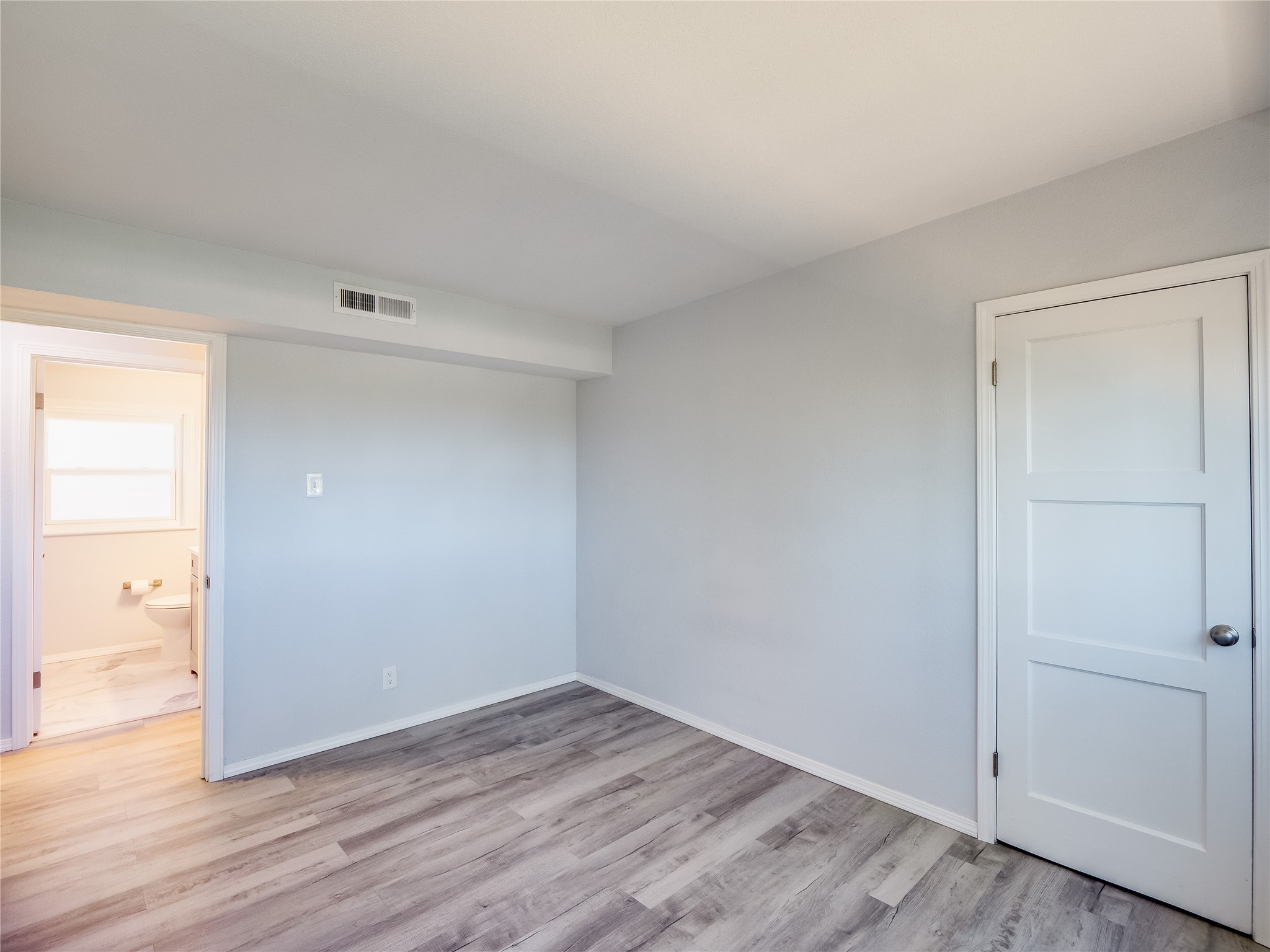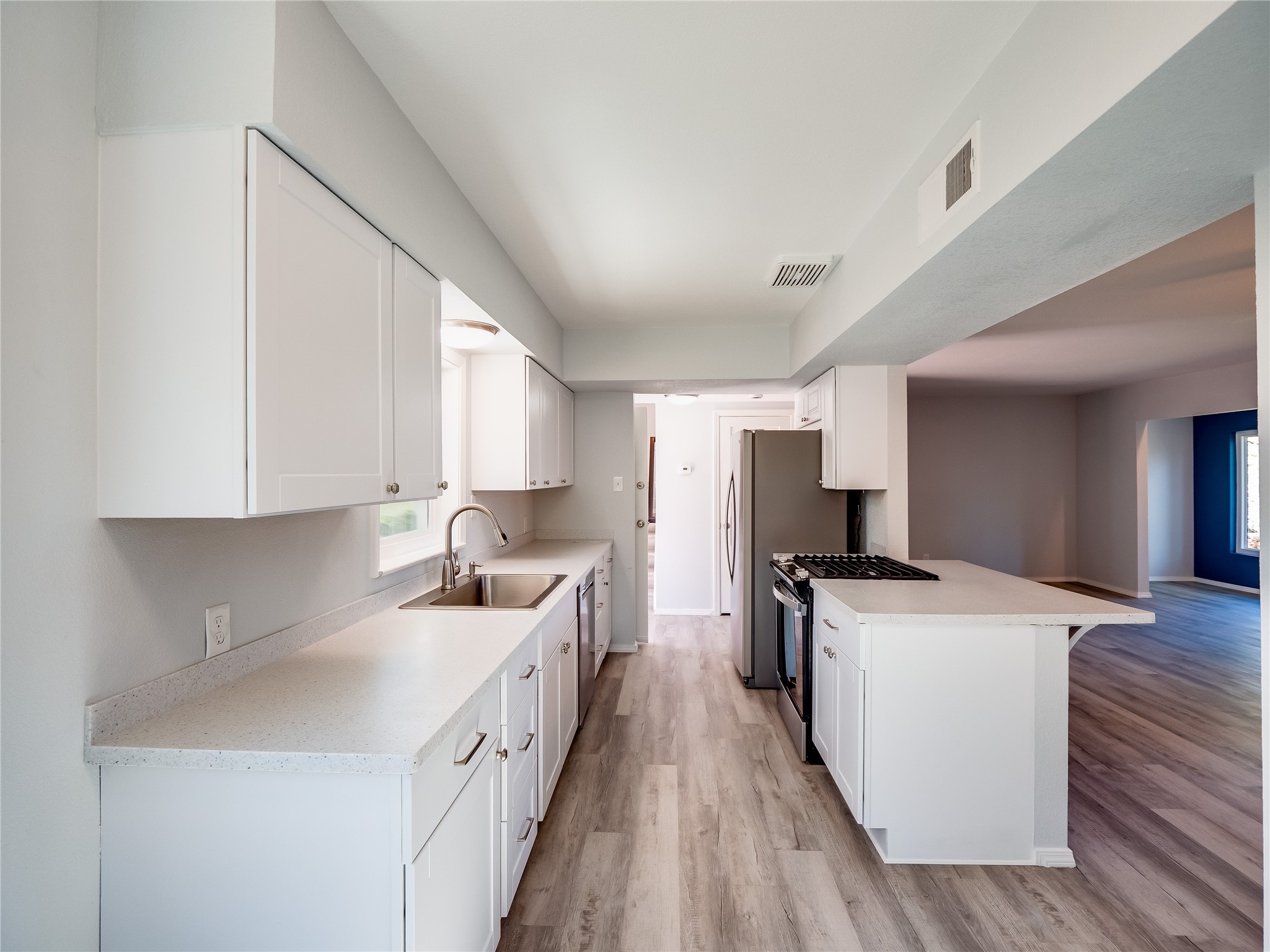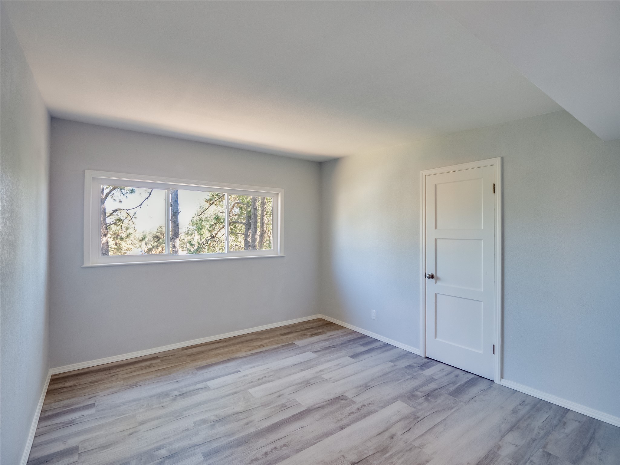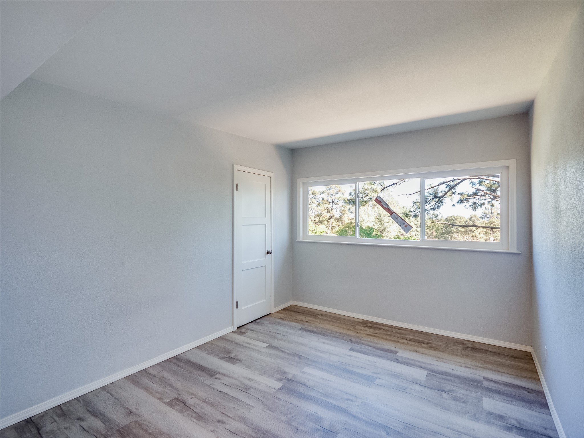 This beautifully renovated modern two-story home is located in the desirable N Community neighborhood, just seconds from Urban Park, schools, and scenic trails. Dedicated parking spots at street level provide convenient access before you head down the stairs into the inviting front yard surrounded by mature trees and lush green grass. The freshly painted blue exterior gives this home a cheerful curb appeal that welcomes you in. Step inside to find brand-new flooring flowing throughout the home and a bright, open concept living and dining space designed for both comfort and entertaining. The spacious living room features an added bonus area perfect as a sunroom, reading nook, or creative workspace. French doors open to a large composite deck ideal for BBQs, outdoor dining, or relaxing under the stars, all encased by a grass lawn and mature trees that create a sense of privacy and tranquility. The completely renovated kitchen is a showstopper, featuring crisp white shaker cabinets with chrome hardware, quartz countertops, and stainless steel appliances. A peninsula with a built-in stove/oven doubles as bar seating, while an adjacent breakfast nook provides the perfect spot to enjoy your morning coffee. Nearby, you'll find convenient exterior storage closets and off the living room there's a stylish guest bathroom with a walk-in shower with glass enclosure, a modern single-sink vanity, and laundry hookups. Upstairs, the home offers three comfortable bedrooms, including two guest rooms, one with double closets and a spacious primary bedroom with a walk-in closet. The shared full bathroom has been tastefully updated with a single-sink vanity, sleek fixtures, and a tiled shower/tub combo. Move-in ready and thoughtfully upgraded throughout, this home blends modern finishes with a warm, inviting atmosphere. Come see this beautiful home today!