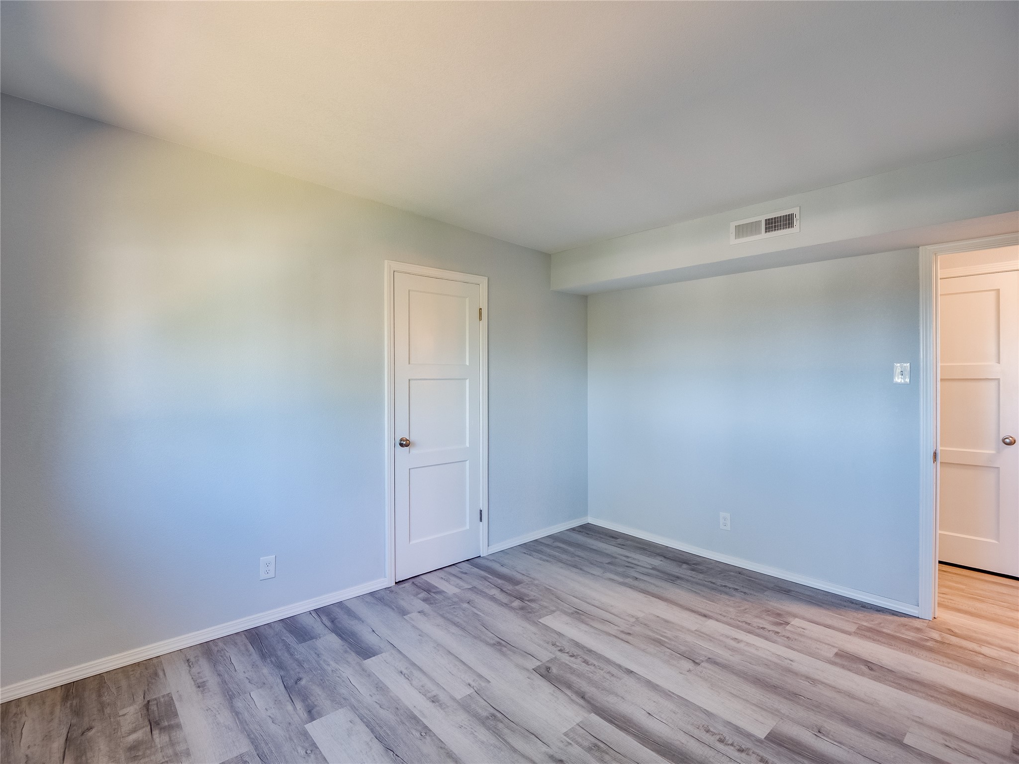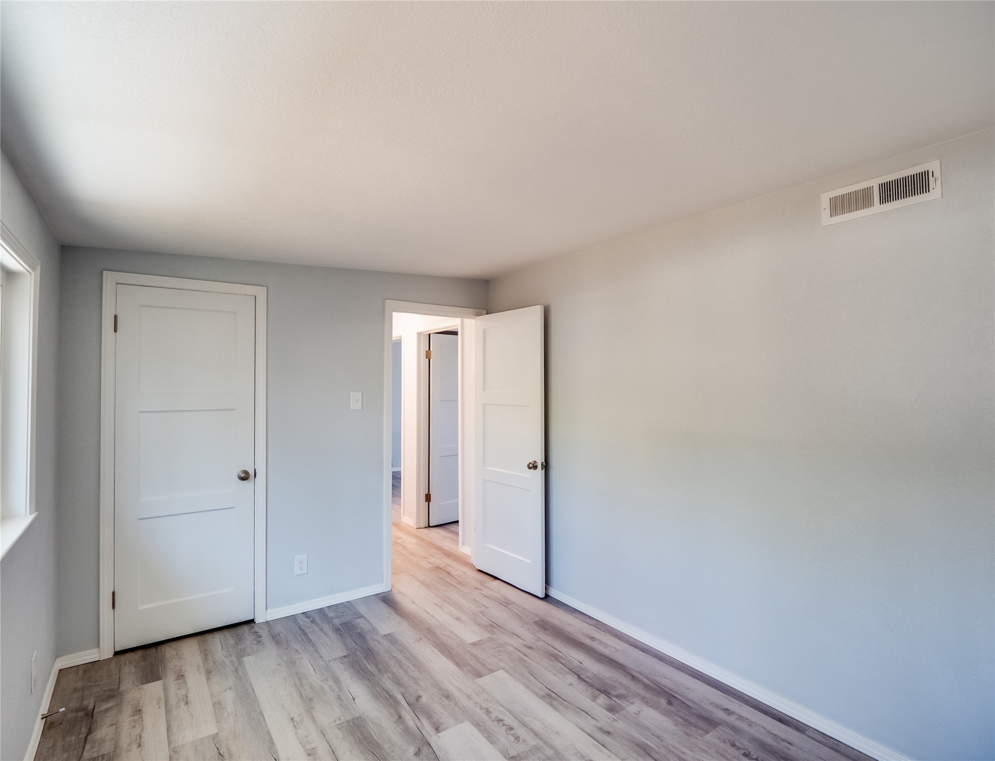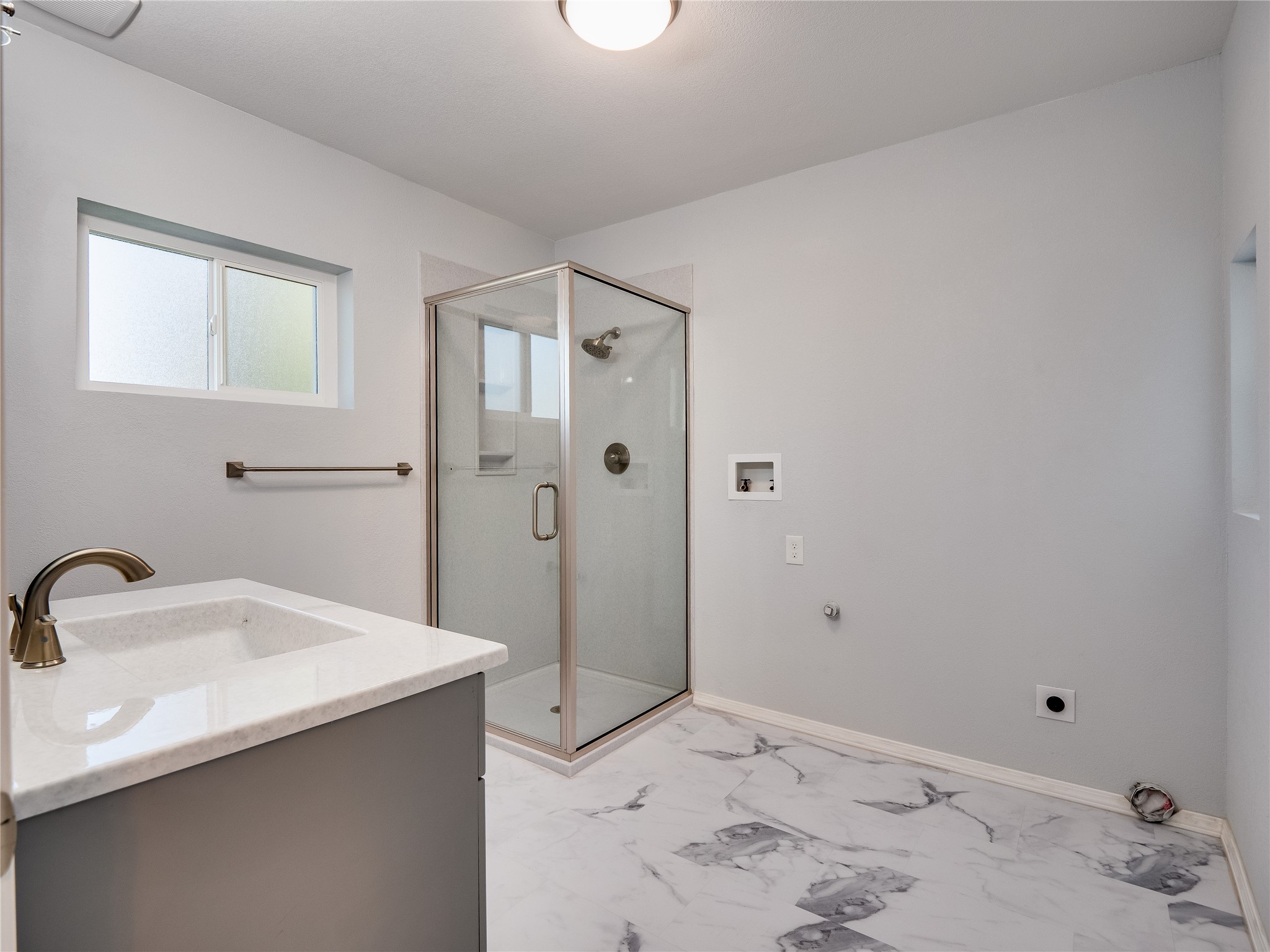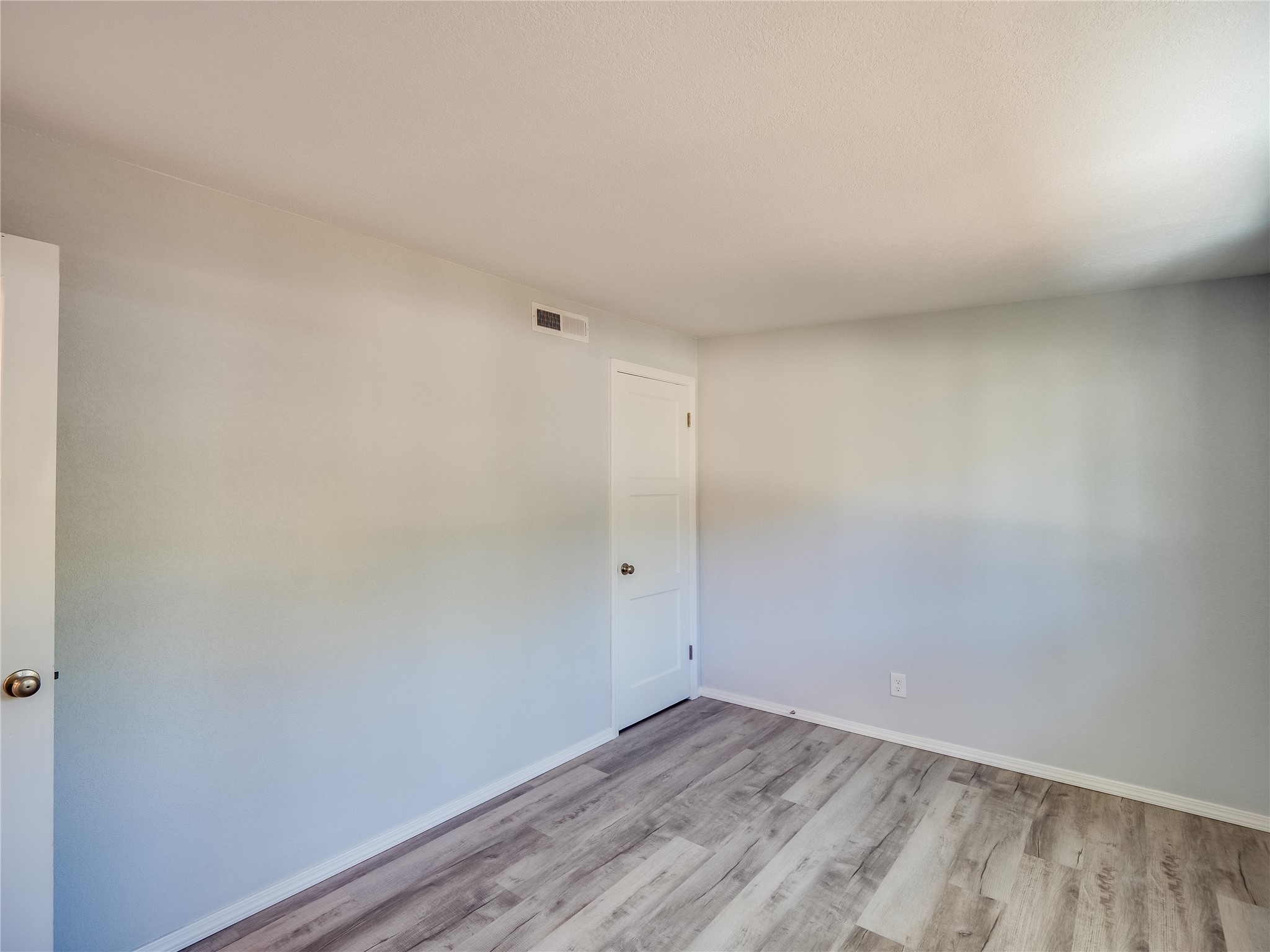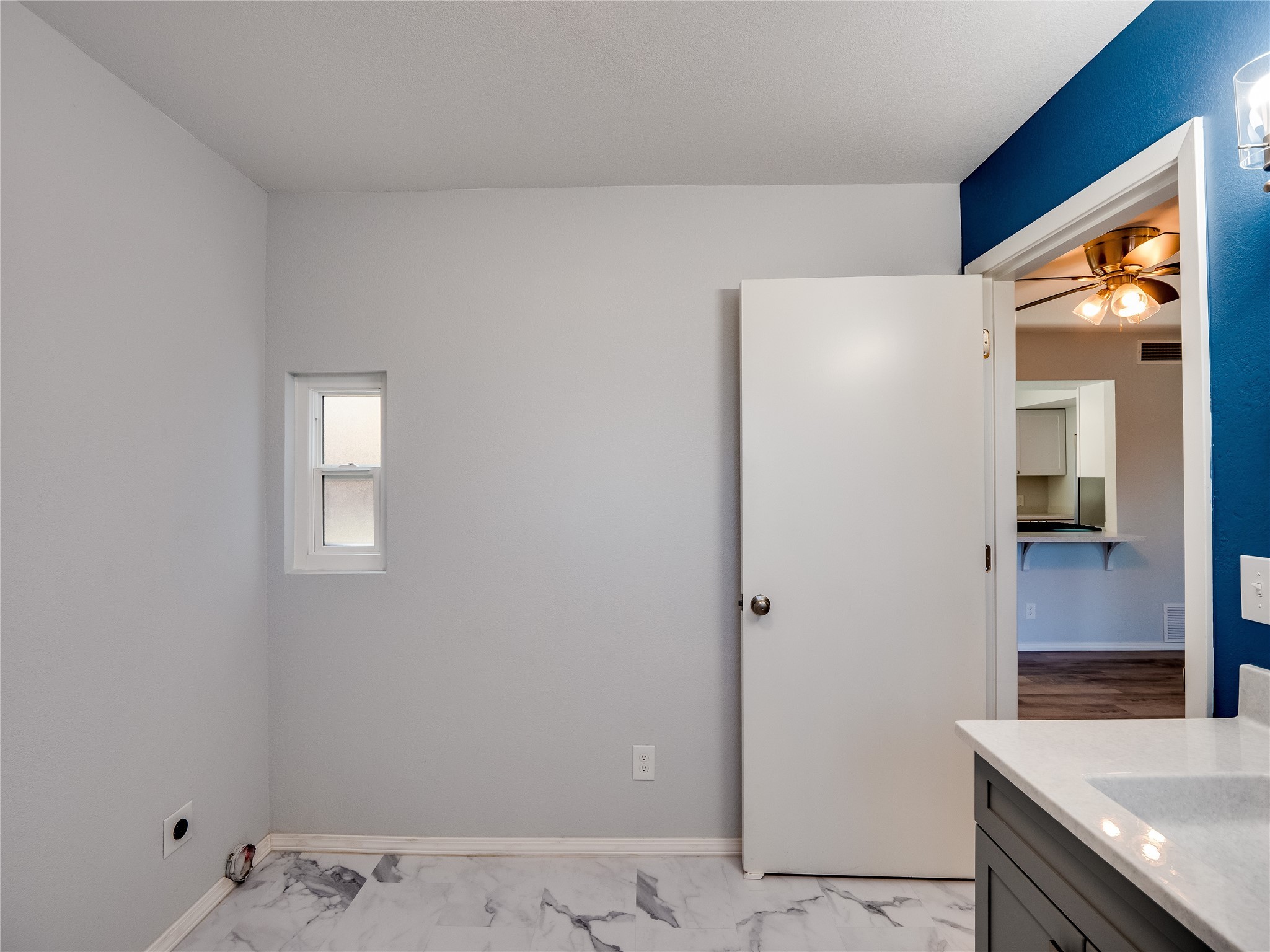 This beautifully renovated modern two-story home is located in the desirable N Community neighborhood, just seconds from Urban Park, schools, and scenic trails. Dedicated parking spots at street level provide convenient access before you head down the stairs into the inviting front yard surrounded by mature trees and lush green grass. The freshly painted blue exterior gives this home a cheerful curb appeal that welcomes you in. Step inside to find brand-new flooring flowing throughout the home and a bright, open concept living and dining space designed for both comfort and entertaining. The spacious living room features an added bonus area perfect as a sunroom, reading nook, or creative workspace. French doors open to a large composite deck ideal for BBQs, outdoor dining, or relaxing under the stars, all encased by a grass lawn and mature trees that create a sense of privacy and tranquility. The completely renovated kitchen is a showstopper, featuring crisp white shaker cabinets with chrome hardware, quartz countertops, and stainless steel appliances. A peninsula with a built-in stove/oven doubles as bar seating, while an adjacent breakfast nook provides the perfect spot to enjoy your morning coffee. Nearby, you'll find convenient exterior storage closets and off the living room there's a stylish guest bathroom with a walk-in shower with glass enclosure, a modern single-sink vanity, and laundry hookups. Upstairs, the home offers three comfortable bedrooms, including two guest rooms, one with double closets and a spacious primary bedroom with a walk-in closet. The shared full bathroom has been tastefully updated with a single-sink vanity, sleek fixtures, and a tiled shower/tub combo. Move-in ready and thoughtfully upgraded throughout, this home blends modern finishes with a warm, inviting atmosphere. Come see this beautiful home today!