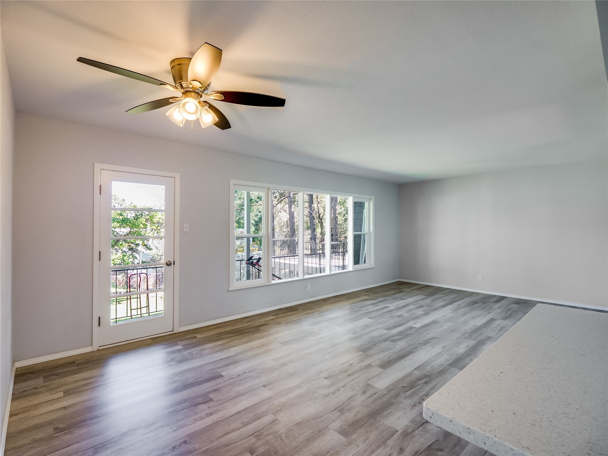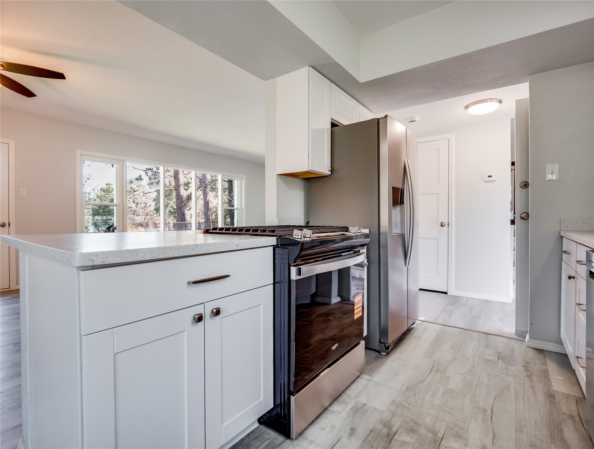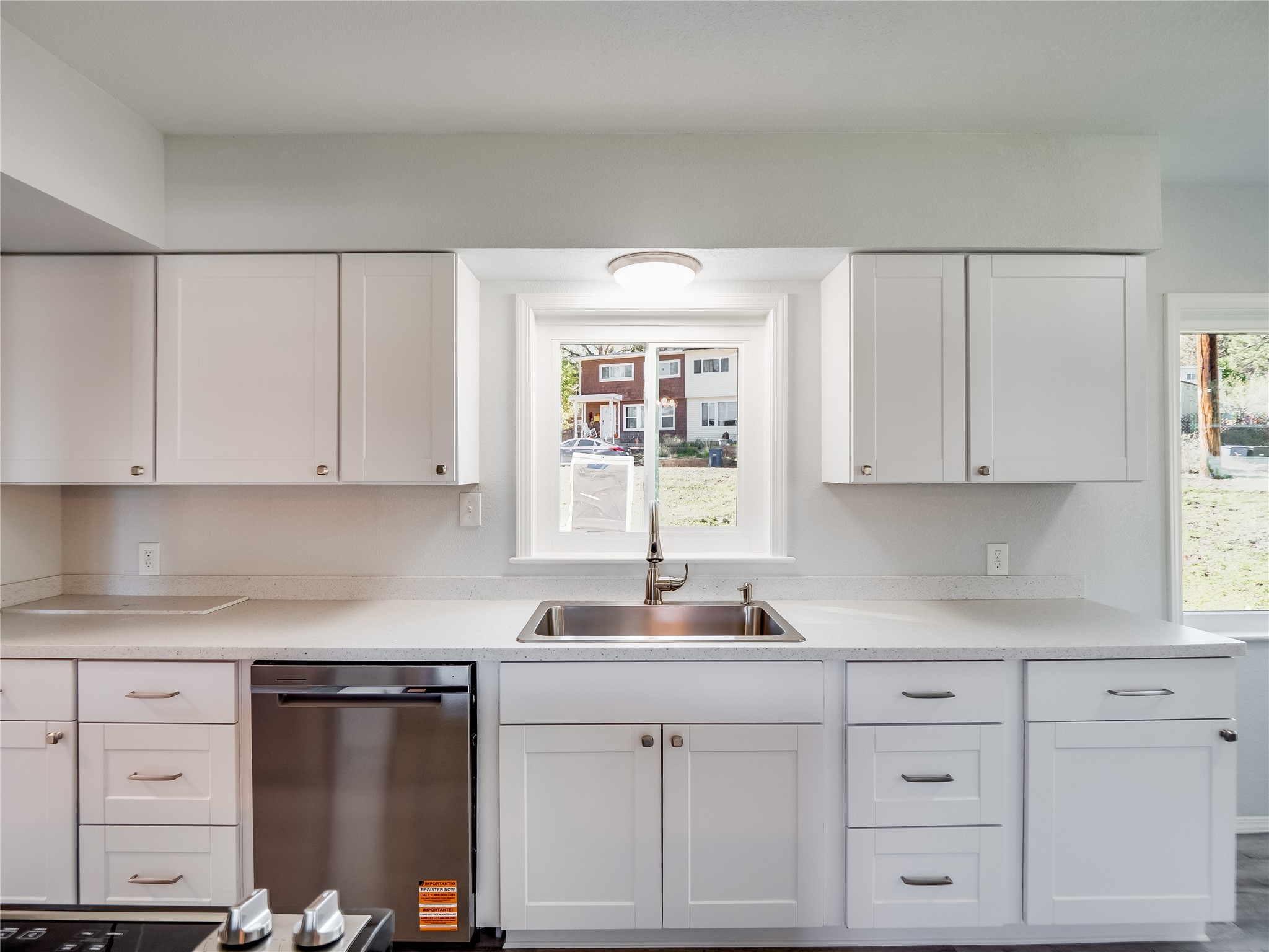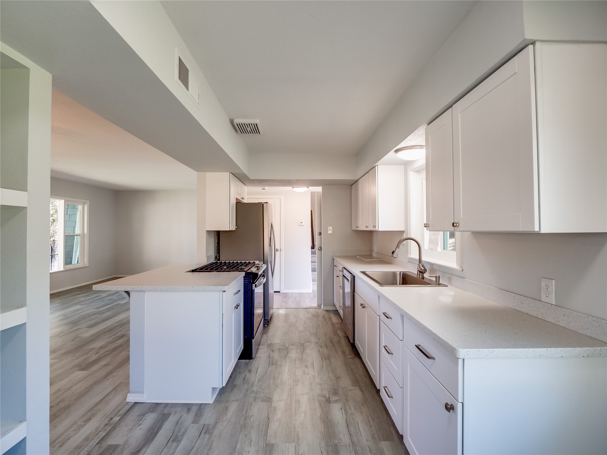 Welcome to this beautifully renovated two-story modern home in the sought-after N community, just seconds from Urban Park. This residence offers exceptional curb appeal with a large front yard, mature trees, lush grass, and a pleasing blue exterior paint finish that stands out with timeless style. Inside, you'll find a completely refreshed interior where everything is new and pristine. New flooring throughout gives the home a cohesive, modern look. The spacious open concept living and dining area is filled with natural light thanks to a wall of windows and direct access to the covered porch and backyard, perfect for entertaining or enjoying quiet evenings outdoors. The brand-new kitchen is a showpiece, boasting white shaker cabinets, chrome hardware, quartz countertops, stainless steel appliances, and a peninsula with a stove/oven that doubles as bar seating. Adjacent to the kitchen, a cozy nook provides access to the backyard and two exterior storage closets, one conveniently equipped with washer/dryer hookups. Upstairs, you'll find two comfortable guest bedrooms, one with a double closet and a primary bedroom featuring a walk-in closet. All bedrooms share a fully renovated bathroom with tile flooring, modern fixtures, a single sink vanity, and a tub/shower combo. The expansive backyard offers a blank canvas ready to be transformed into your dream outdoor retreat, ideal for entertaining, gardening, or play. The property also includes dedicated parking spaces, adding everyday convenience and peace of mind. Located near schools, parks, and scenic trails, this home is perfect for those who love modern living with easy access to the outdoors. Take a tour today and discover all the thoughtful updates and fresh finishes this beautiful home has to offer!