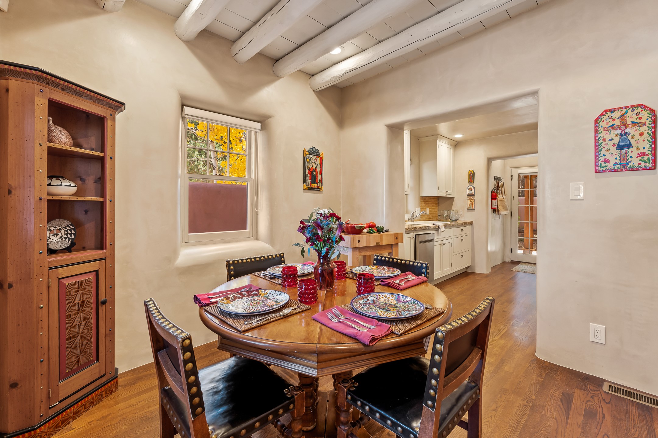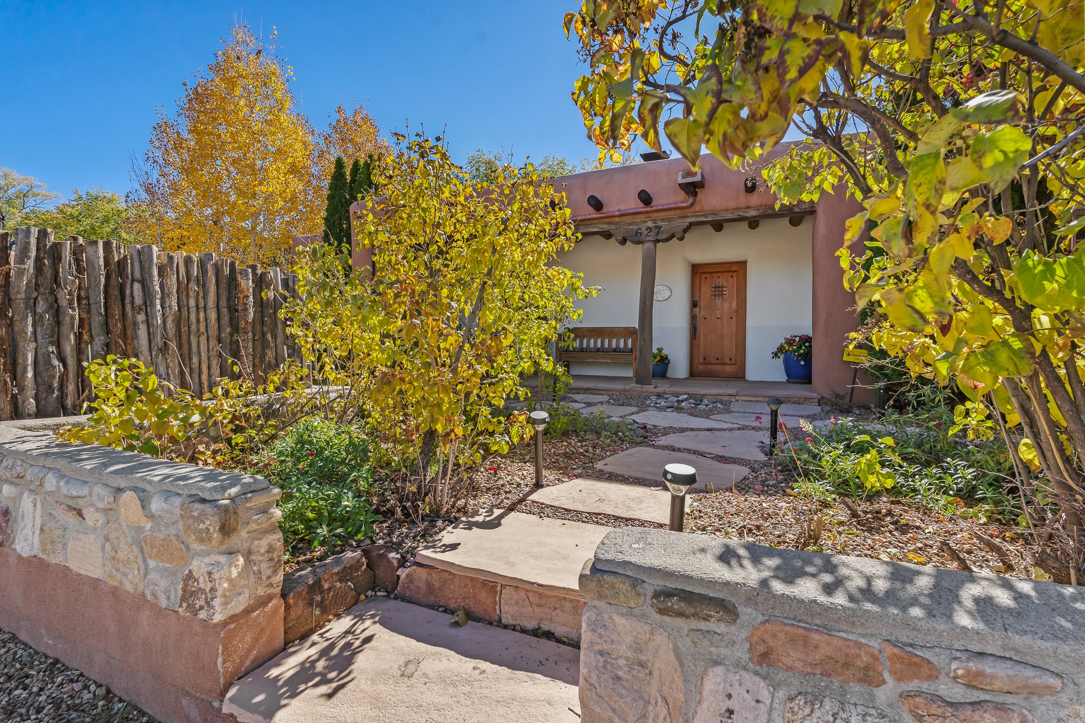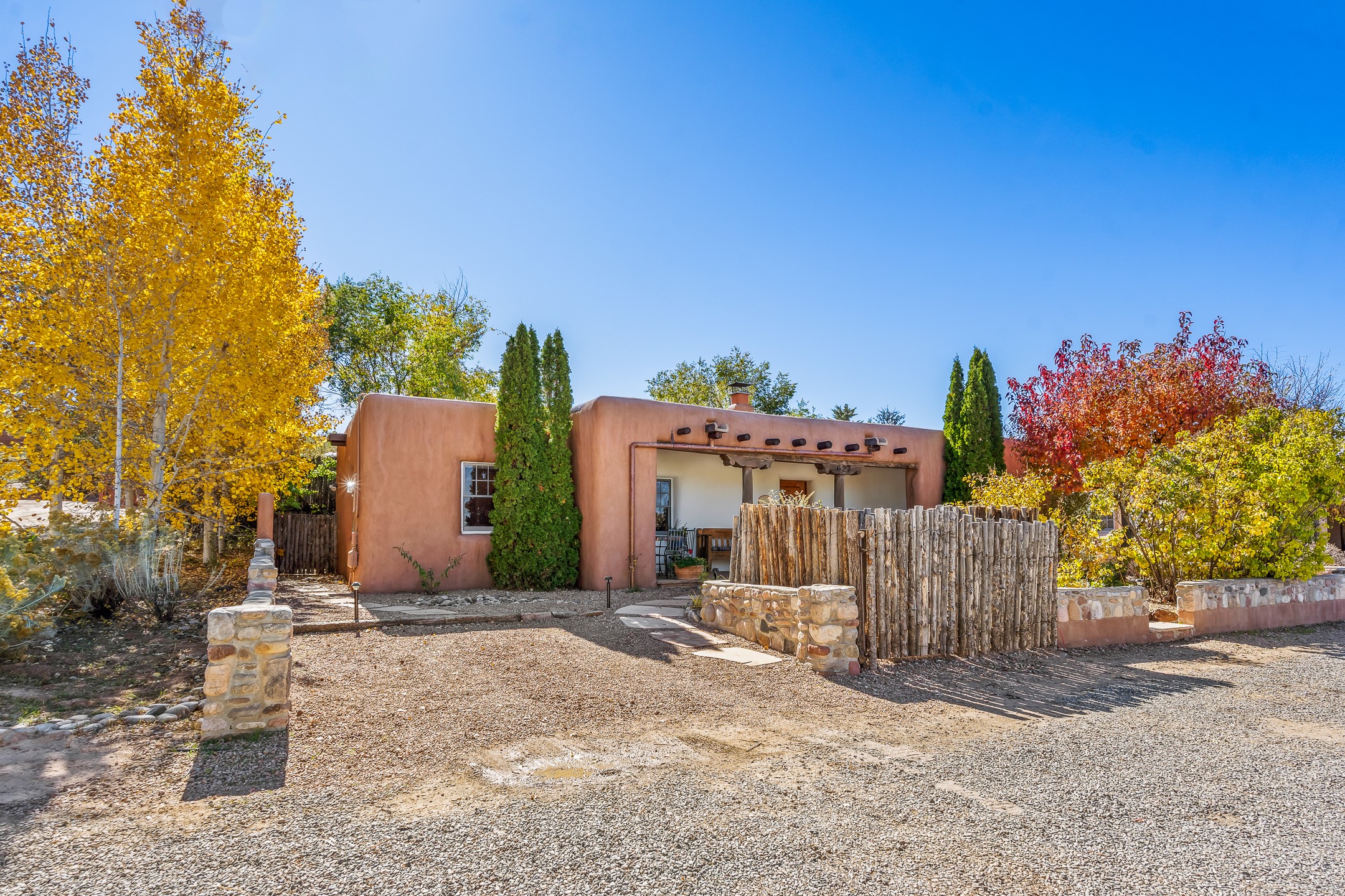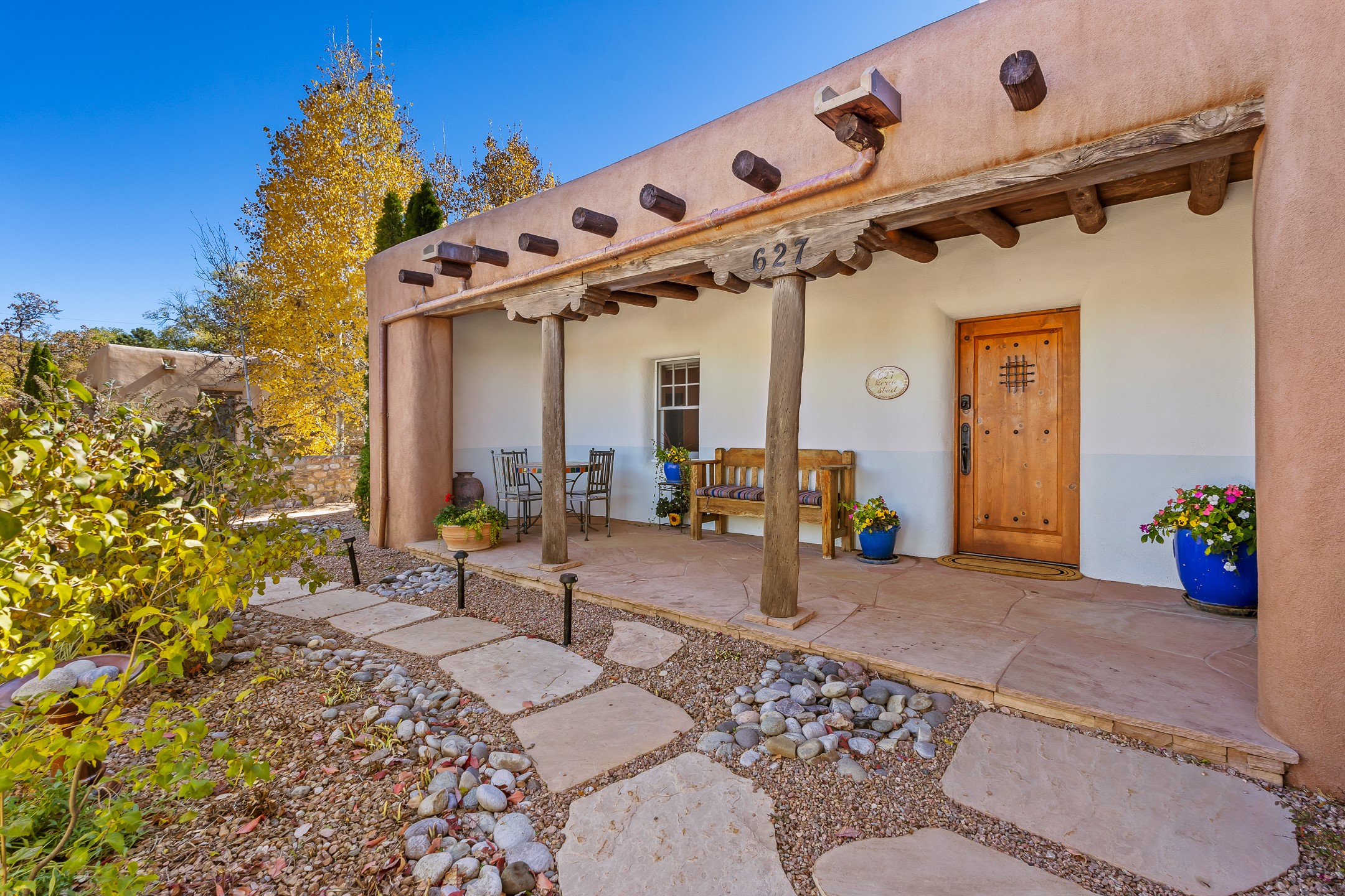 Classic Eastside adobe pied--terre that exemplifies the timeless beauty and investment value of Santa Fe real estate. Set down a quiet private lane off Garcia Street, the home offers an ideal combination of historic Pueblo-style architecture, privacy, and exceptional short-term rental performance. Built in 1937, the home features thick adobe walls, exposed vigas, plaster ceilings, and hardwood floors, creating a warm and authentic interior. The living room centers around a traditional kiva fireplace, with an open flow to the dining area and updated kitchen. Two shaded portals provide elegant outdoor living, while the primary suite opens to a private patio with hot tub. The property is surrounded by drought-tolerant, low-maintenance landscaping, creating a serene environment that enhances both livability and curb appeal. In addition to +/-1,500 square feet of heated living space, a 413-square-foot basement offers rare and valuable storage. Notably, 627 Garcia has an impressive rental history, generating net rental income of approximately $100,000 in 2023, $93,000 in 2024, and $65,000 year-to-date in 2025 (as of October). This proven performance makes the home a turnkey opportunity for buyers seeking a lifestyle investment. Located just minutes from Canyon Road, Museum Hill, and the historic Plaza, this property is perfectly positioned to enjoy the very best of Santa Fe's culture, art, and natural beauty.