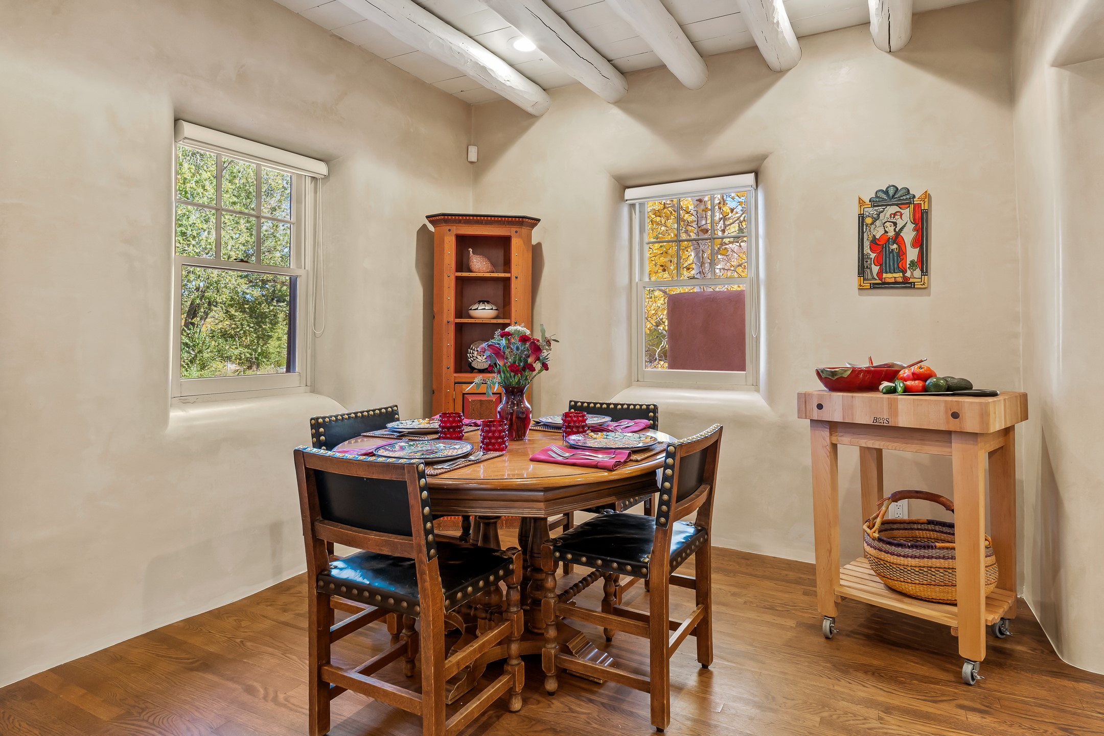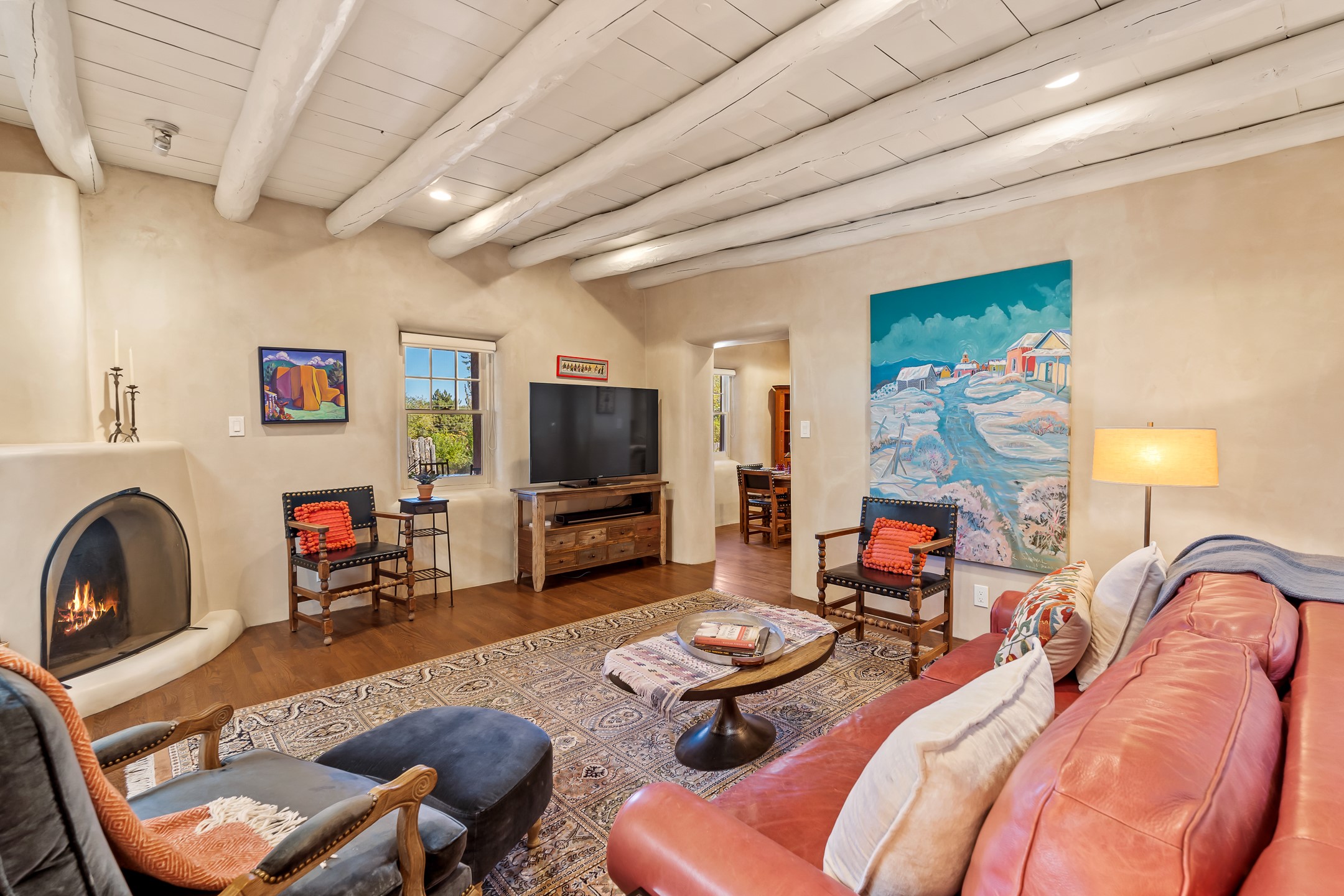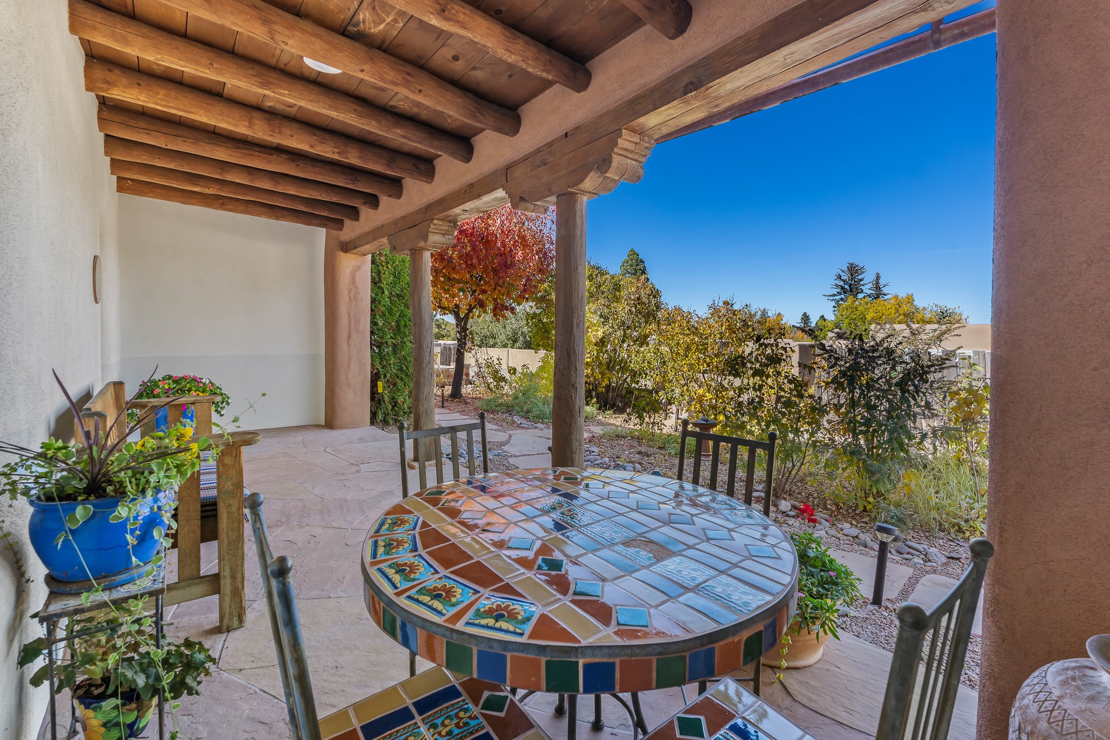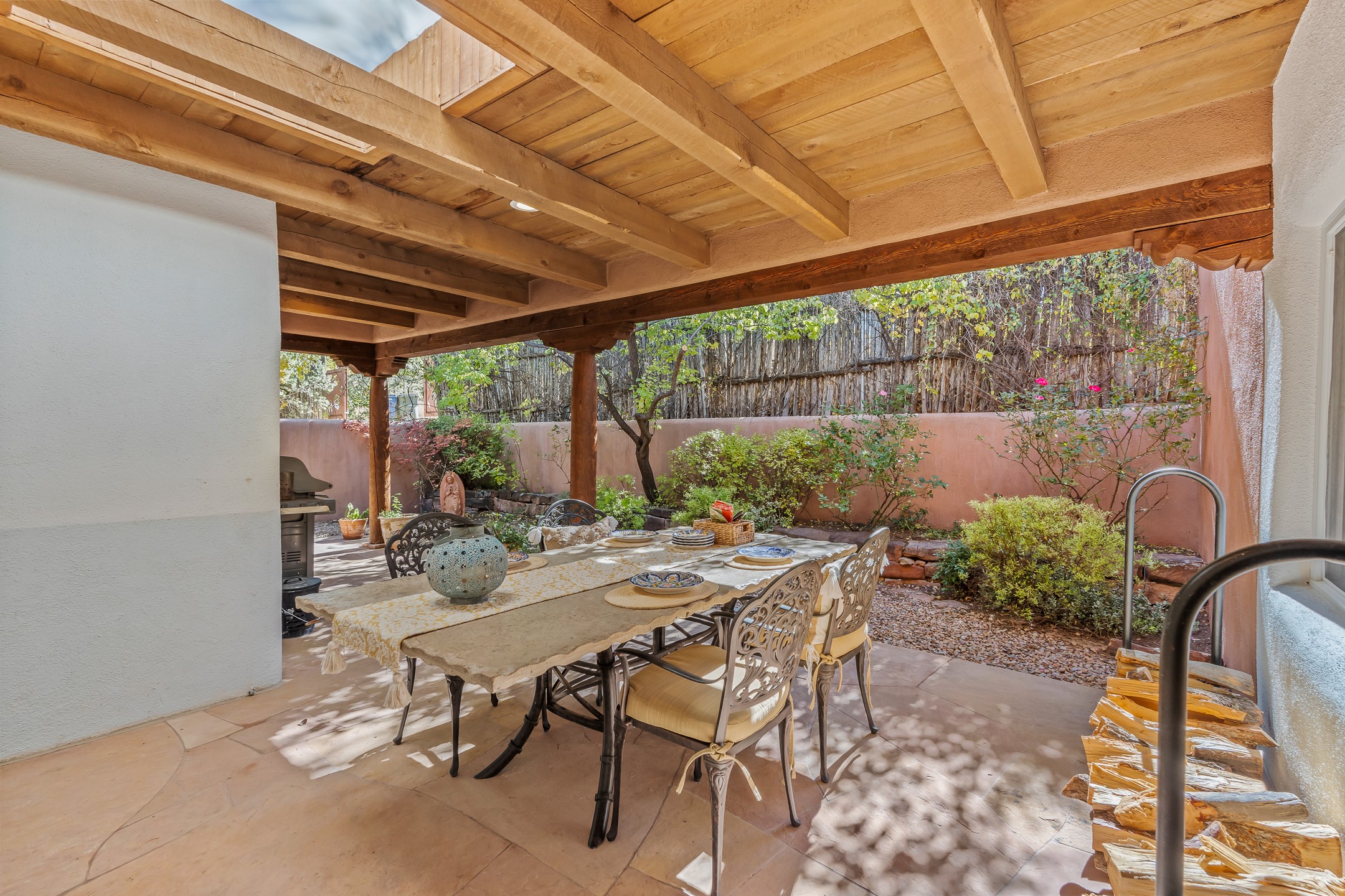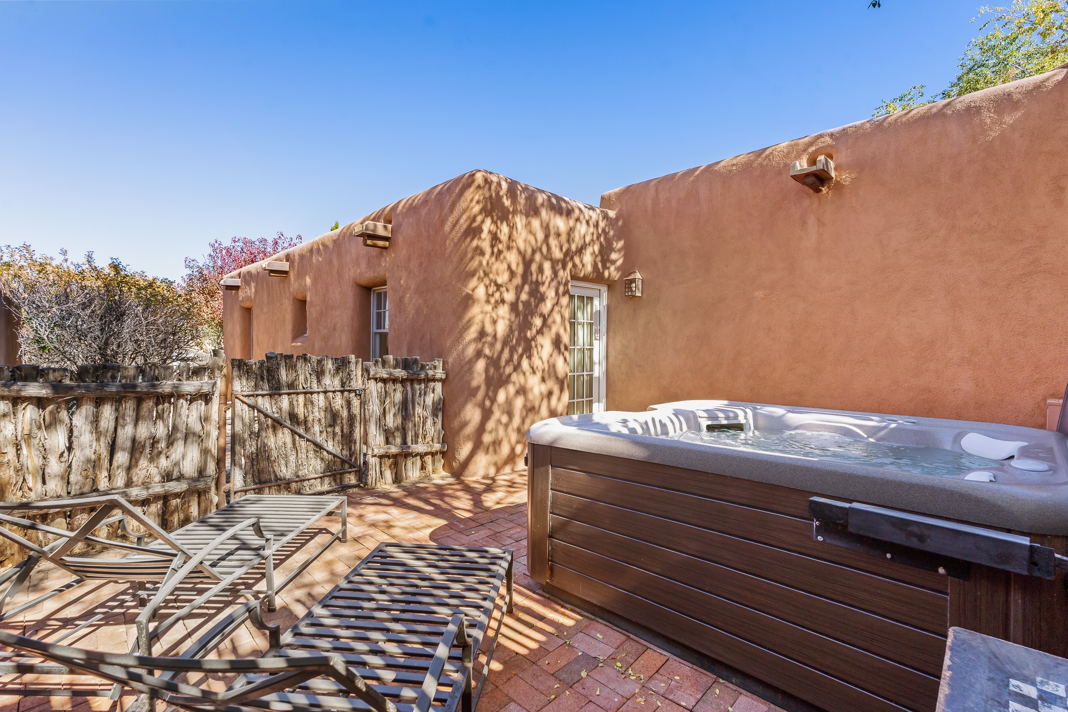 Classic Eastside adobe pied--terre that exemplifies the timeless beauty and investment value of Santa Fe real estate. Set down a quiet private lane off Garcia Street, the home offers an ideal combination of historic Pueblo-style architecture, privacy, and exceptional short-term rental performance. Built in 1937, the home features thick adobe walls, exposed vigas, plaster ceilings, and hardwood floors, creating a warm and authentic interior. The living room centers around a traditional kiva fireplace, with an open flow to the dining area and updated kitchen. Two shaded portals provide elegant outdoor living, while the primary suite opens to a private patio with hot tub. The property is surrounded by drought-tolerant, low-maintenance landscaping, creating a serene environment that enhances both livability and curb appeal. In addition to +/-1,500 square feet of heated living space, a 413-square-foot basement offers rare and valuable storage. Notably, 627 Garcia has an impressive rental history, generating net rental income of approximately $100,000 in 2023, $93,000 in 2024, and $65,000 year-to-date in 2025 (as of October). This proven performance makes the home a turnkey opportunity for buyers seeking a lifestyle investment. Located just minutes from Canyon Road, Museum Hill, and the historic Plaza, this property is perfectly positioned to enjoy the very best of Santa Fe's culture, art, and natural beauty.