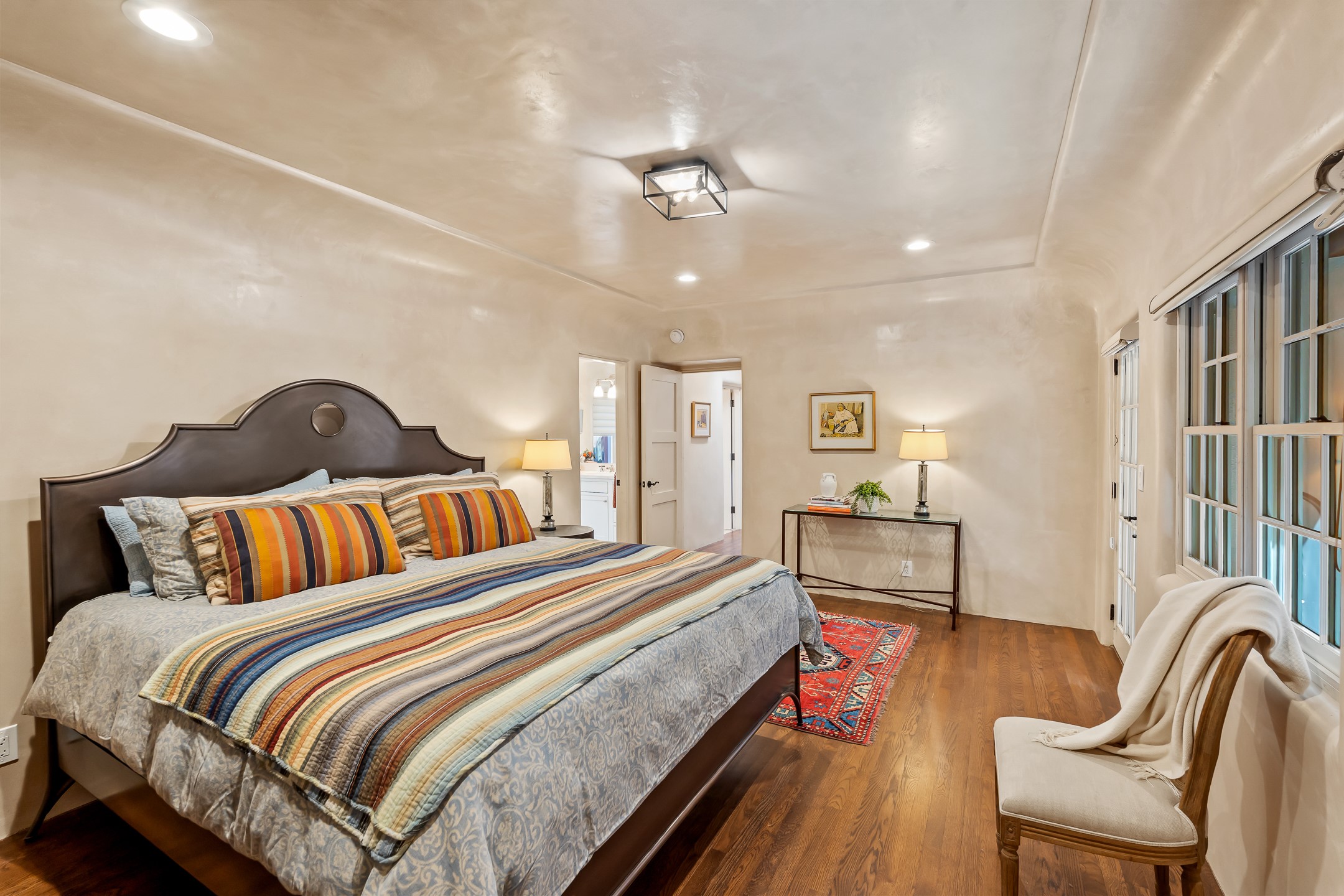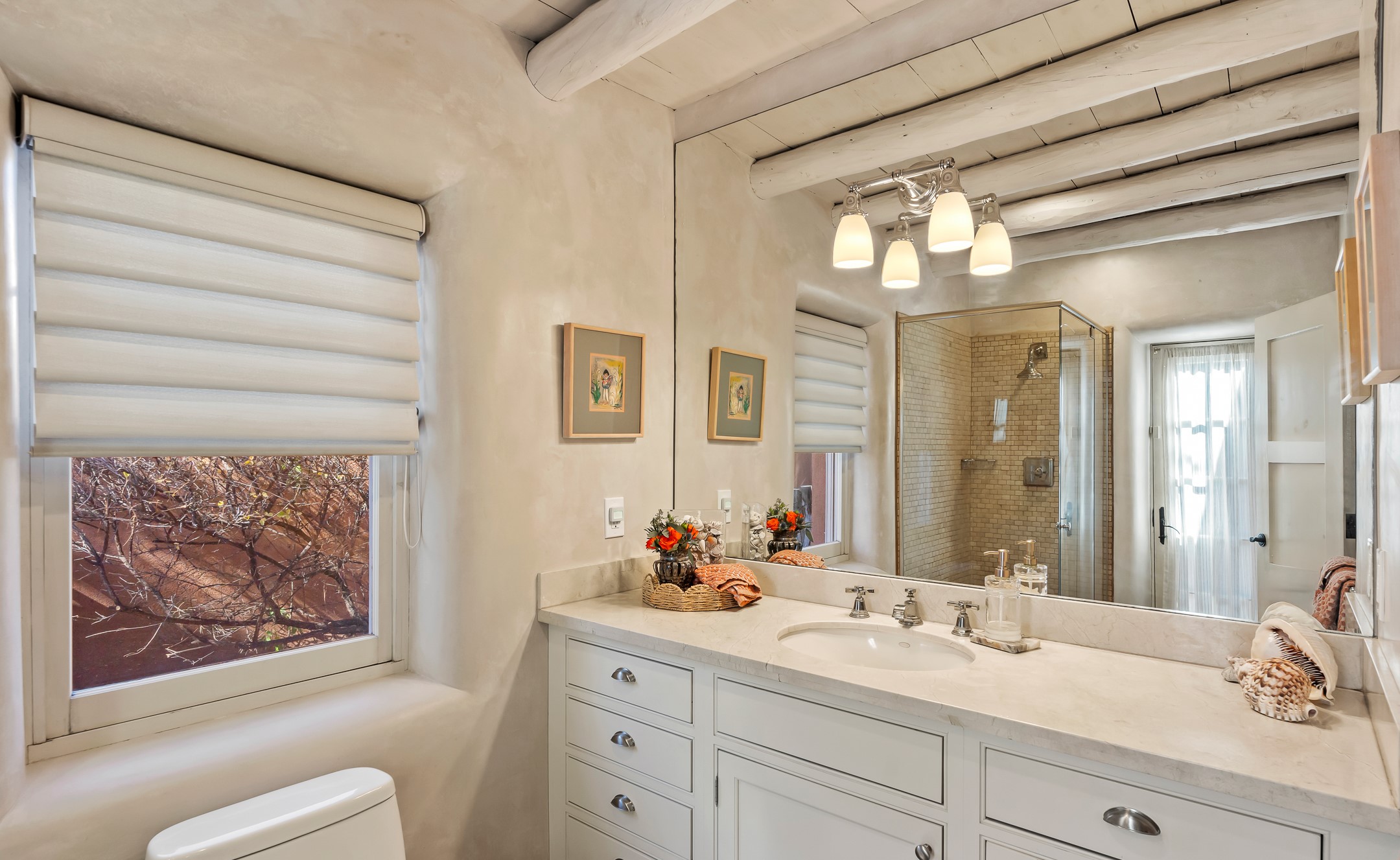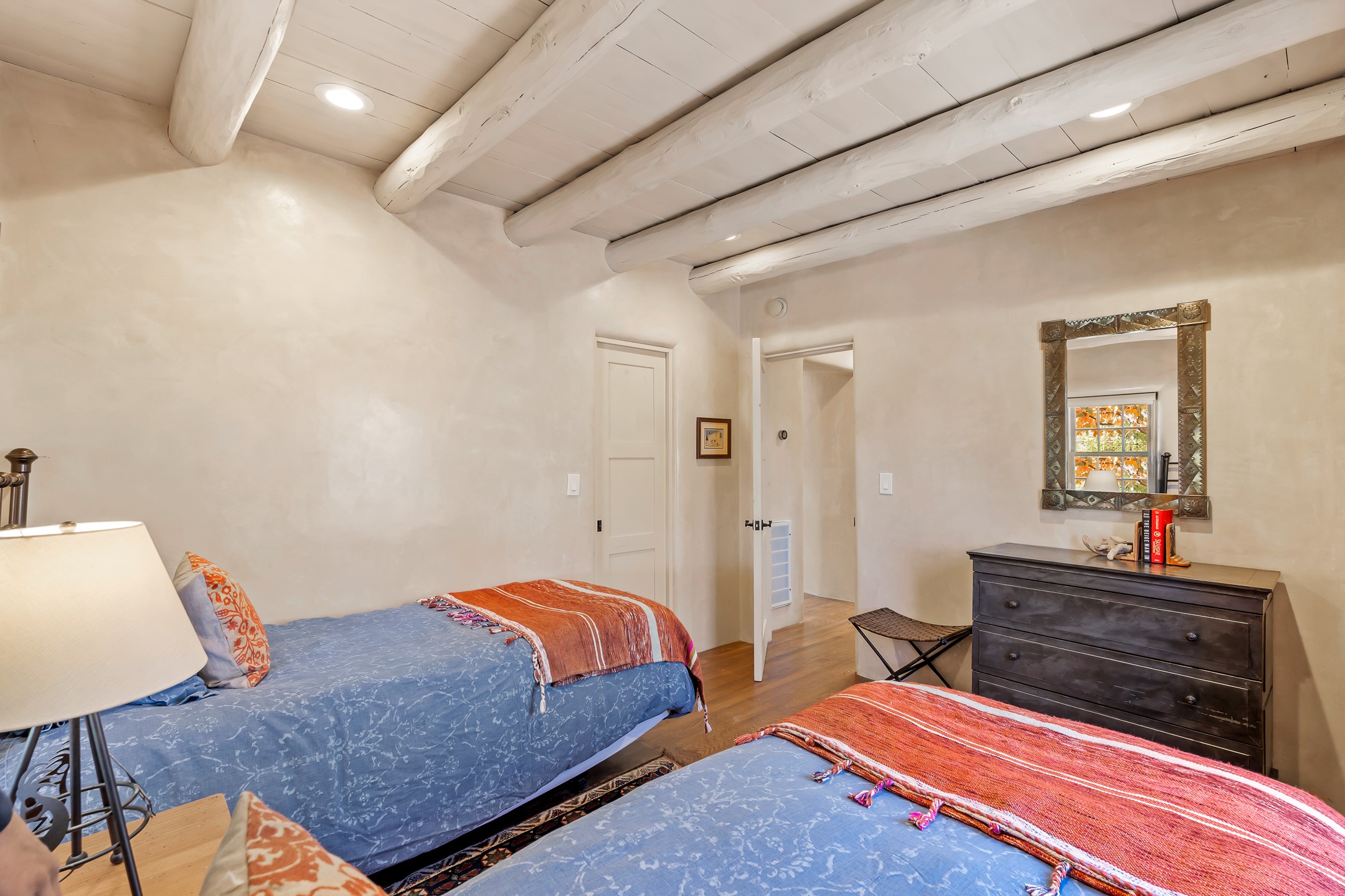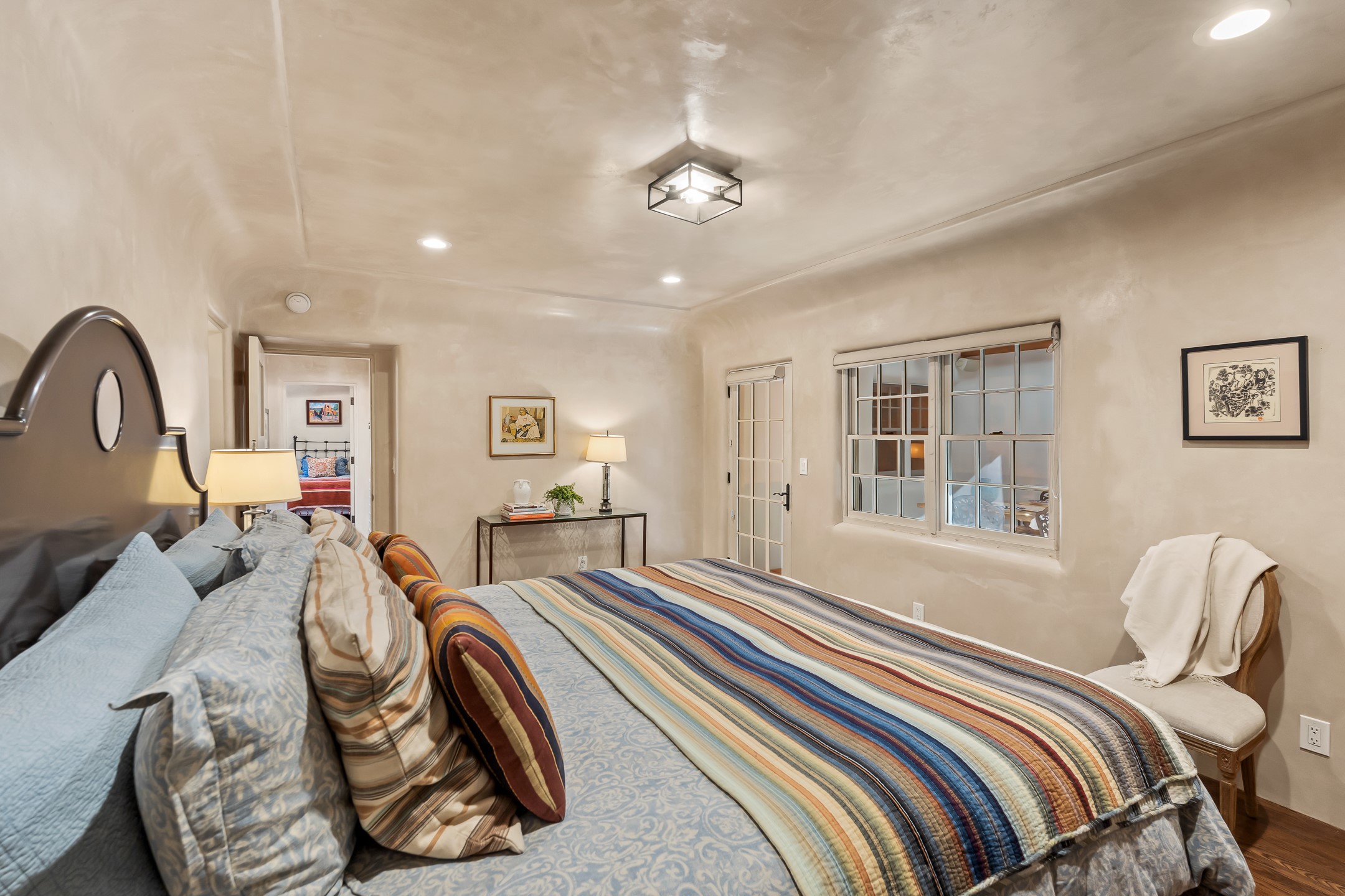 Classic Eastside adobe pied--terre that exemplifies the timeless beauty and investment value of Santa Fe real estate. Set down a quiet private lane off Garcia Street, the home offers an ideal combination of historic Pueblo-style architecture, privacy, and exceptional short-term rental performance. Built in 1937, the home features thick adobe walls, exposed vigas, plaster ceilings, and hardwood floors, creating a warm and authentic interior. The living room centers around a traditional kiva fireplace, with an open flow to the dining area and updated kitchen. Two shaded portals provide elegant outdoor living, while the primary suite opens to a private patio with hot tub. The property is surrounded by drought-tolerant, low-maintenance landscaping, creating a serene environment that enhances both livability and curb appeal. In addition to +/-1,500 square feet of heated living space, a 413-square-foot basement offers rare and valuable storage. Notably, 627 Garcia has an impressive rental history, generating net rental income of approximately $100,000 in 2023, $93,000 in 2024, and $65,000 year-to-date in 2025 (as of October). This proven performance makes the home a turnkey opportunity for buyers seeking a lifestyle investment. Located just minutes from Canyon Road, Museum Hill, and the historic Plaza, this property is perfectly positioned to enjoy the very best of Santa Fe's culture, art, and natural beauty.