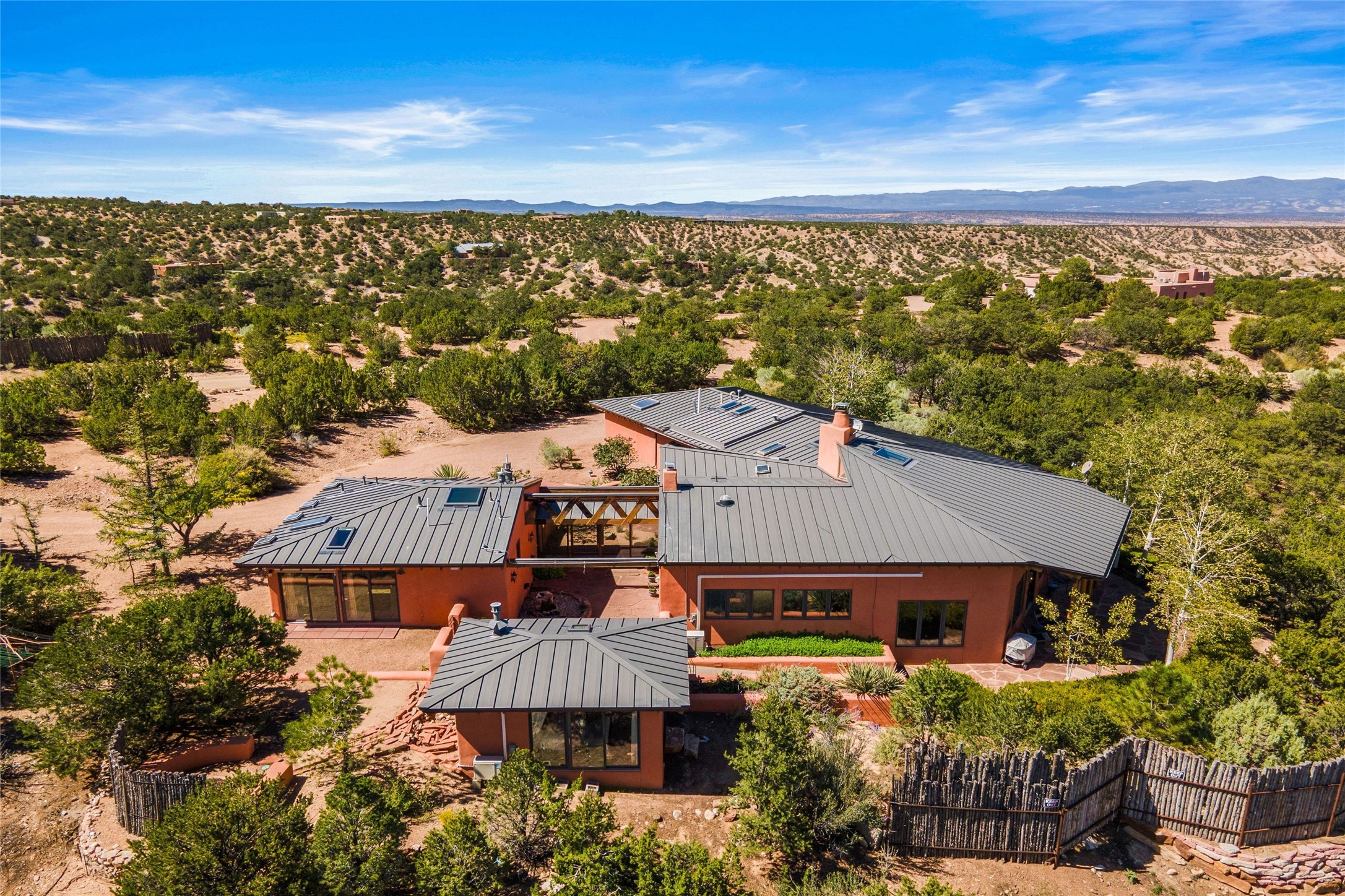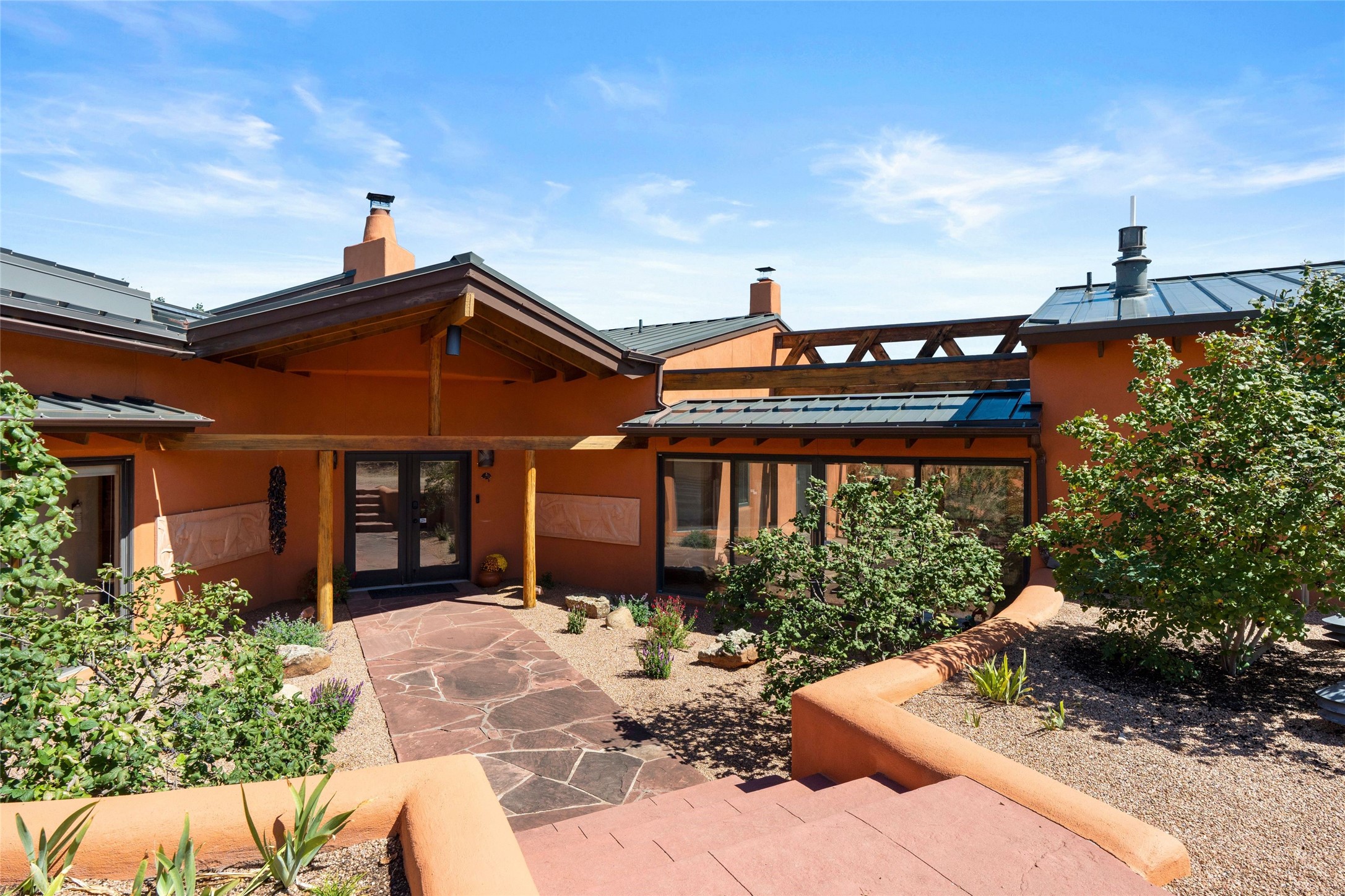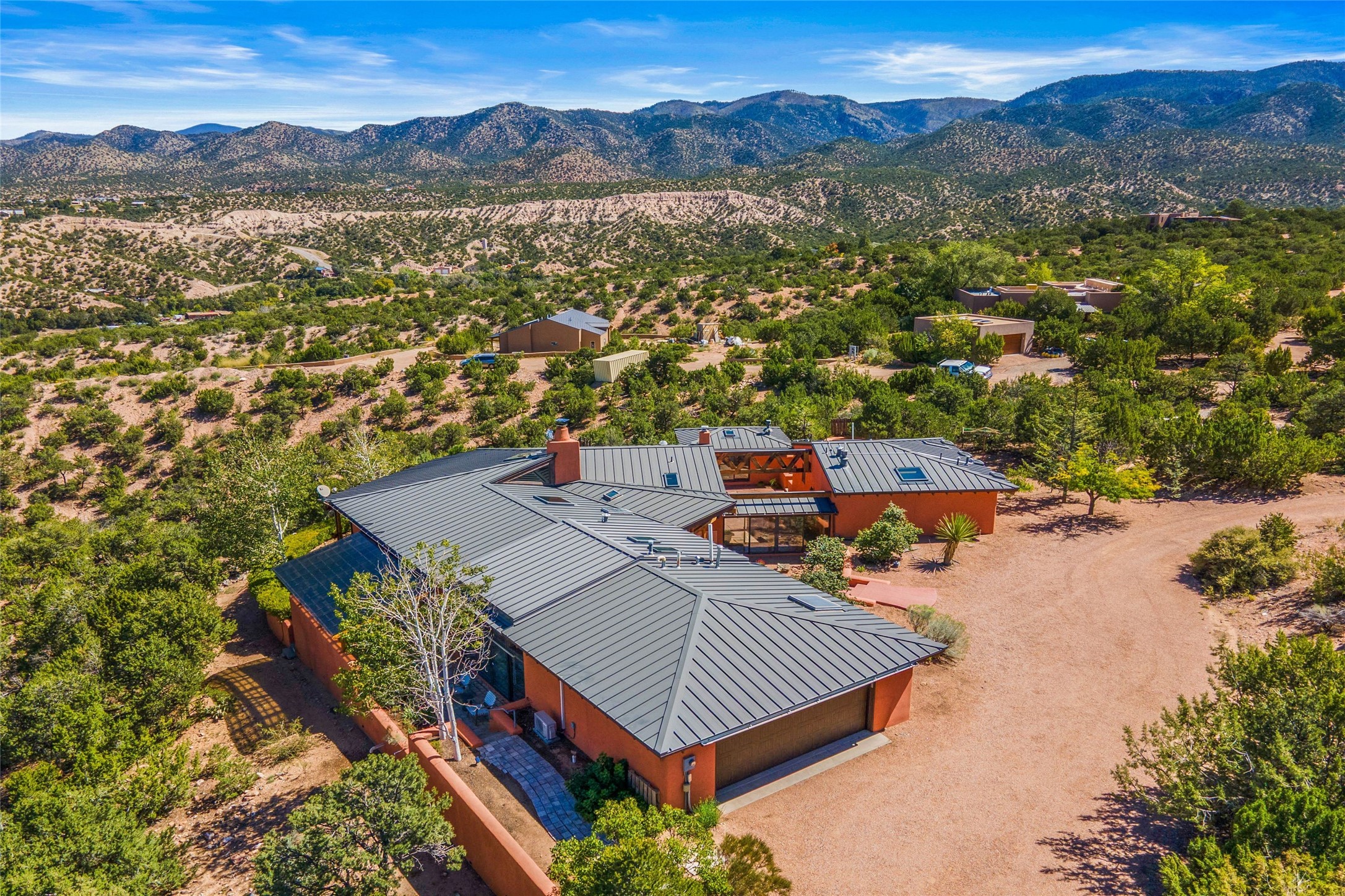 Stunning 3-bedroom, 3.5-bath home in Vista Redonda professionally sited on 5 ridge-top acres of pion trees and breathtaking views of the Sangre de Cristo and Jemez Mountains. Constructed by renowned builder Dennis Sayer, this residence showcases exceptional workmanship and reflective design. The pitched roof and soaring beamed ceilings create an airy, inviting atmosphere, while the hard plaster walls and polished Saltillo tiles add timeless elegance. Upon entering, you'll find a spacious great room that flows into a dining area and a well-appointed eat-in kitchen. The office, complete with built-in desk and bookcases, provides a quiet retreat, while the kiva fireplace adds warmth and character to the space. The home features two en-suite bedrooms in each wing, ensuring privacy and comfort for guests.. In addition, there is a detached 196 sq. ft. studio/casita. Multiple outdoor areas invite you to enjoy al fresco dining and entertaining, including a delightful sunrise breakfast patio where you can soak in the morning sun with a cup of coffee. Natural light floods the home through plentiful skylights, windows, and glass doors, begetting a bright and welcoming environment. Additional highlights include a heated 2-car garage and newer boiler and water heaters. Just south of Vista Redonda is the Village of Tesuque, its neighborhood gathering spot Tesuque Village Market and the contemporary restaurant and bar, El Nido. Easy access to The Santa Fe Opera and downtown Santa Fe.