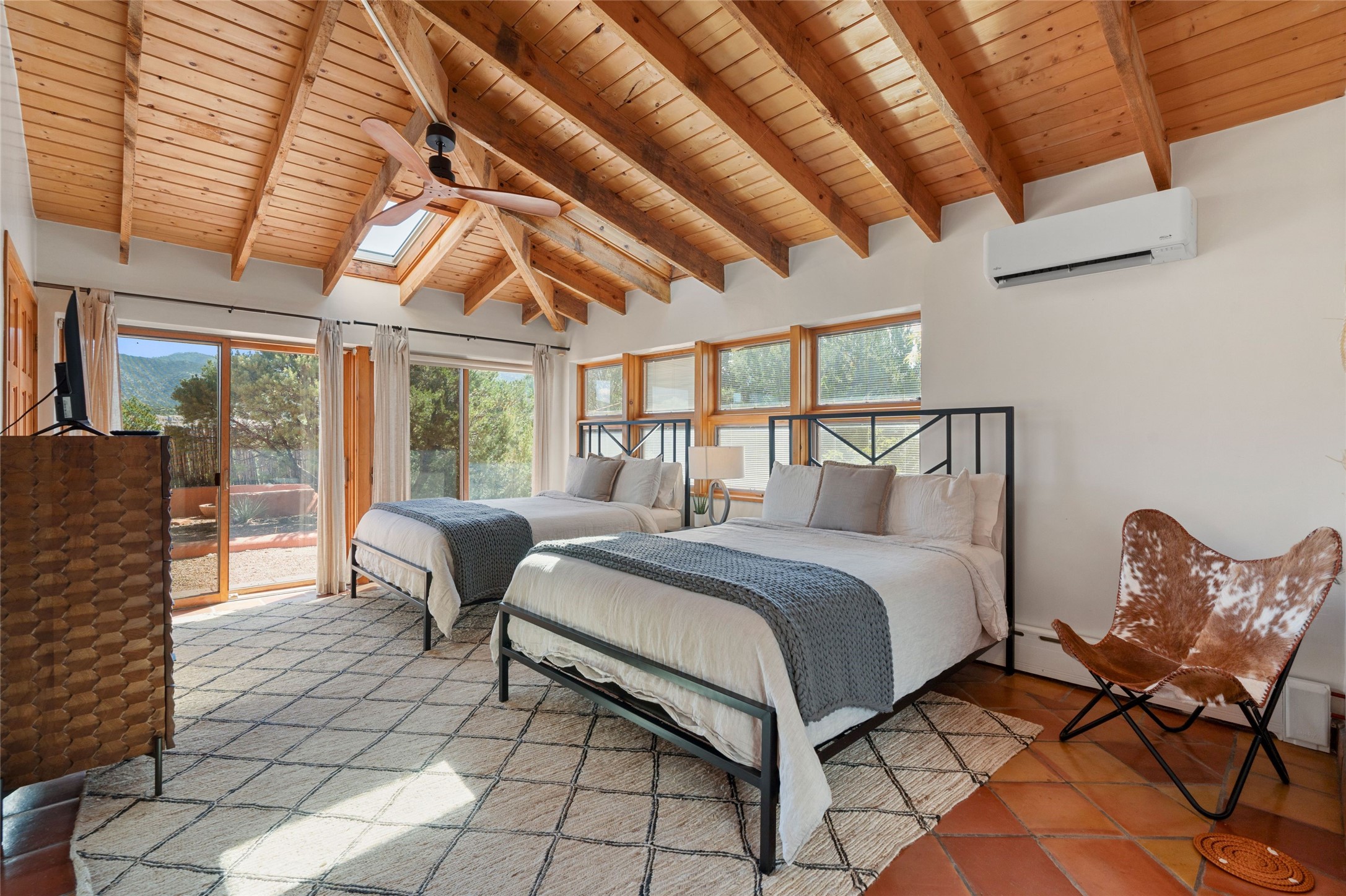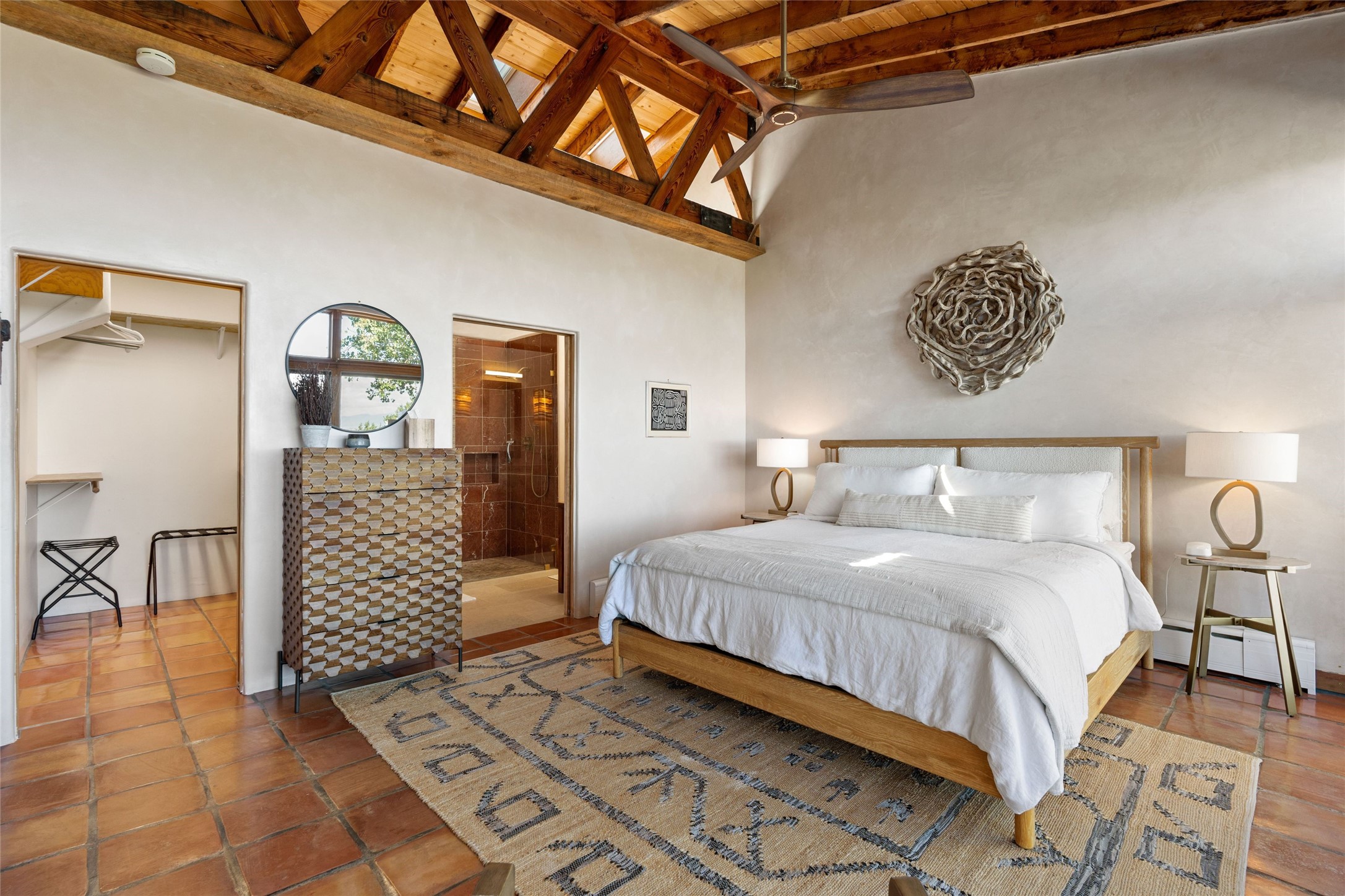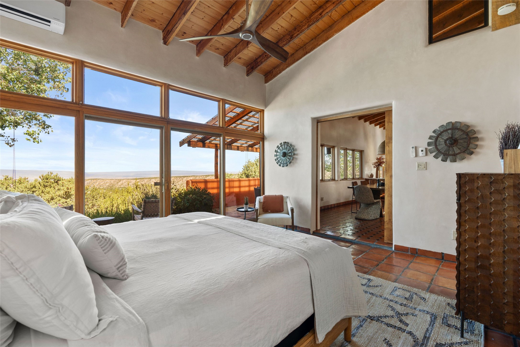 Stunning 3-bedroom, 3.5-bath home in Vista Redonda professionally sited on 5 ridge-top acres of pion trees and breathtaking views of the Sangre de Cristo and Jemez Mountains. Constructed by renowned builder Dennis Sayer, this residence showcases exceptional workmanship and reflective design. The pitched roof and soaring beamed ceilings create an airy, inviting atmosphere, while the hard plaster walls and polished Saltillo tiles add timeless elegance. Upon entering, you'll find a spacious great room that flows into a dining area and a well-appointed eat-in kitchen. The office, complete with built-in desk and bookcases, provides a quiet retreat, while the kiva fireplace adds warmth and character to the space. The home features two en-suite bedrooms in each wing, ensuring privacy and comfort for guests.. In addition, there is a detached 196 sq. ft. studio/casita. Multiple outdoor areas invite you to enjoy al fresco dining and entertaining, including a delightful sunrise breakfast patio where you can soak in the morning sun with a cup of coffee. Natural light floods the home through plentiful skylights, windows, and glass doors, begetting a bright and welcoming environment. Additional highlights include a heated 2-car garage and newer boiler and water heaters. Just south of Vista Redonda is the Village of Tesuque, its neighborhood gathering spot Tesuque Village Market and the contemporary restaurant and bar, El Nido. Easy access to The Santa Fe Opera and downtown Santa Fe.