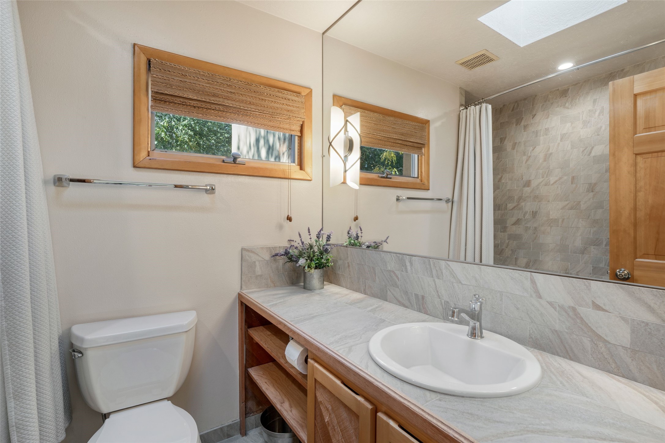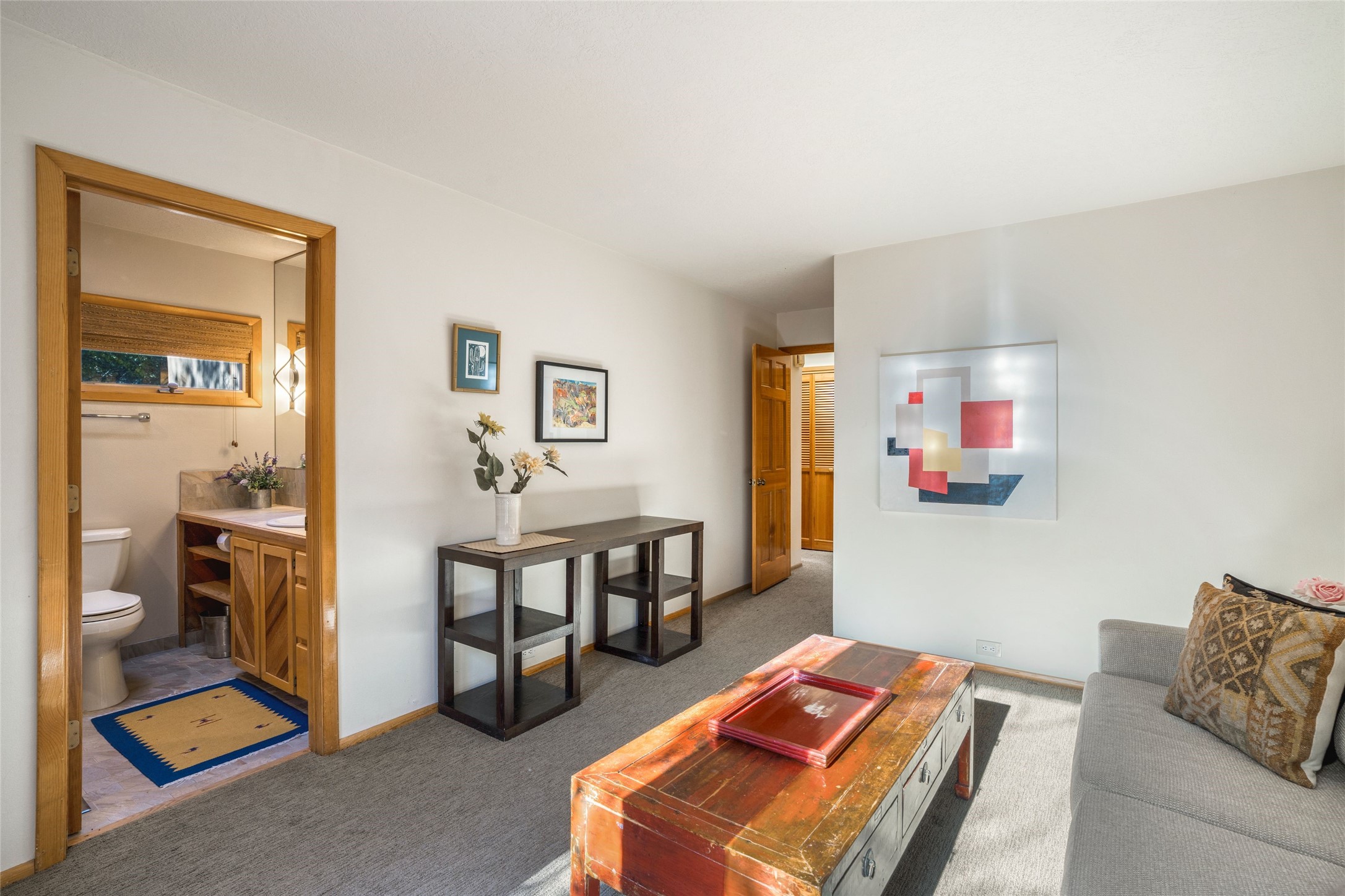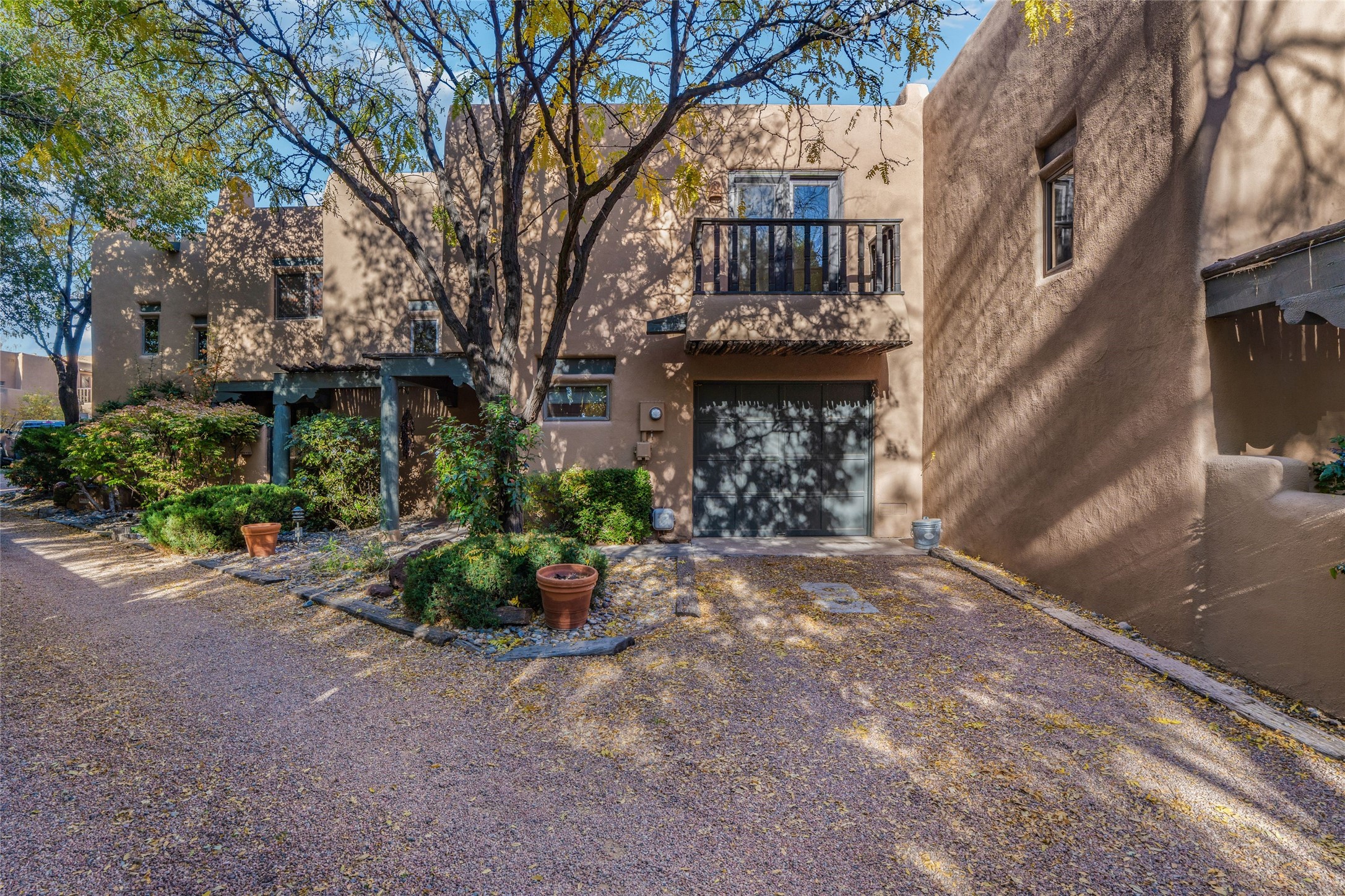 This pristine and recently updated two-story, 2 bedroom and 2-1/2 bathroom condo is located in a quiet neighborhood just a short walk to the downtown area, shopping, restaurants and the Plaza. The main floor has an open and airy flow from the galley kitchen with bar seating, to the warm and inviting living area detailed with vigas and latiillas, anchored by a tall gas-burning kiva fireplace creating a welcoming entertaining area. A private back patio off the kitchen is ideal for al fresco dining or additional entertaining space. Tile floors cascade downstairs while carpeted floors traverse the stairway to the upstairs bedrooms. Both bathrooms were upgraded with a cool, modern flair that creates a spa-like ambiance, one with a deep soaking tub. A one-car attached garage has direct access into the large laundry area with additional shelving for optimal storage. Additional gated off-street parking is nearby. The property is being offered fully furnished and is all about location with an open, modern and fresh feel - making it a wonderful investment opportunity, a home away from home, or primary residence in a convenient part of Santa Fe.