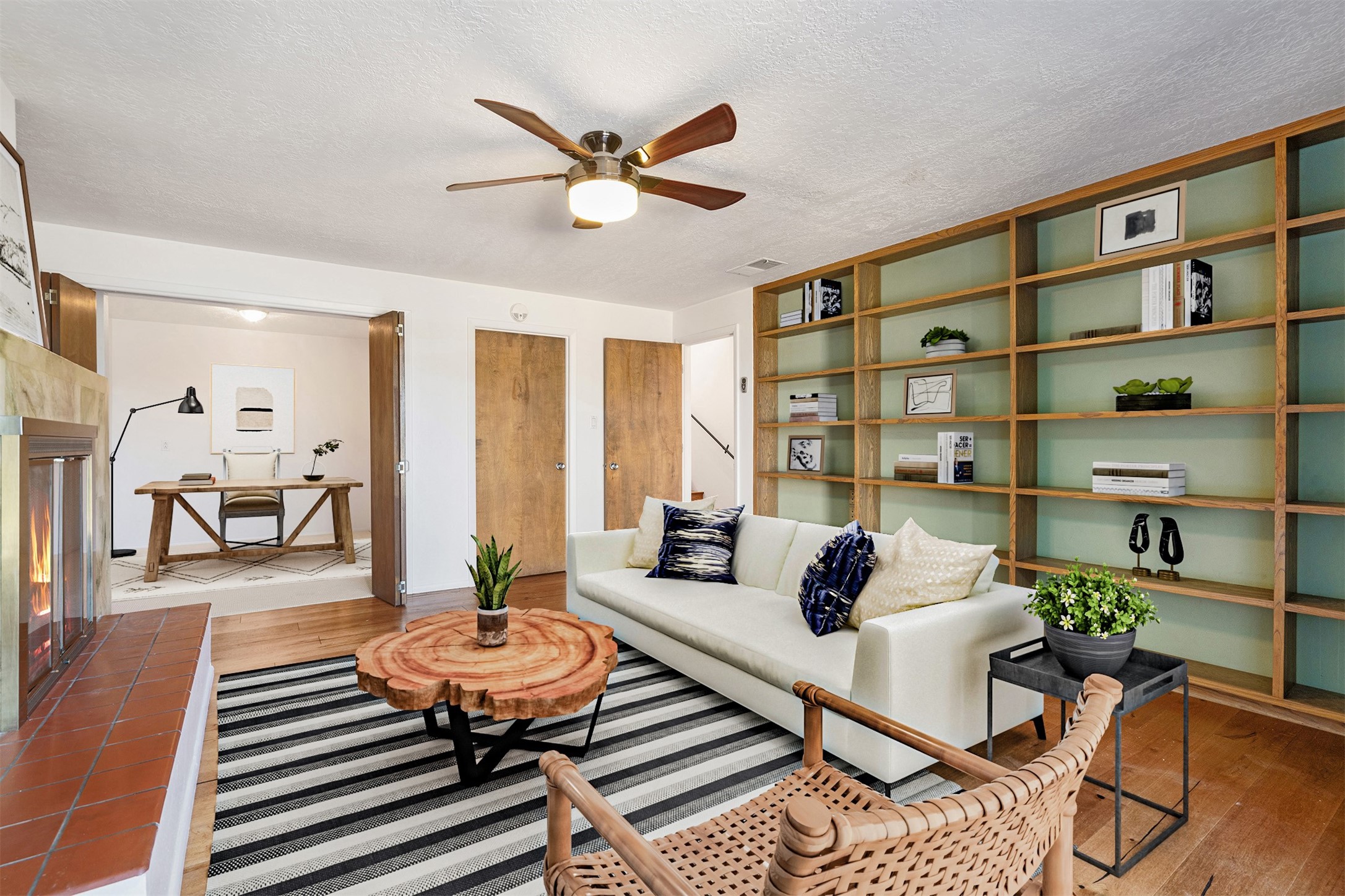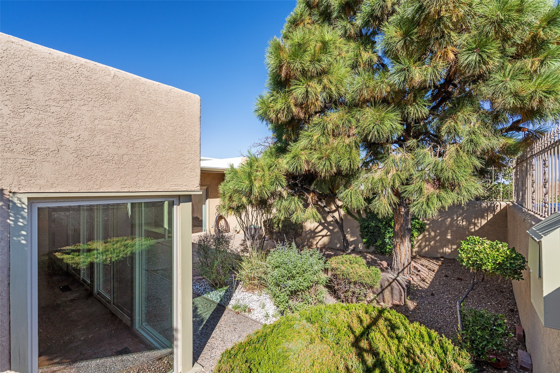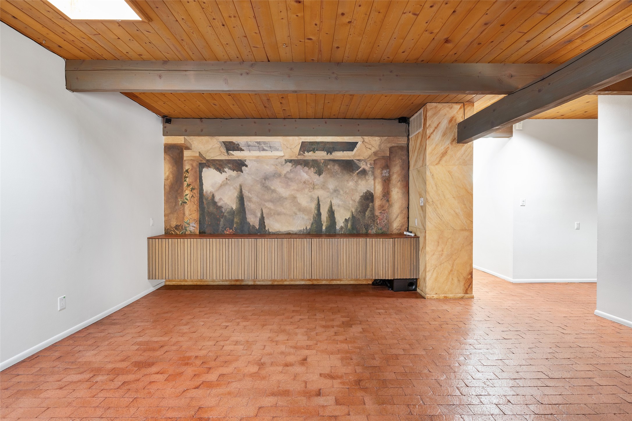 Look here--you're going to love this mid-century modern townhome in the heart of Nob Hill and nearby to lots of restaurants, retail, the Co-op & UNM. Designed with generous proportions and a distinctive retro vibe, this spacious home offers 3-4 bedrooms, 2.5 baths, and room to spread out in comfort. The inviting living room showcases brick floors, beamed and wood ceilings, and a classic kiva-style fireplace that anchors the space with warmth and authenticity. The dining room is highlighted by a beautifully painted mural--an artistic focal point that adds a touch of custom flair. The kitchen offers abundant cabinet and pantry space, plus a sunny breakfast nook framed by windows. Upstairs, the primary suite captures stunning Sandia Mountain views and includes an ensuite bath with dual sinks. Two additional bedrooms are generously sized and share a full bath. All the windows in the upstairs bedrooms are new double pane Pella windows and there are new Hunter Douglas window shades throughout. The lower level offers incredible flexibility, featuring a cozy study or library with a fireplace and built-in bookshelves, plus a large storage or bonus room and an oversized, 550 square foot two-car garage. Recent upgrades include a tankless water heater and a foam roof with transferable warranty. Cool timeless style meets easy living, tons of square footage, and unbeatable location near Albuquerque's favorite neighborhoods, this townhome delivers comfort, character, and enduring charm in one irresistible package.