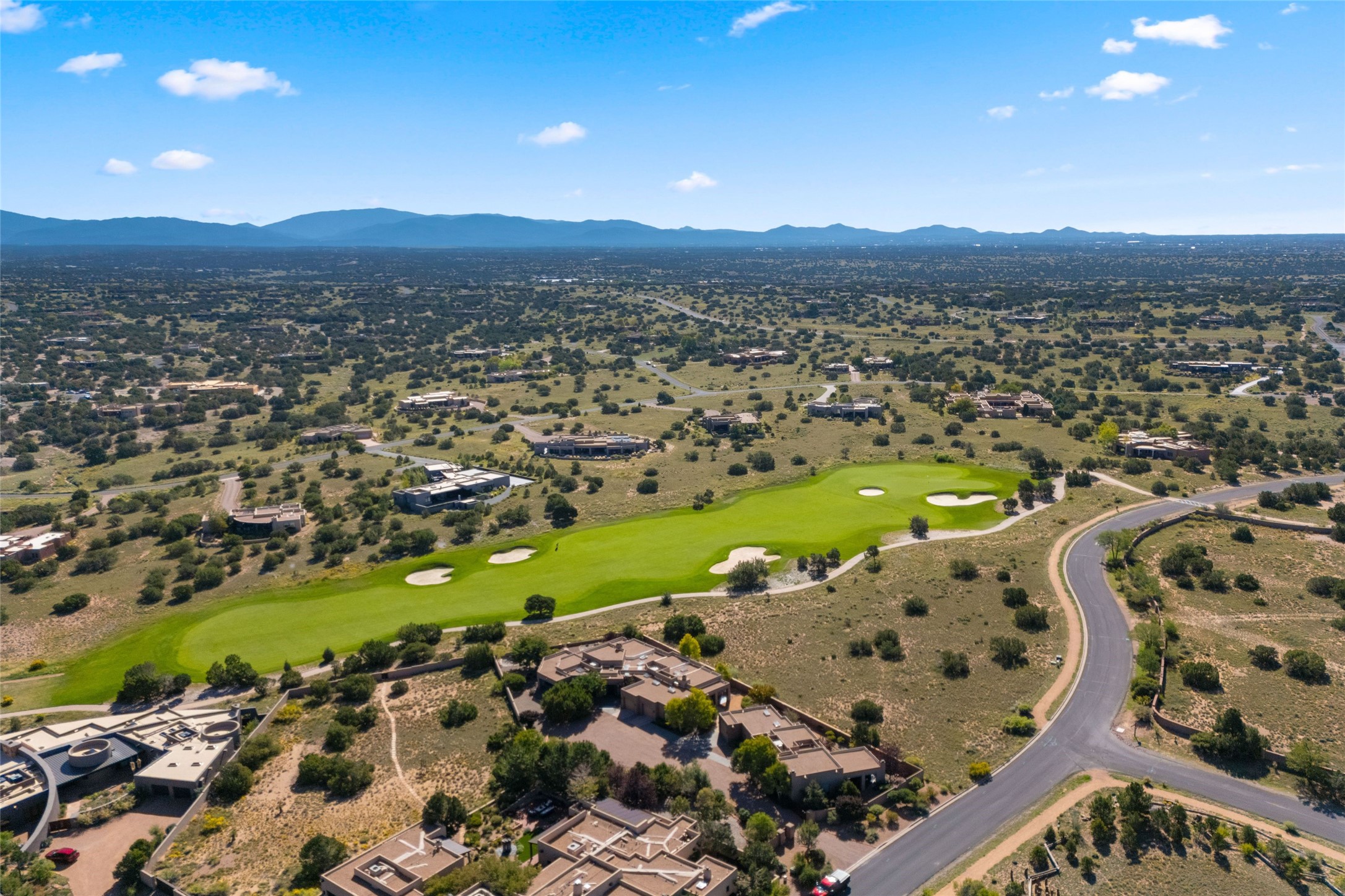 Prestigious Las Campanas 4-bedroom, 3.5-bath home, accompanied by a large guesthouse, overlooks the 9th fairway of the renowned Las Campanas Sunset Golf Course. With breathtaking views of the Sangre de Cristo and Jemez mountains, this single-level residence offers convenience with no interior steps. The home features high-end finishes, including plaster walls, porcelain and hardwood floors, and granite countertops complemented by stainless steel appliances. Open floor plan with a handsome great room, dining area, and well-appointed kitchen with a central island, perfect for entertaining family and friends. Step outside to the patio, where expanded living and entertaining options await against a backdrop of stunning vistas. The home features four cozy fireplaces, including one outdoors, providing warmth and ambiance year-round. Thoughtfully designed custom built-ins by renowned Santa Fe cabinetmaker Juan Carlos enhance the living room, primary bedroom, and library/media room, adding both style and functionality. The 1,218 sq. ft. guesthouse includes a full kitchen, a comfortable living and dining area, and two bedrooms with a 3/4 bath, offering privacy and convenience for guests. This exceptional property is ideally located with easy access to downtown Santa Fe and all its cultural, culinary and recreational amenities.