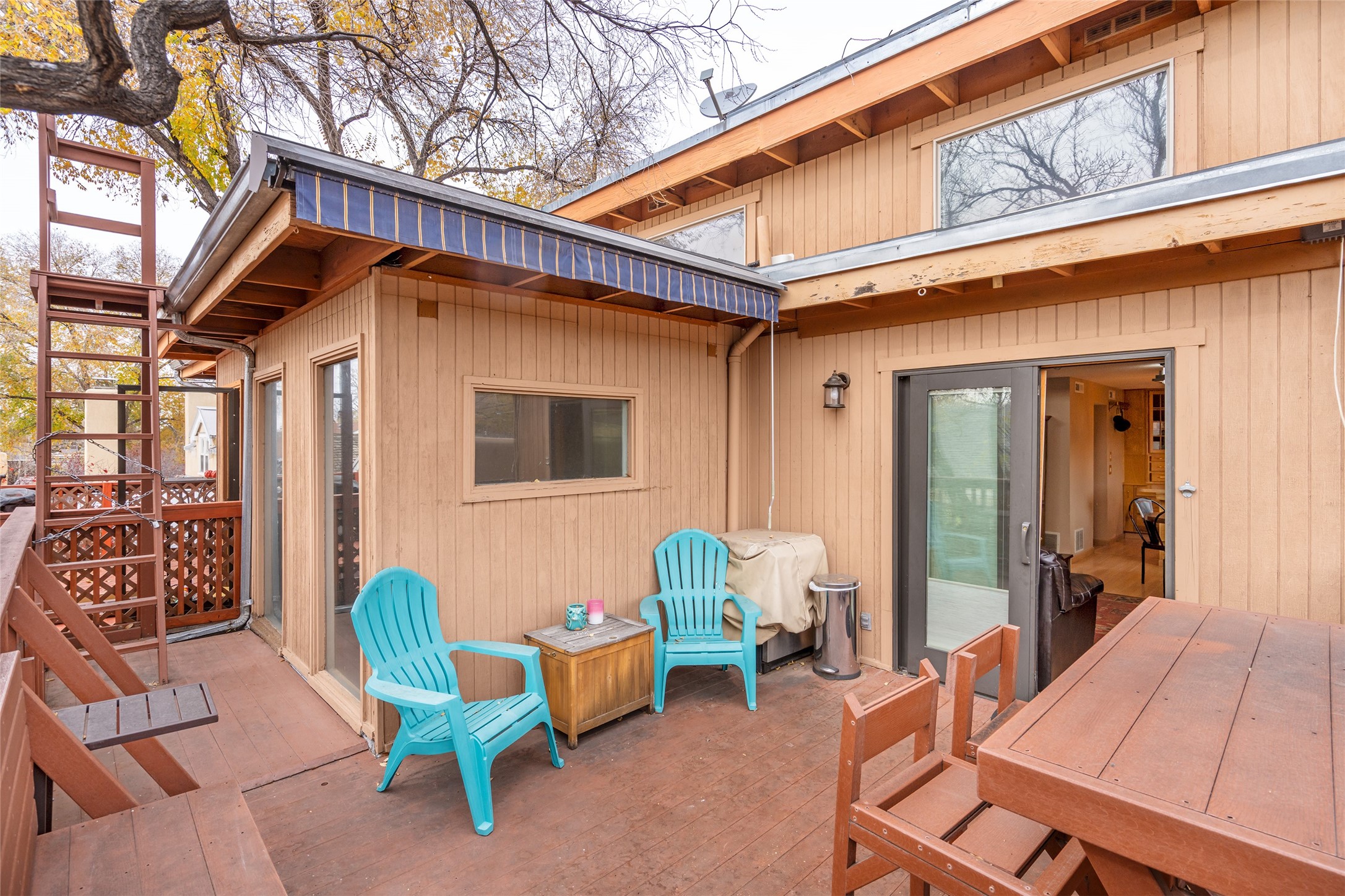 ALL FURNISHINGS, ART, LINENS, FLATWARE, GLASSWARE AND COOKWARE CONVEY AT NO ADDITIONAL COST. Move in ready! No fees and a great opportunity to live 5 blocks to the historic plaza and kitty corner to Kaune's neighborhood market. This tri-level condo is one of 3 units with NO monthly fees hidden amongst the trees. If you know Santa Fe, you know what a desirable and close in location this is. This home would make a great full time, 2nd home or rental. The split level floor plan has two bedrooms, one bedroom on lower level and one on top level for maximum privacy. Each bedroom has a 1/2 bath for convenience. On the middle level you will find the Kitchen/living area which is beautifully bright with an abundance of windows and natural light. In addition, there is a large balcony surrounded by mature trees giving a sense of being in the mountains but yet right in town! All this and a two car attached garage with interior access. There is a gate next to garage with access to front of home as well as access to the quaint Pino Road that runs along the Acequia Madre.