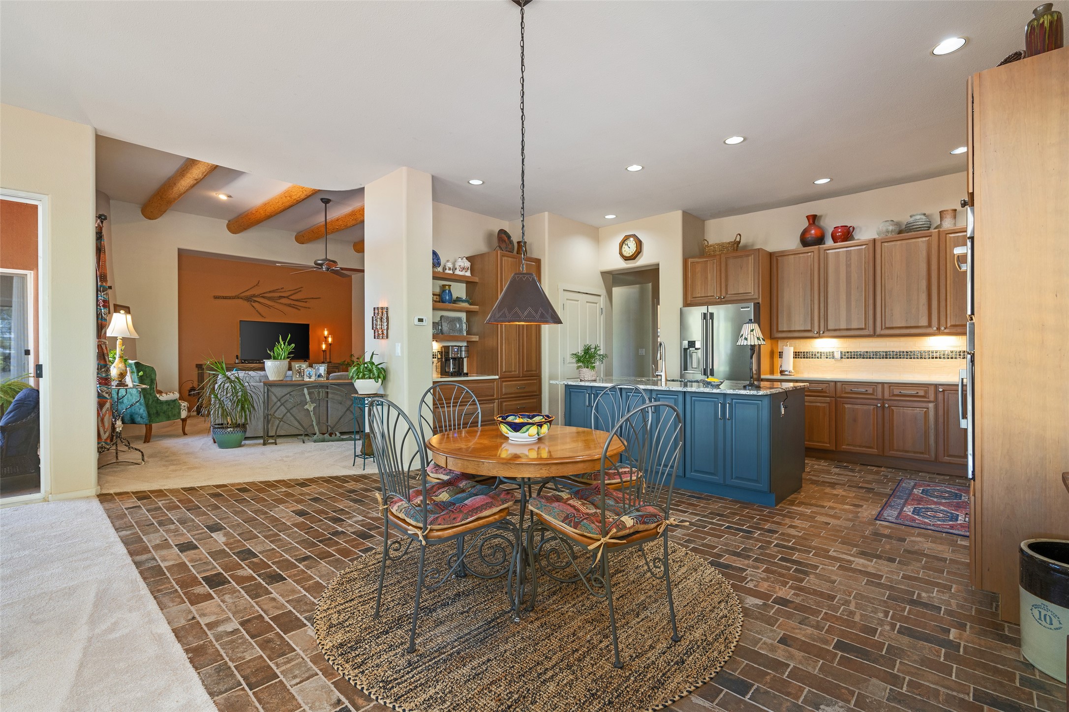 Welcome to this exceptional home, perfectly sited on a spacious lot at the end of a quiet cul-de-sac, with open space on two sides and gorgeous sunset views. Enjoy evenings by the outdoor fireplace as the sky puts on its nightly show. Thoughtfully updated by its current owners, this property offers tremendous value in today's market. With five full bedrooms, (two of which are currently used as an ensuite office and studio) and four full baths, the home provides remarkable flexibility for every lifestyle. The heart of the home is the magnificently remodeled chef's kitchen--an absolute showstopper. Bosch appliances, beautiful two-tone cabinetry, subway tile with mosaic accents, hand-punched tin details, brick-set tile flooring, and a mix of granite and quartz countertops come together in a space any cook will adore. The dining room is inviting and generous, designed to host family gatherings and memorable evenings with friends. The living area offers vigas overhead, a wood-burning fireplace, and warm natural light--a perfect space for cozy winter days. The primary suite is a private retreat: spacious, serene, and complete with a beautifully updated bath with customized walk-in shower, dual hammered nickel sinks and lighting, and an excellent walk-in closet. It's a haven for mornings that start slow and evenings that wind down in comfort. Additional upgrades made during this owner's tenure include a new boiler and evaporative cooler, new carpeting, fresh interior paint, new ceiling fans and custom lighting, plus plantation shutters throughout--both beautiful and energy-efficient. Exterior wise, the stucco was also recently replaced and refreshed and the rear yard has been enhanced with new rock landscaping, pathways, and fruit trees, creating a peaceful outdoor escape. The slightly oversized garage is another welcome bonus with additional storage shelves. Located in the desirable Village at Rancho Viejo, this community offers miles of paved walking trails, multiple parks, sensible covenants, friendly neighbors, and convenient access to shopping and restaurants. Roughly 12 miles to the Santa Fe Plaza, this fantastic home delivers!