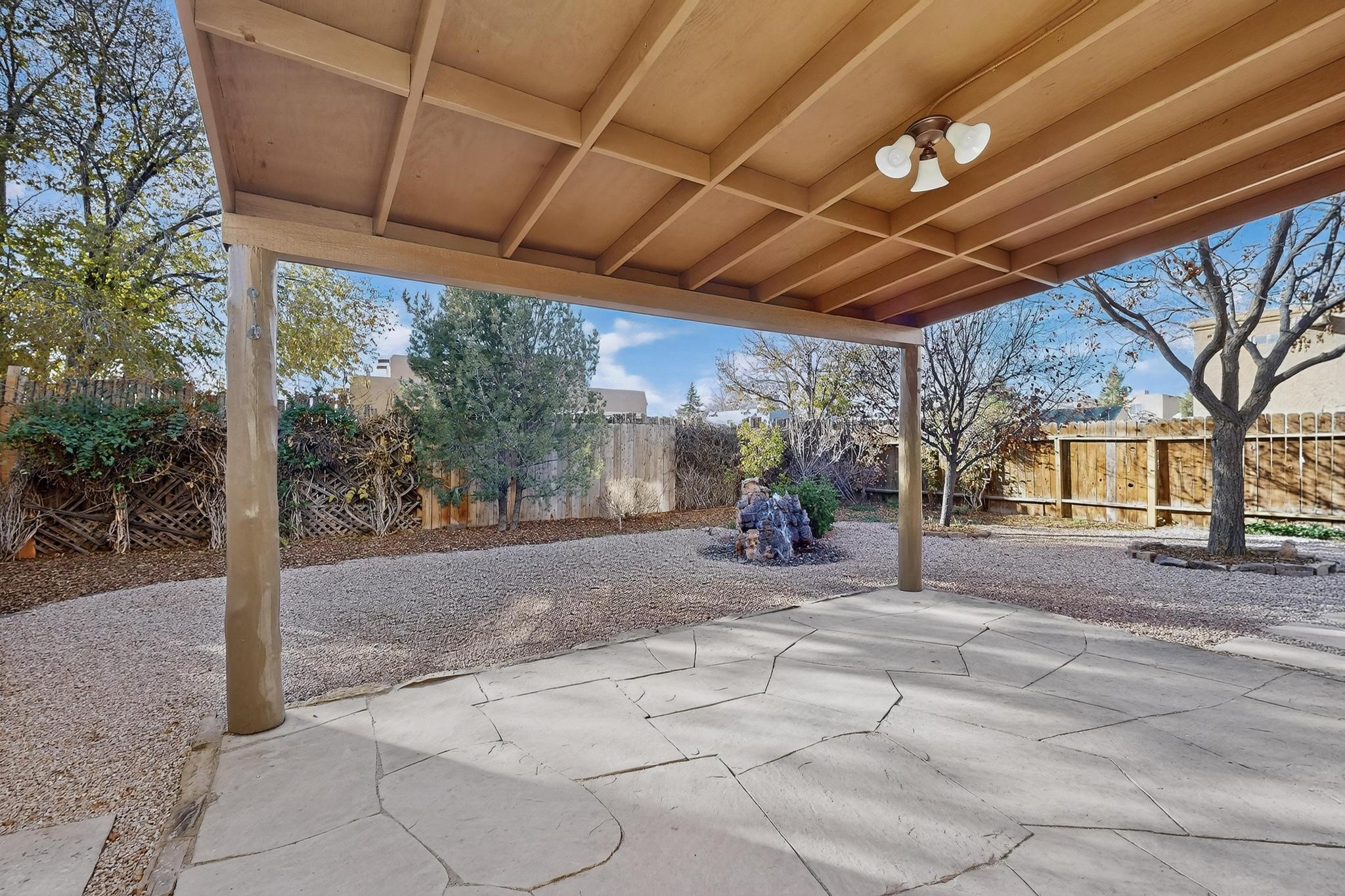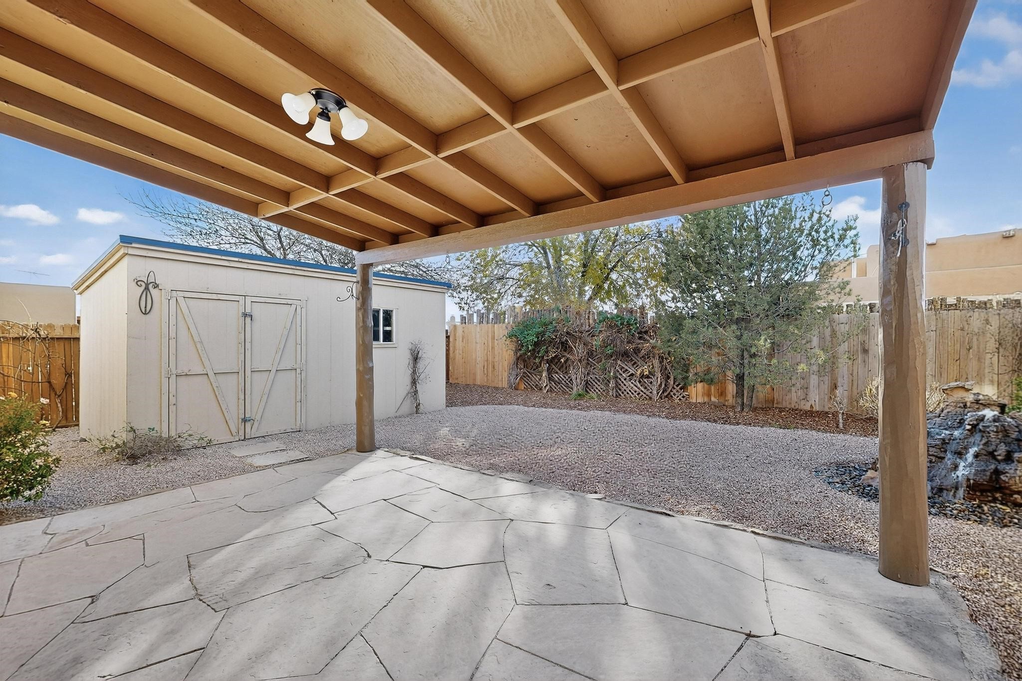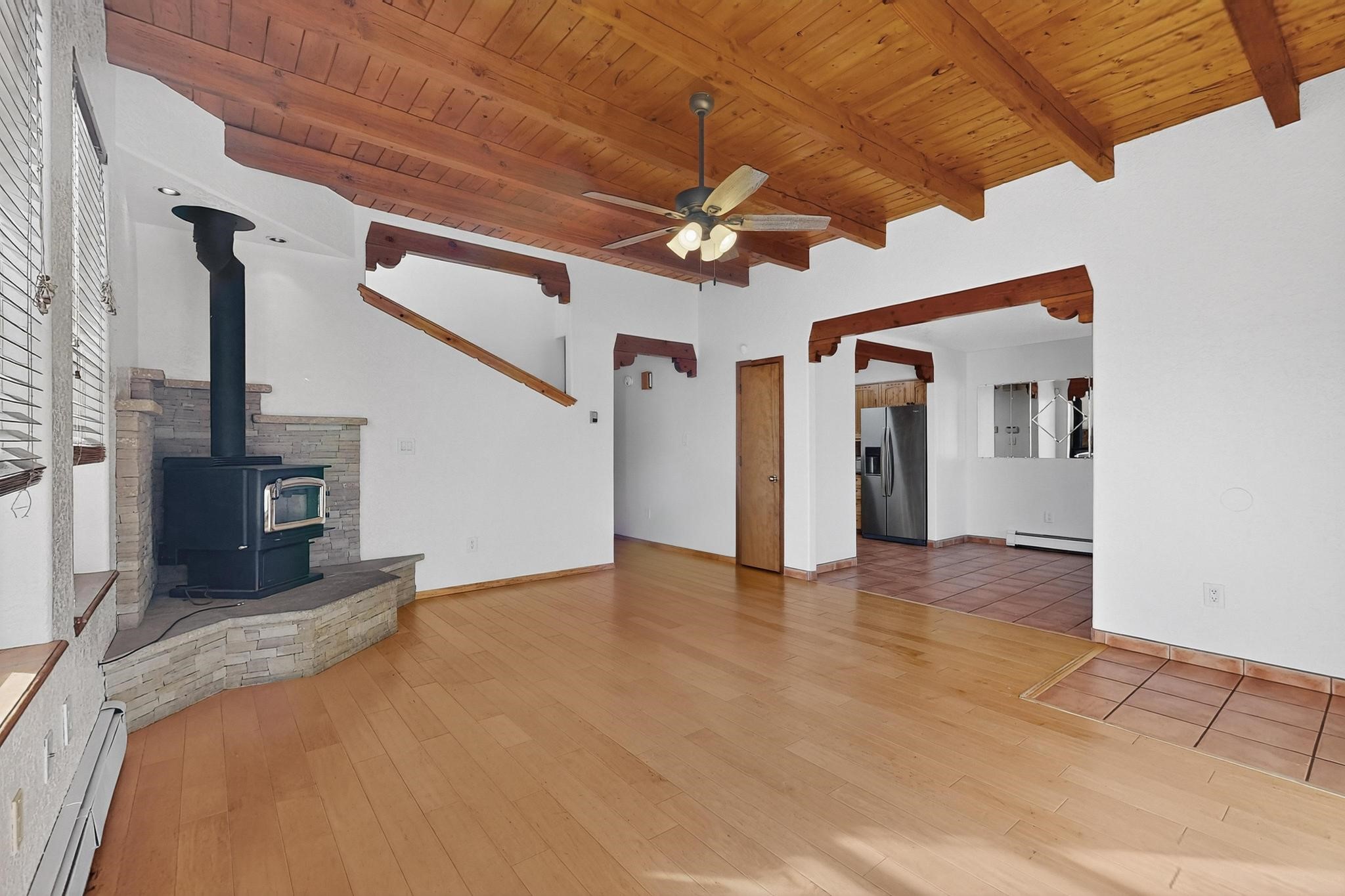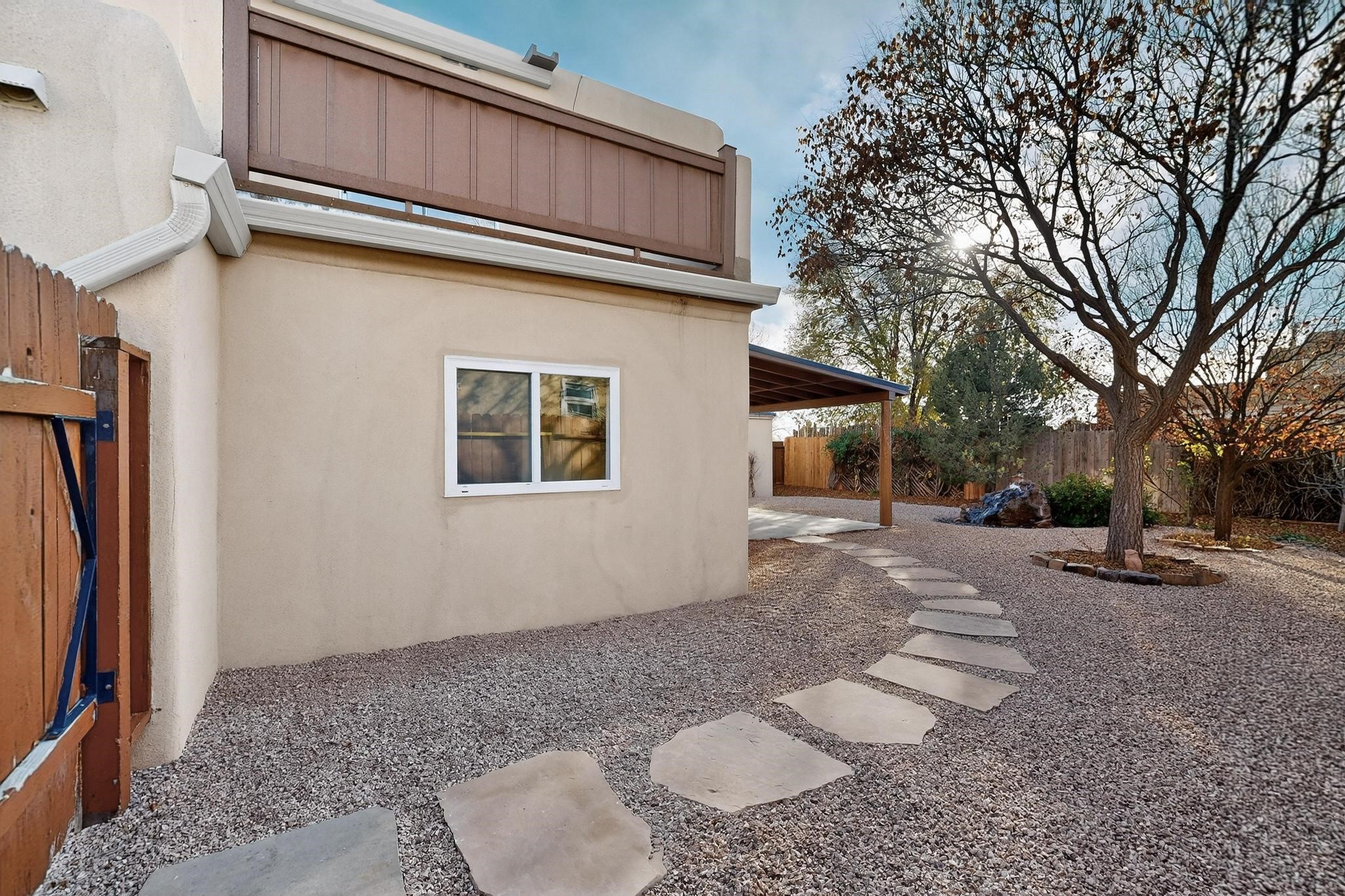 This home is filled with abundant natural light, creating a warm and inviting atmosphere throughout, making it a truly exceptional place you'll want to call your own. This property features 3 bedrooms PLUS an office. 2 full bathrooms, each with custom cabinets, beautifully tiled bathtubs and granite countertops. The living room boasts a cozy wood stove and high beamed tongue-and-groove ceilings, adding Santa Fe charm to the home. Retreat to the main bedroom suite, which offers its own fireplace and a private balcony with a mountain top view--ideal for unwinding after a long day. The kitchen is complete with a brand-new gas stove/oven, custom-made cabinets, granite countertops and tile backsplash. Step outside to enjoy the fully landscaped front and back yards, featuring tranquil water fountains and mature landscaping maintained with drip irrigation. The backyard also includes a flagstone covered portal, perfect for outdoor entertaining and relaxation. Home includes a one car finished garage, large storage shed and a laundry room with a large basin sink and ample upper cabinets. Tiled and wood flooring adds the extra touch.Don't miss the opportunity to make this exceptional property your new home!