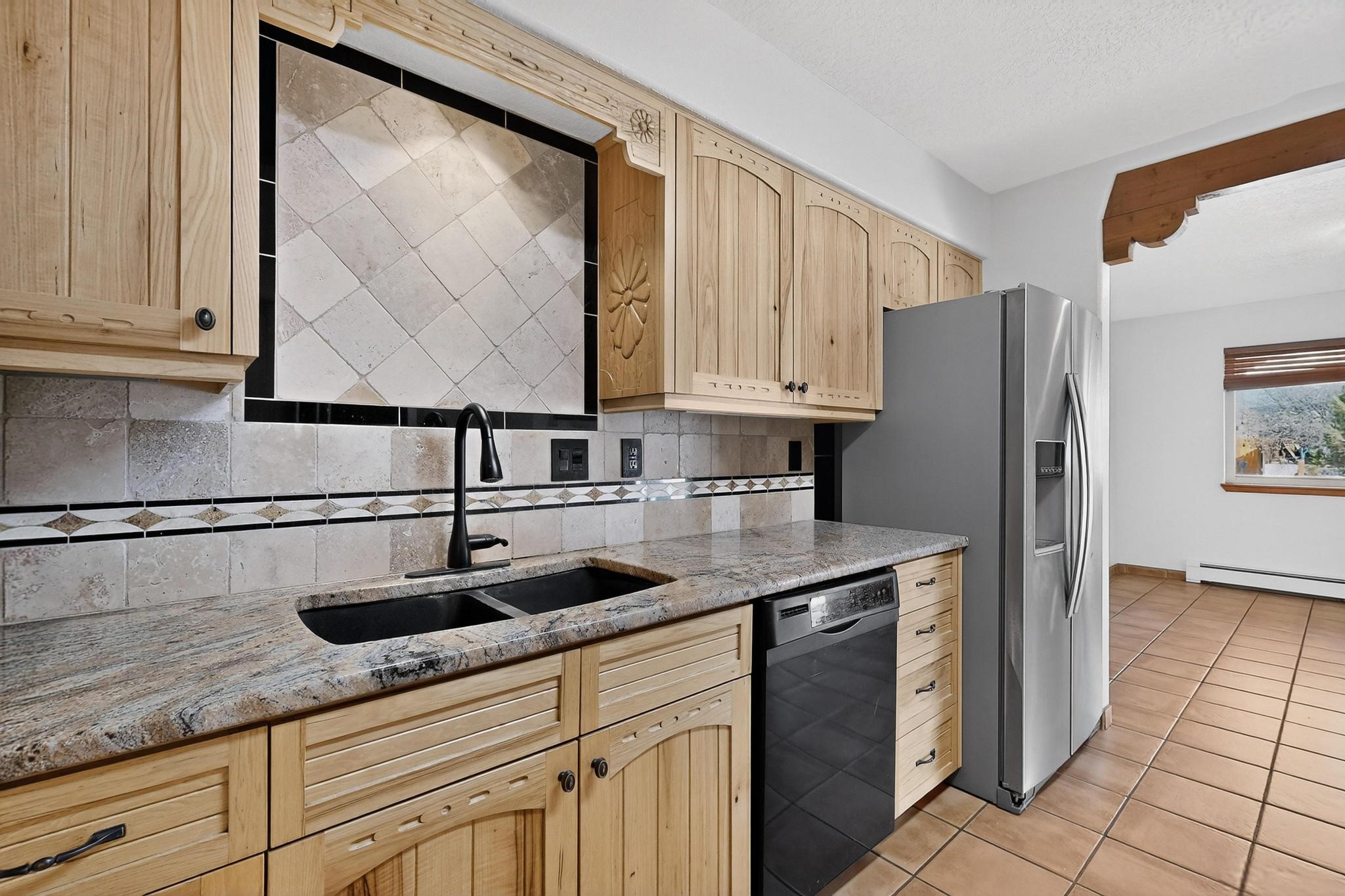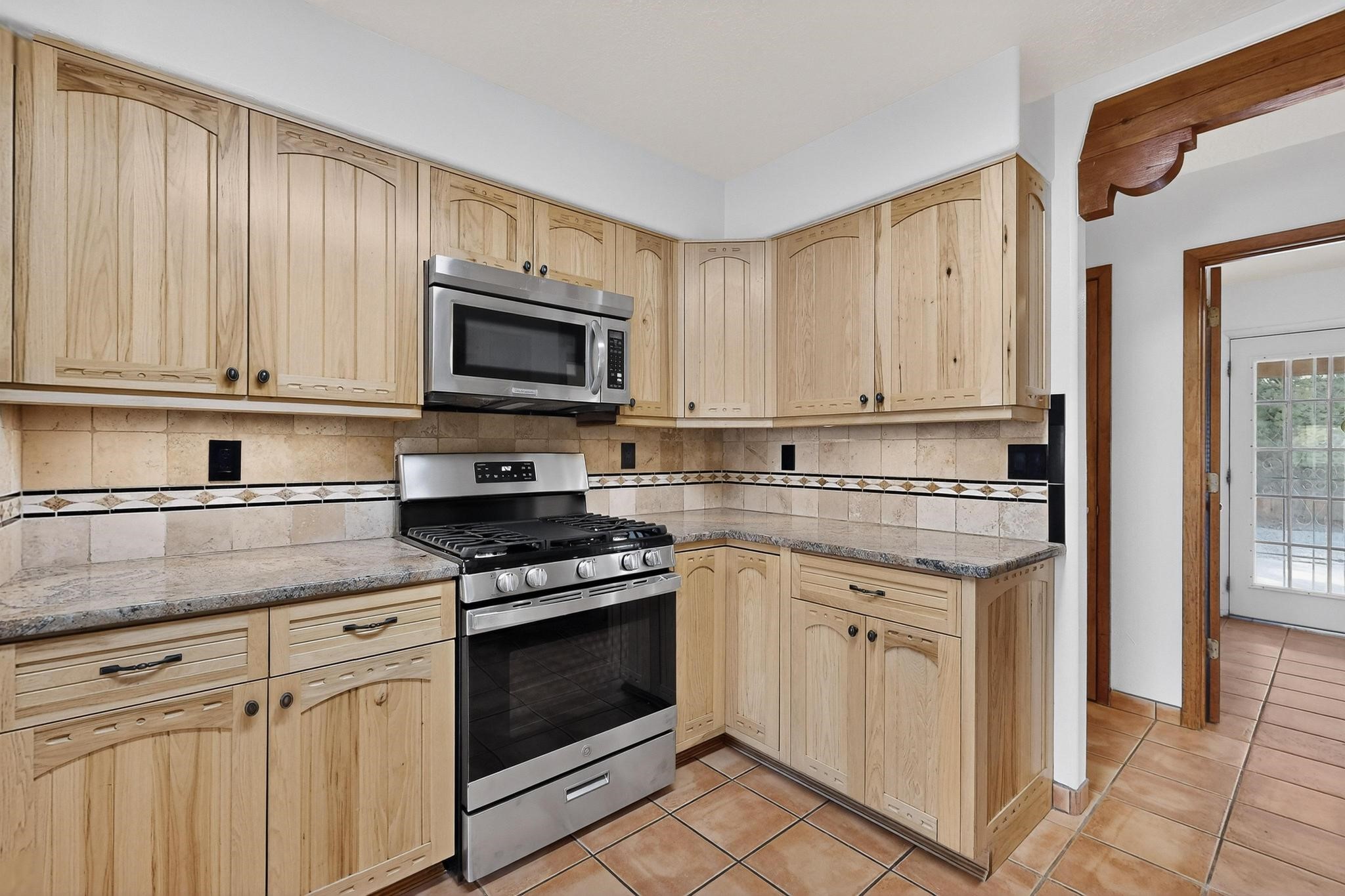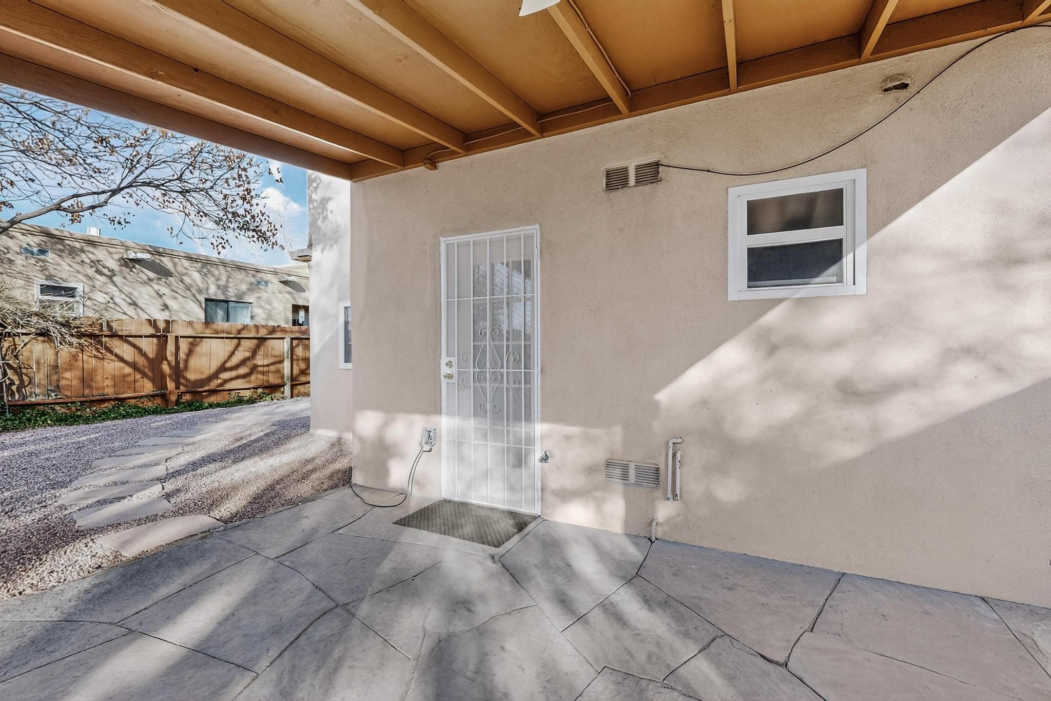 This home is filled with abundant natural light, creating a warm and inviting atmosphere throughout, making it a truly exceptional place you'll want to call your own. This property features 3 bedrooms PLUS an office. 2 full bathrooms, each with custom cabinets, beautifully tiled bathtubs and granite countertops. The living room boasts a cozy wood stove and high beamed tongue-and-groove ceilings, adding Santa Fe charm to the home. Retreat to the main bedroom suite, which offers its own fireplace and a private balcony with a mountain top view--ideal for unwinding after a long day. The kitchen is complete with a brand-new gas stove/oven, custom-made cabinets, granite countertops and tile backsplash. Step outside to enjoy the fully landscaped front and back yards, featuring tranquil water fountains and mature landscaping maintained with drip irrigation. The backyard also includes a flagstone covered portal, perfect for outdoor entertaining and relaxation. Home includes a one car finished garage, large storage shed and a laundry room with a large basin sink and ample upper cabinets. Tiled and wood flooring adds the extra touch.Don't miss the opportunity to make this exceptional property your new home!