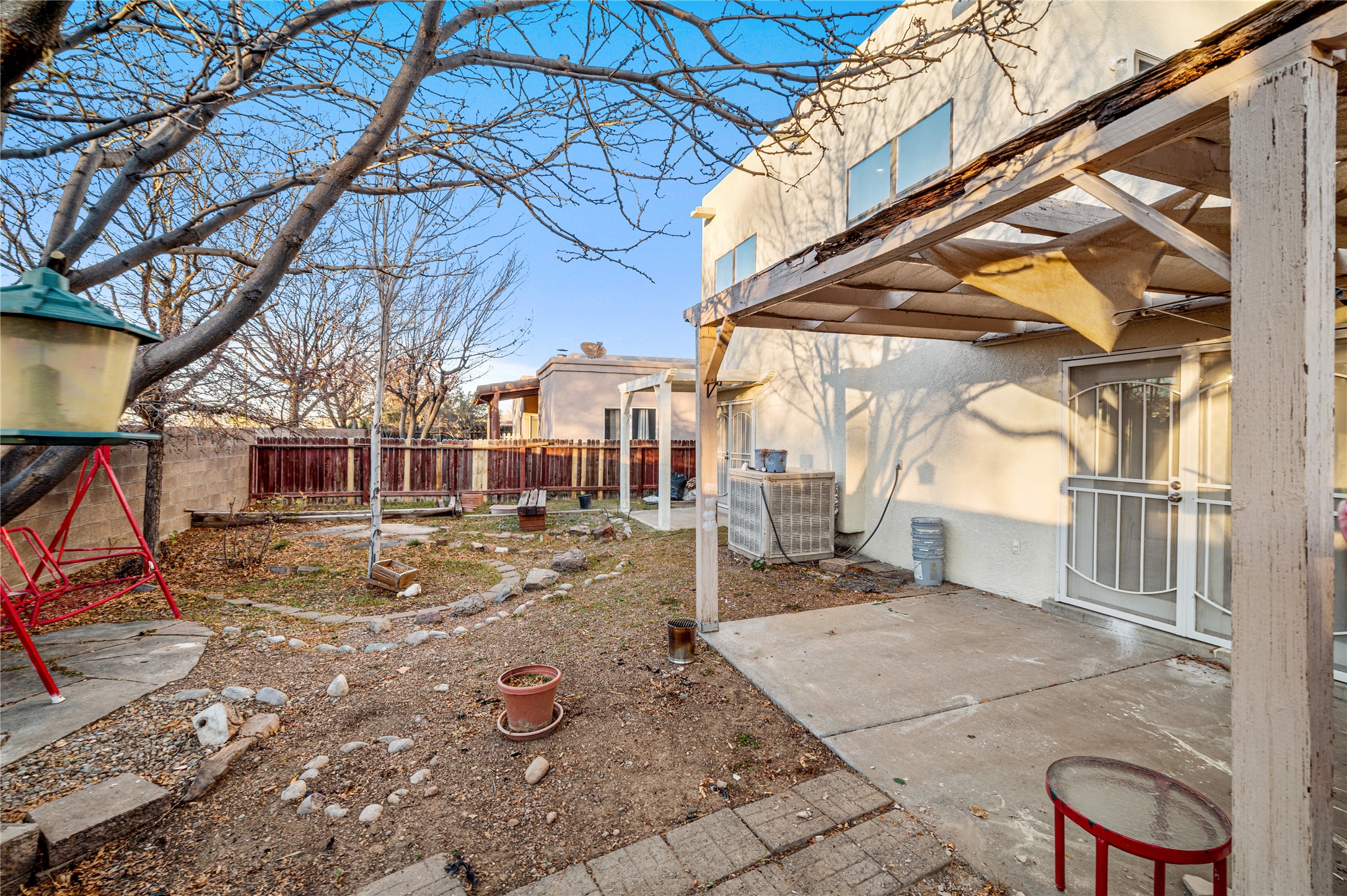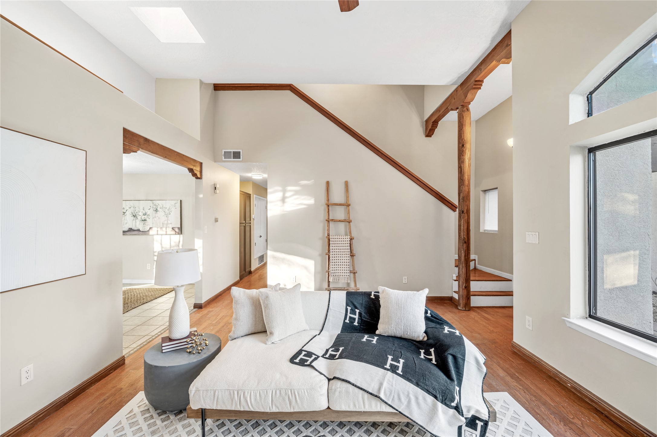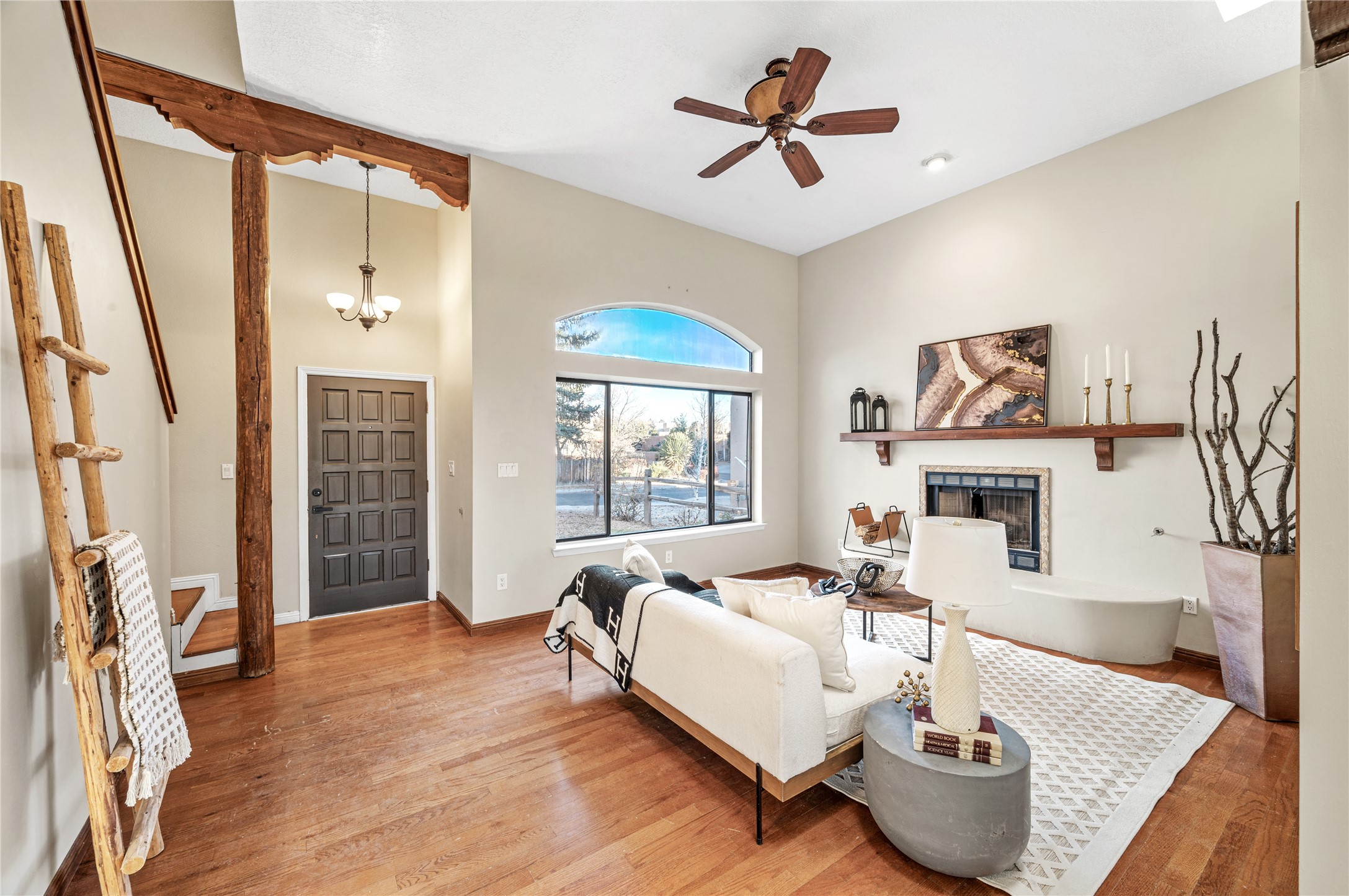 Set within a peaceful gated community, this Santa Fe home blends warm Southwest style with modern comfort. Soaring ceilings, exposed wood beams, and abundant natural light create an inviting and refined living space. The flexible layout features a main-level primary suite with private French doors opening to the backyard, plus an upstairs en-suite with a secluded balcony for quiet retreat. The kitchen flows into a bright dining area overlooking the outdoor living spaces. Outside, enjoy multiple patios, mature trees, and natural landscaping that offer room to relax or entertain. Nestled in a quiet cul-de-sac, this home captures timeless Santa Fe charm with everyday livability. Explore this home in person and experience its unique setting and design.