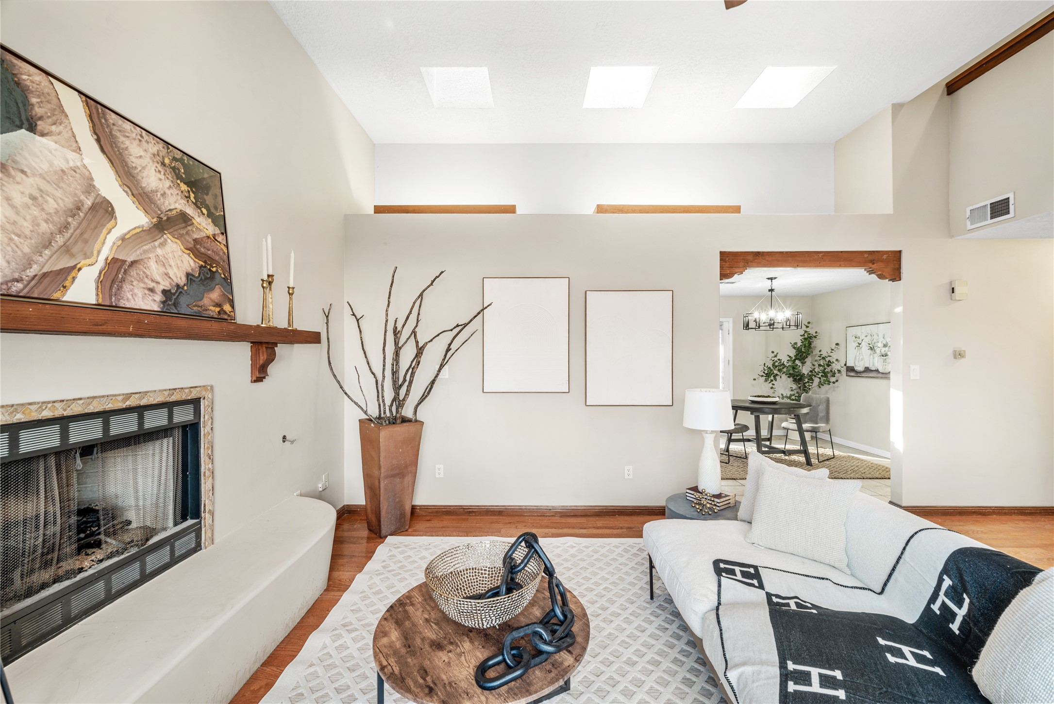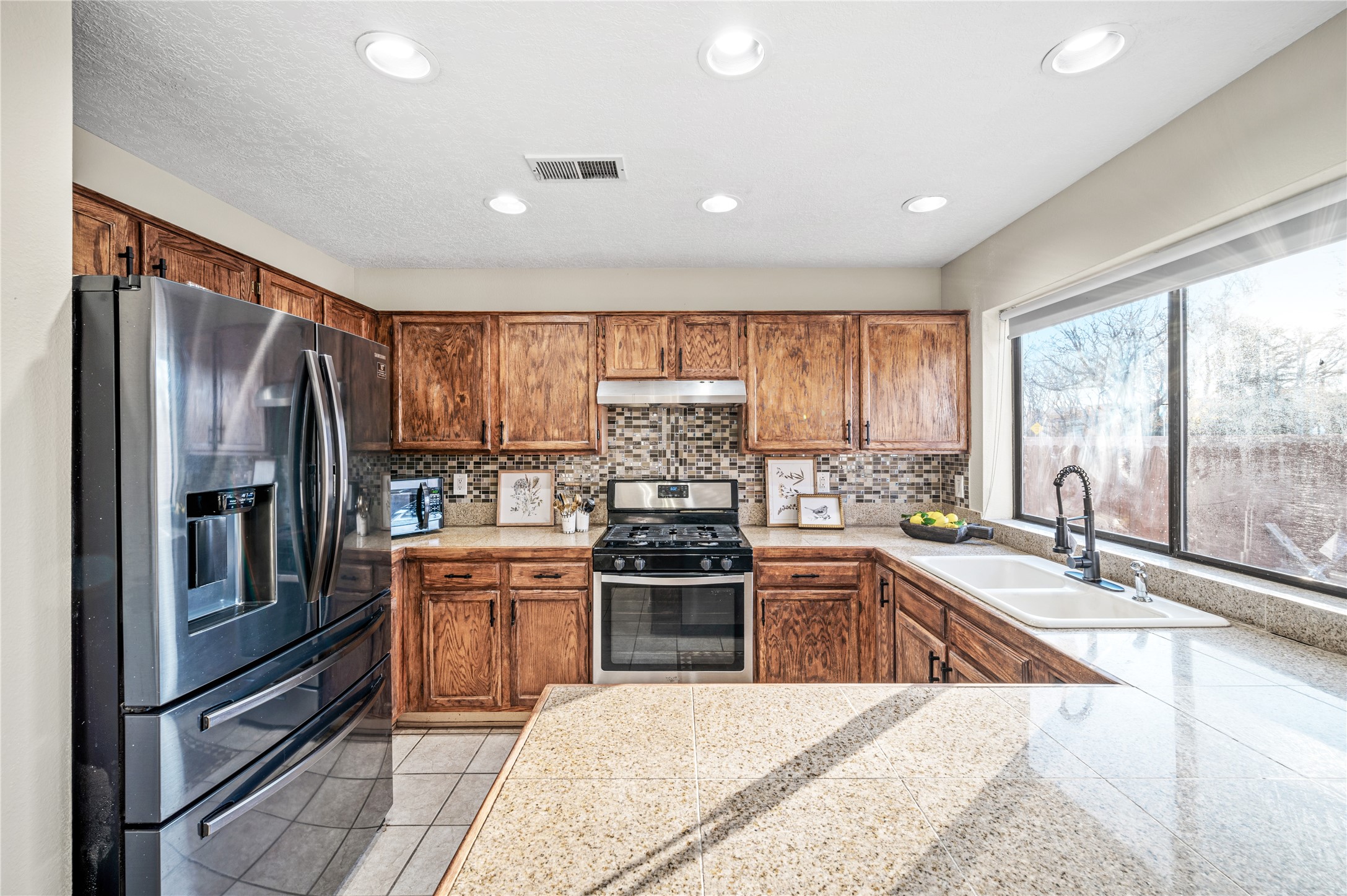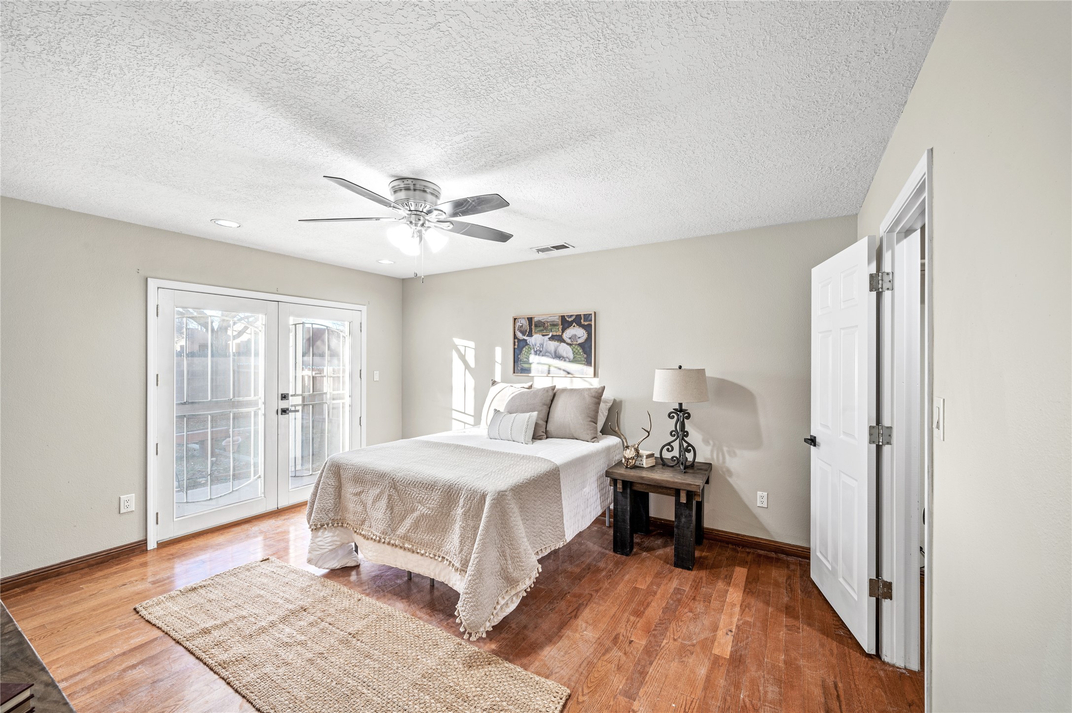 Set within a peaceful gated community, this Santa Fe home blends warm Southwest style with modern comfort. Soaring ceilings, exposed wood beams, and abundant natural light create an inviting and refined living space. The flexible layout features a main-level primary suite with private French doors opening to the backyard, plus an upstairs en-suite with a secluded balcony for quiet retreat. The kitchen flows into a bright dining area overlooking the outdoor living spaces. Outside, enjoy multiple patios, mature trees, and natural landscaping that offer room to relax or entertain. Nestled in a quiet cul-de-sac, this home captures timeless Santa Fe charm with everyday livability. Explore this home in person and experience its unique setting and design.