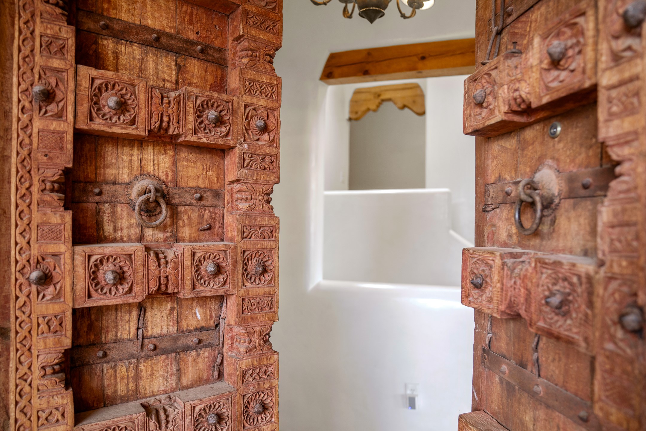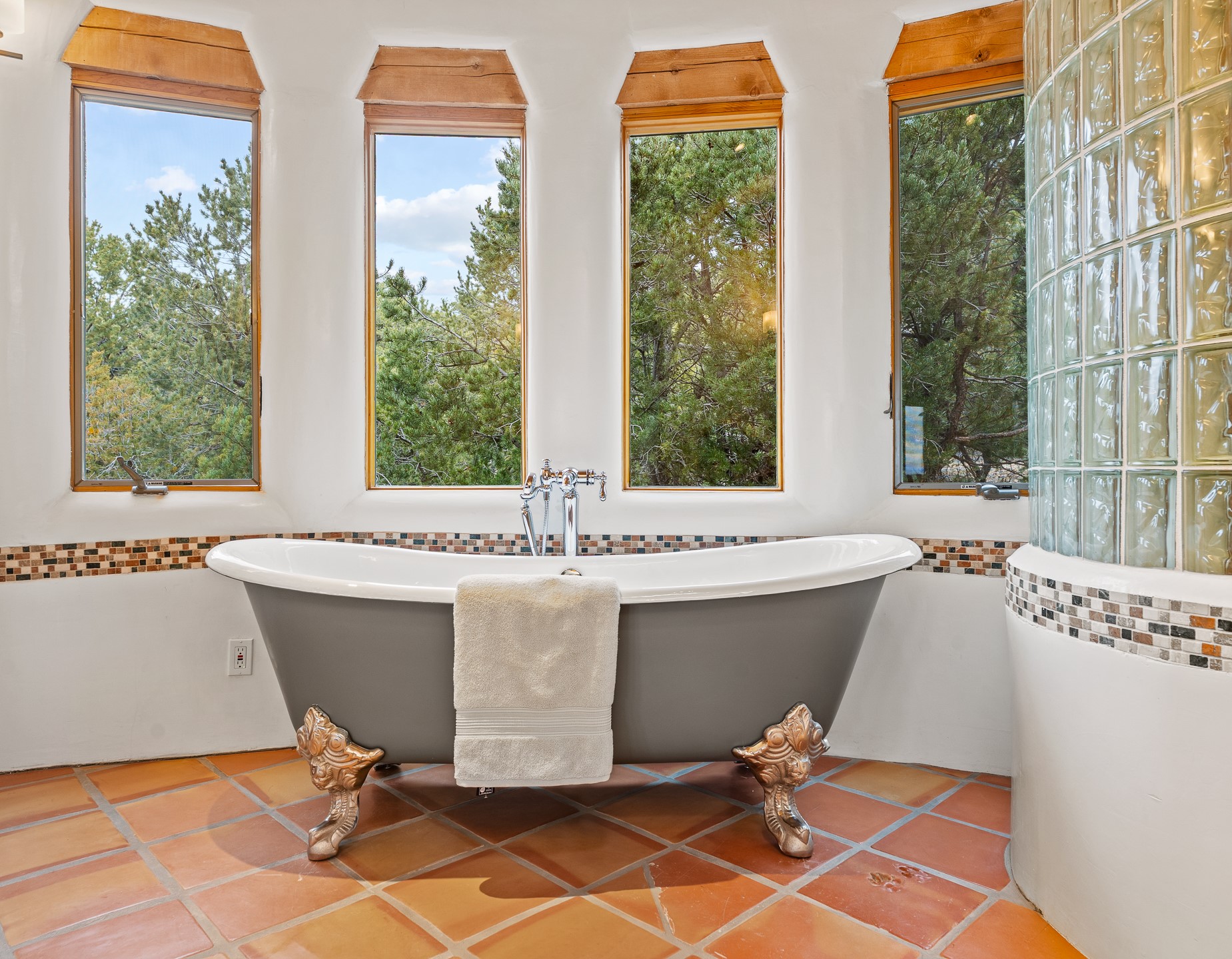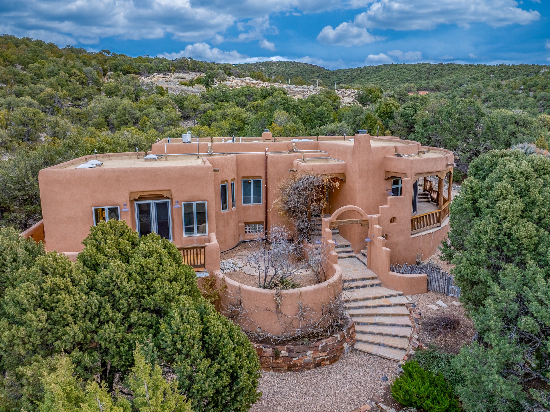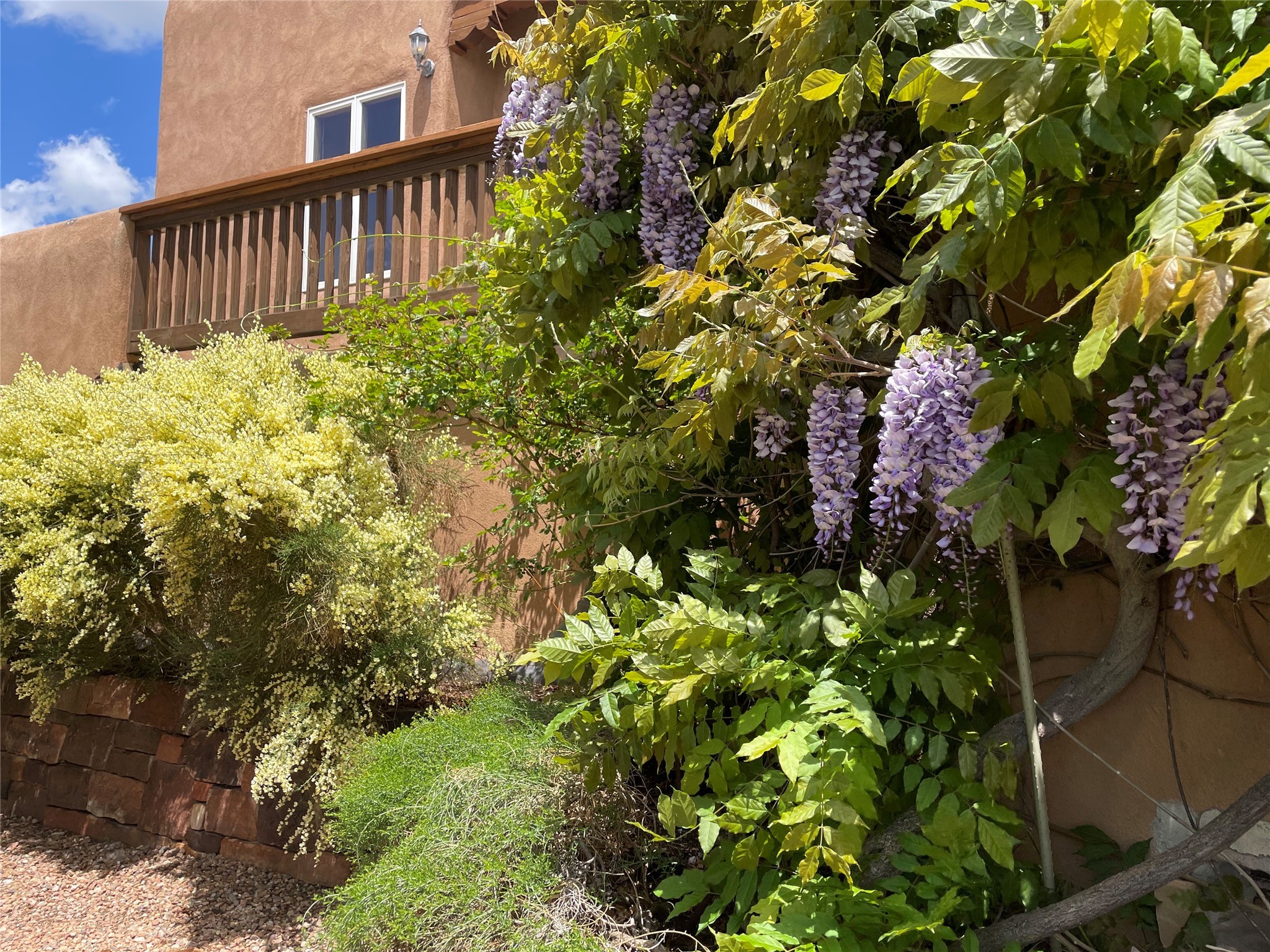 Located on a quiet cul-de-sac in the desirable Cerros Colorados neighborhood, this beautifully renovated 2,693 sq. ft. home sits on 0.58 acres with sunset and Sandia mountain views. Just 10 minutes to the Plaza and directly adjacent to the Dale Ball Trail system, this residence offers the perfect blend of natural beauty, privacy, and accessibility. Renovated down to the studs between 2022-2024, the home is filled with handcrafted Southwestern details--high viga ceilings, white hand-troweled plaster walls, coved ceilings, and a custom Indonesian front door. The main South-facing living area features a kiva fireplace and opens to a wraparound portal for seamless indoor-outdoor living. The kitchen is outfitted with white stone countertops, a butcher block island with prep sink, Viking range, Sub-Zero refrigerator, and bar seating--ideal for gatherings. A cozy den with its own kiva fireplace sits just off the kitchen. The private primary suite is located in the southwest corner with a balcony for stargazing and sunset views, one large West-facing banco and a spa-like bath with a clawfoot soaking tub, walk-in shower, and a generous walk-in closet. Two guest bedrooms and a full bath are located on the north side of the home, along with a large laundry room. A central powder room includes an additional shower for flexible guest use. A stairway leads to a heated 700 sq. ft. garage, perfect for storage, studio, or workshop needs. This property is a rare offering--artful, serene, and reimagined for modern Santa Fe living.